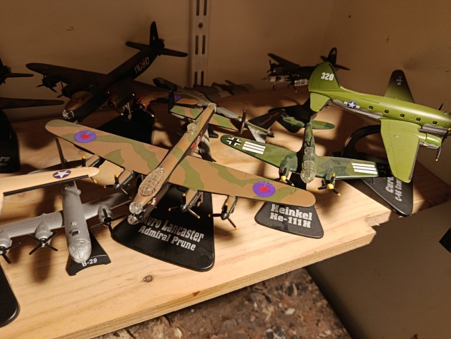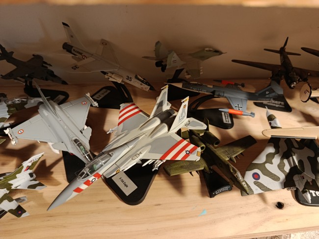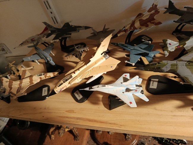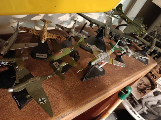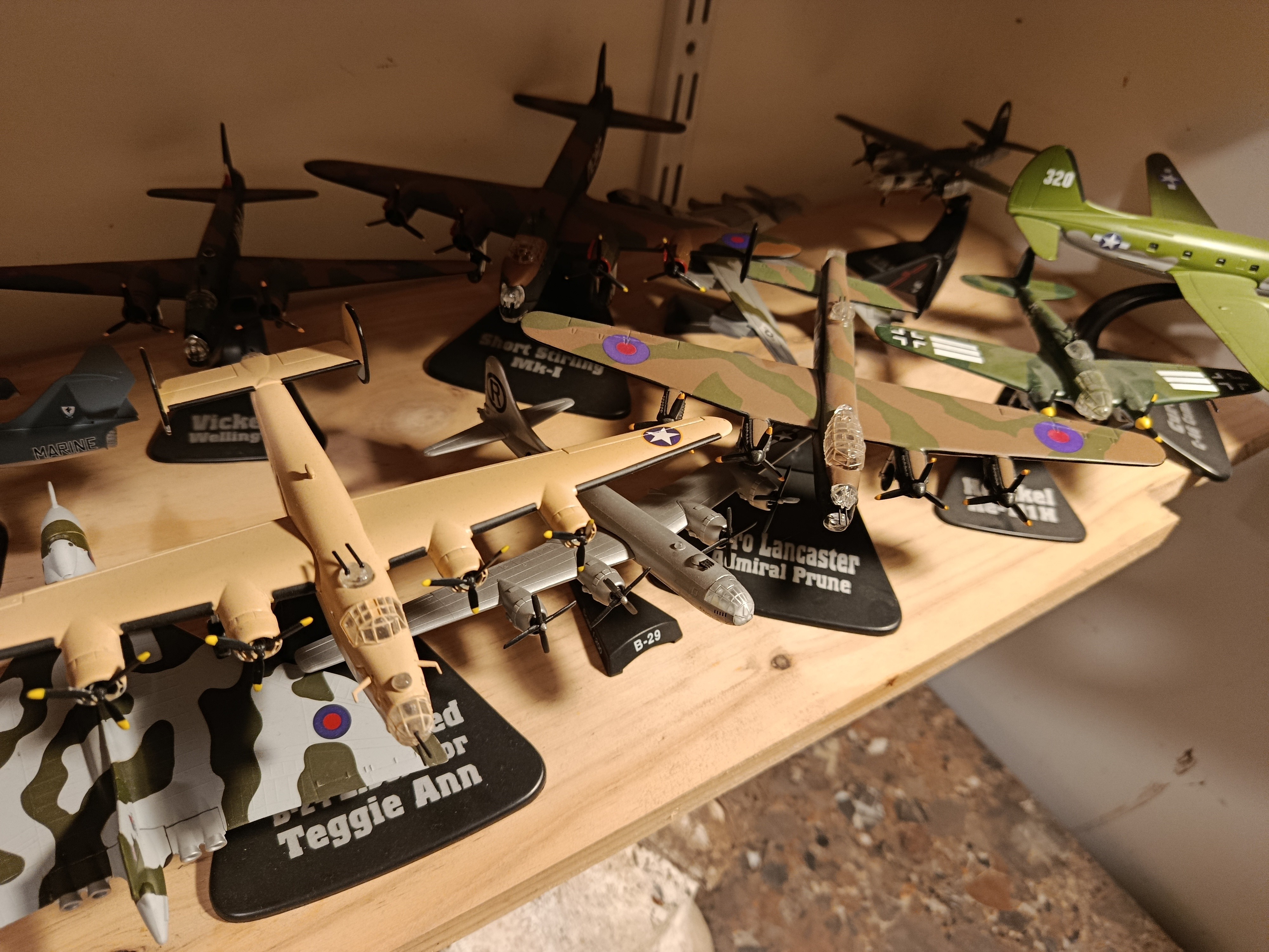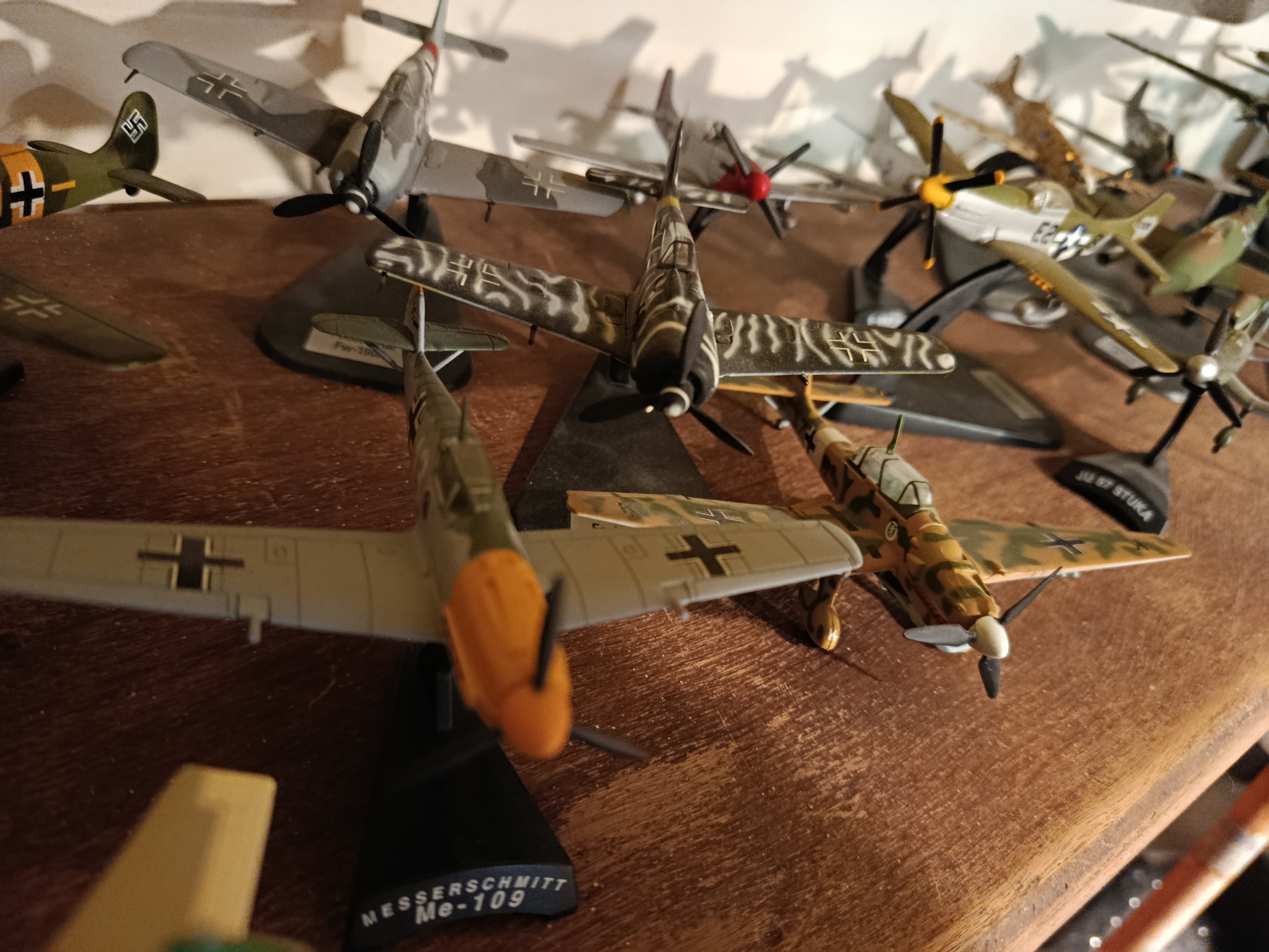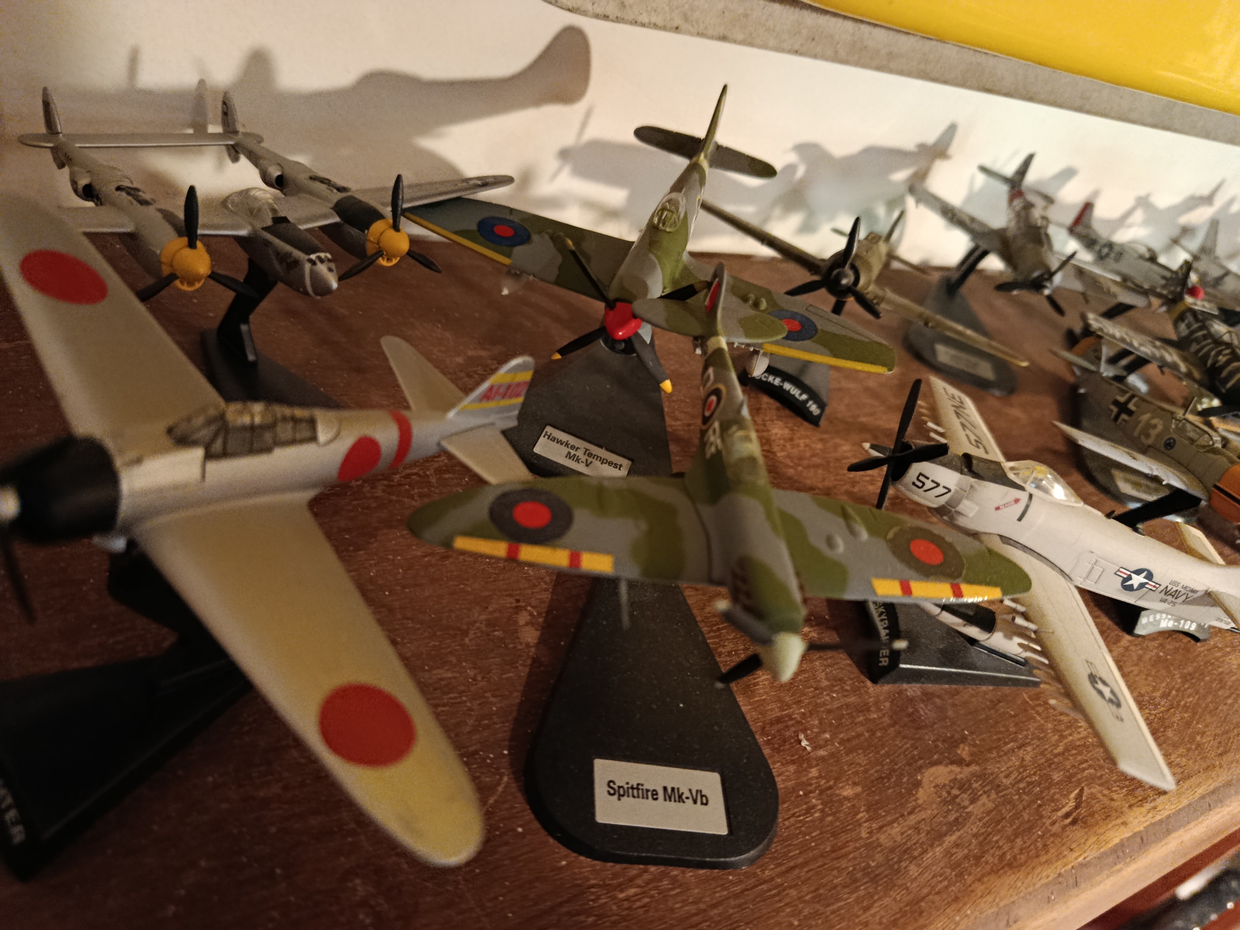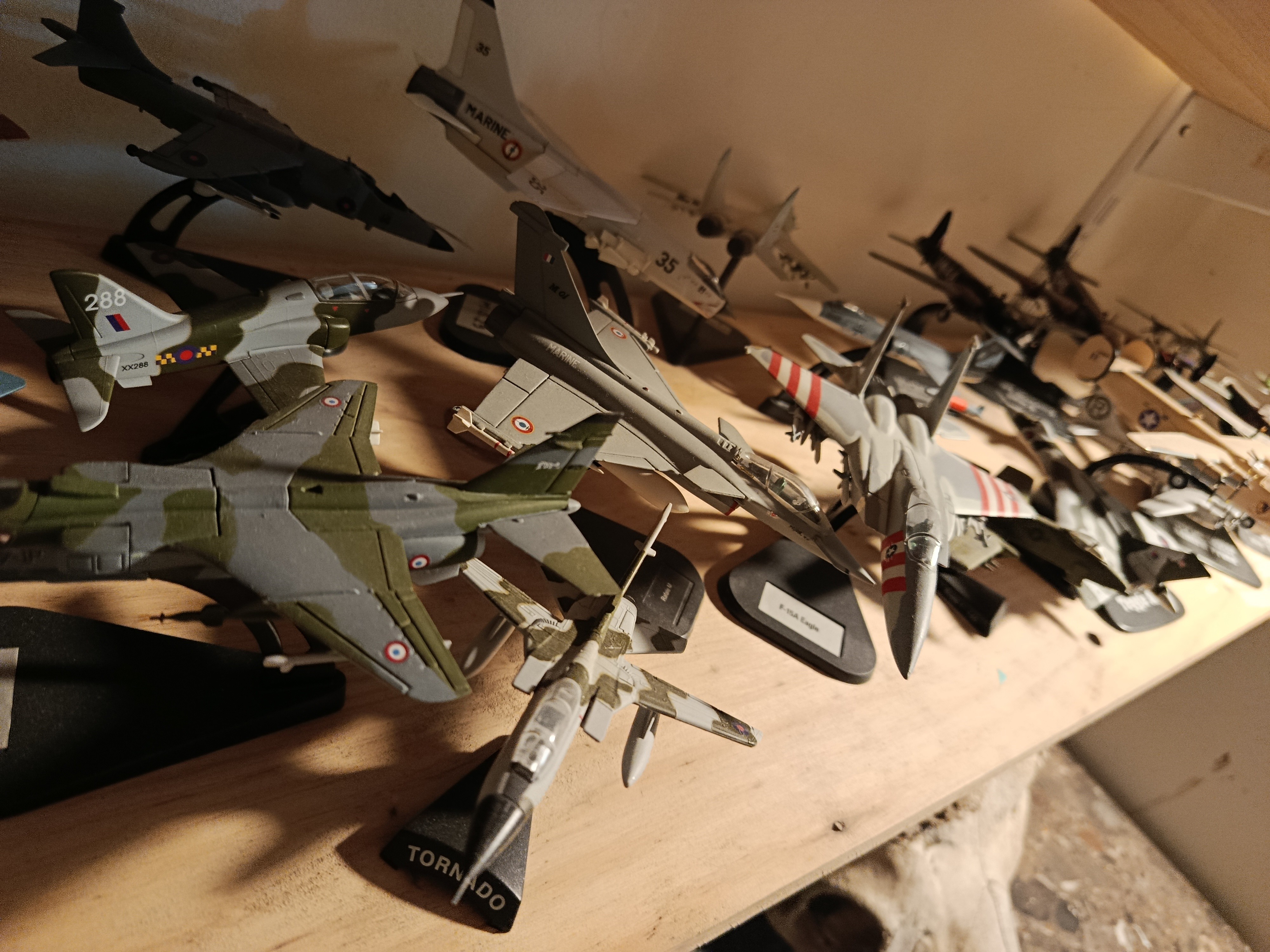 Grosse collection d'environ 50 petits avions de chasse et bombardiers (contemporains et ww2) - ils spnt tous en bon état avec leur support respectif et nom de l'avion - pas de vente au détail