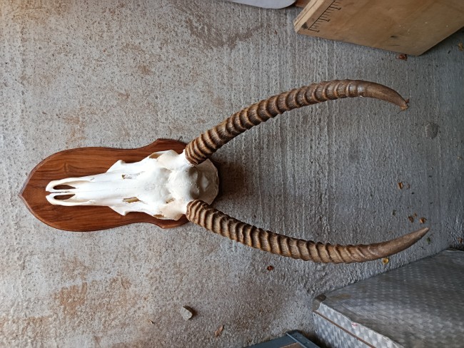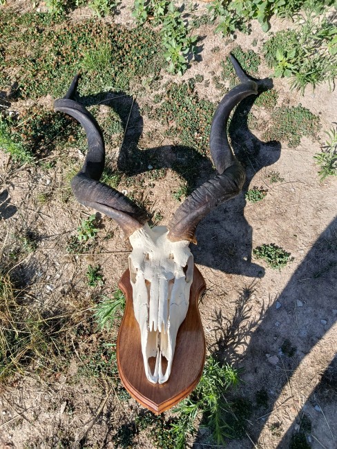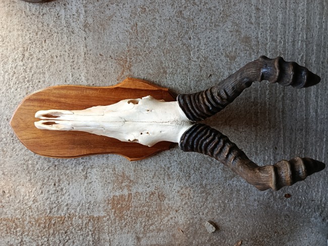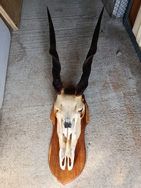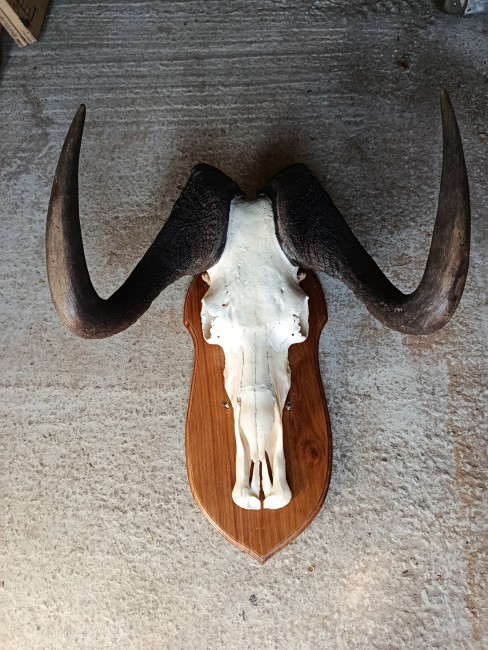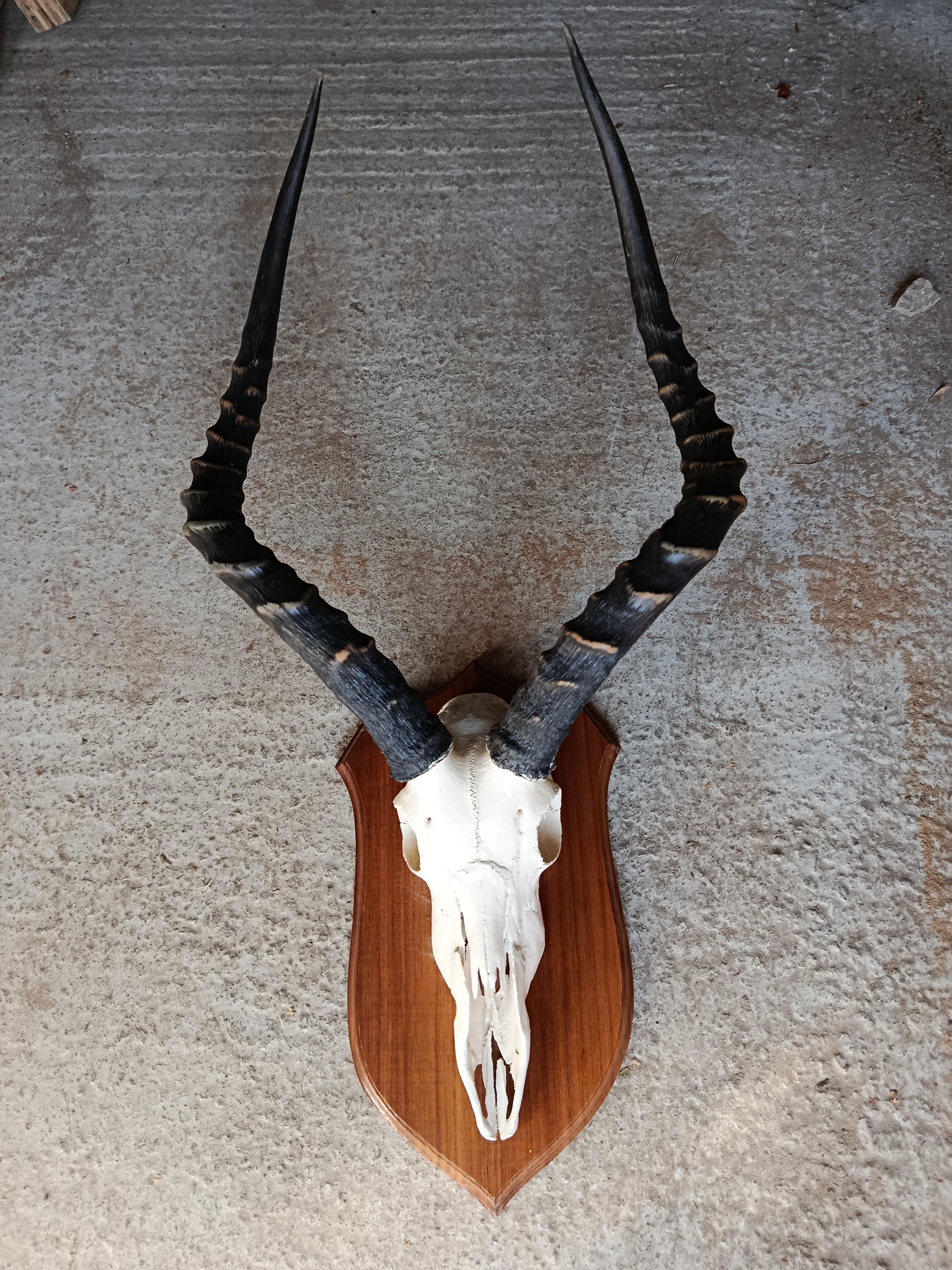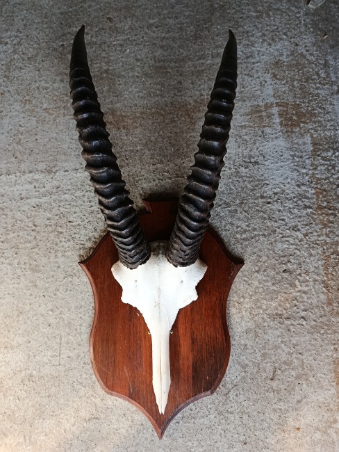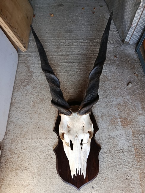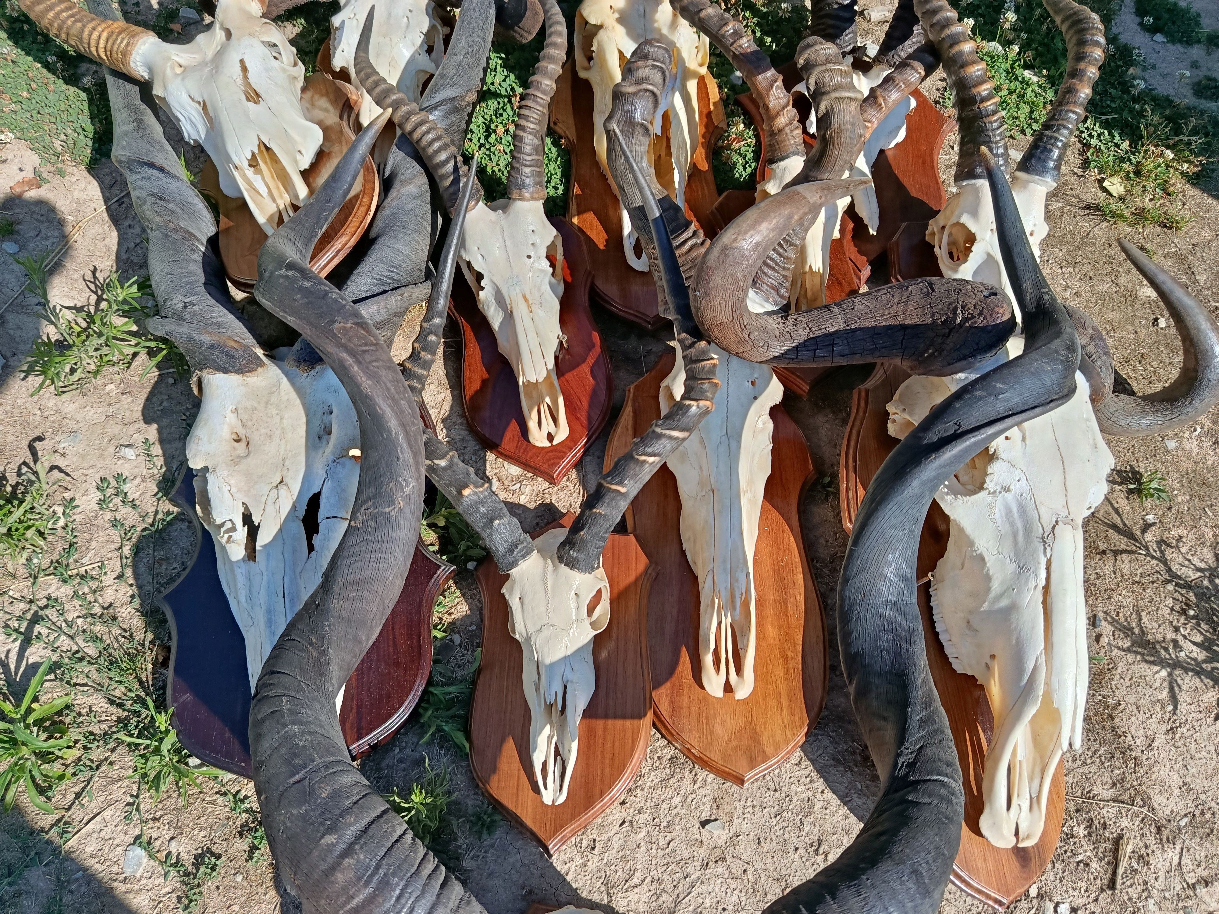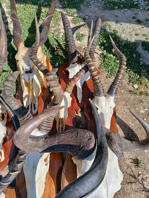 Une dizaine de massacres africains - avec médaillons en bois pour l'accroche - springbox - bubal - koudou - gnou - buffle - kob - élan du cap ...