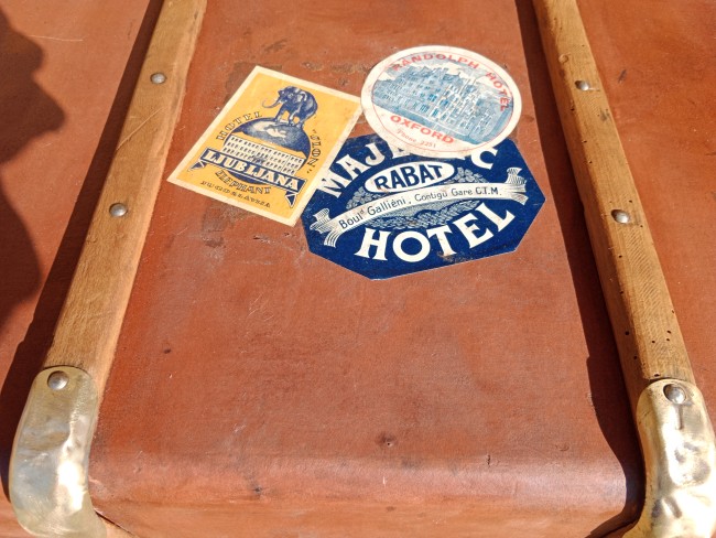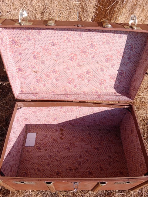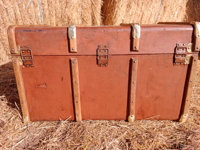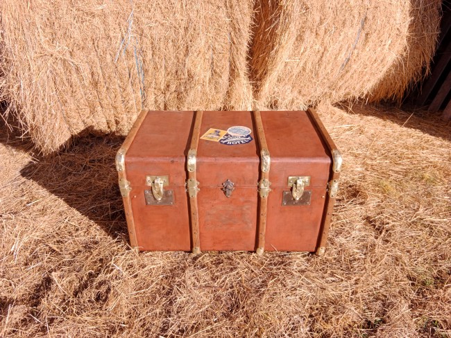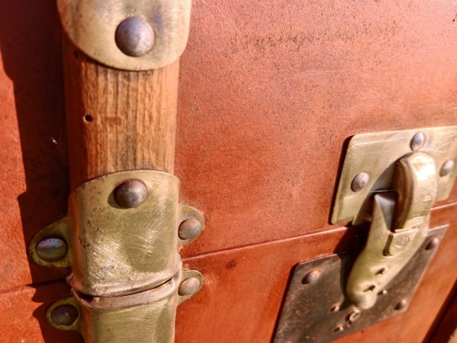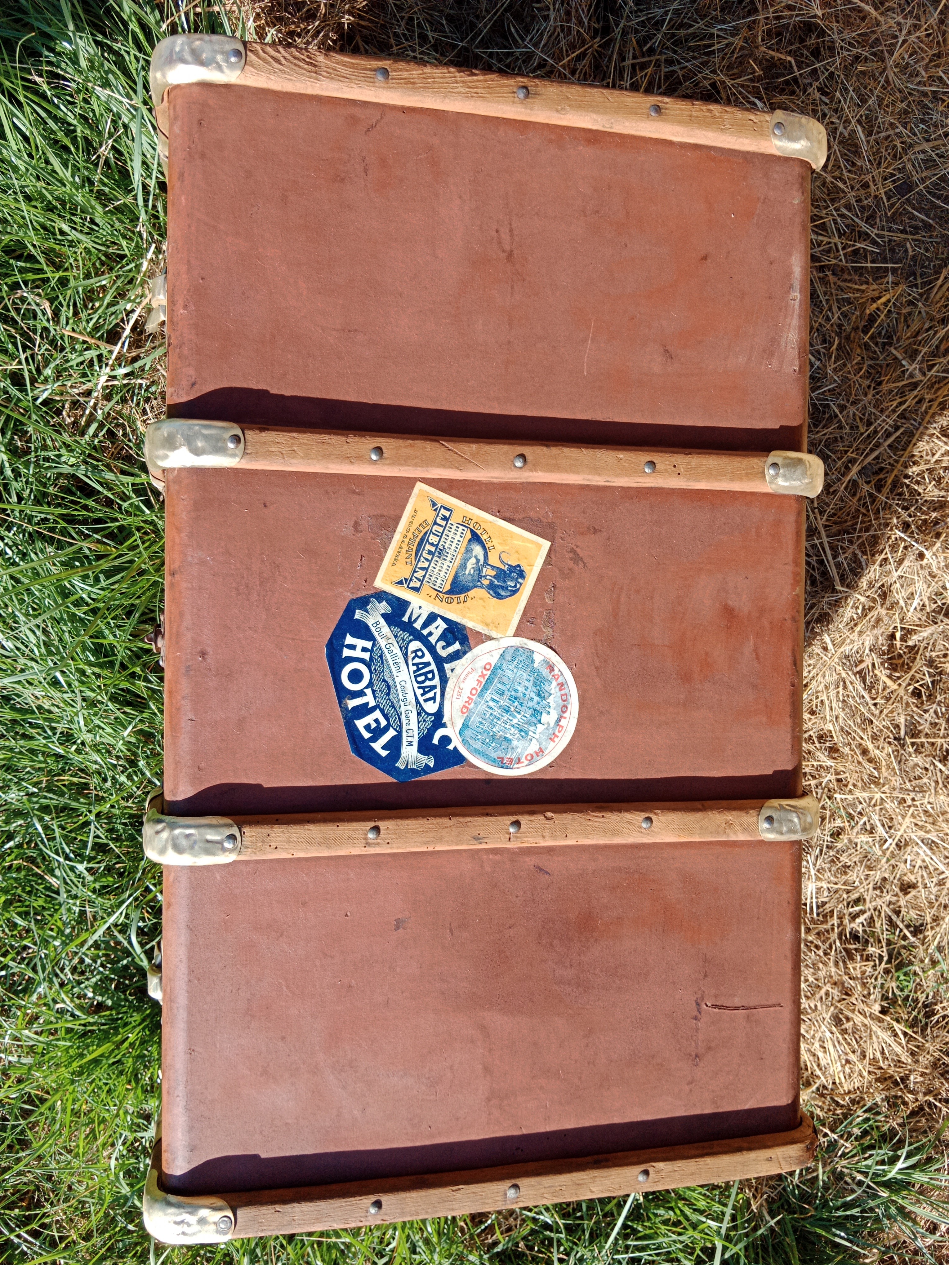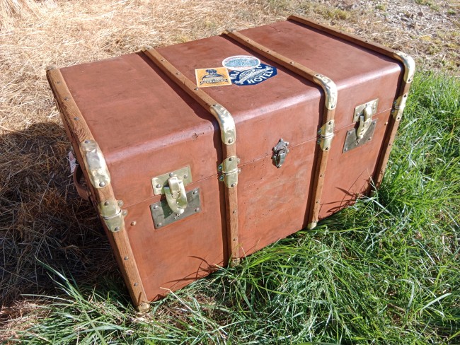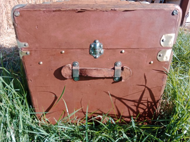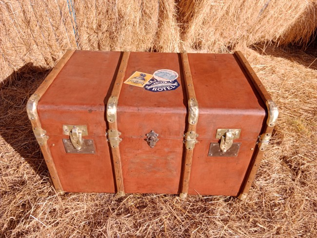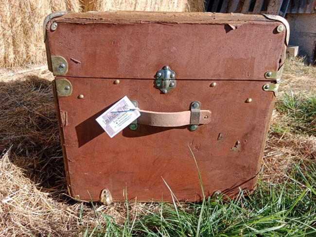 C'est une malle qui a beaucoup voyagé - appelée malle courrier ou malle cintrée - cette malle était déstinée pour les voyages en bateau ou en train - cintrage en hêtre - fût en peuplier - revêtement en matière vulcanisée - bel aspect ocre doré avec étiquettes anciennes d'hotel - idéale en table basse ou bar