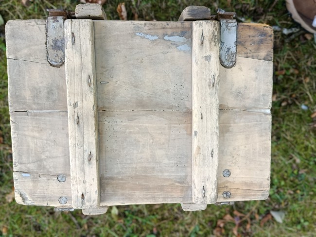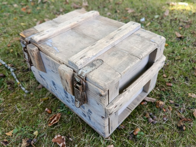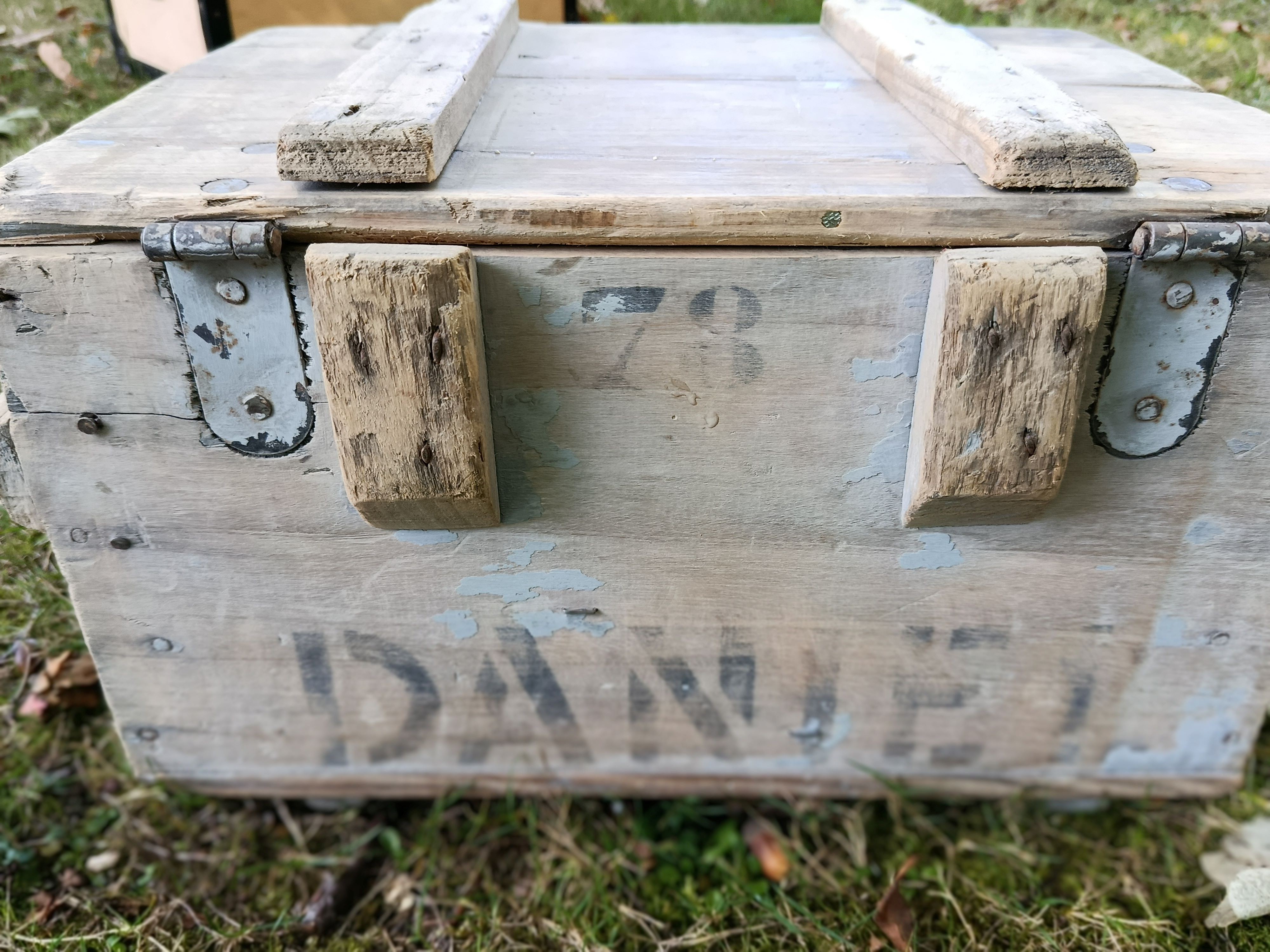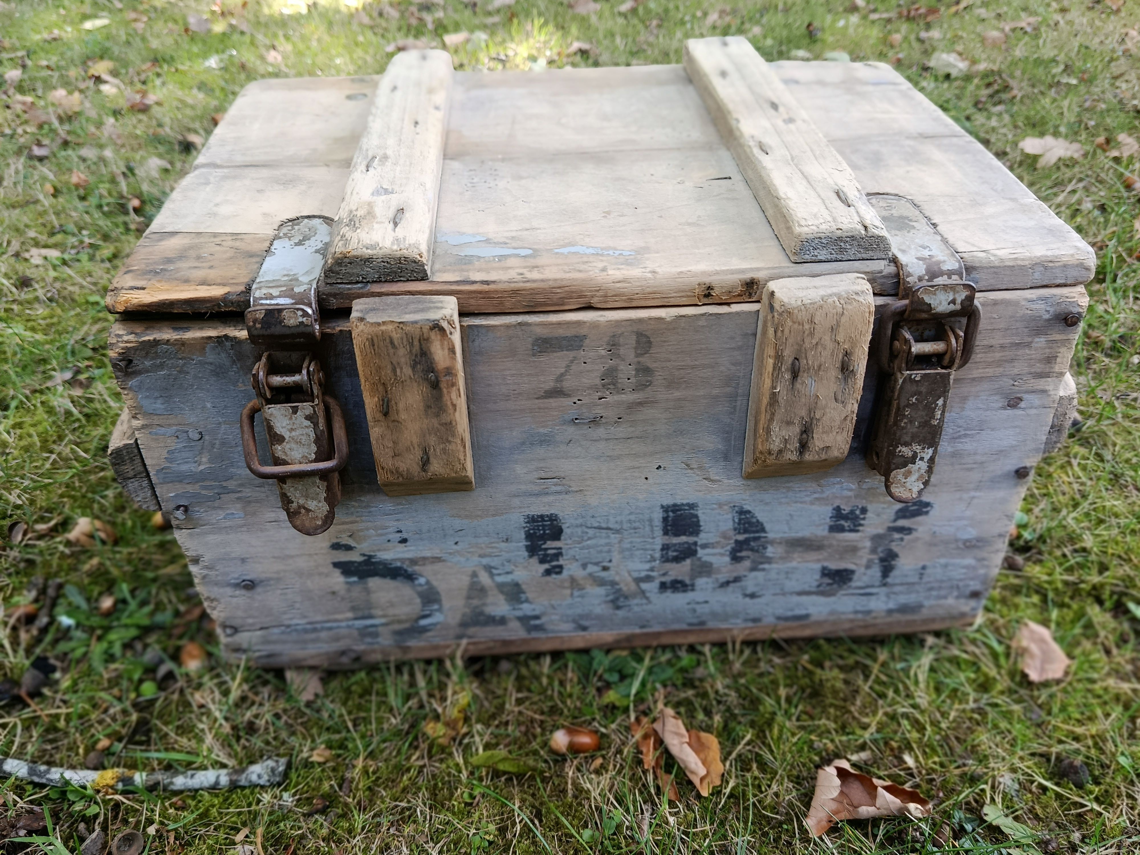Petite caisse à munitions datant de la seconde guerre mondiale - très sympa dans son format et ses gros fermoirs - inscriptions sur le bois visibles - solide - idéale pour intérieur indus - loft - artiste - rangement de pinceaux - peintures - photos - crayons - bijoux - petit matériel - peu servir de tabouret