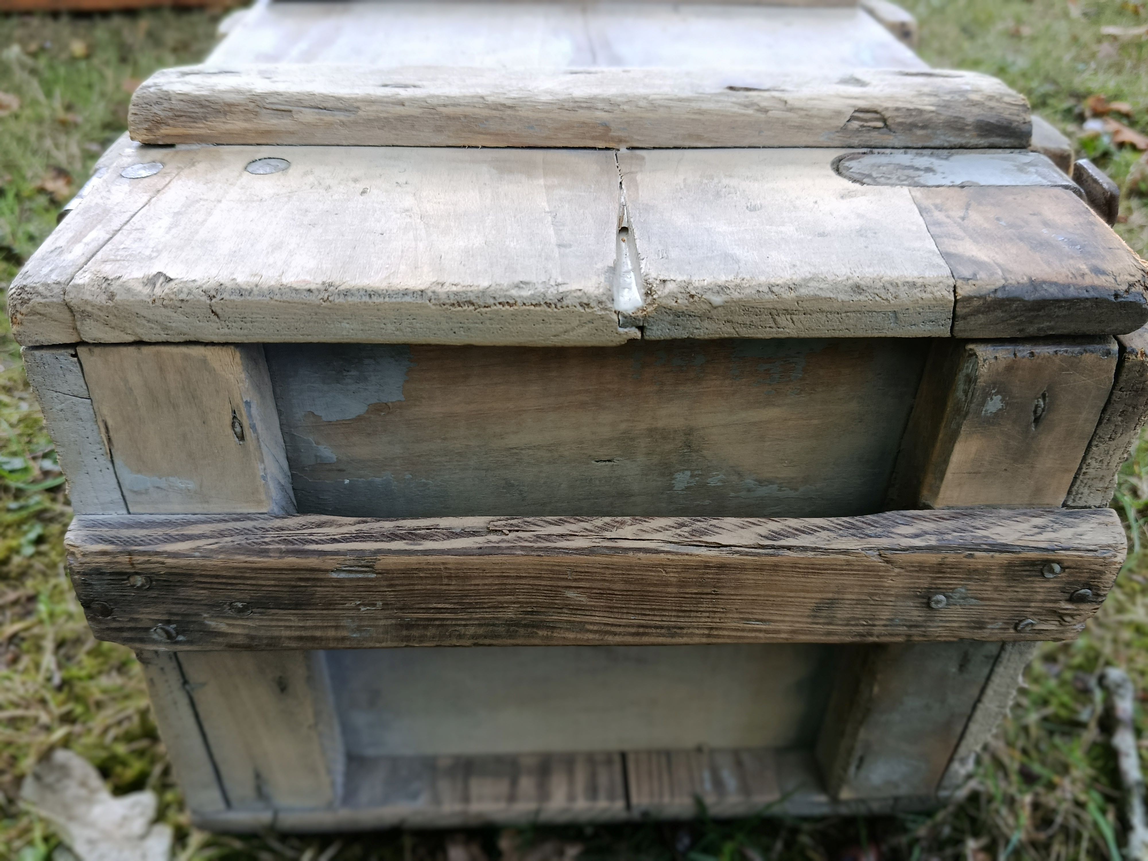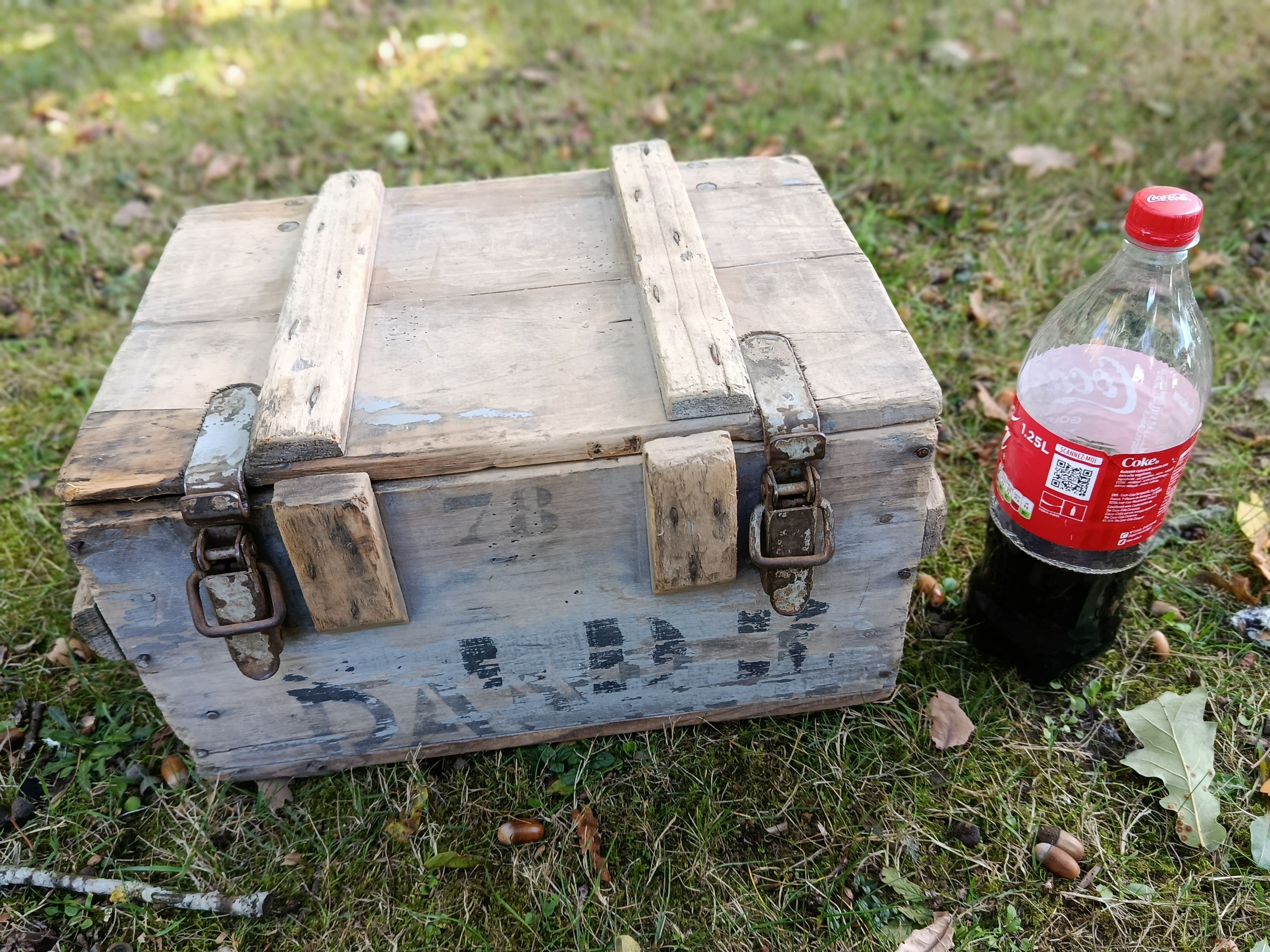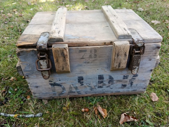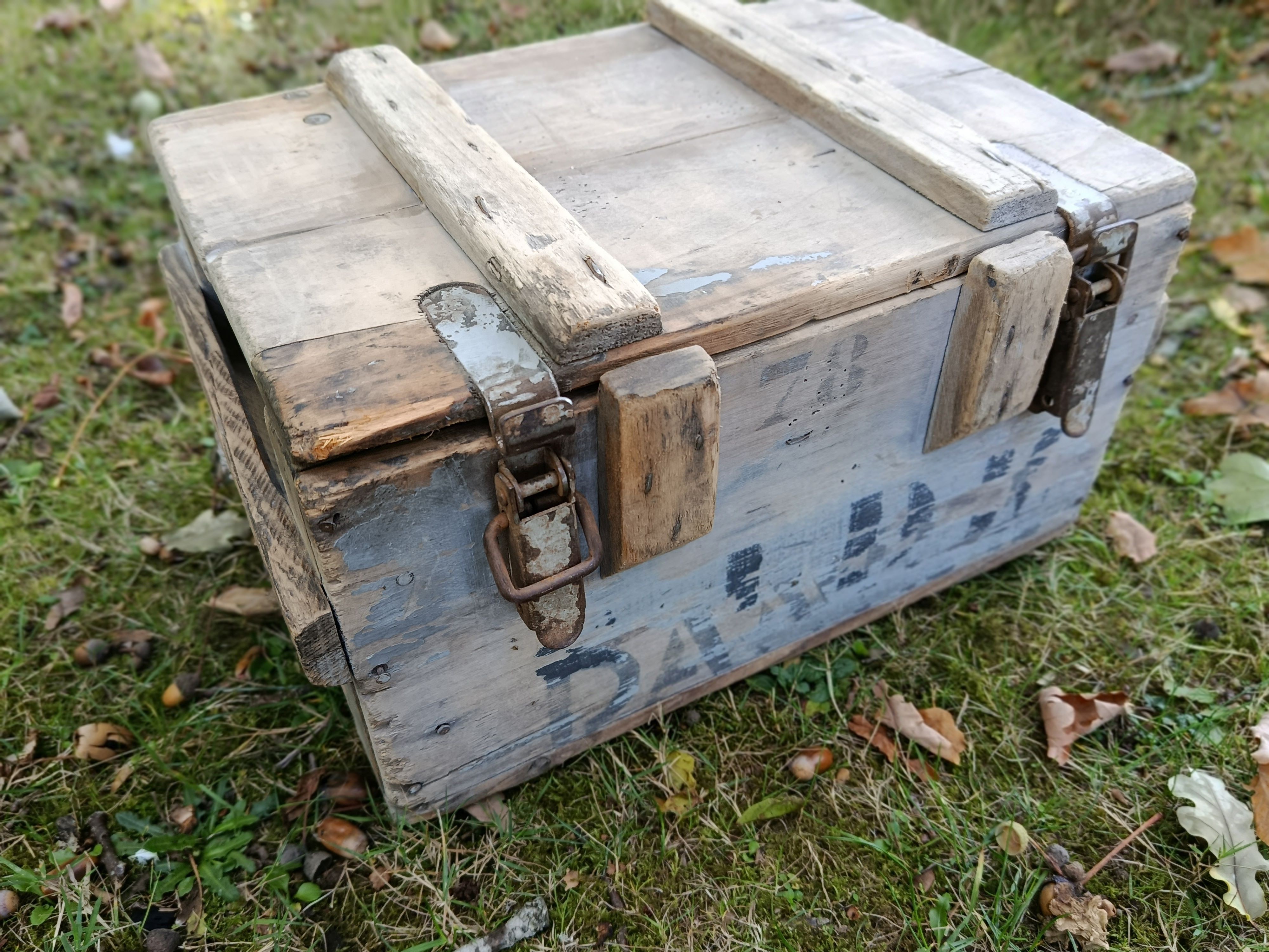 Petite caisse à munitions datant de la seconde guerre mondiale - très sympa dans son format et ses gros fermoirs - inscriptions sur le bois visibles - solide - idéale pour intérieur indus - loft - artiste - rangement de pinceaux - peintures - photos - crayons - bijoux - petit matériel - peu servir de tabouret