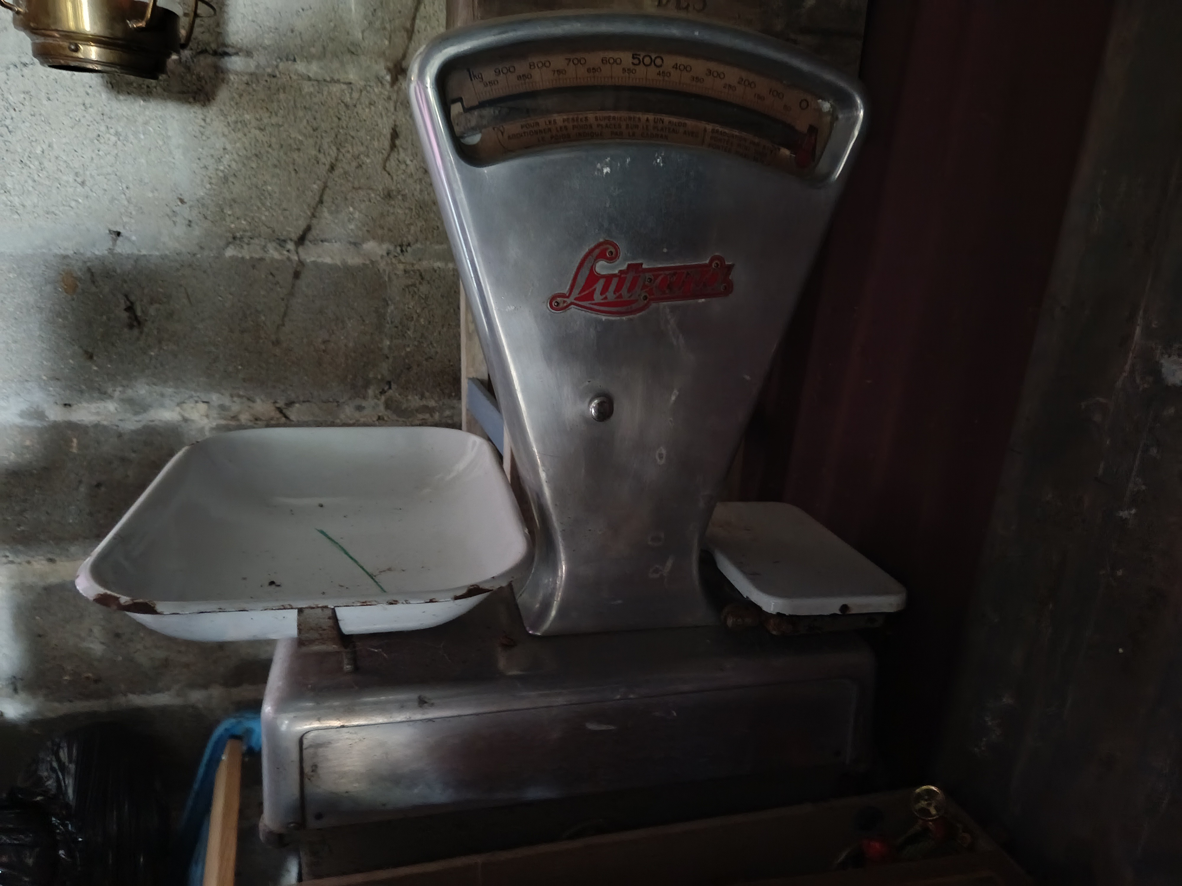 Balance des années 50 avec plateau émaillés blancs - la structure est en alu - très déco - provient d'une ancienne épicerie de village - assez lourde
