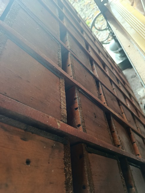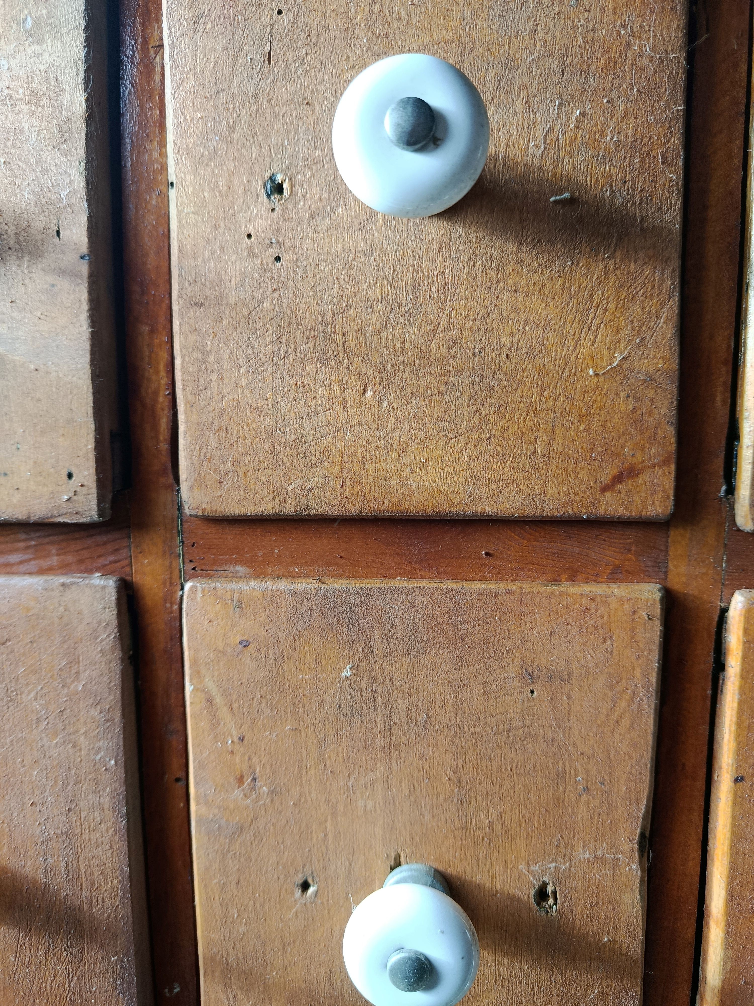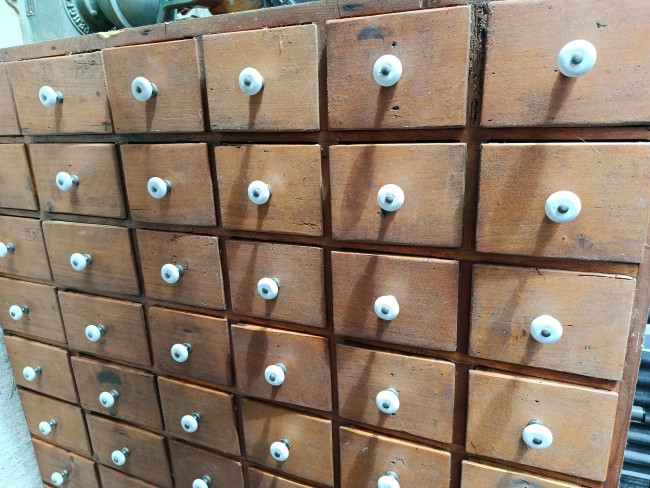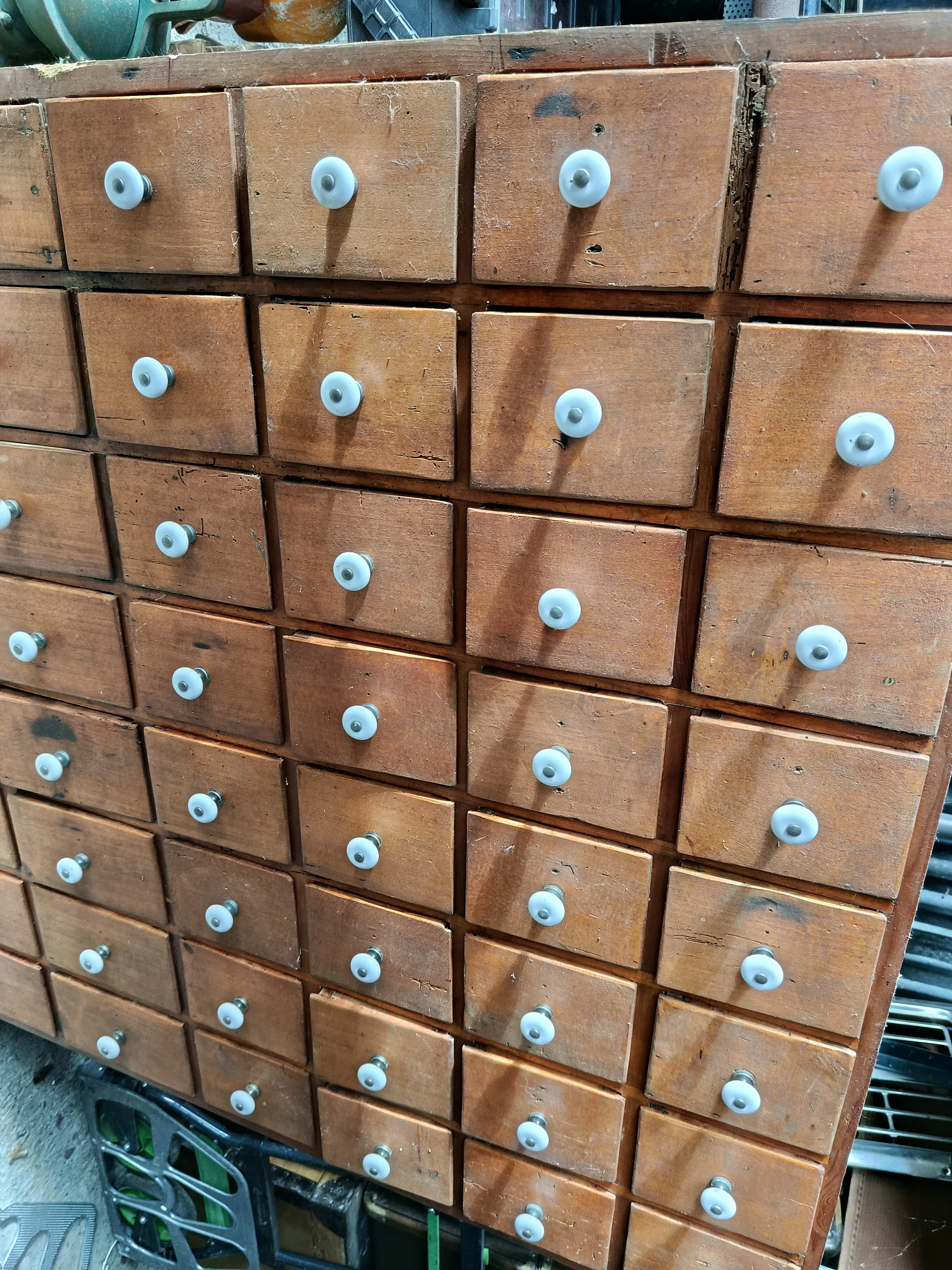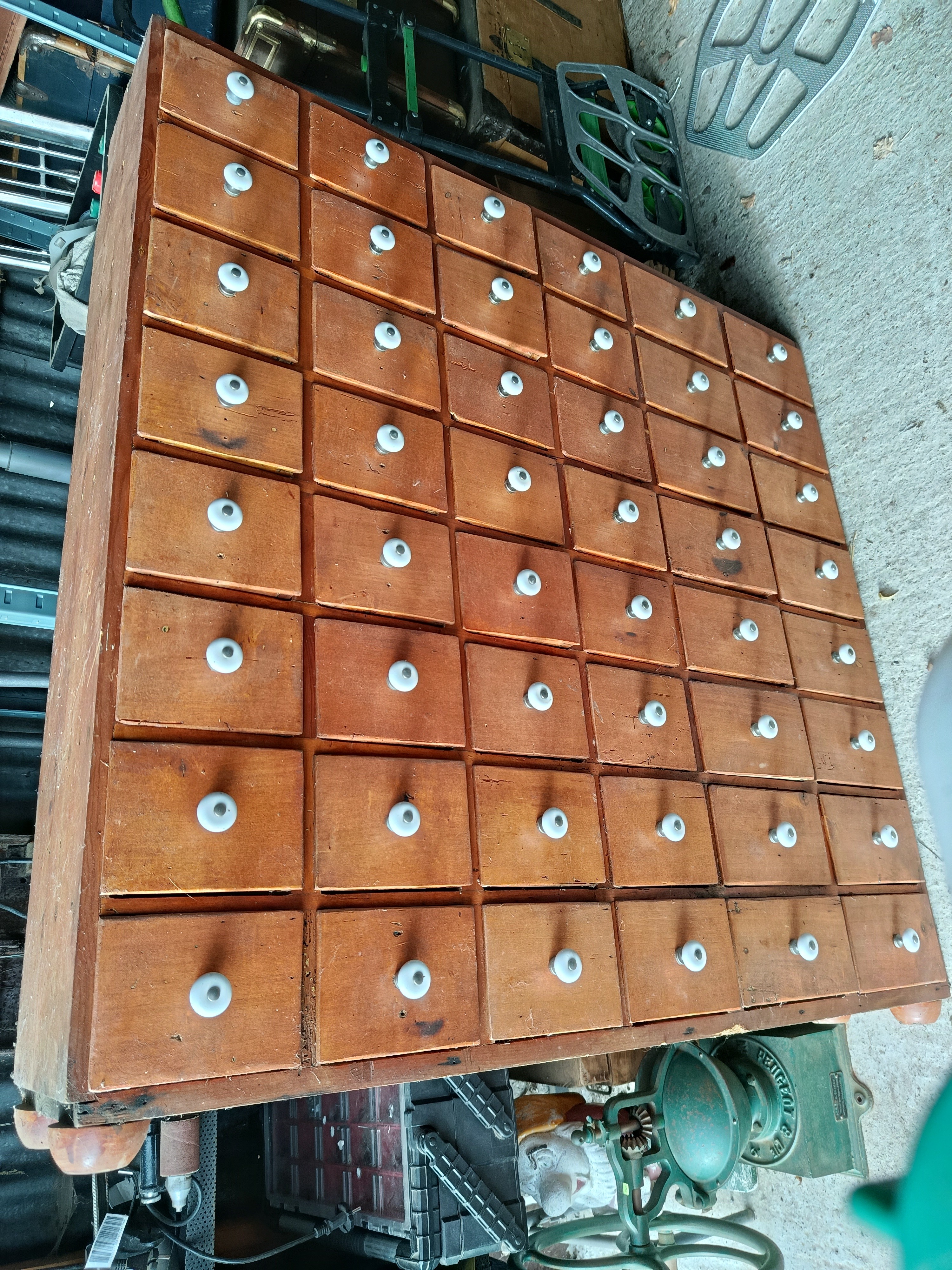 Meuble ancien de mercerie - 48 tiroirs - dimensions : 119 haut x 120 large x 23 prof - dimensions intérieures des tiroirs : 32 tiroirs 11L X 19P X 11H et 16 tiroirs plus larges 16,5L X 19P X 11H