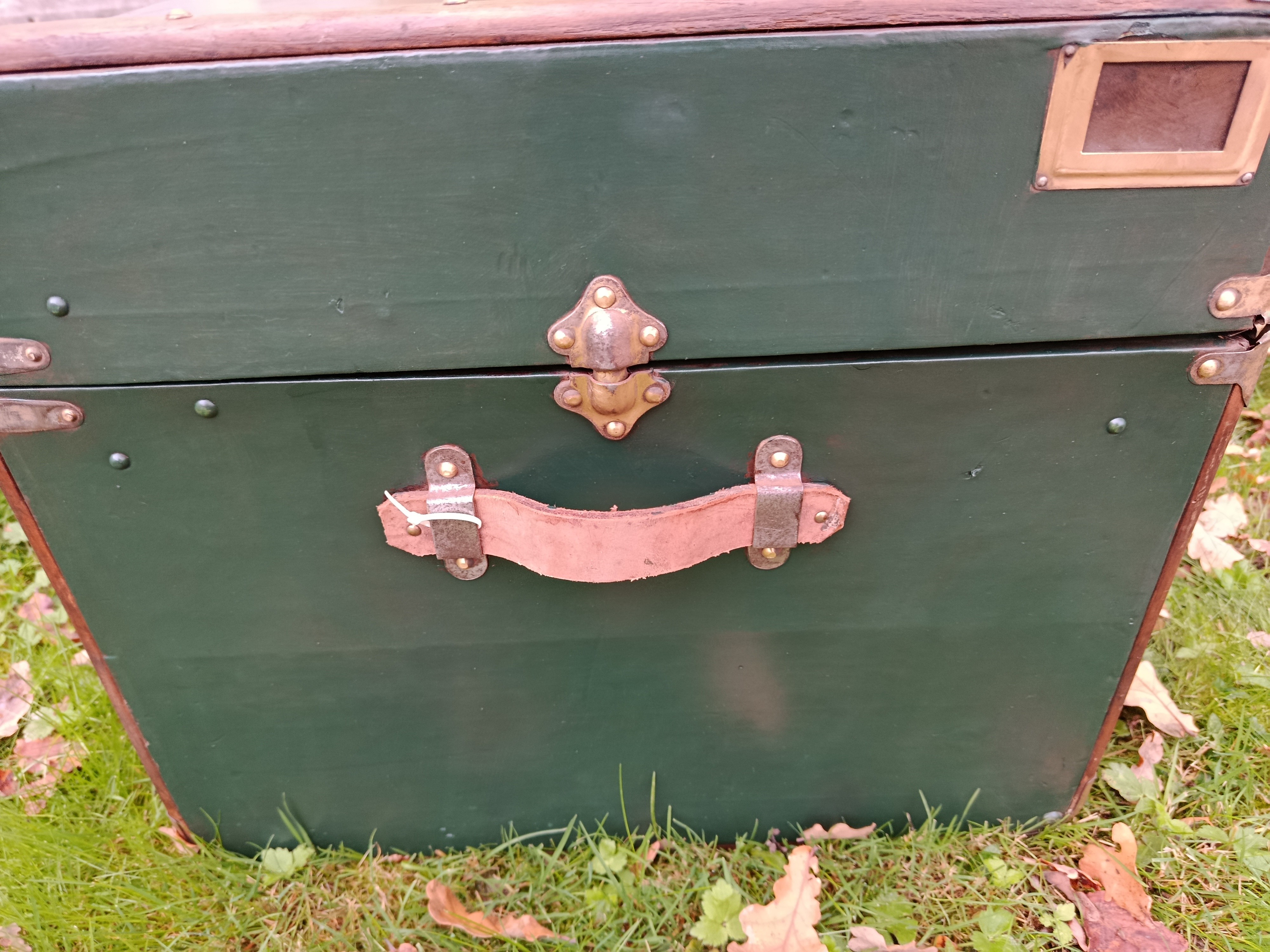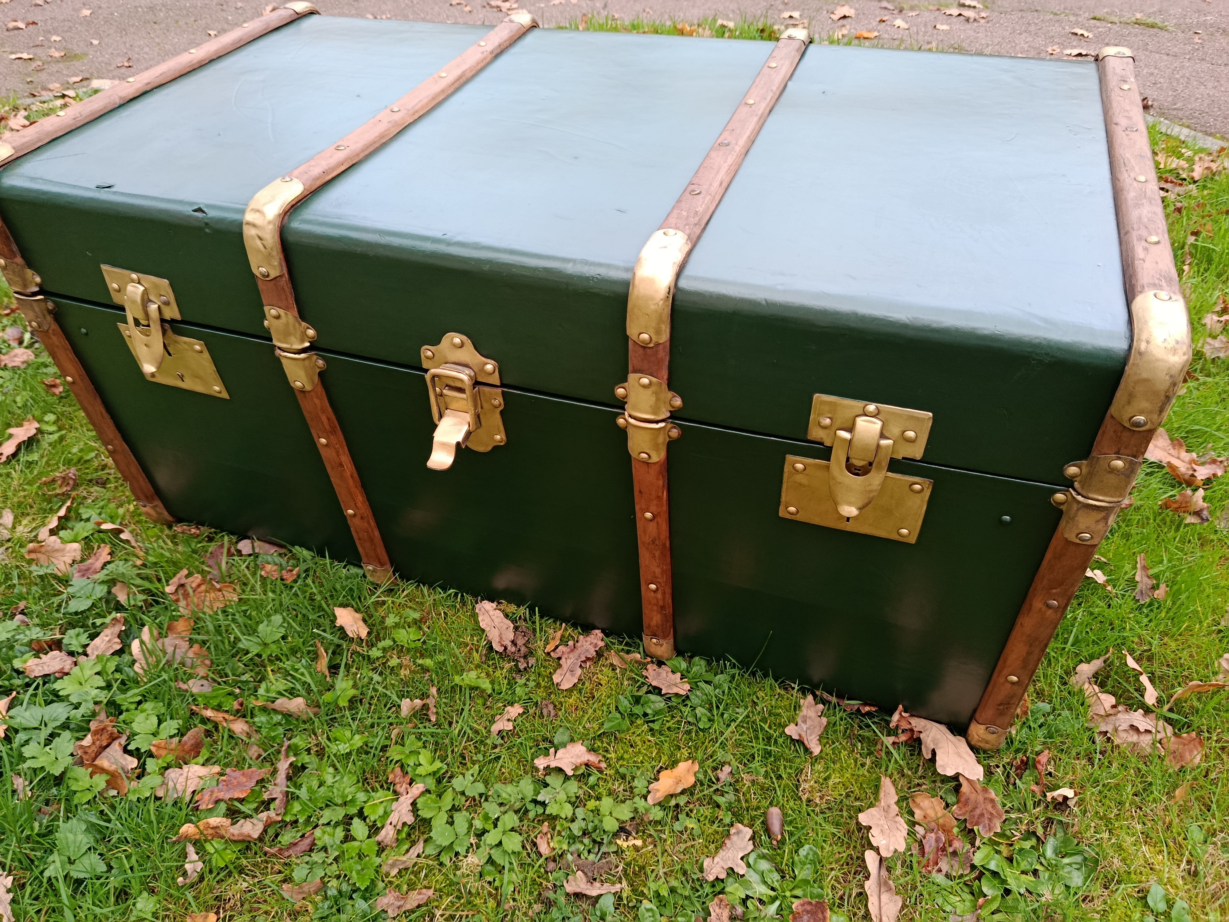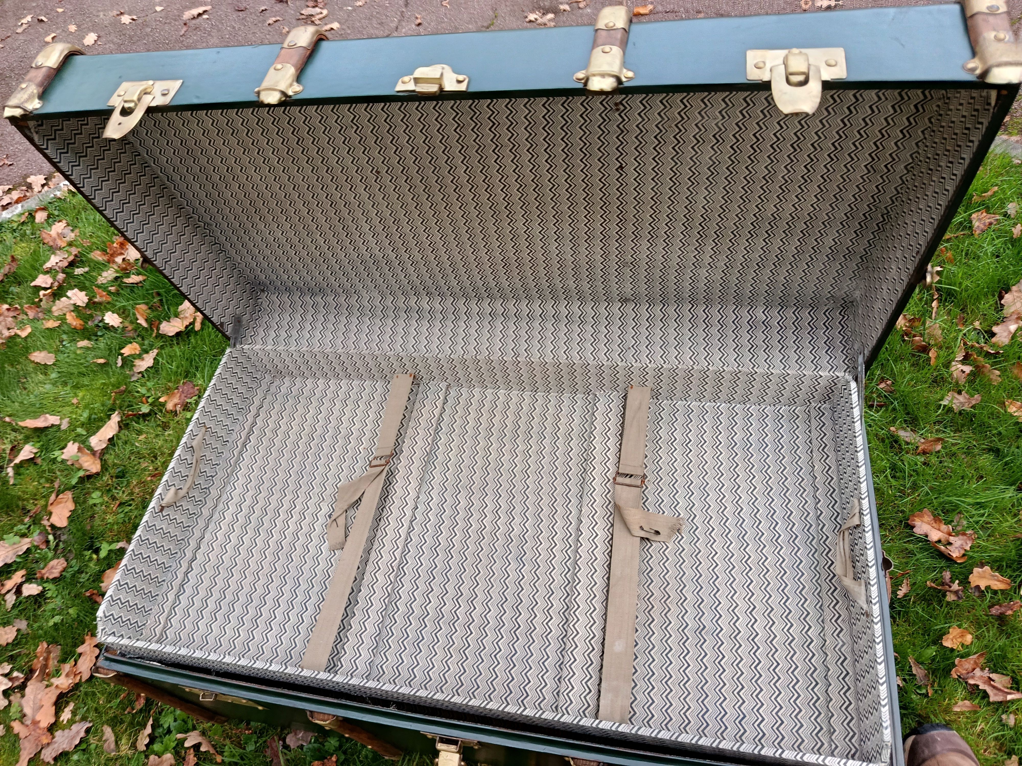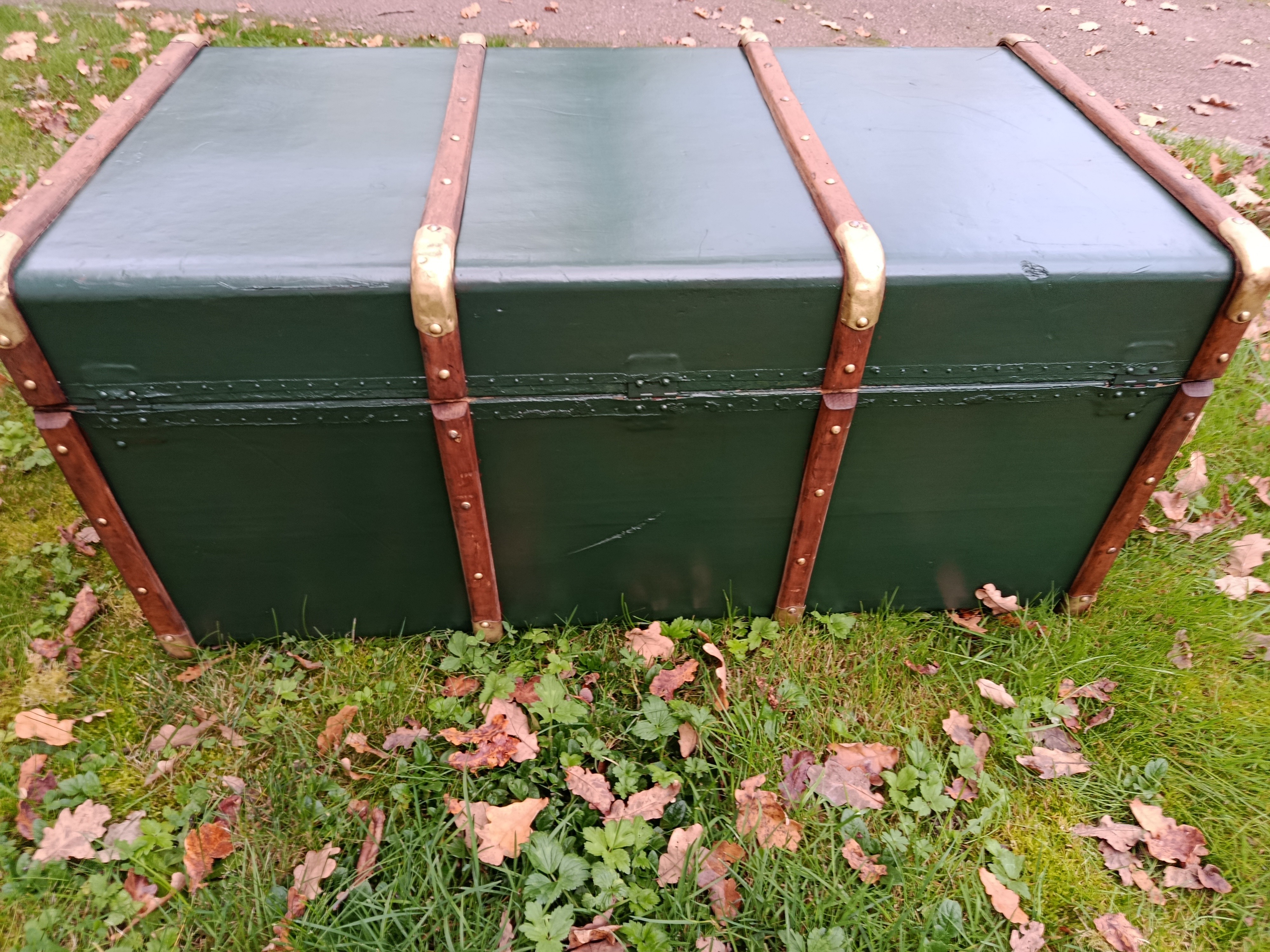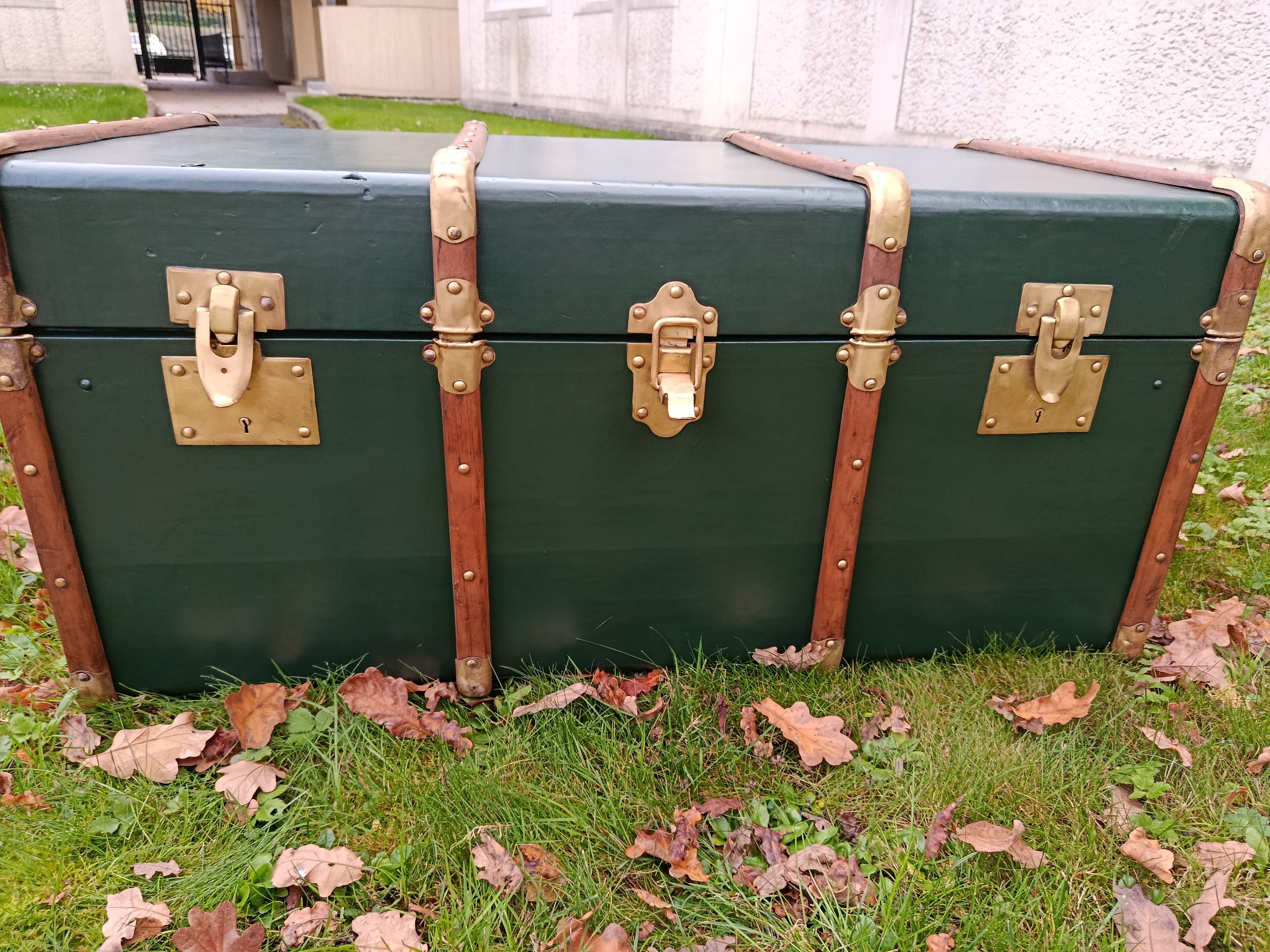 Malle cintrée années 30 - structure en bois de peuplier - revêtement vulcanisé vert sapin - intérieur avec châssis amovible - tissu d'origine - c'est une malle de belle capacité - très au goût du jour dans sa couleur rafraichissante et très classe - le cintrage est en hêtre et les fermoirs en laiton brossé - poignées en cuir - idéale pour faire un bar - une table basse - un bout de lit ou une table d'appoint