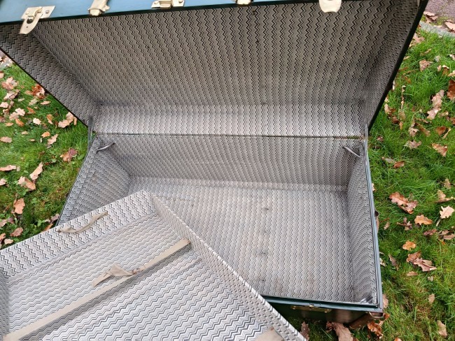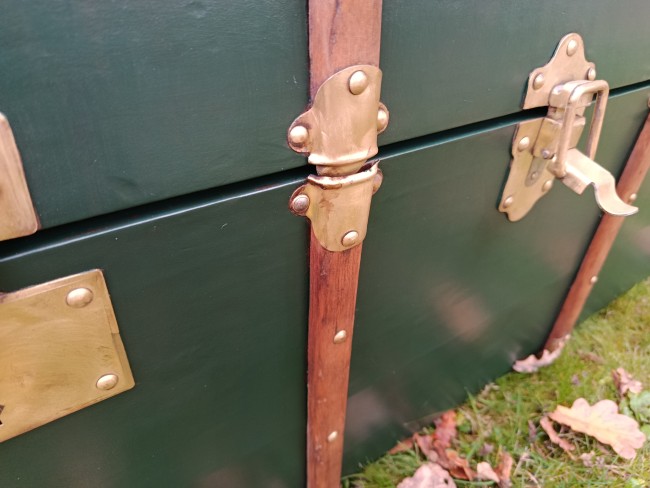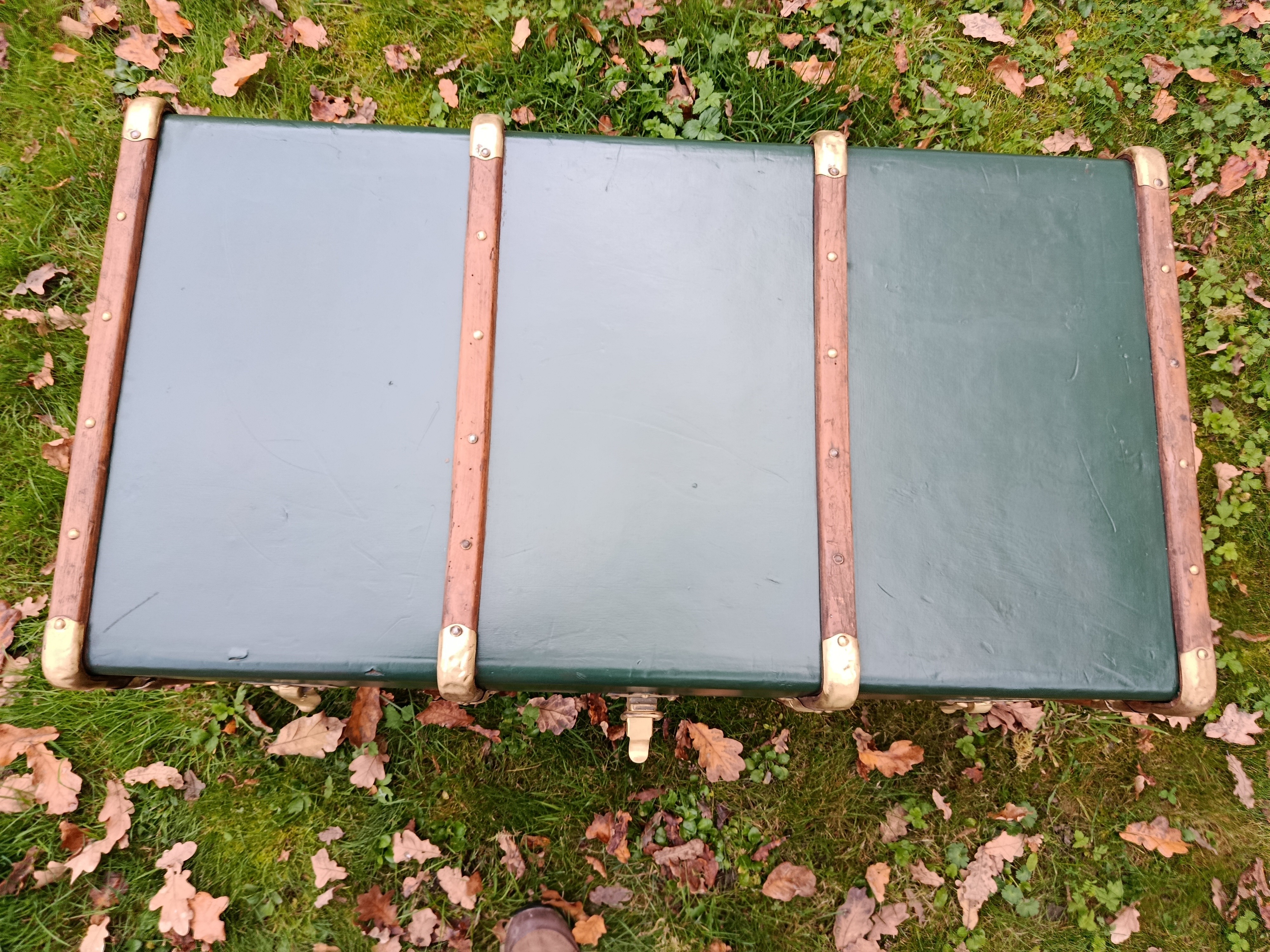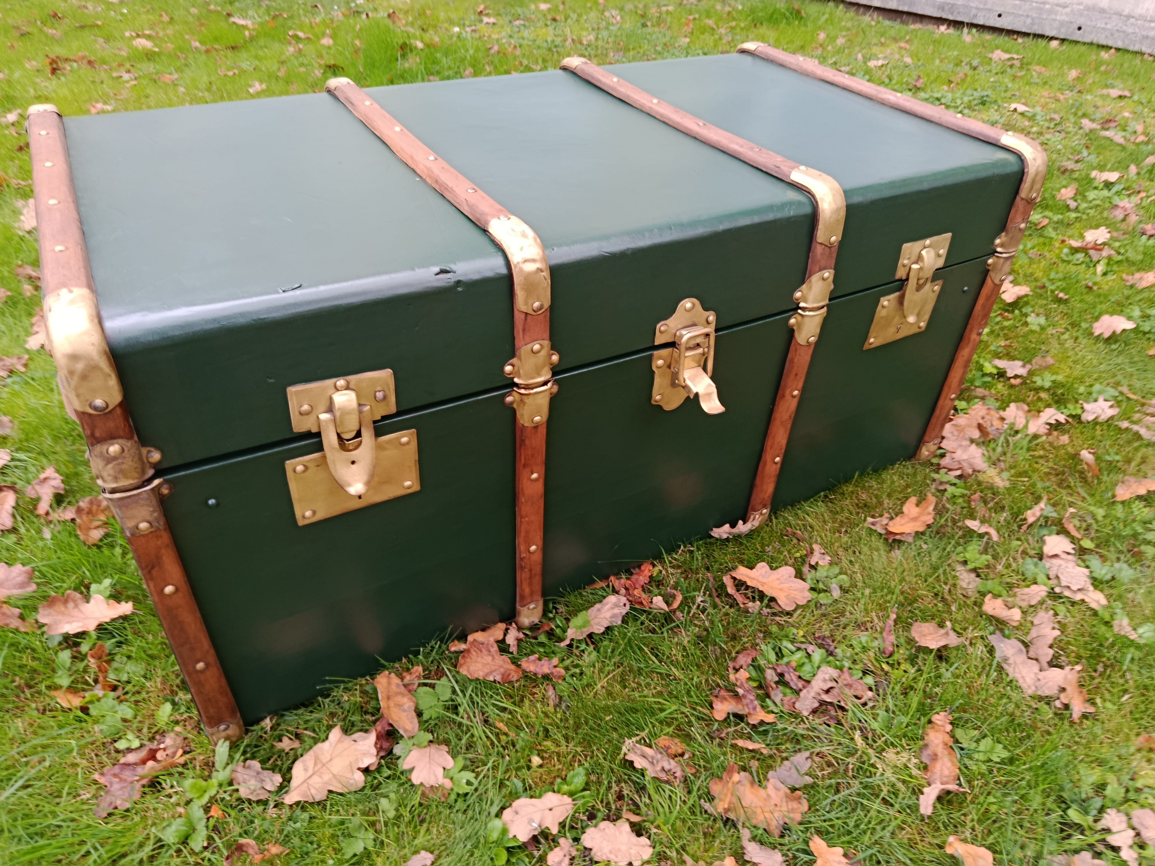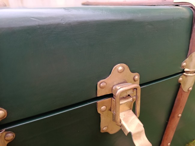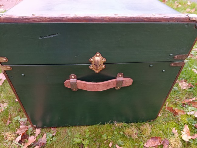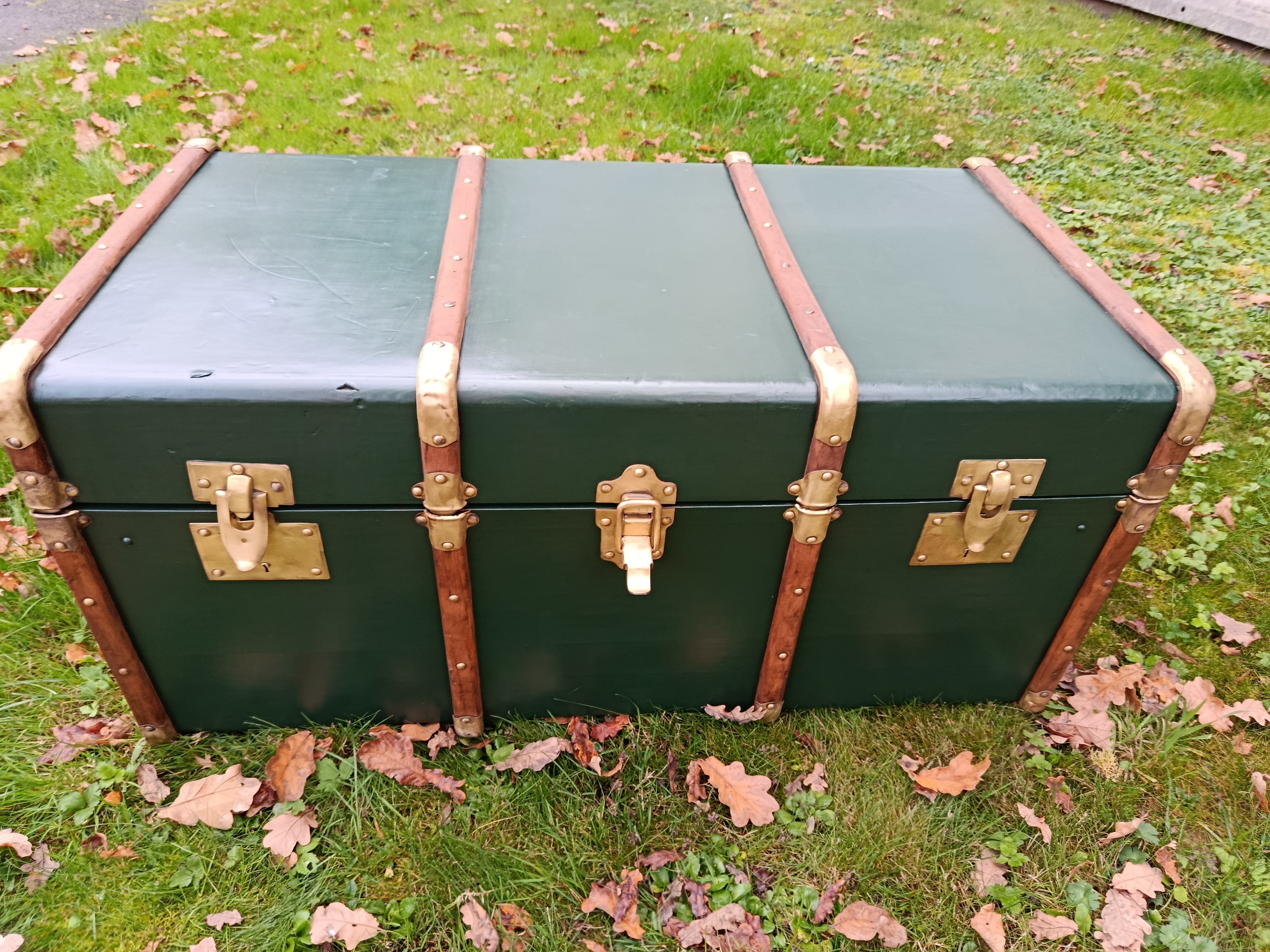 Malle cintrée années 30 - structure en bois de peuplier - revêtement vulcanisé vert sapin - intérieur avec châssis amovible - tissu d'origine - c'est une malle de belle capacité - très au goût du jour dans sa couleur rafraichissante et très classe - le cintrage est en hêtre et les fermoirs en laiton brossé - poignées en cuir - idéale pour faire un bar - une table basse - un bout de lit ou une table d'appoint