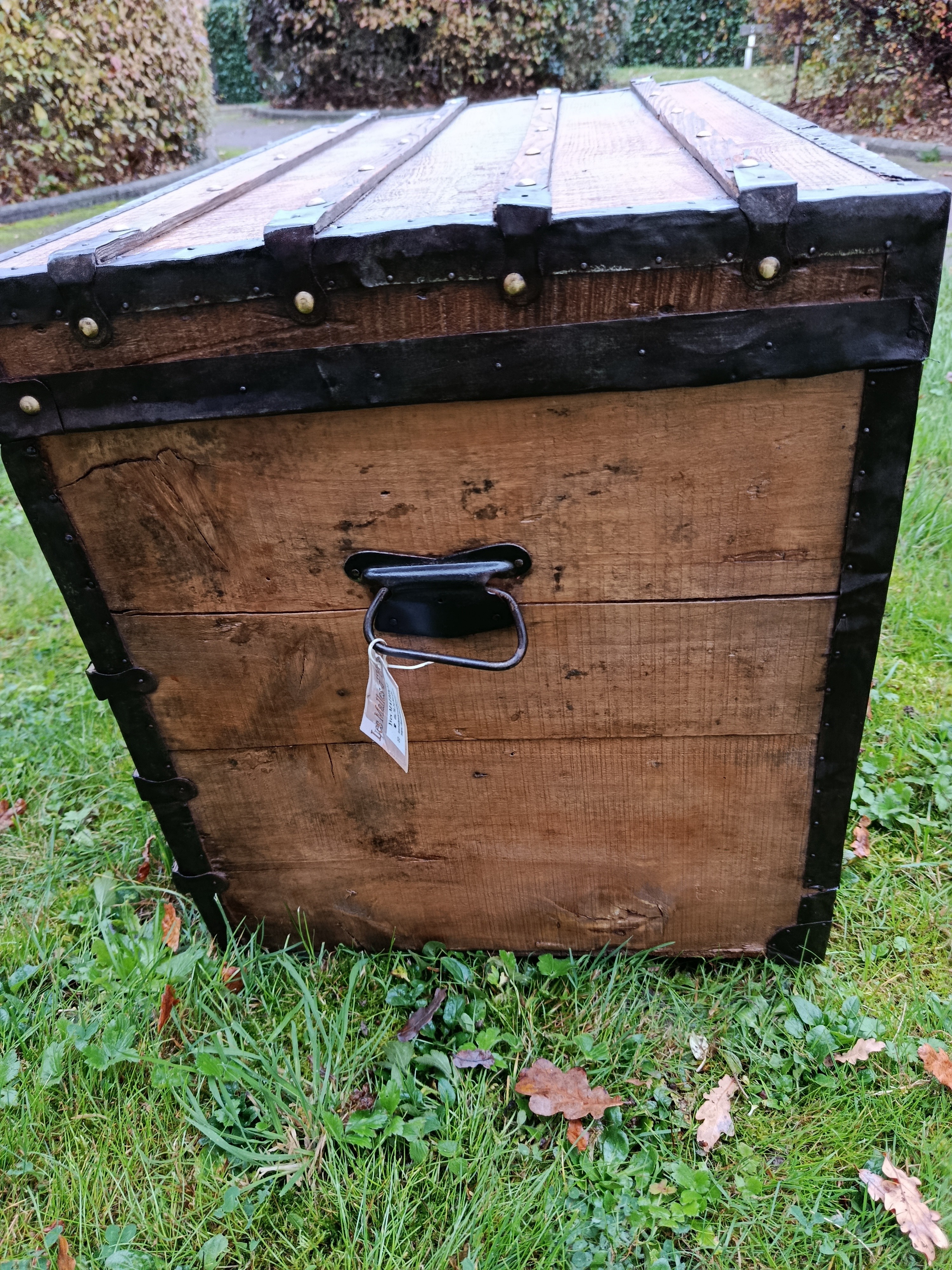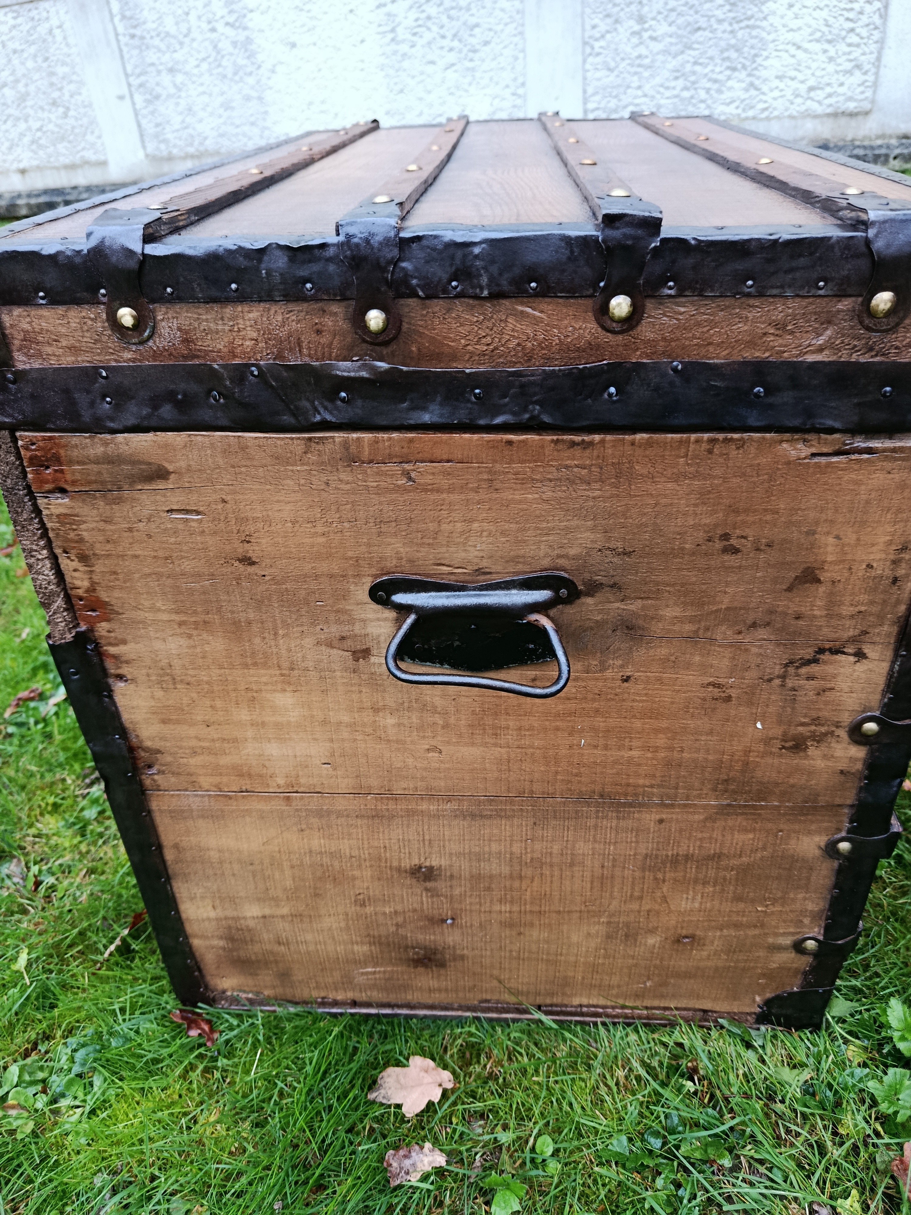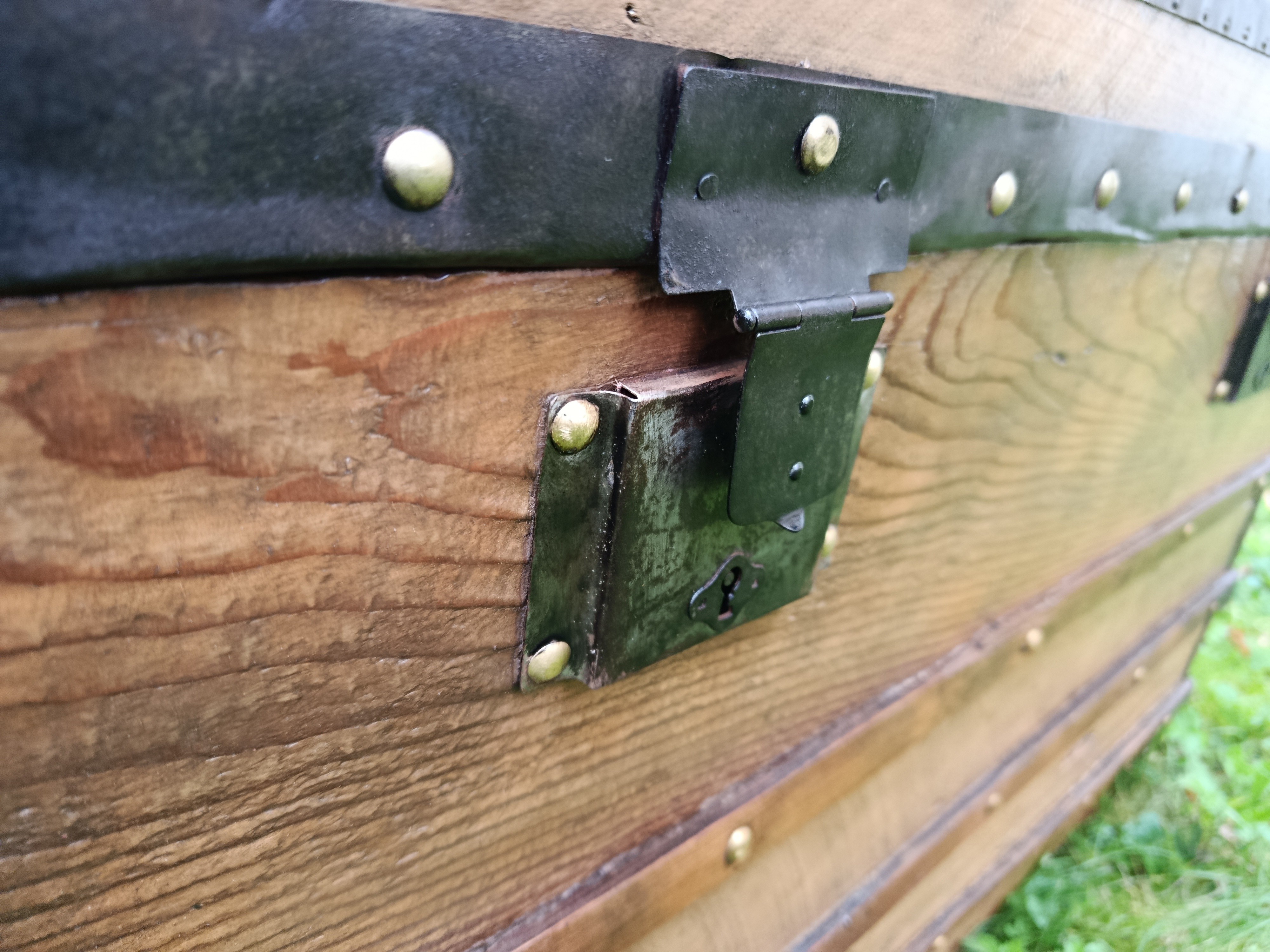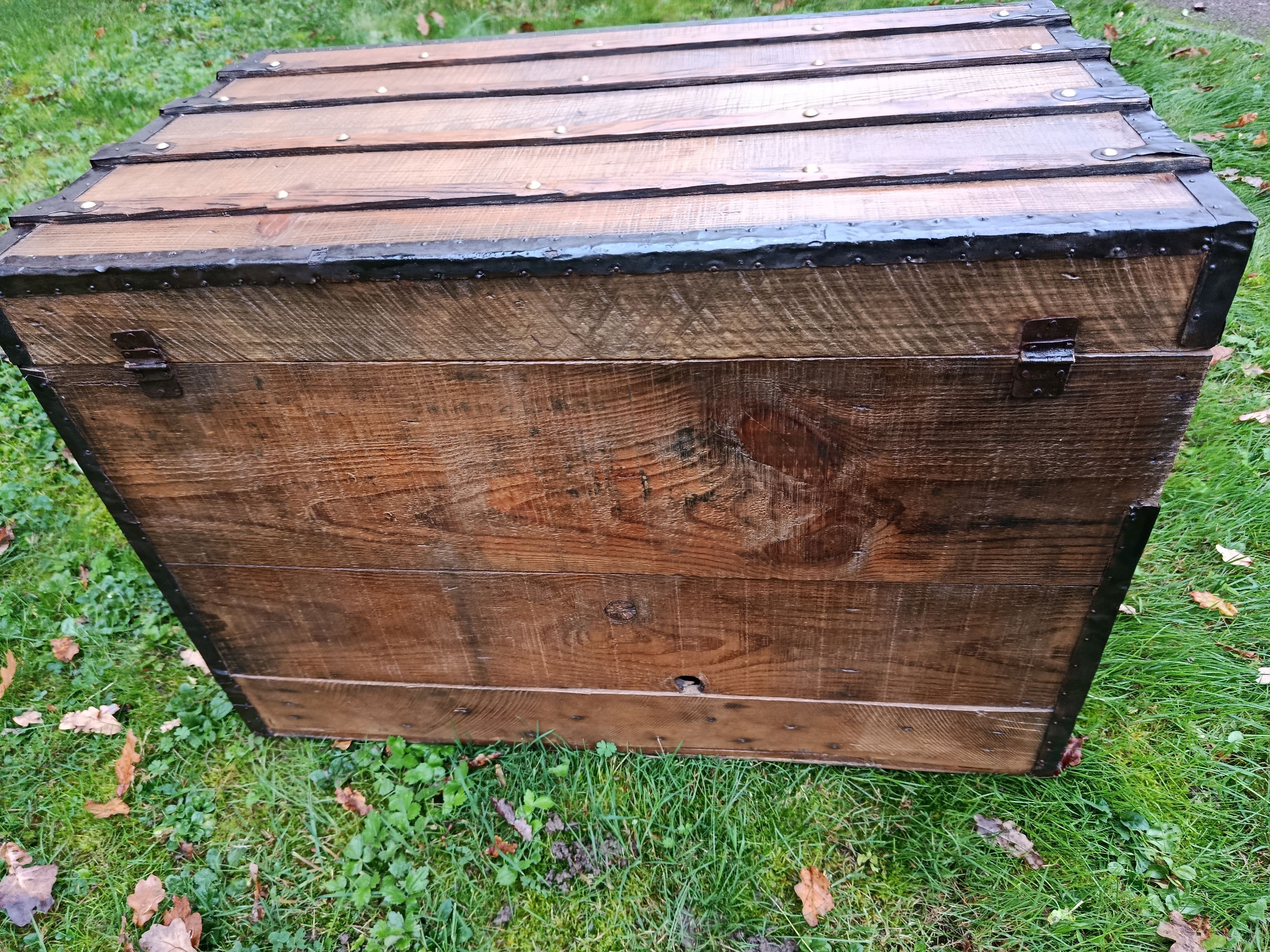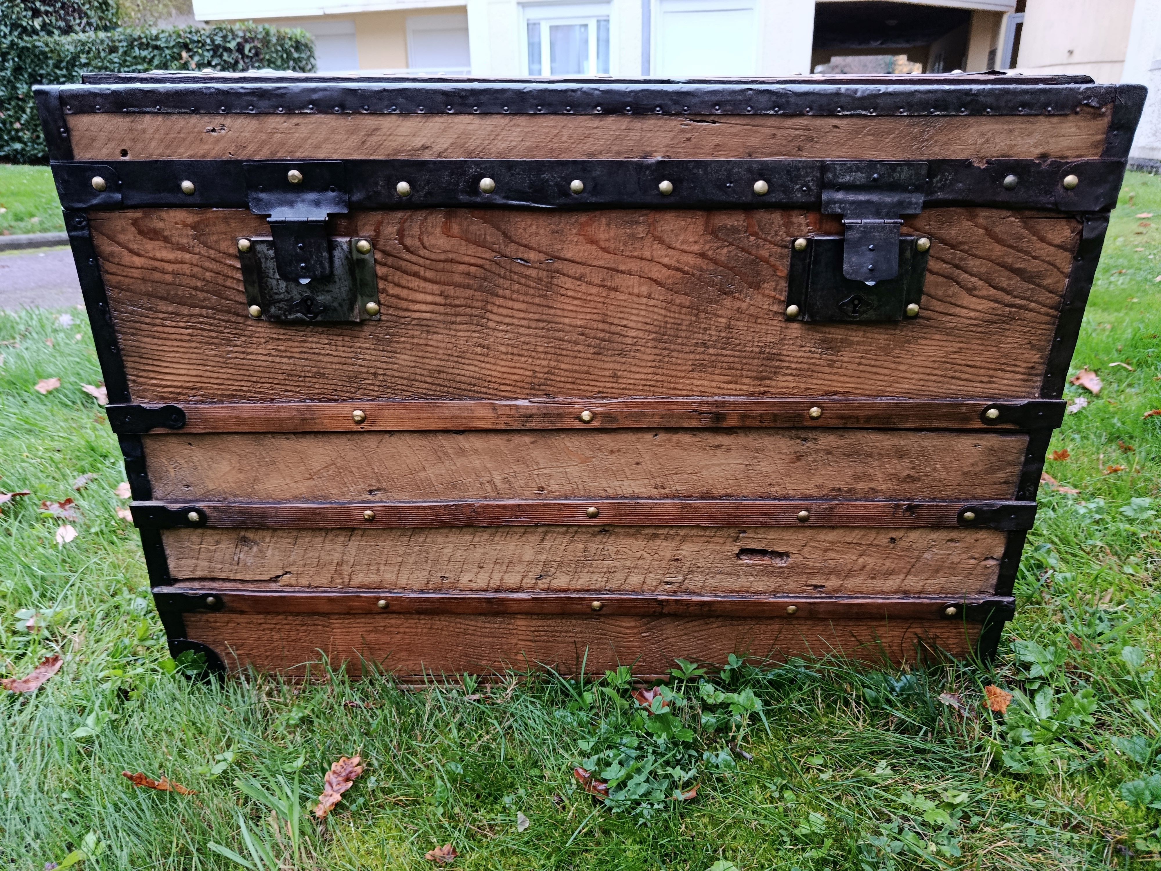 Malle courrier , début 20ème - structure en bois massif et solide - belle épaisseur de bois - traité avec plusieurs couches de vernis - bel aspect du bois - belle patine - fermoirs en acier - ferrures bross&es et passées au vernis noir spécial fer - poignées en acier - intérieur en bois naturel - idéale en bout de lit bar table d'appoint