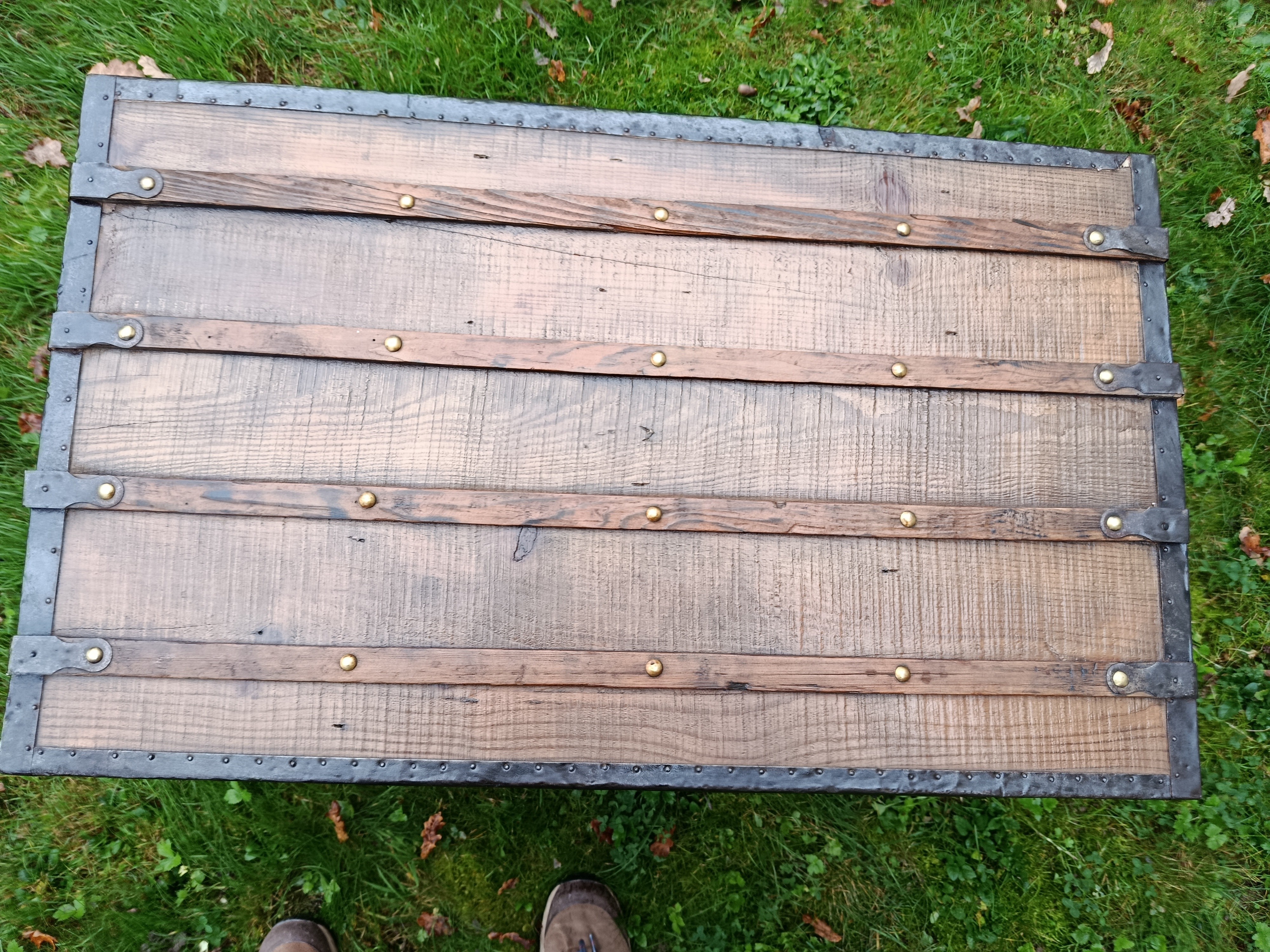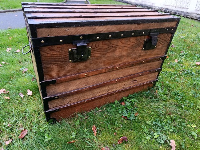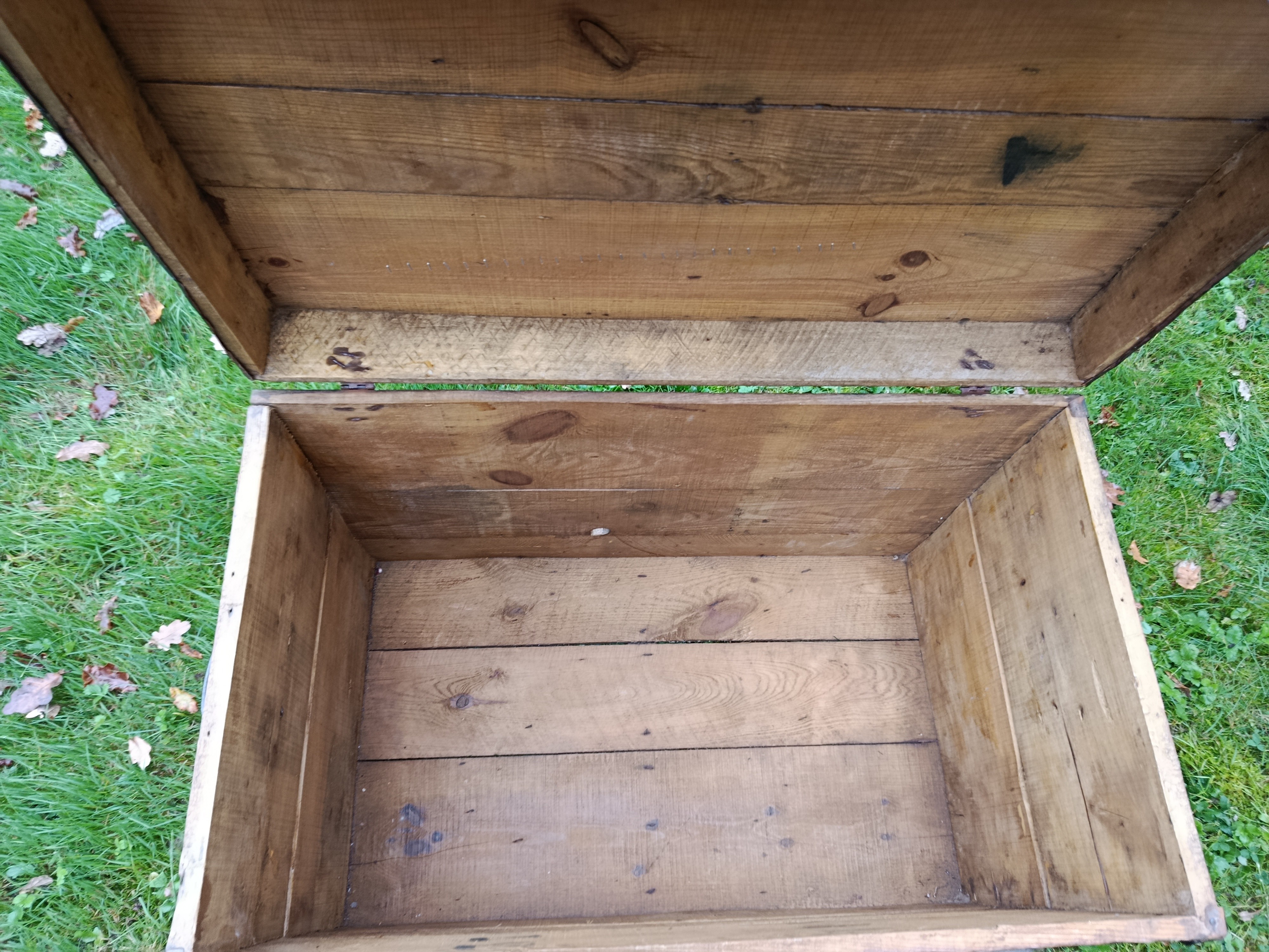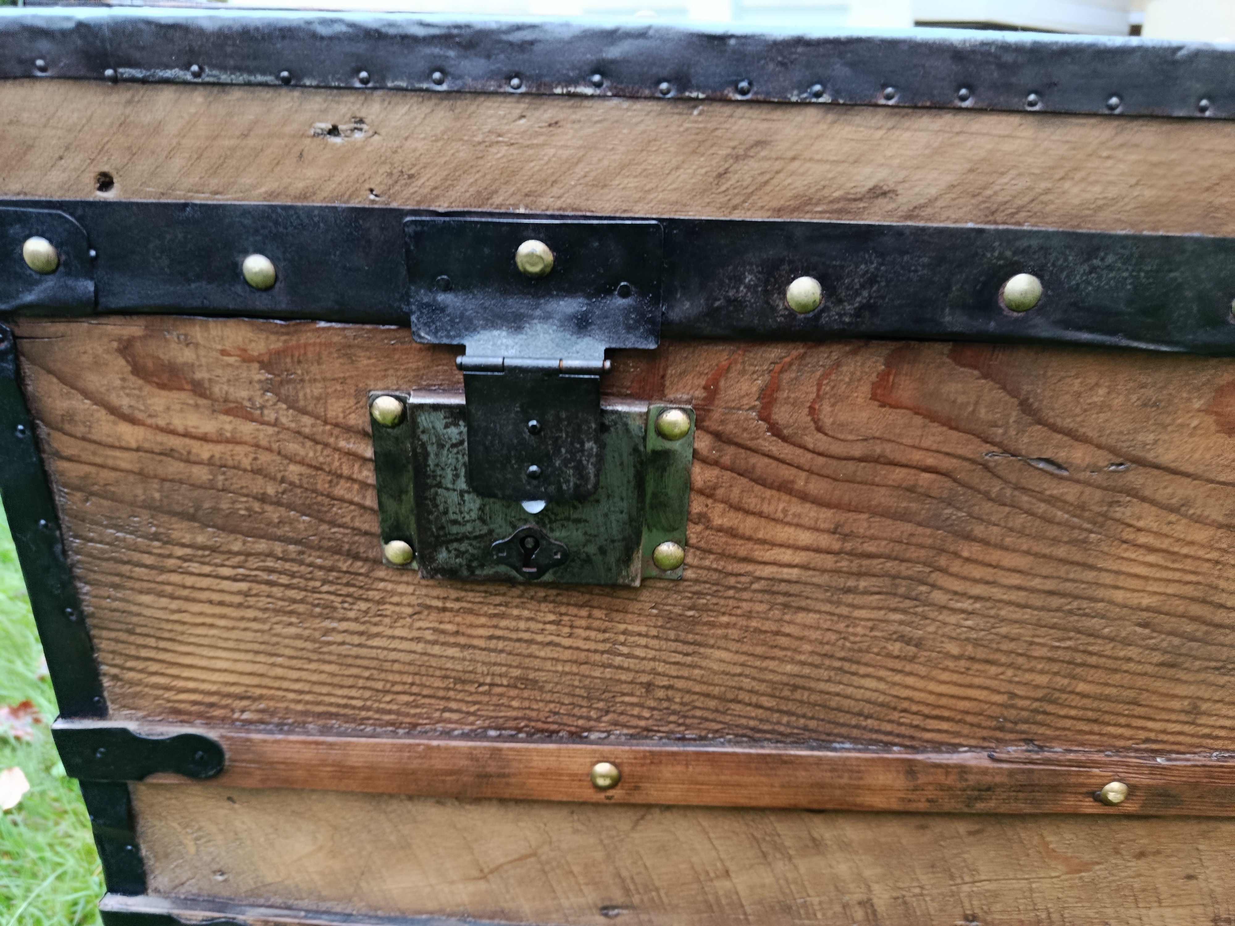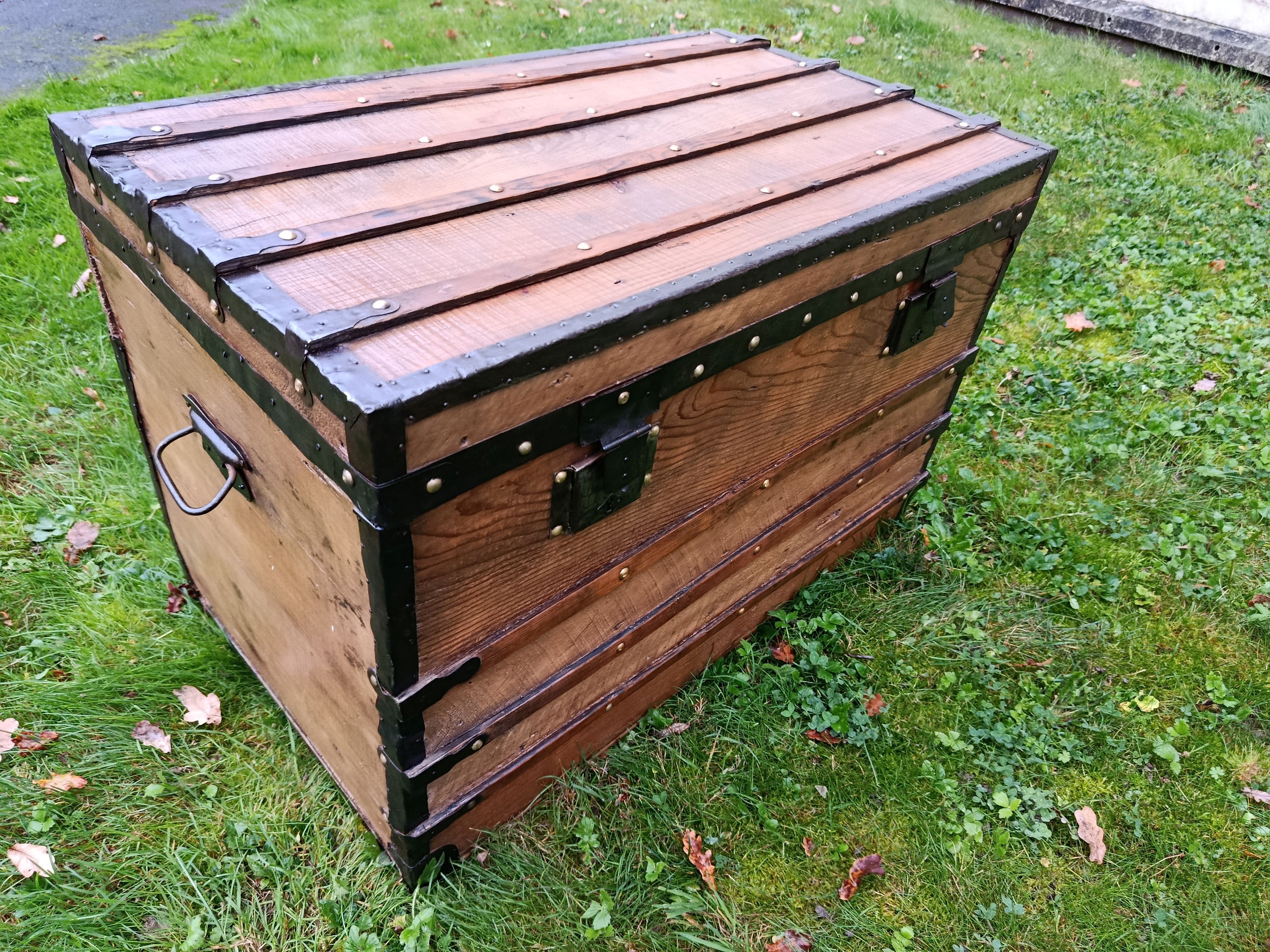Malle courrier , début 20ème - structure en bois massif et solide - belle épaisseur de bois - traité avec plusieurs couches de vernis - bel aspect du bois - belle patine - fermoirs en acier - ferrures bross&es et passées au vernis noir spécial fer - poignées en acier - intérieur en bois naturel - idéale en bout de lit bar table d'appoint
