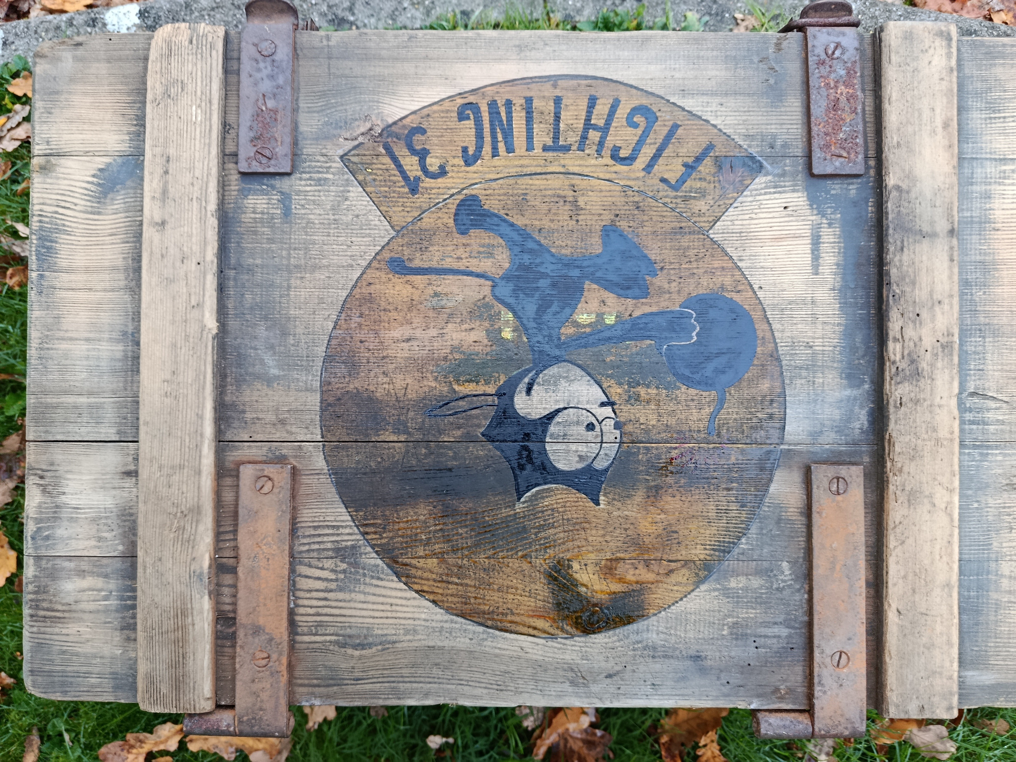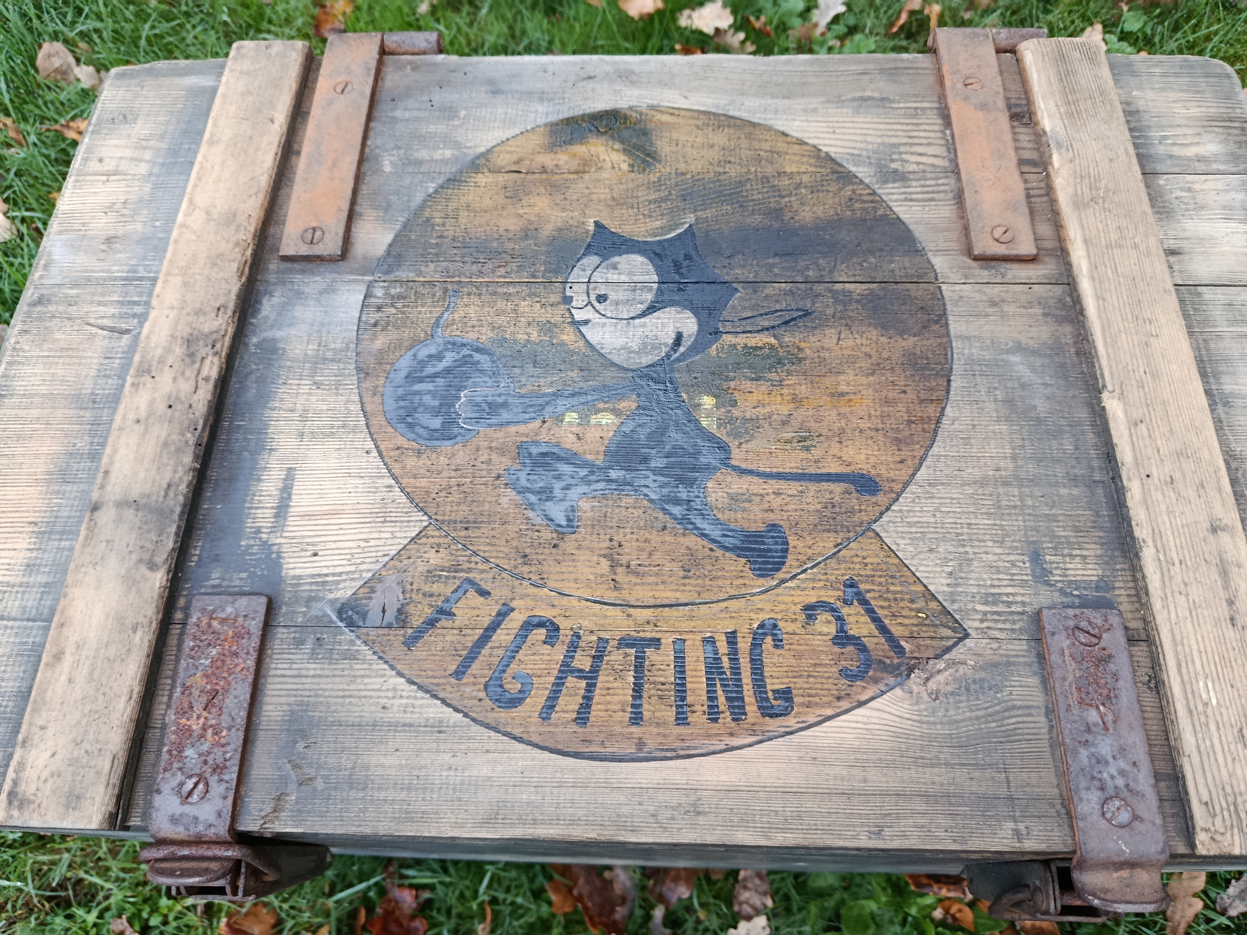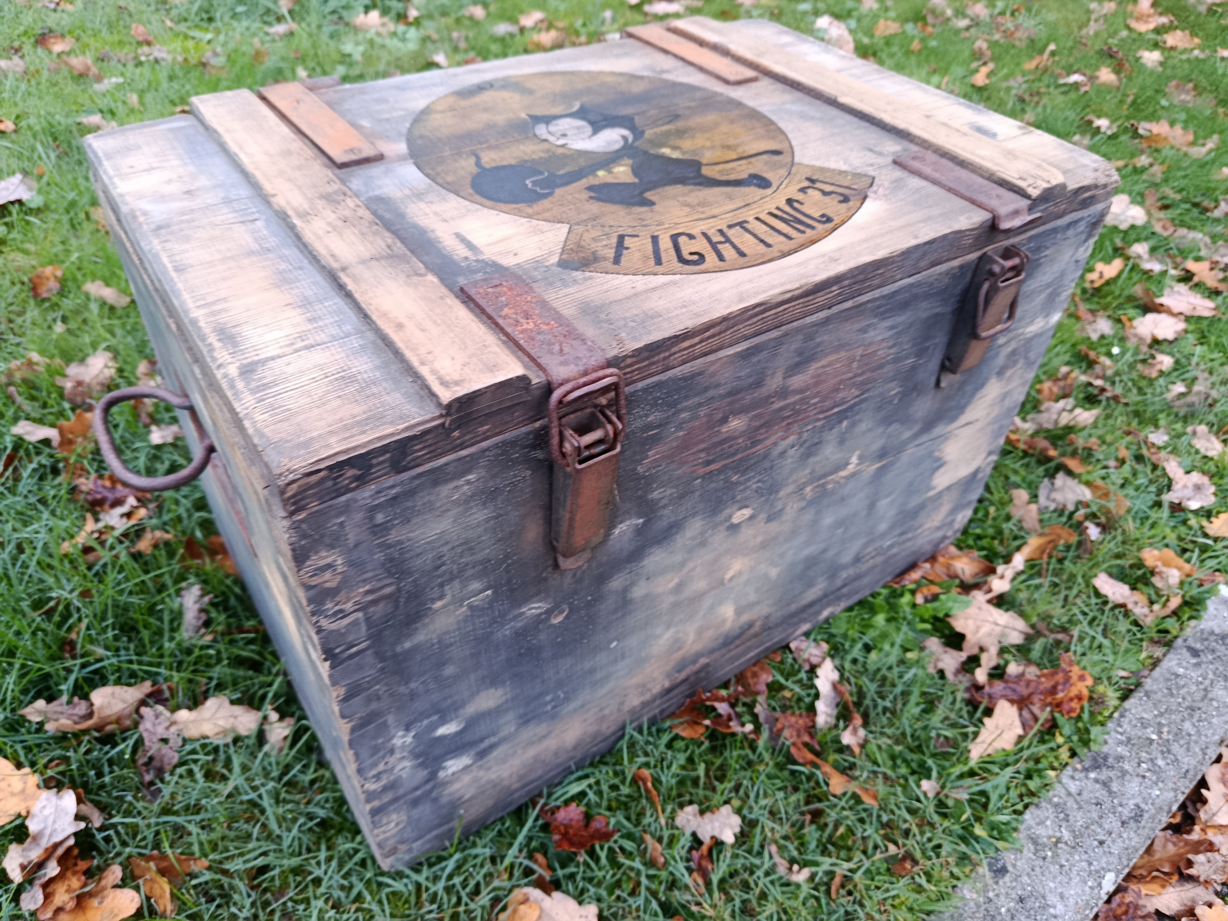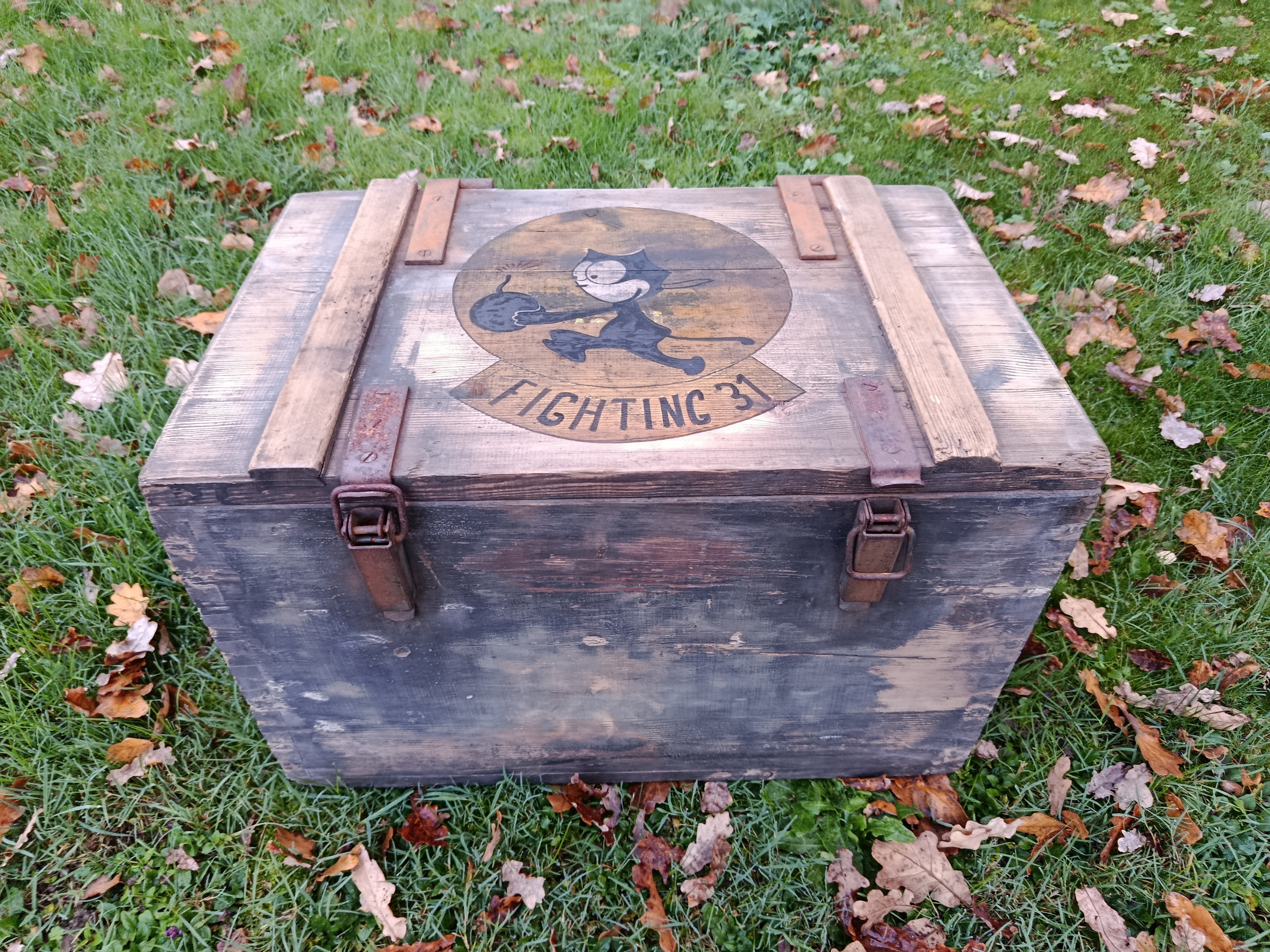 Caisse à munitions de la seconde guerre mondiale - thème "Felix le chat" portant une bombe - Mascotte US air-force - malle très solide - bois épais - peut aisément servir de banc - tabouret - petite caisse à jouets
