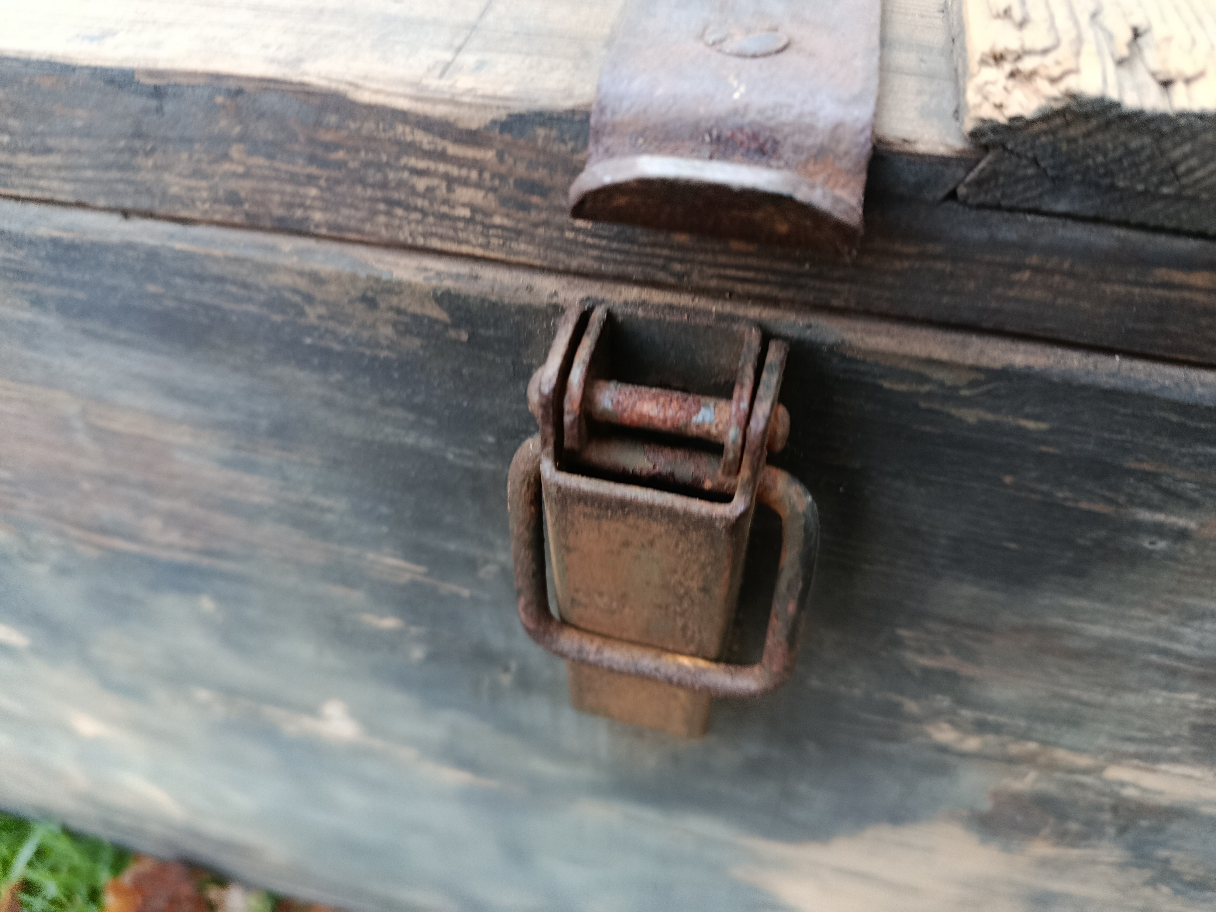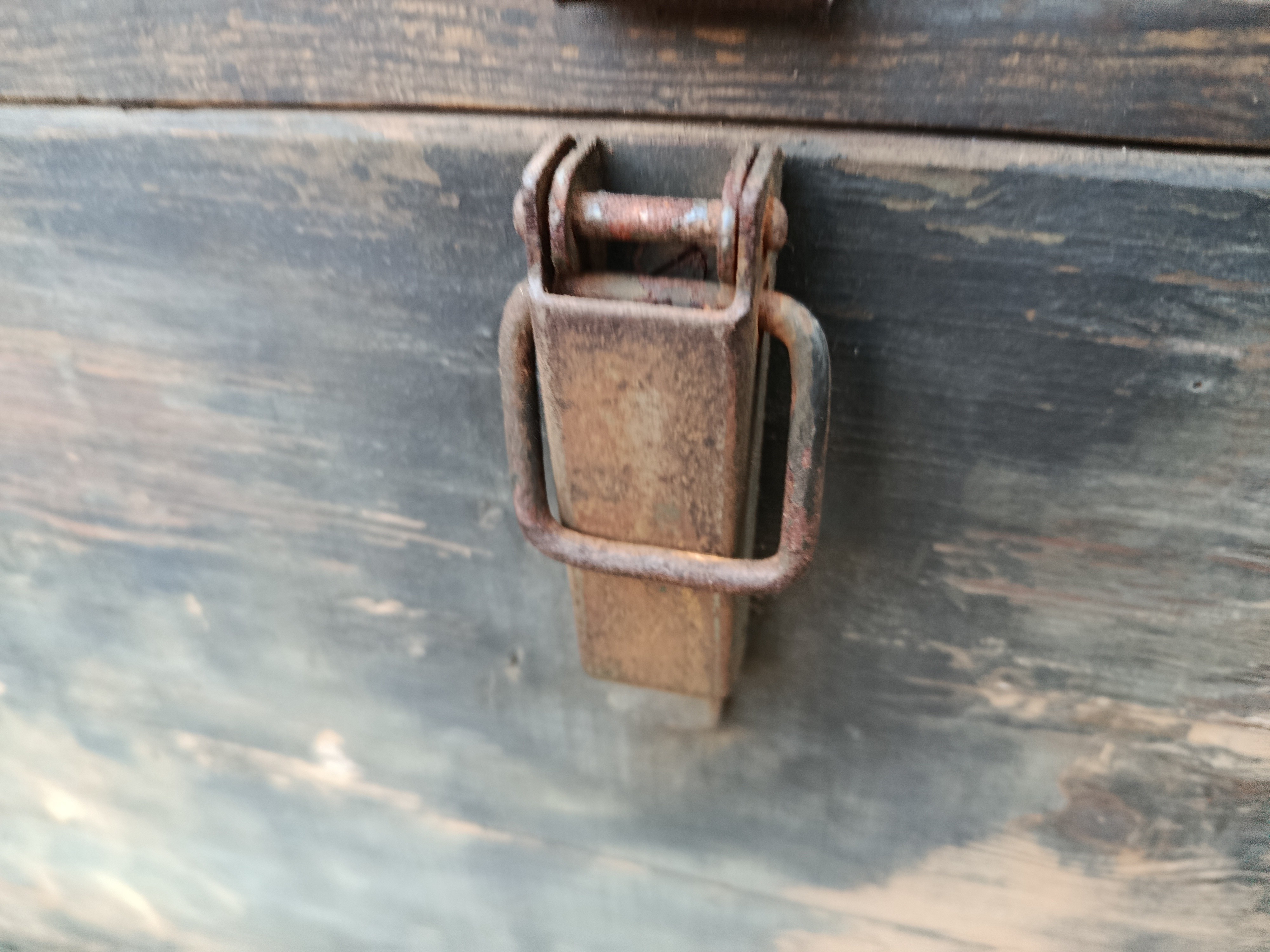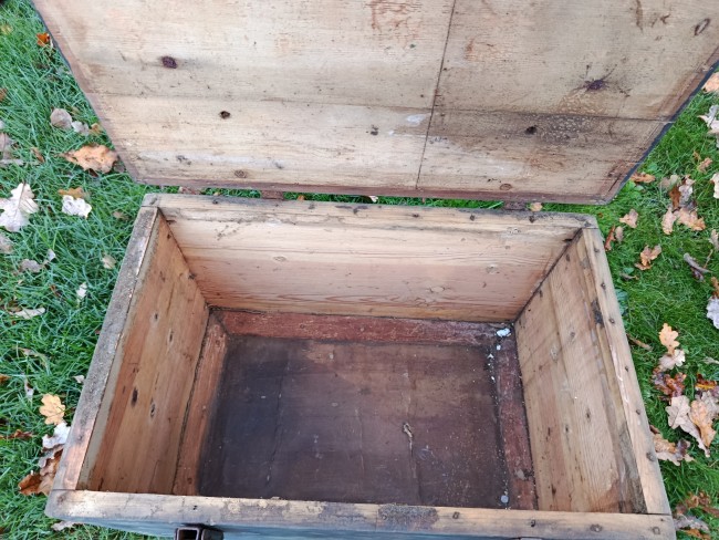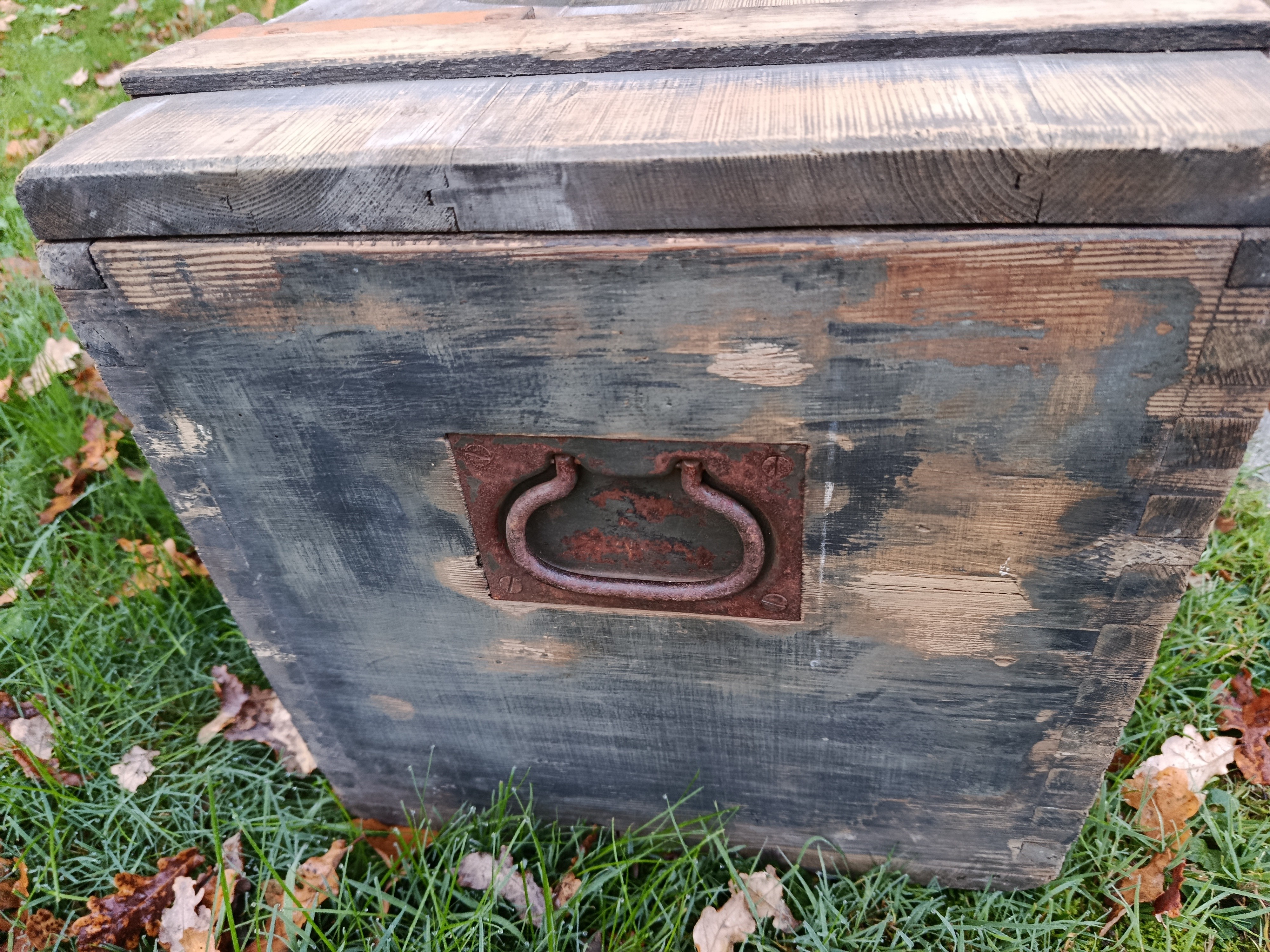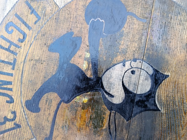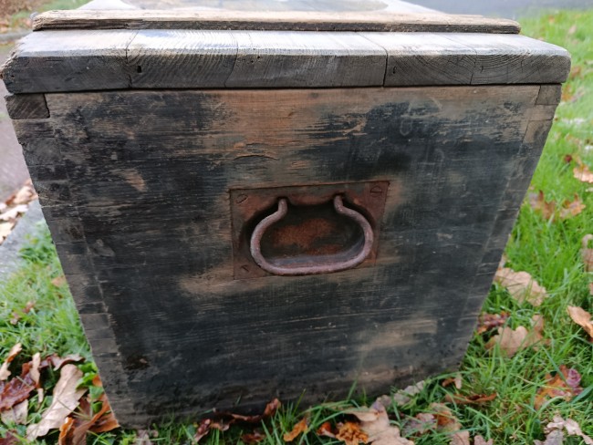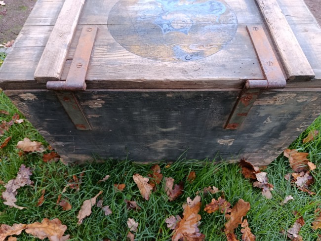 Caisse à munitions de la seconde guerre mondiale - thème "Felix le chat" portant une bombe - Mascotte US air-force - malle très solide - bois épais - peut aisément servir de banc - tabouret - petite caisse à jouets