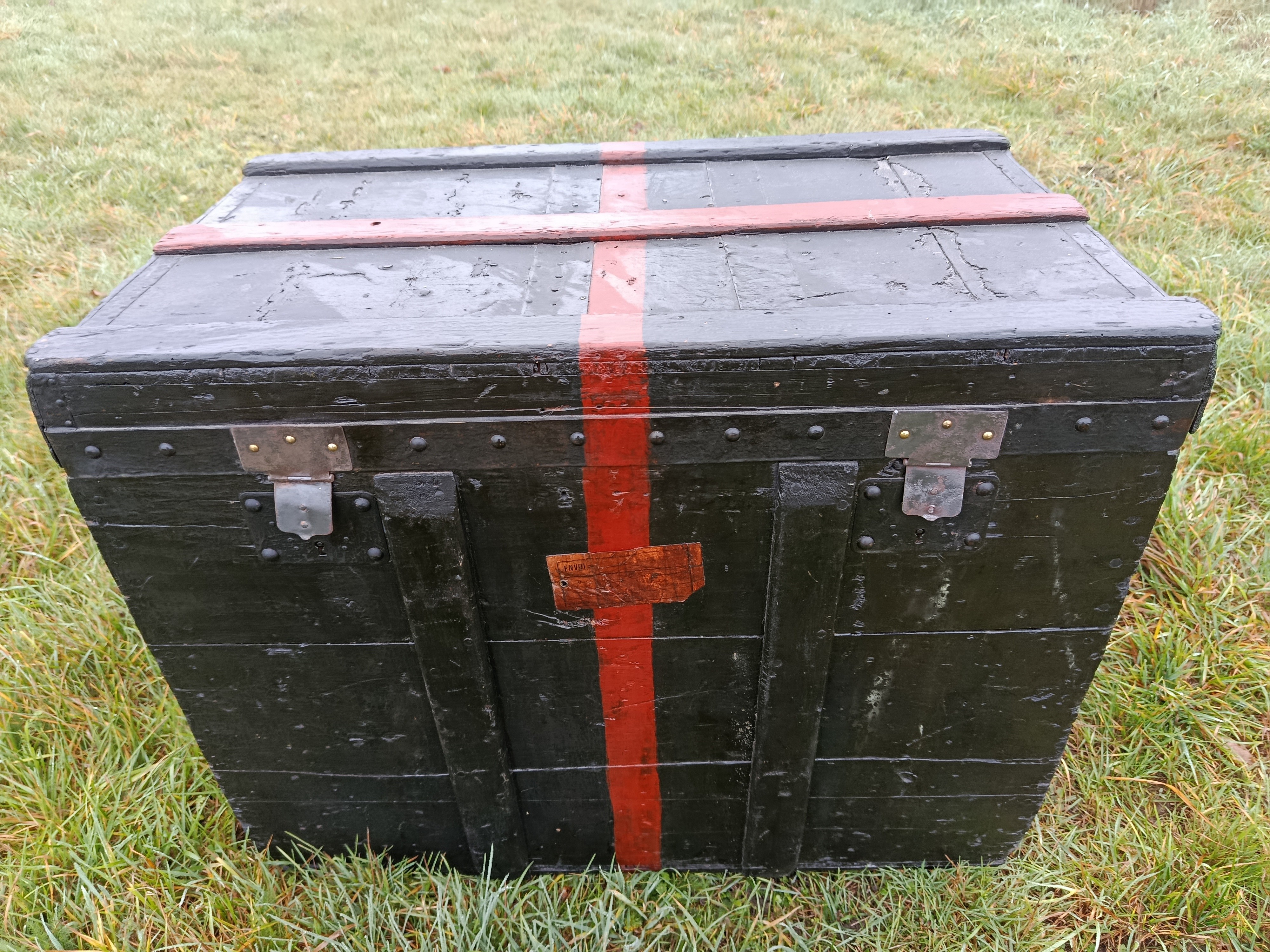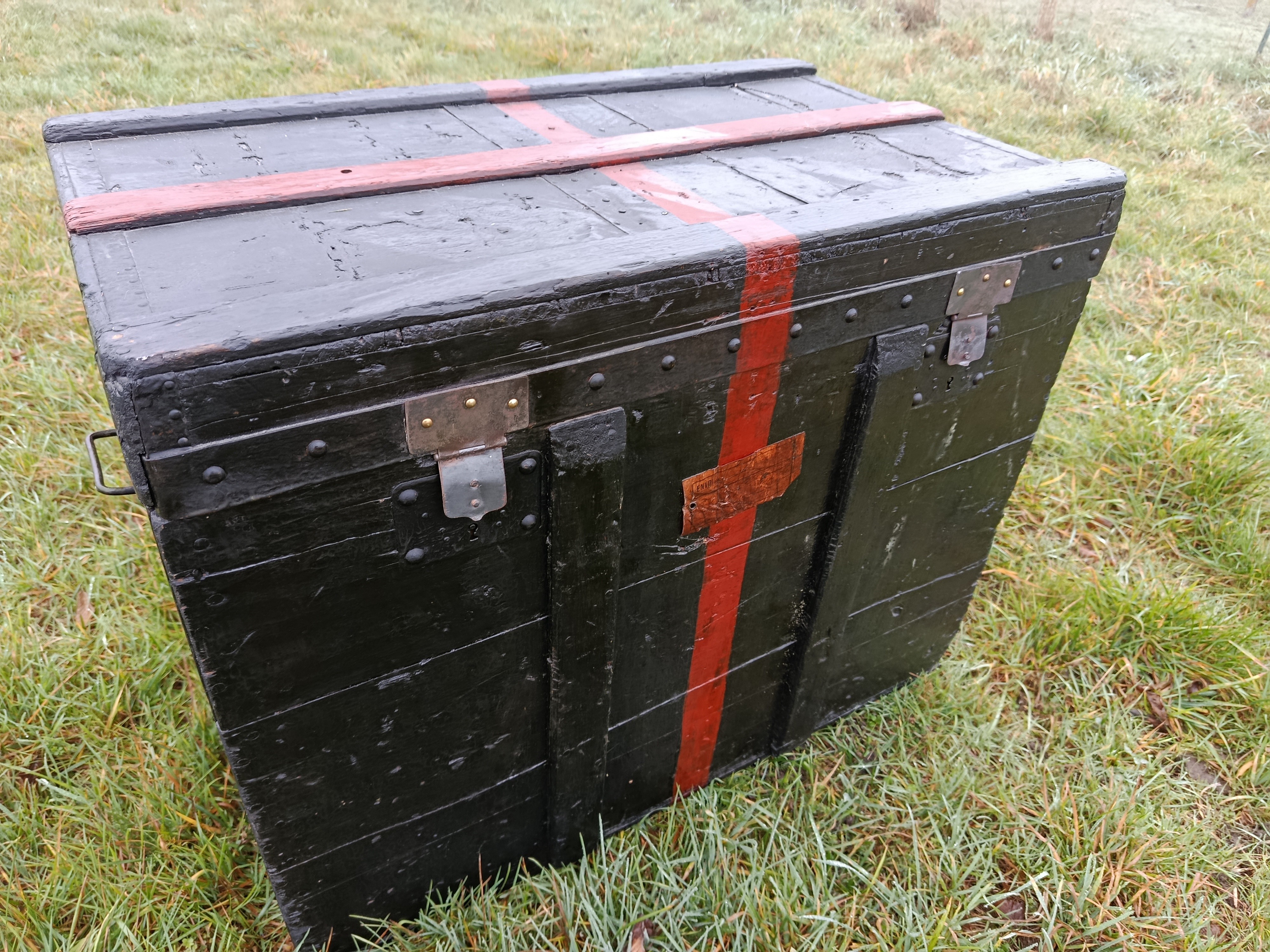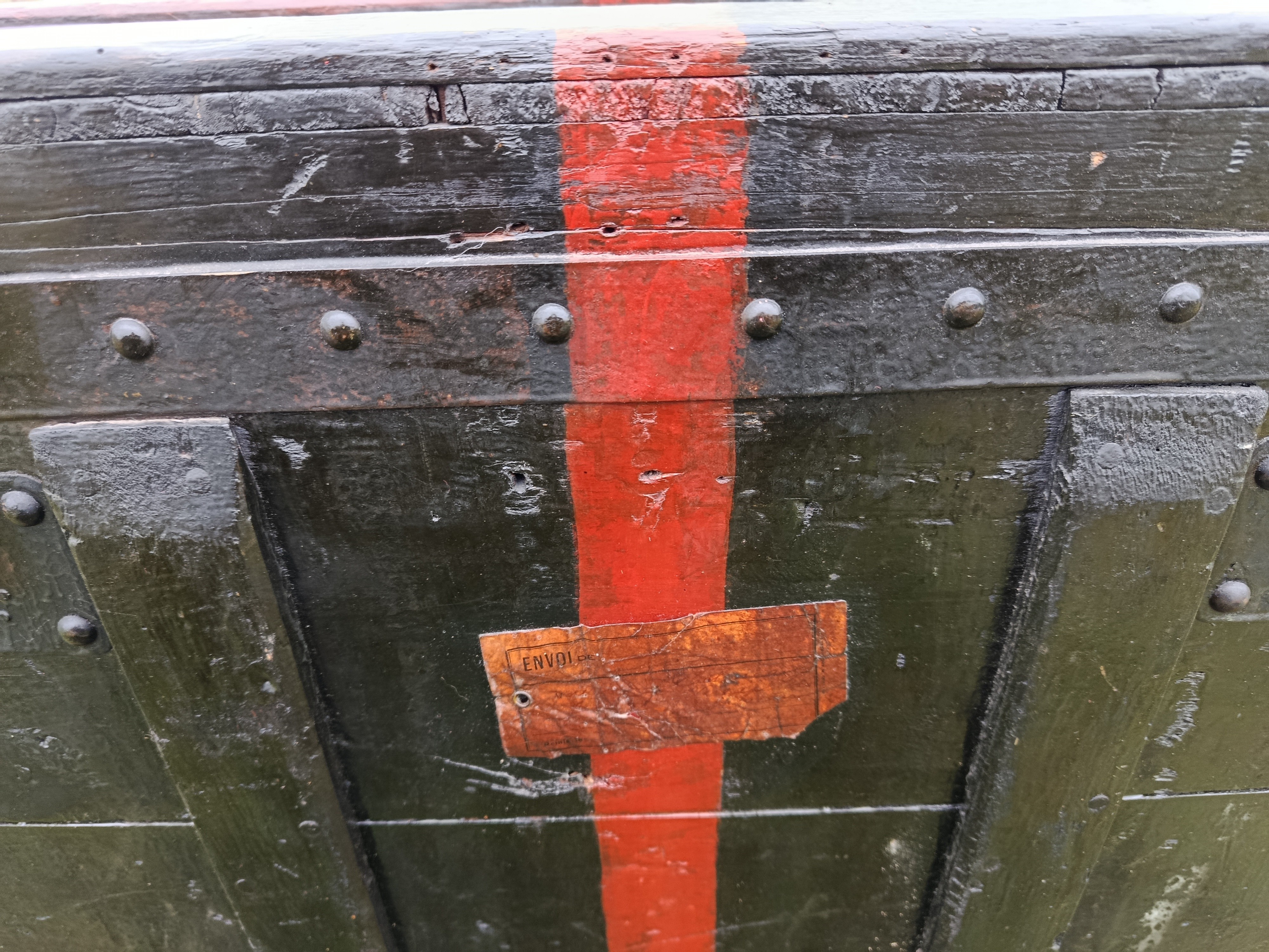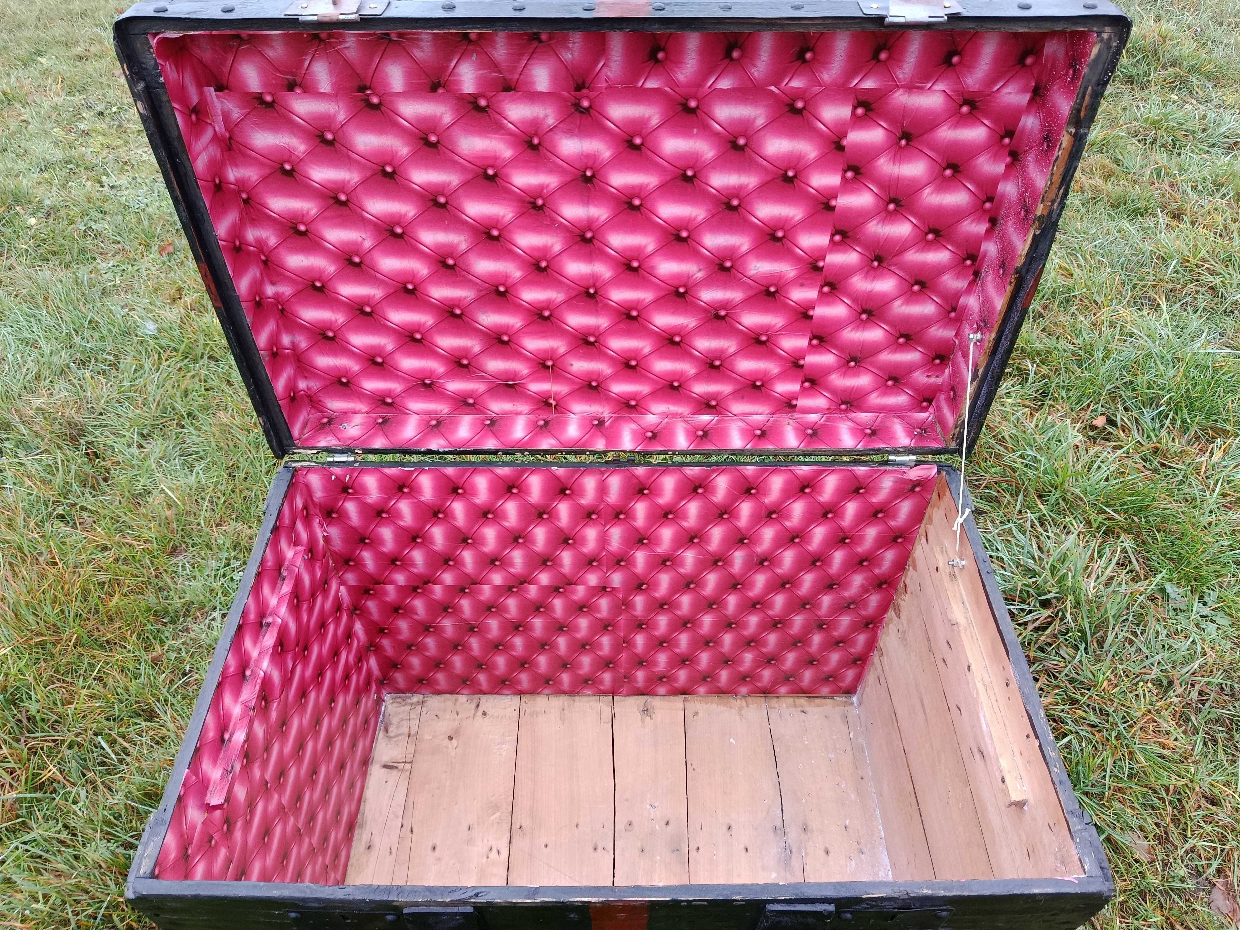 Malle fin 19ème - A noter la bande d'écurie restaurée (la bande d'écurie permettait aux porteurs d'identifier d'un seul coup d'oeil toutes les malles appartenant au m^me propriétaire - bande rouge - parfois aux couleurs des armoireries des grandes familles - prenant également en compte que les porteurs ne savaient pas lire...) la malle est très solide - les charnières ne sont pas d'origine - l'intérieur sera refait ne pas tenir compte des photos de l'intérieur - juste mises pour montrer que le bois est sain et propre - poignées en acier - fermoirs en acier -