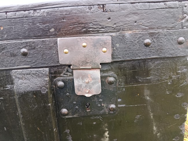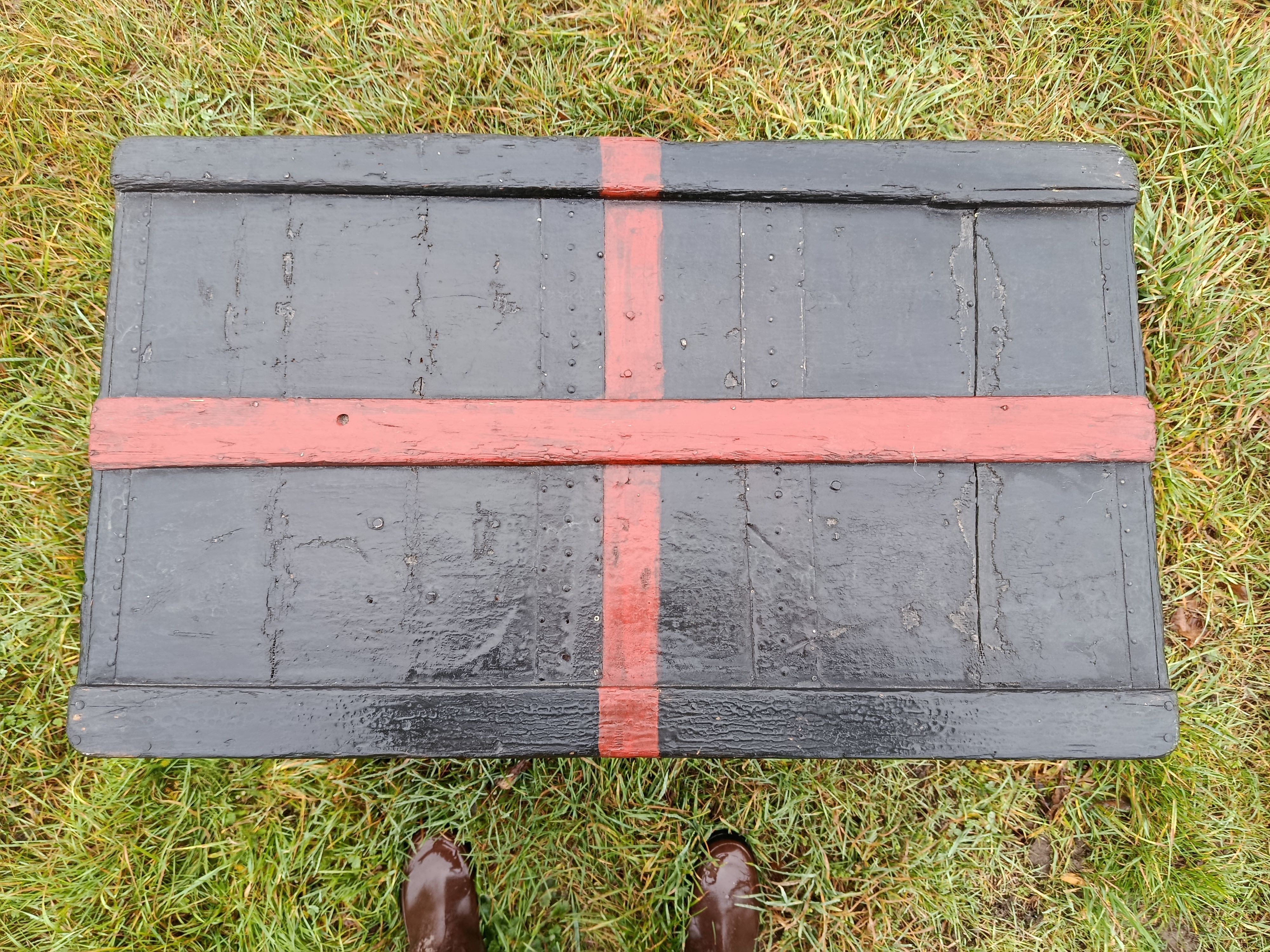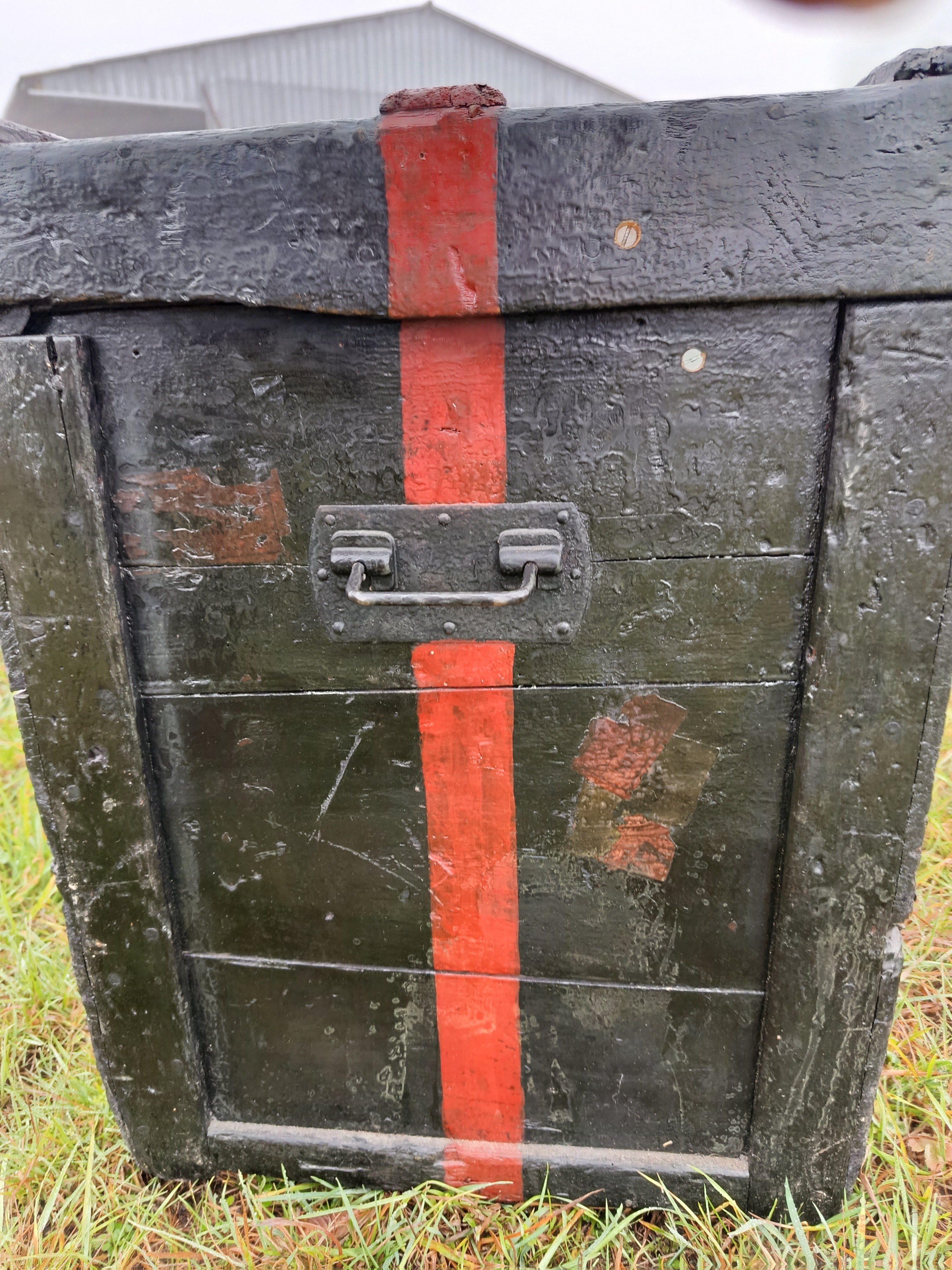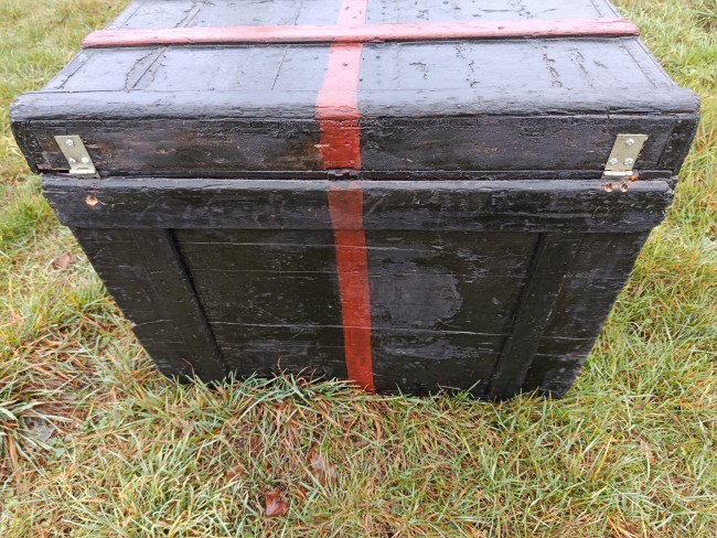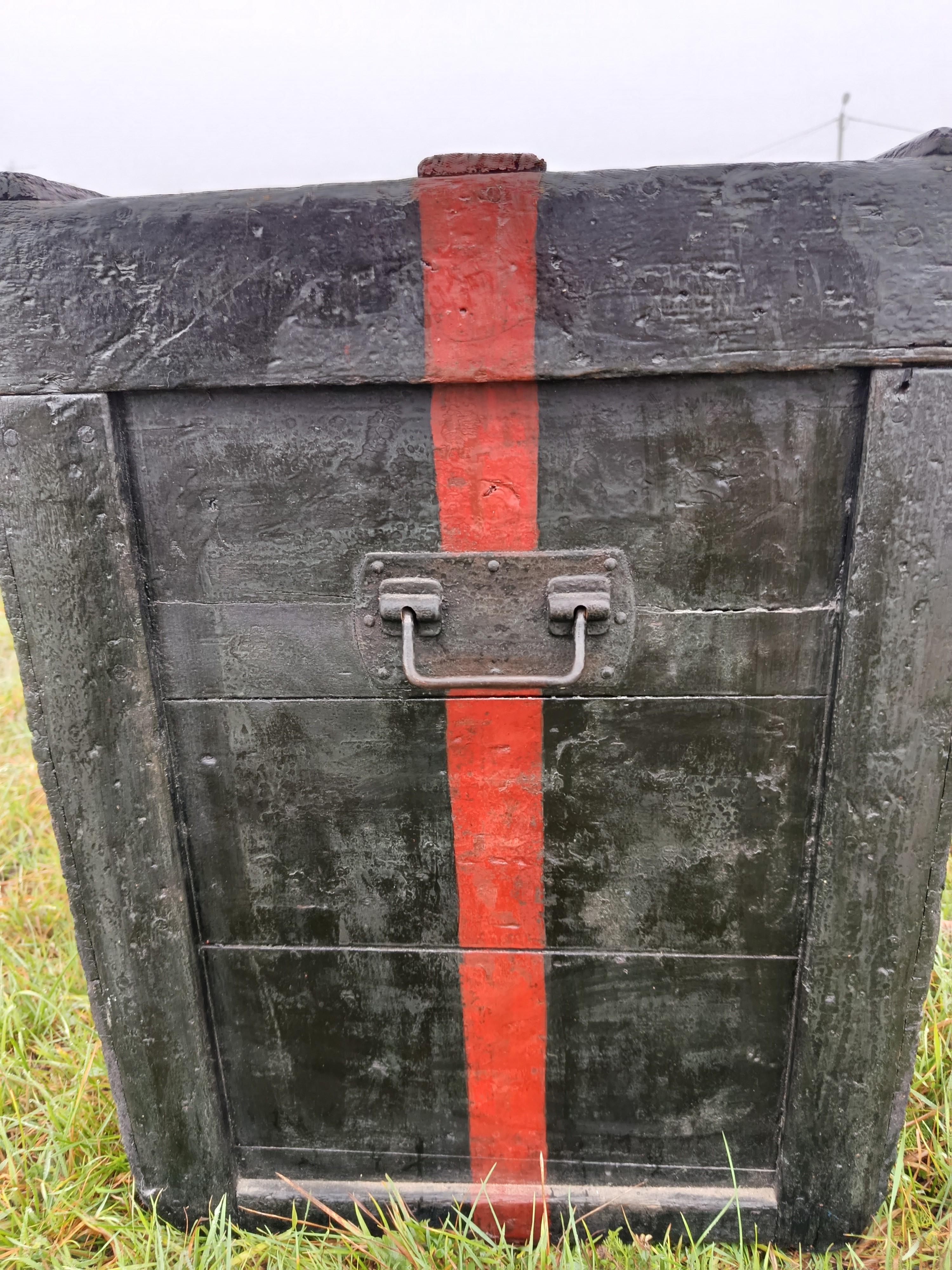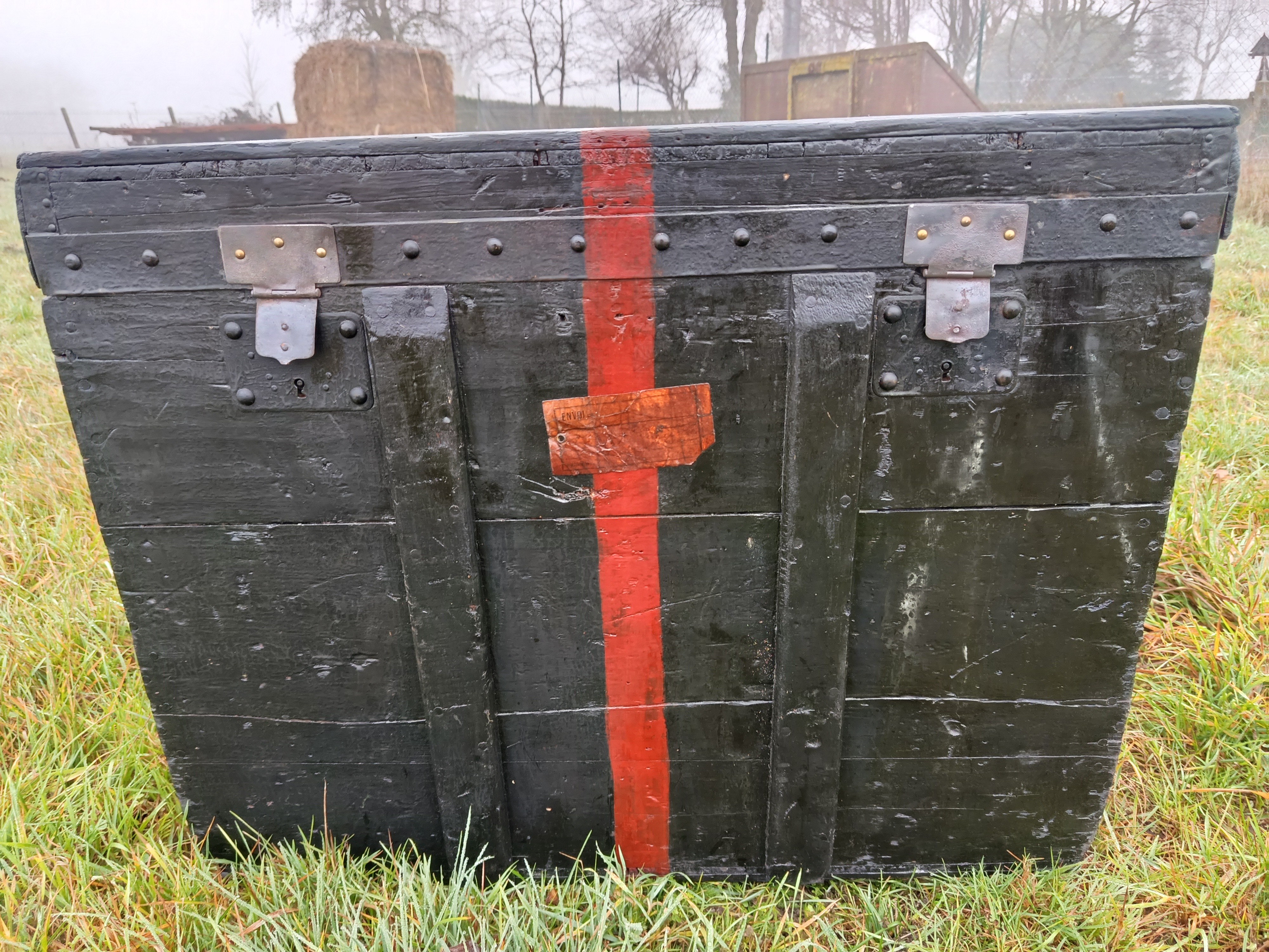 Malle fin 19ème - A noter la bande d'écurie restaurée (la bande d'écurie permettait aux porteurs d'identifier d'un seul coup d'oeil toutes les malles appartenant au m^me propriétaire - bande rouge - parfois aux couleurs des armoireries des grandes familles - prenant également en compte que les porteurs ne savaient pas lire...) la malle est très solide - les charnières ne sont pas d'origine - l'intérieur sera refait ne pas tenir compte des photos de l'intérieur - juste mises pour montrer que le bois est sain et propre - poignées en acier - fermoirs en acier -