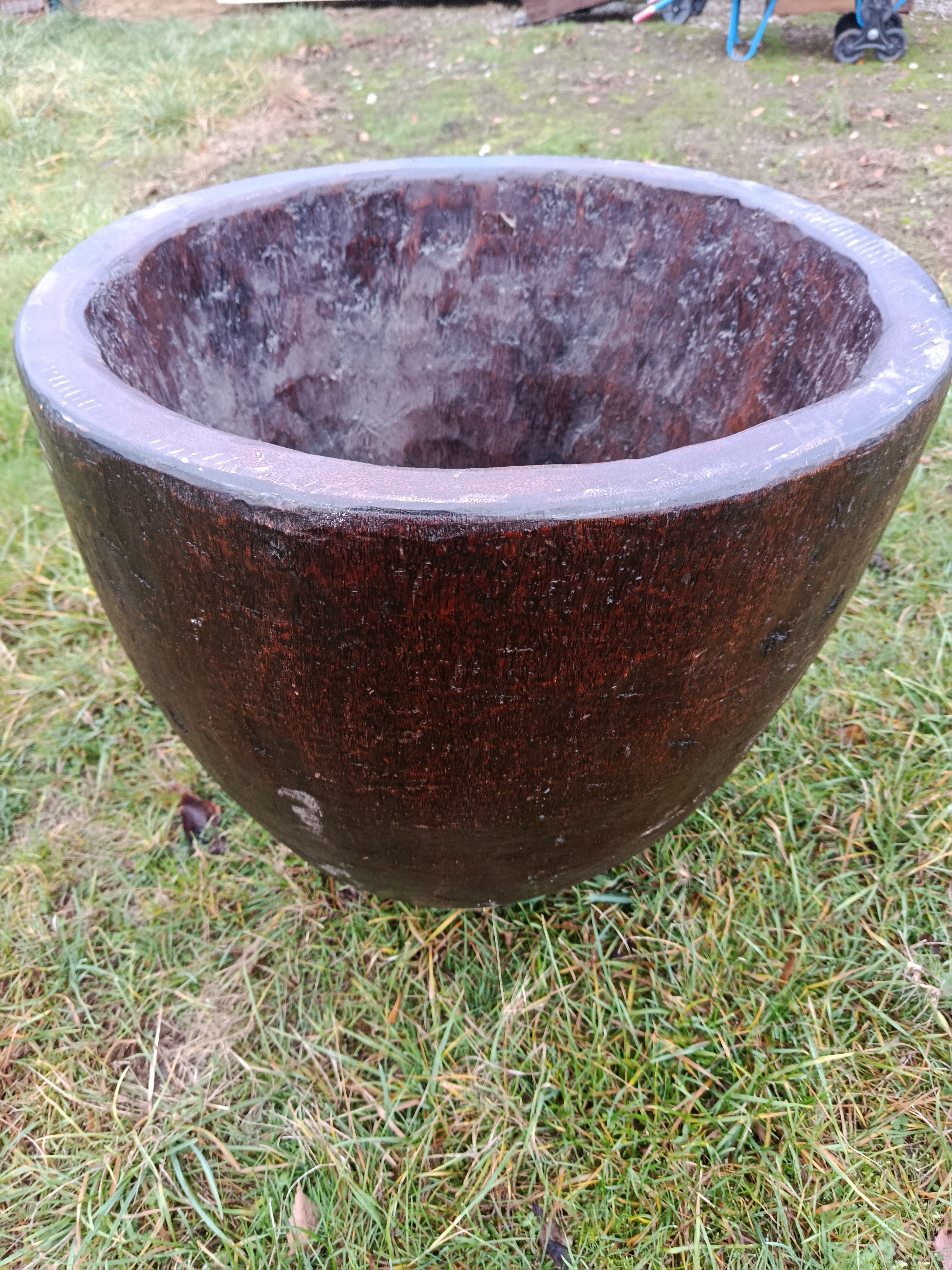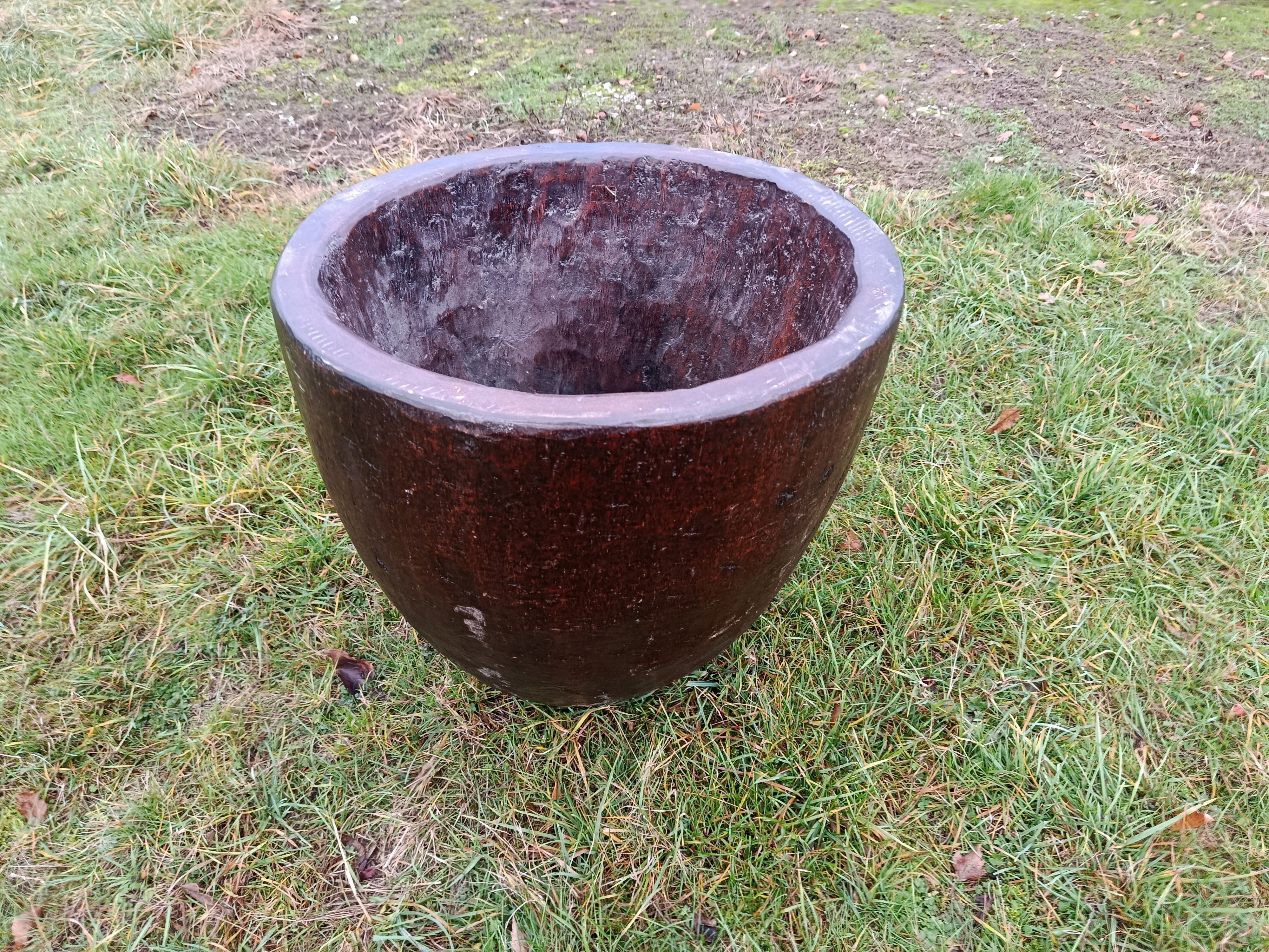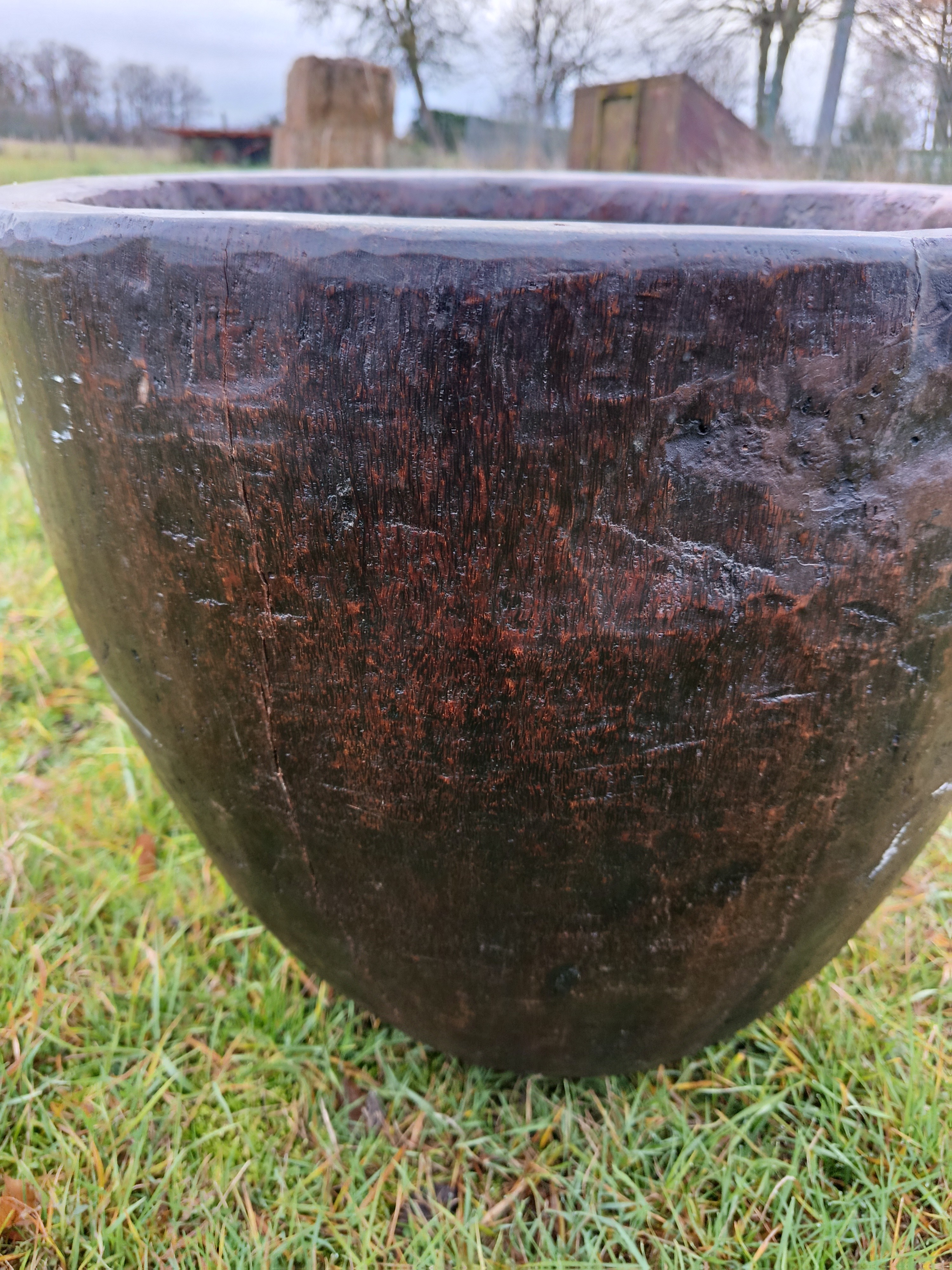 Grande vasque ou vase en bois exotique - en une seule pièce - taillé dans le tronc - très belle pièce d'une patine superbe - je ne connais pas l'essence de ce bois mais il est très dur et très lourd - ce qui donne à la vasque un très grande stabilité - idéale pour une belle plante mais aussi pourrait servir de pied pour table basse en verre ...