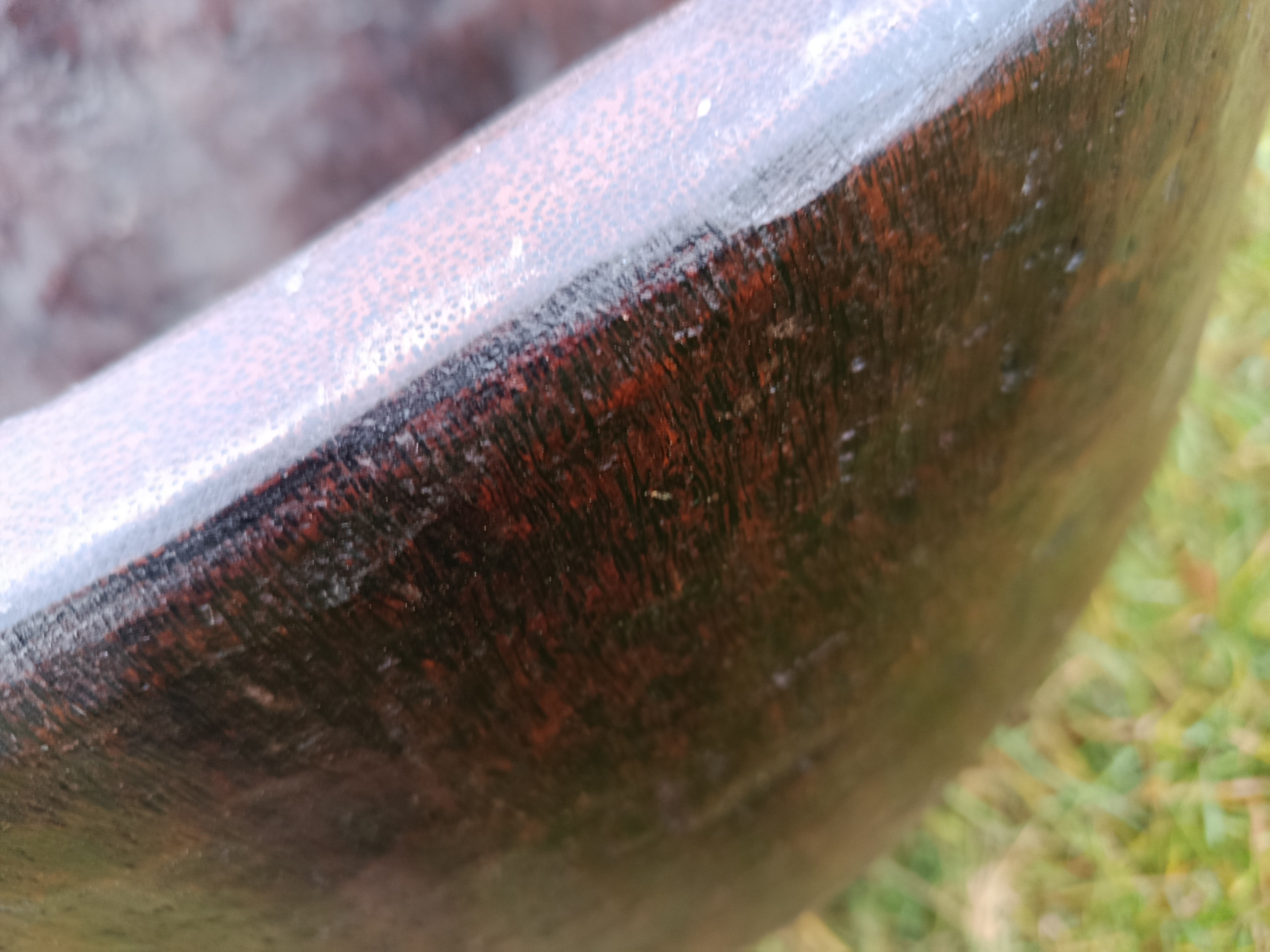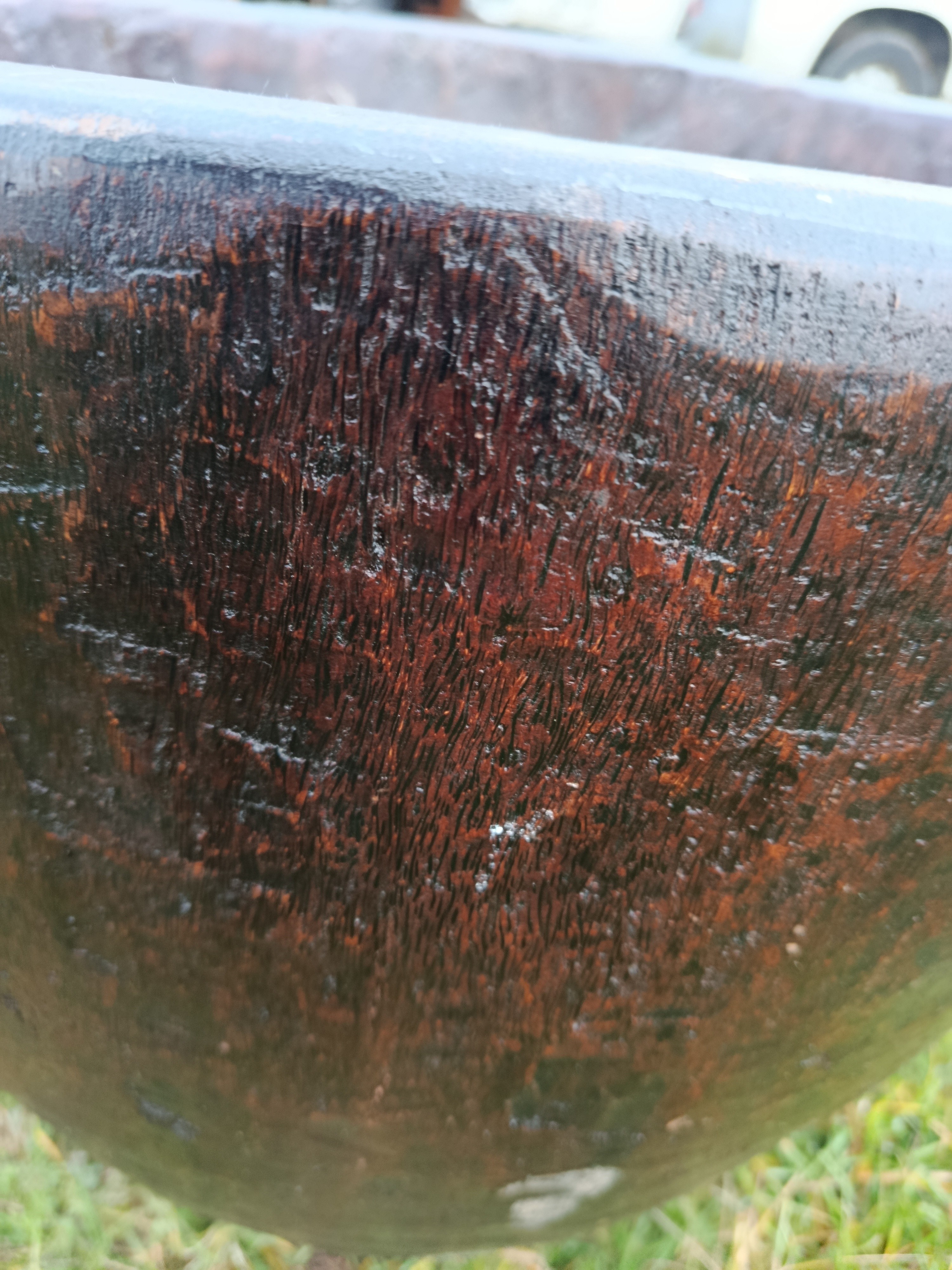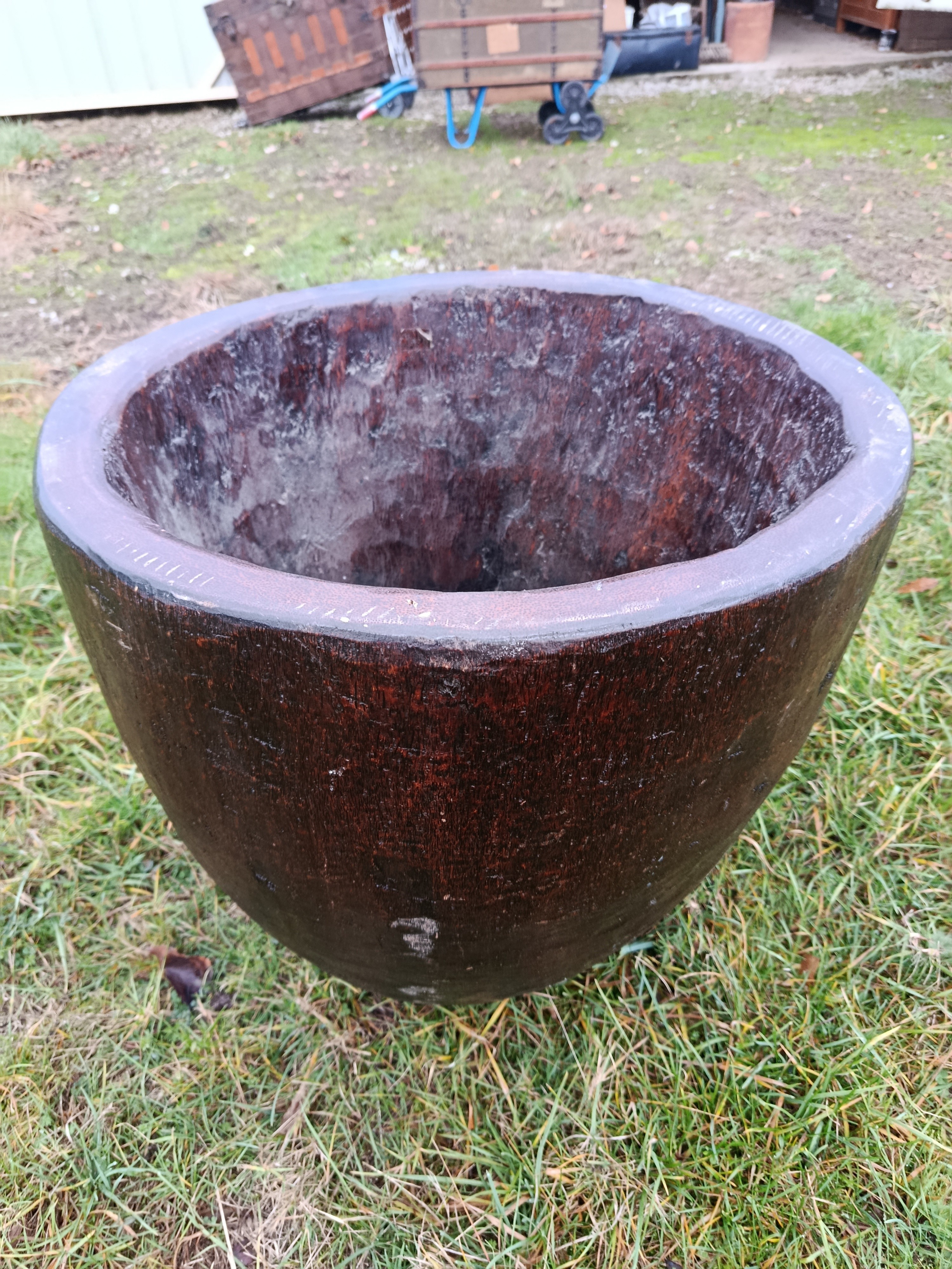 Grande vasque ou vase en bois exotique - en une seule pièce - taillé dans le tronc - très belle pièce d'une patine superbe - je ne connais pas l'essence de ce bois mais il est très dur et très lourd - ce qui donne à la vasque un très grande stabilité - idéale pour une belle plante mais aussi pourrait servir de pied pour table basse en verre ...