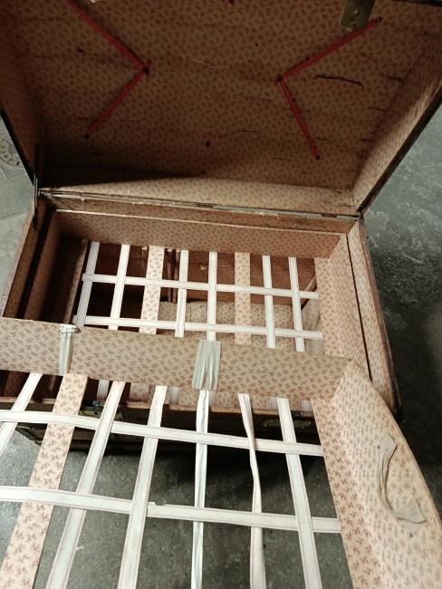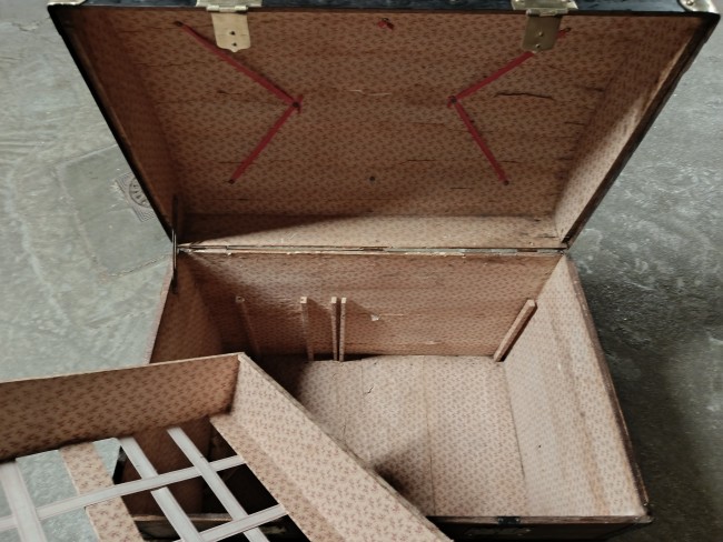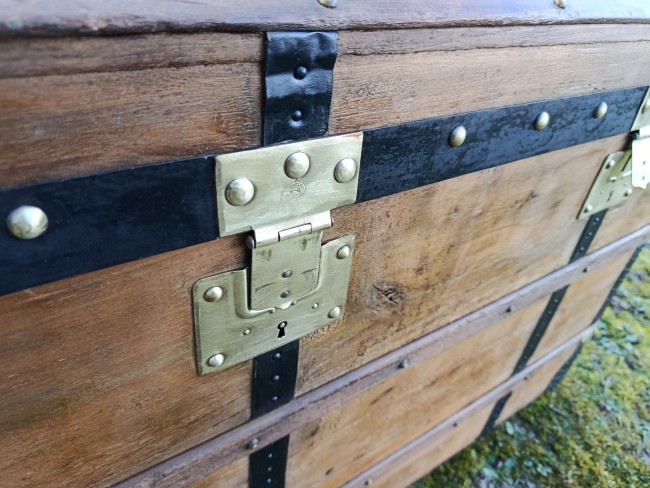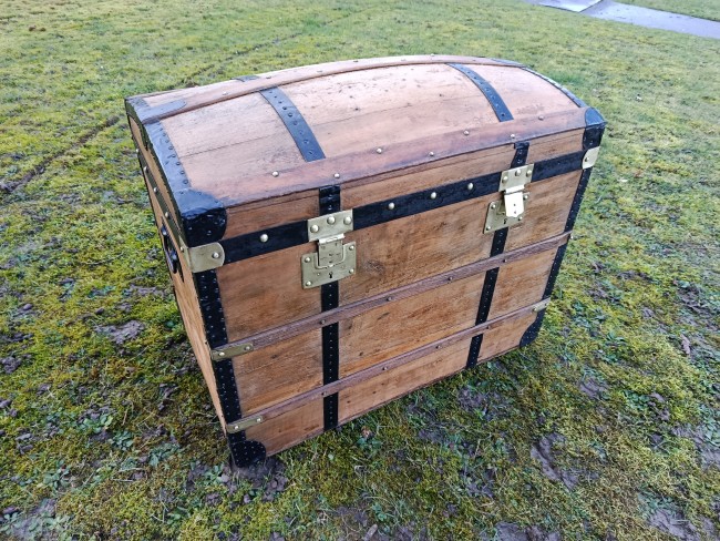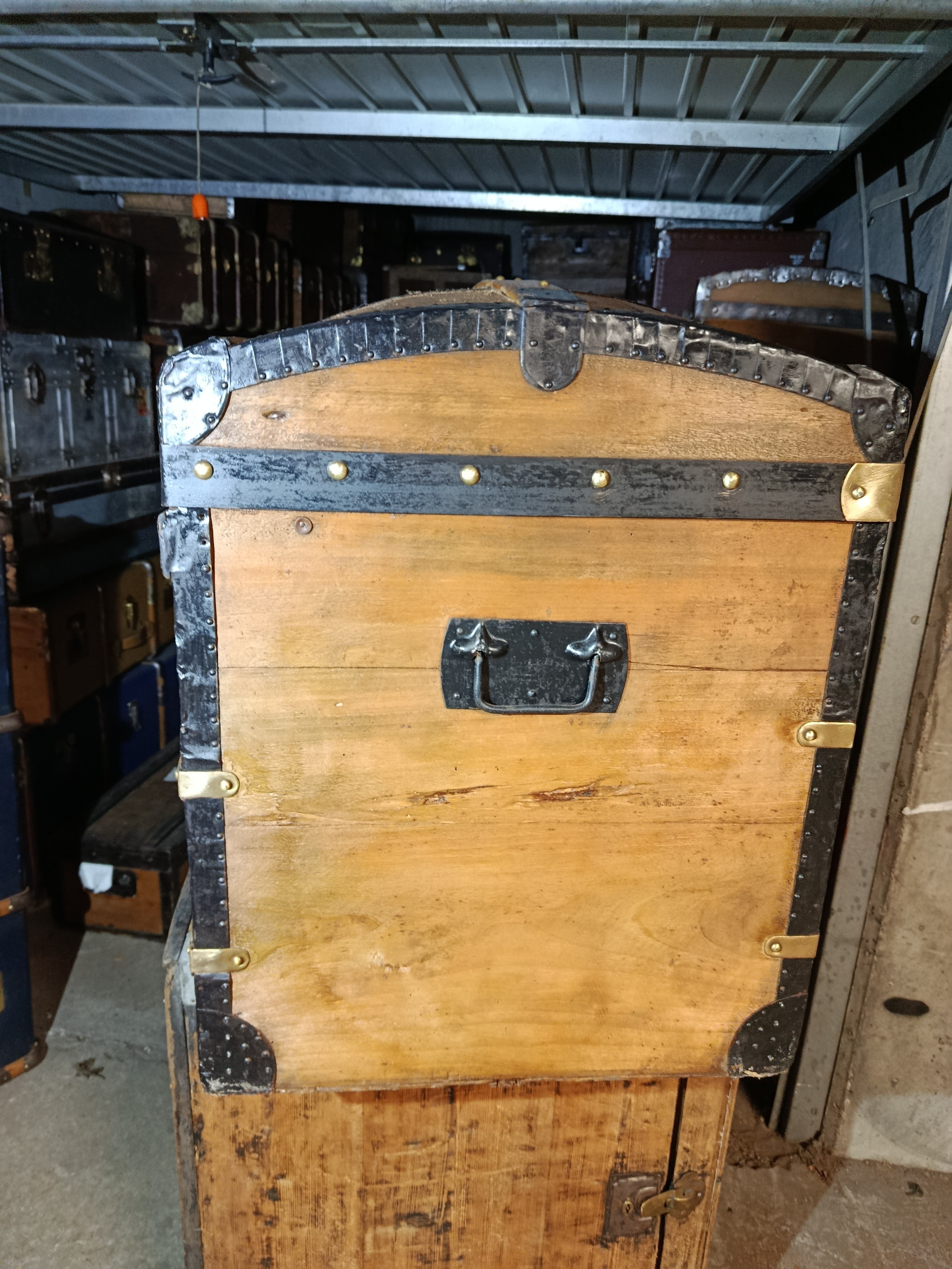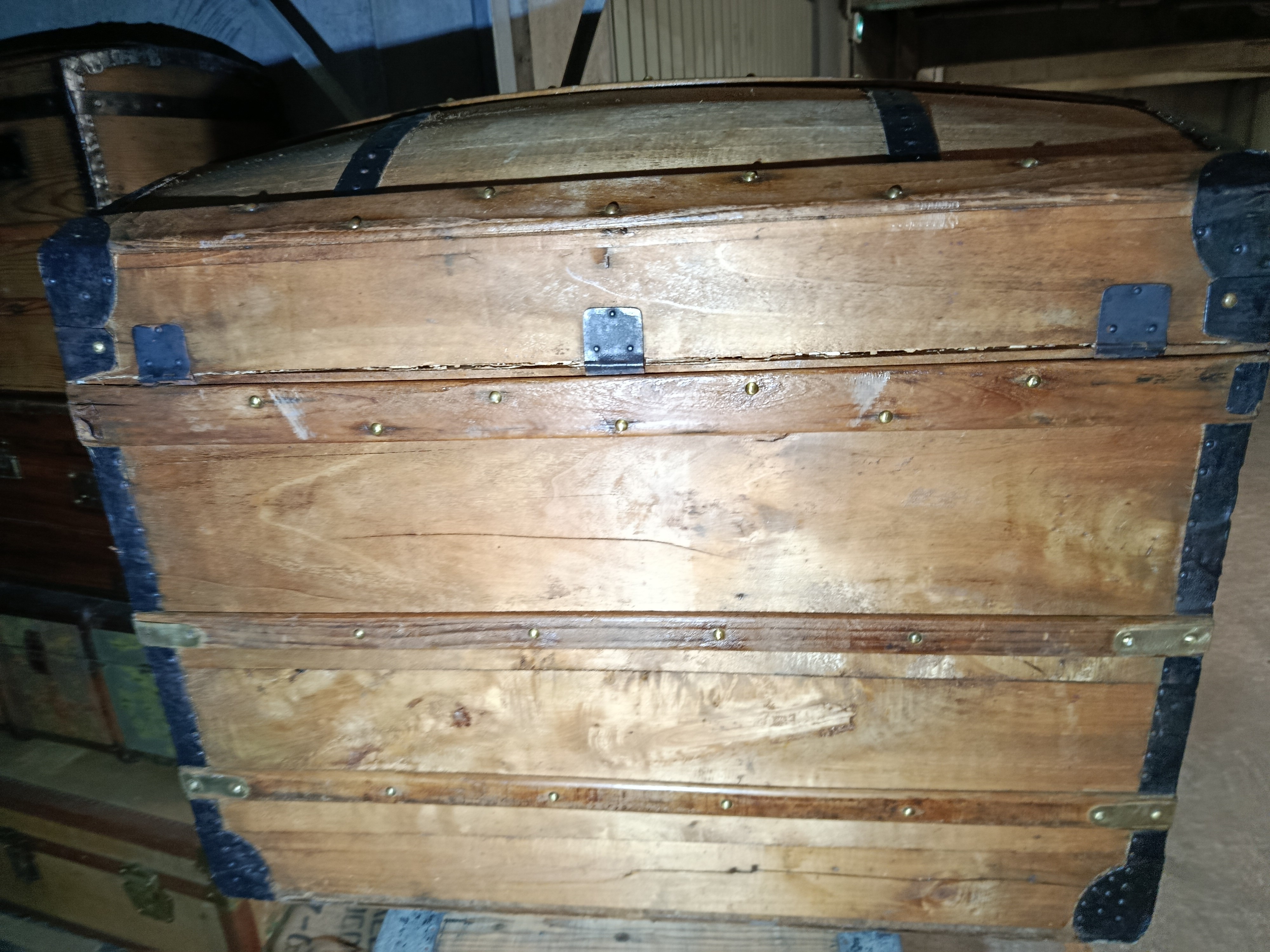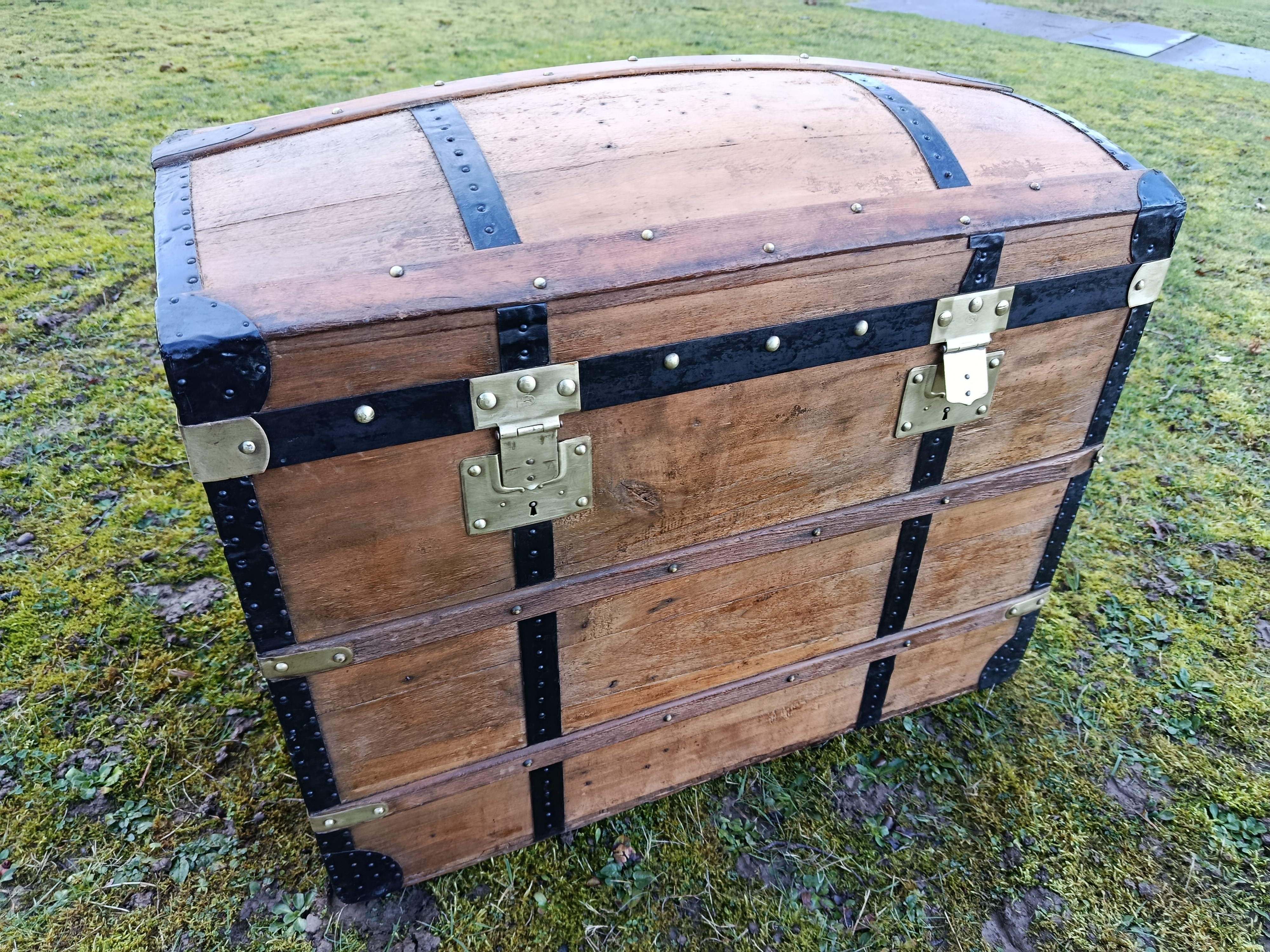 Malle bombée de calèche datée de la fin 19ème - récupérée dans un hangard de matériel nautique à la Rochelle - selon son propriétaire elle aurait voyagé en Europe dans les pays de l'est - belle restauration - fermoirs en laiton brossé - bois traité et patiné ch^ne doré - 2 chassis amovibles - intérieur d'origine bien conservé - idéale pour chambre - chambre d'enfants - bout de lit - rangement de linge couettes - objets encombrants - belle capacité de rangement - très soklide - poignées en acier