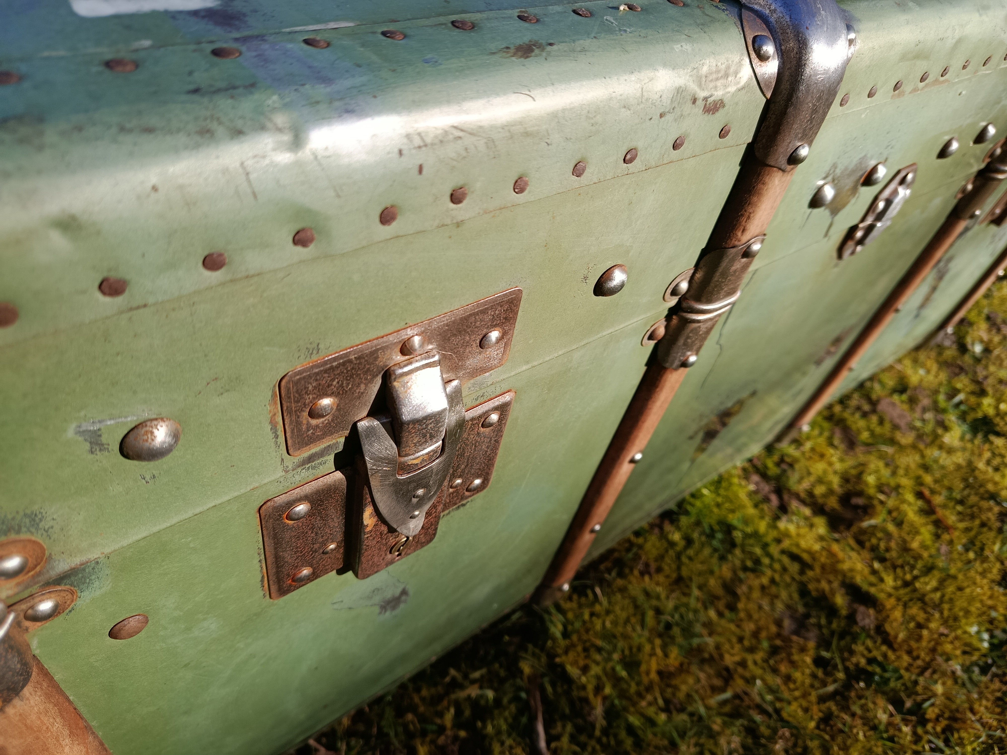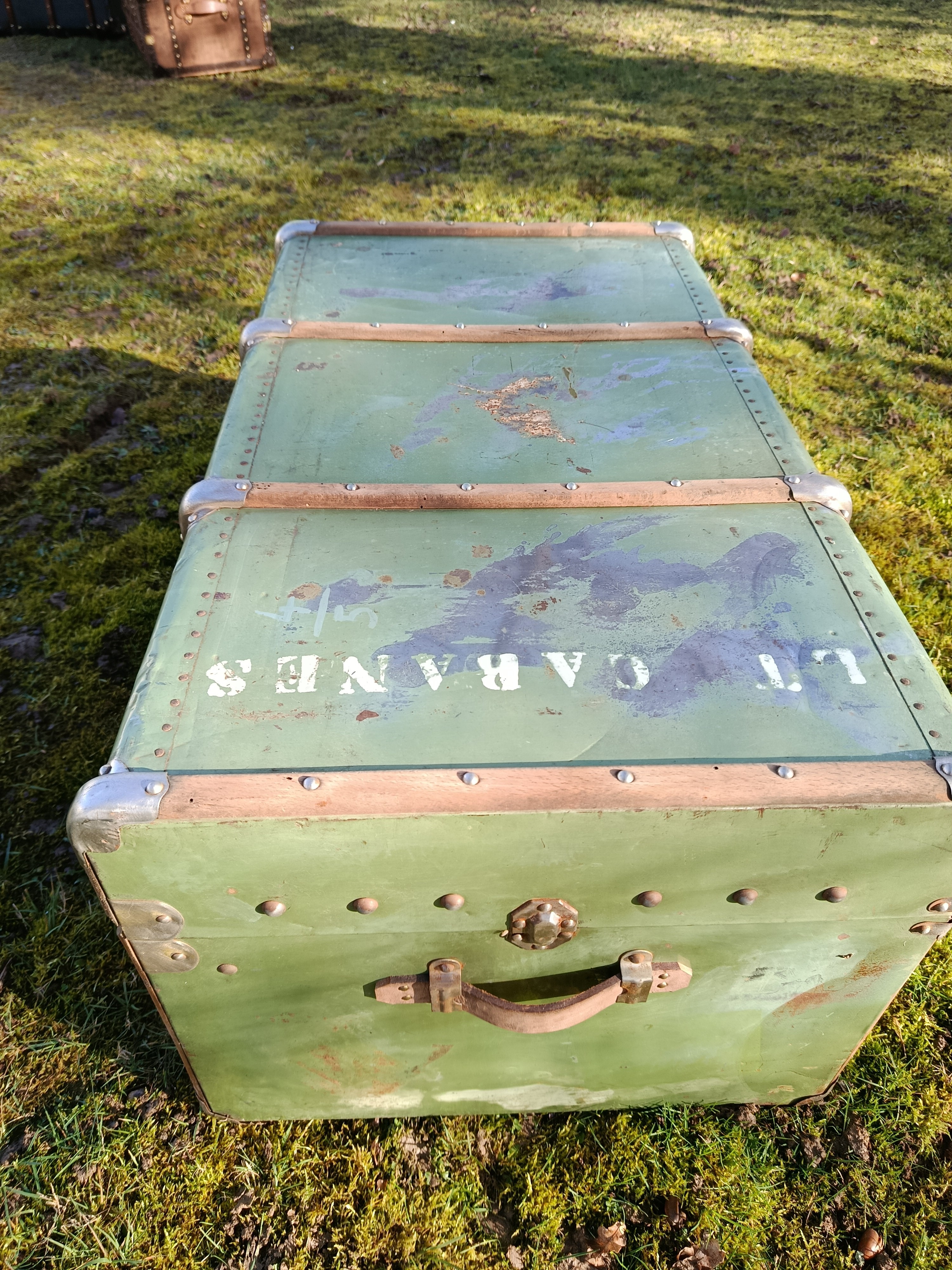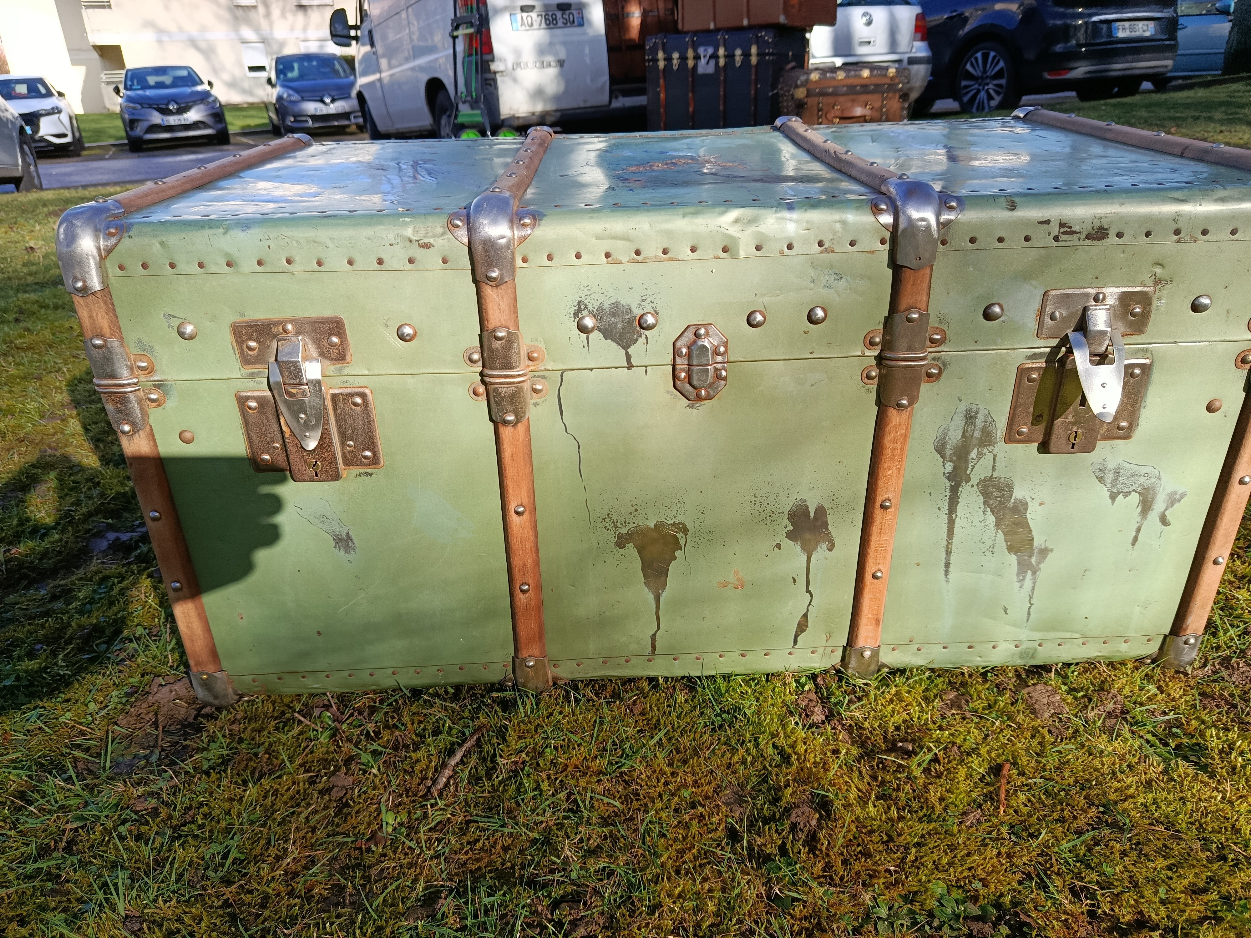 Malle cintrée des années 30 - ce modèle est assez rare surtout dans cette couleur - sa structure est en bois avec un feuillage en alu riveté - couleur vert lagon - fermoirs de belle qualité - cette malle est idéale pour un intérieur indu - un loft - elle est dans le style aviateur - solide et de bellke qualité - la couleur est passée à certains endroits mais ça lui donne le charme de l'ancien et du vécu elle appartenait au paquetage d'un militaire dont le nom est encore inscrit sur le capot - a connu l'indochine et l'Algerie