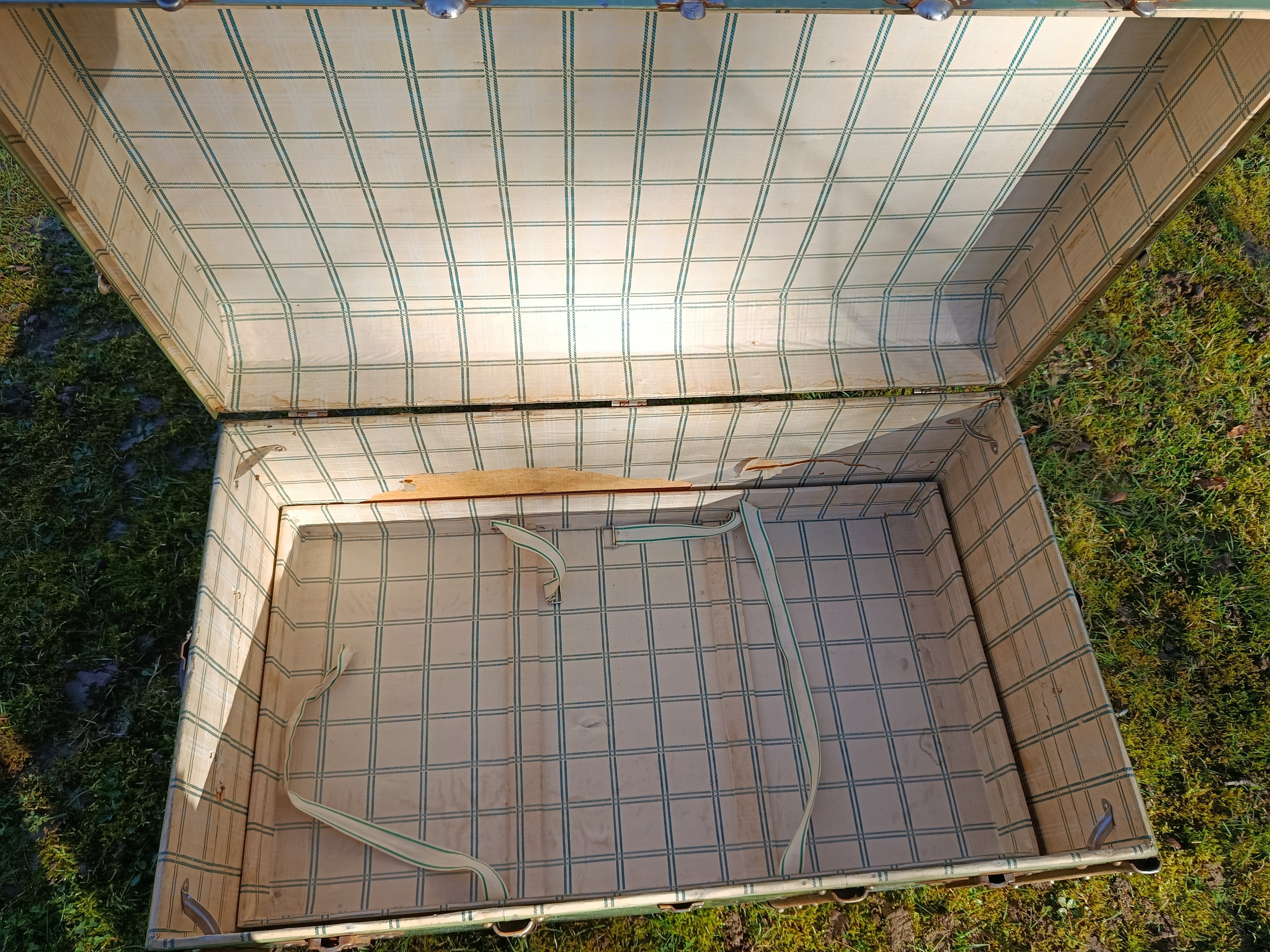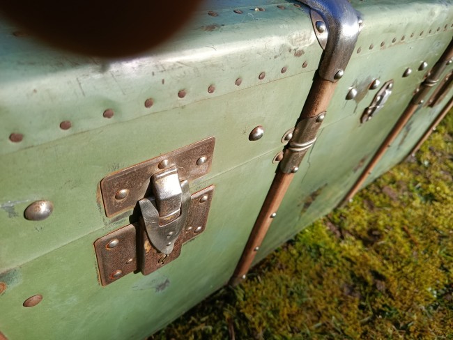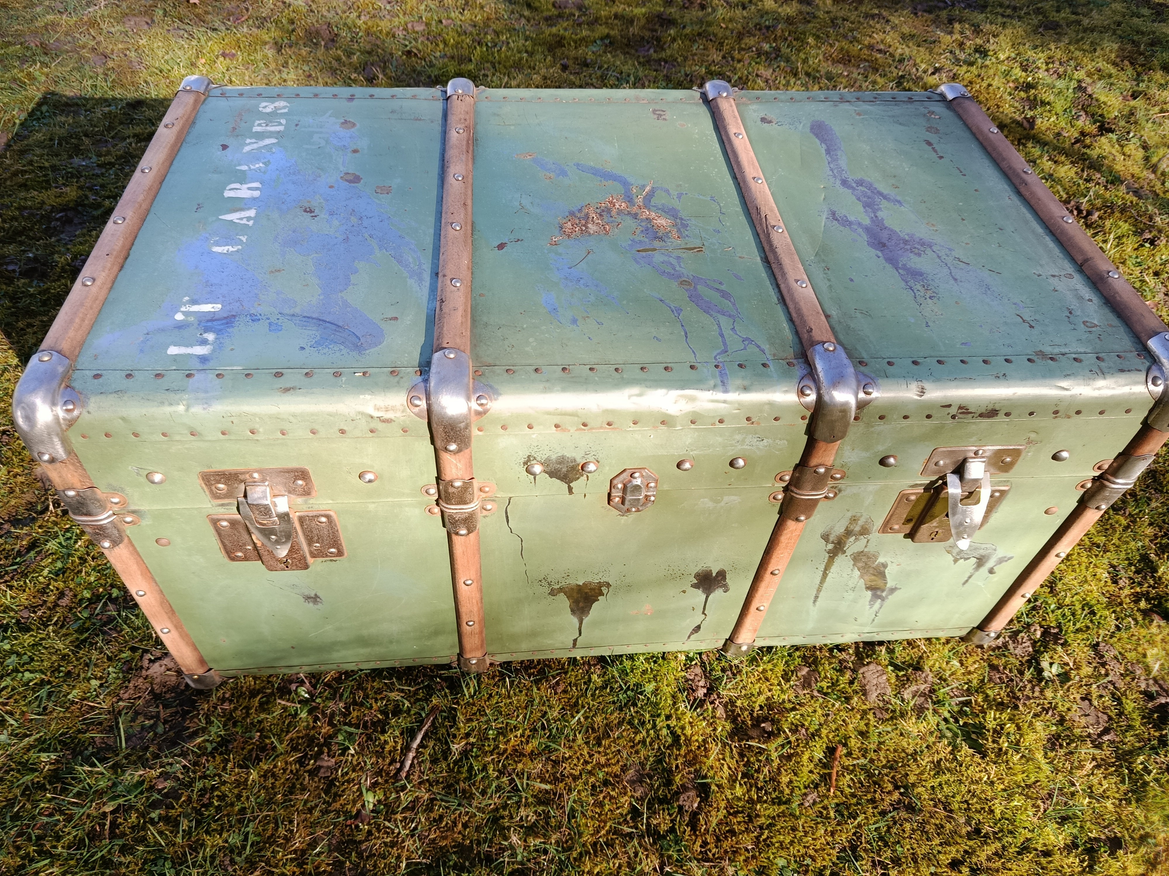 Malle cintrée des années 30 - ce modèle est assez rare surtout dans cette couleur - sa structure est en bois avec un feuillage en alu riveté - couleur vert lagon - fermoirs de belle qualité - cette malle est idéale pour un intérieur indu - un loft - elle est dans le style aviateur - solide et de bellke qualité - la couleur est passée à certains endroits mais ça lui donne le charme de l'ancien et du vécu elle appartenait au paquetage d'un militaire dont le nom est encore inscrit sur le capot - a connu l'indochine et l'Algerie