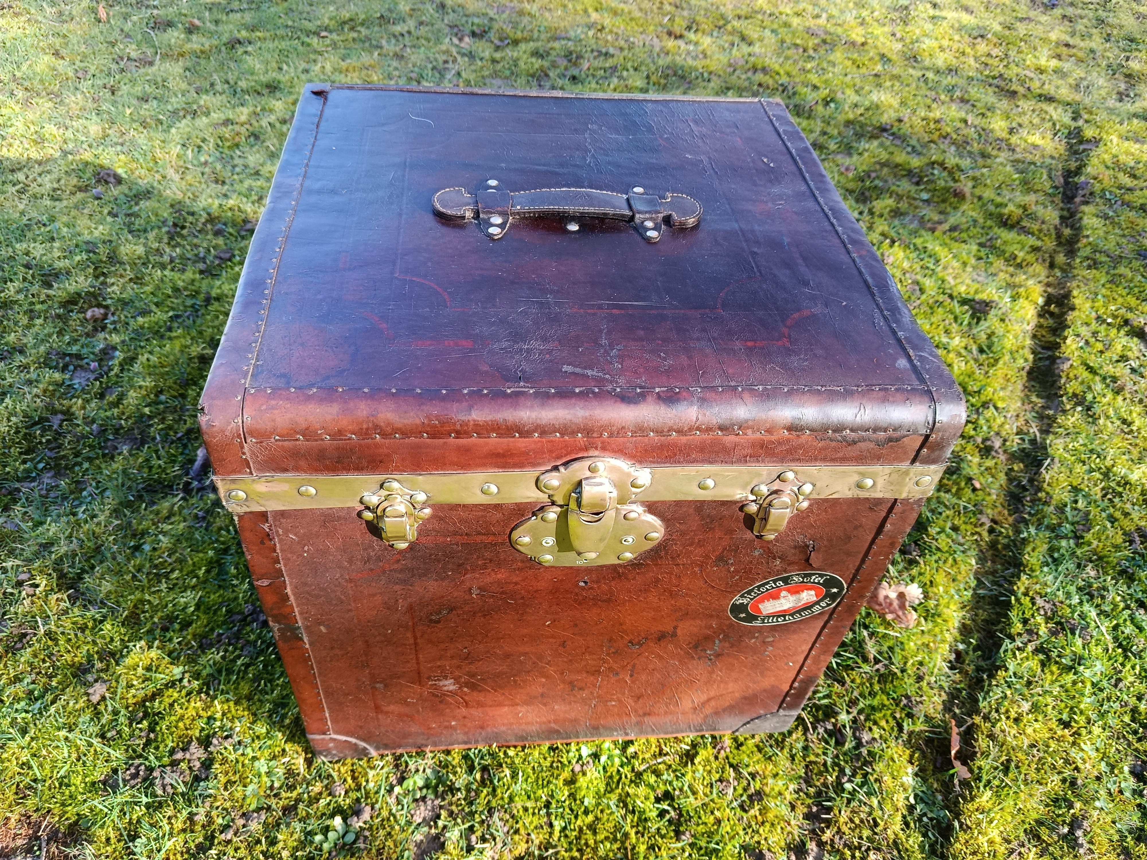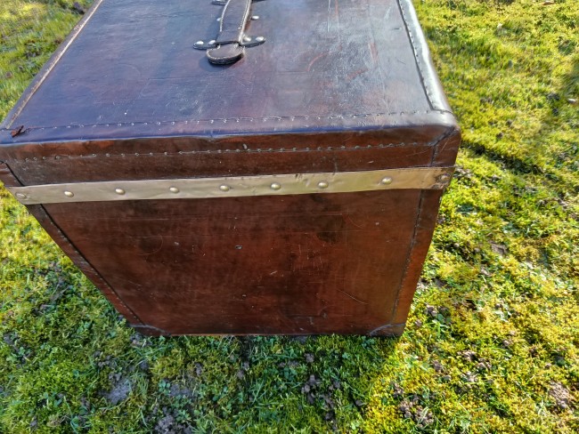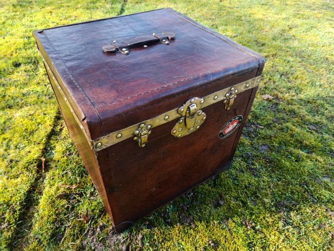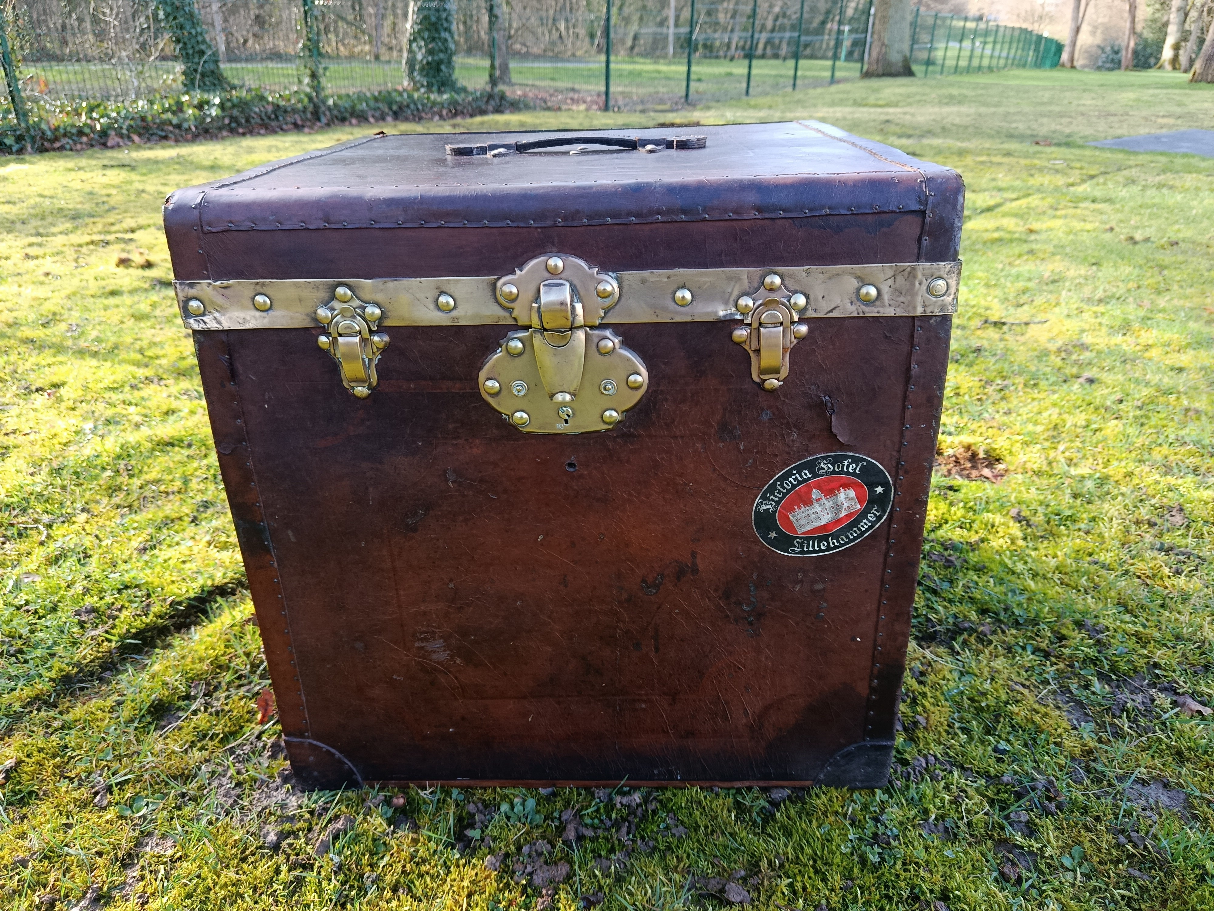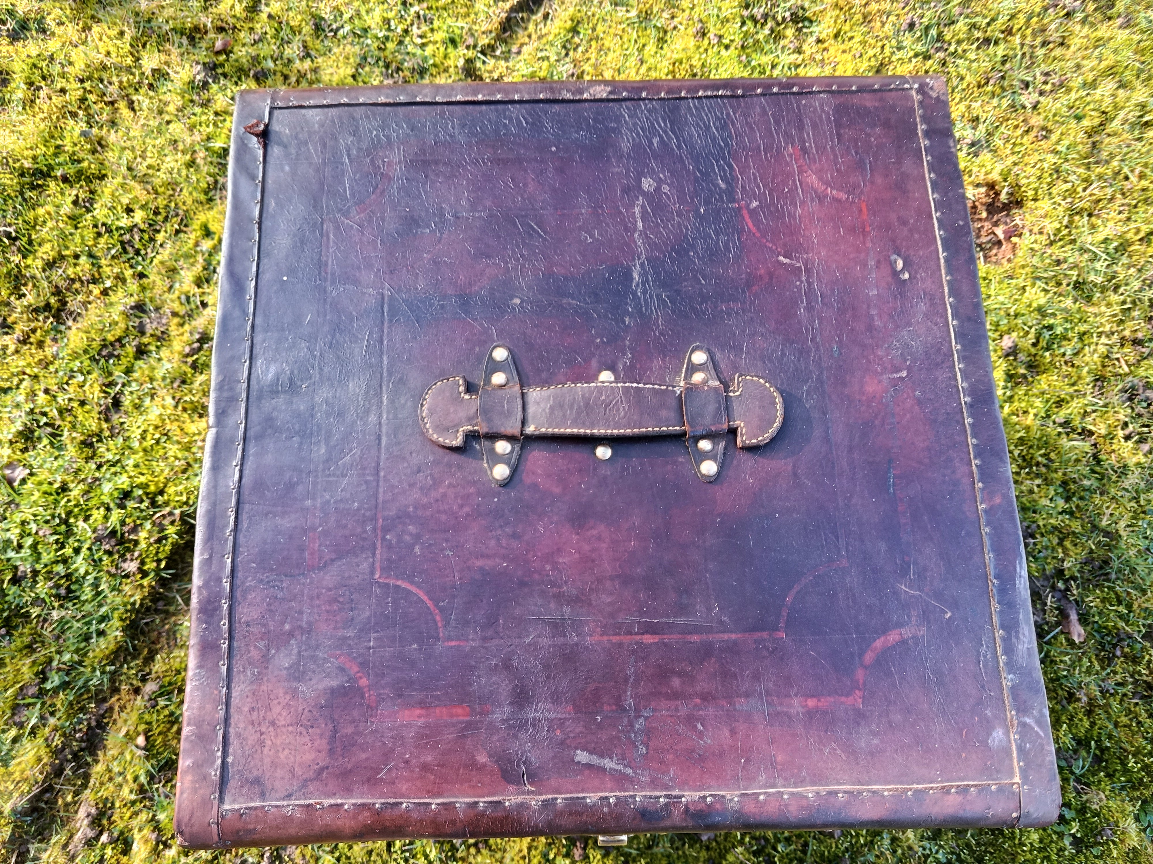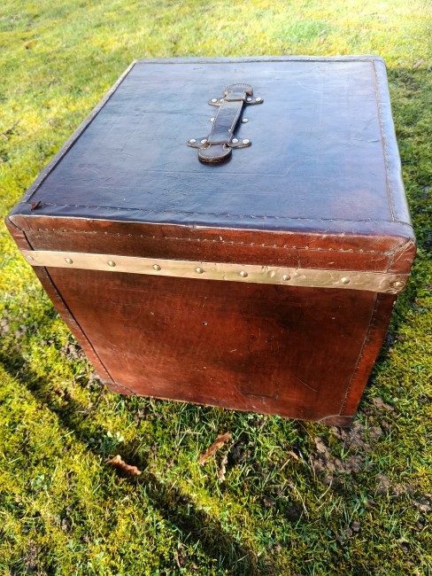 Malle de luxe en bois - revêtement cuir - trés belle qualité et belle conservation - le cuir a été rafraichi avec un produit spécial cuir - laiton astiqués - intérieur bon état - dimensions carrées - peu d'encombrement et très classe dans un intérieur - idéale pour rangement de petits objets - petit table dans un intérieur réduit ou chambre - table de nuit ... récupérée dans un appartement parisien