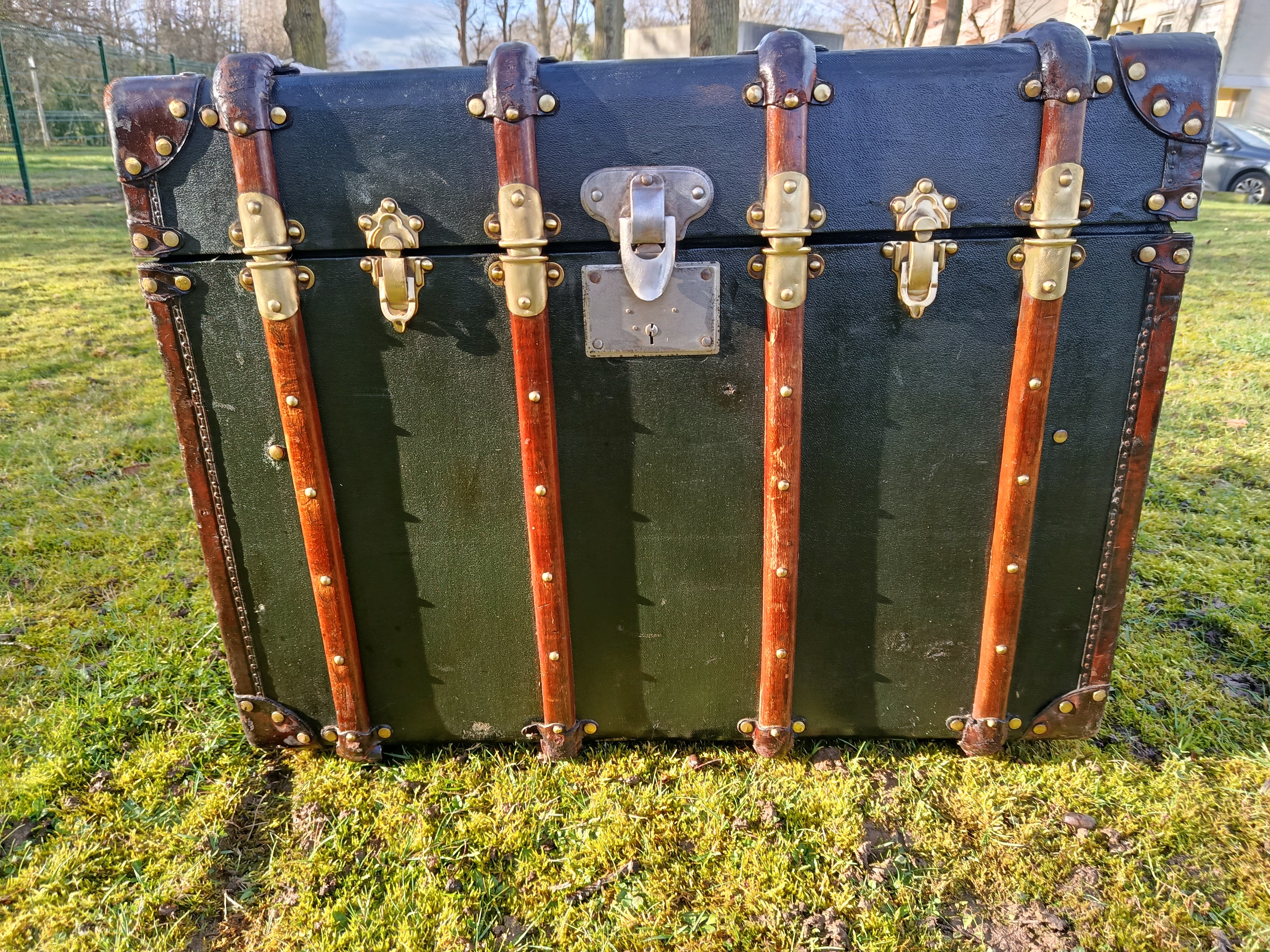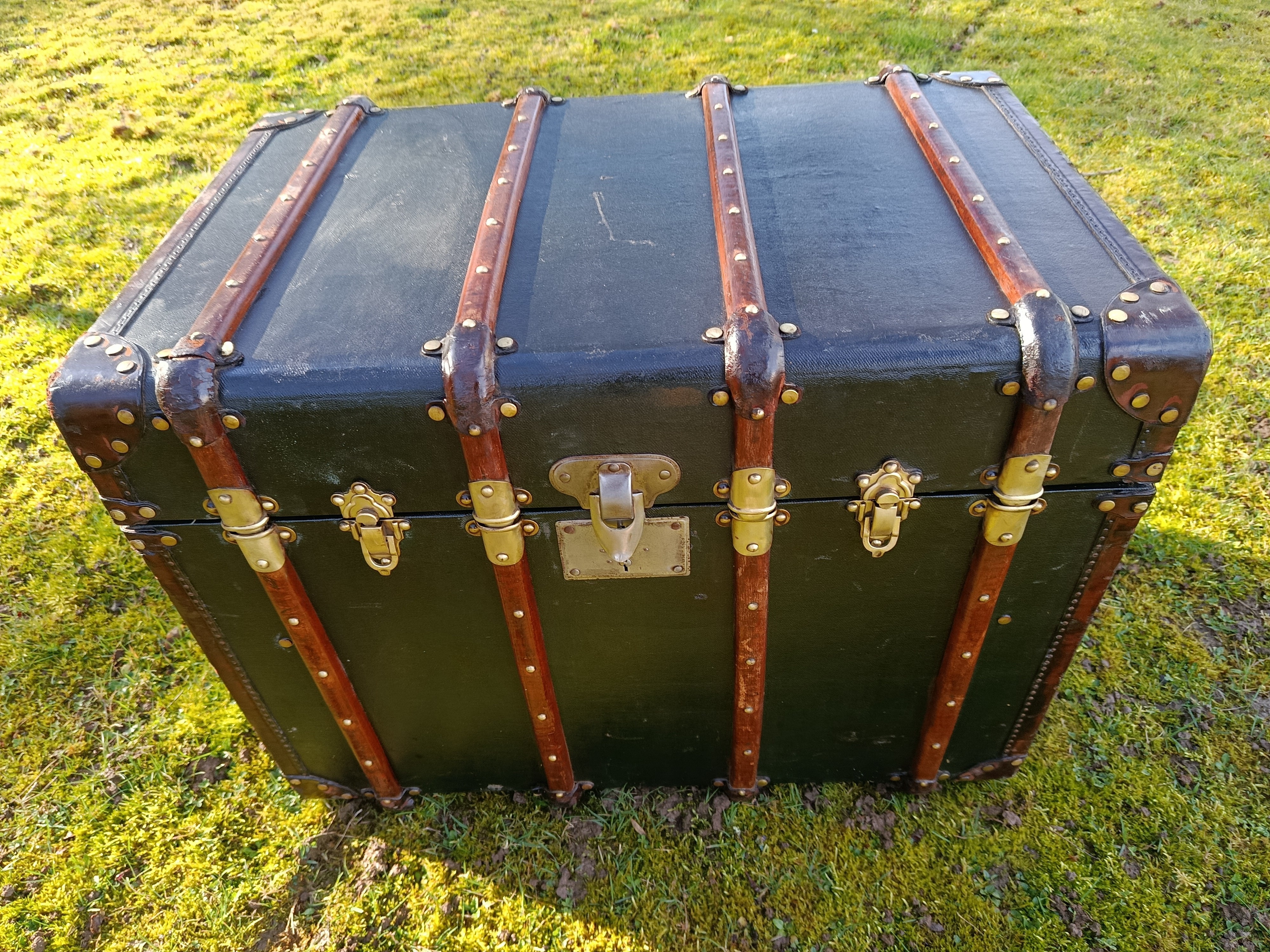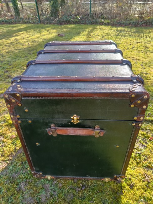 Malle de courrier des années 30 - elle a connu les voyages en chemin de fer et l'exode de 39/40 - rutilante avec un produit redonnant du lustre à son revêtement en toile enduite - beaux cintrages en hêtre et fermoirs en laiton - très classe - idéale pour un détournement table basse ou bar - bout de lit - petite table cornières en cuir - poignées d'origine
