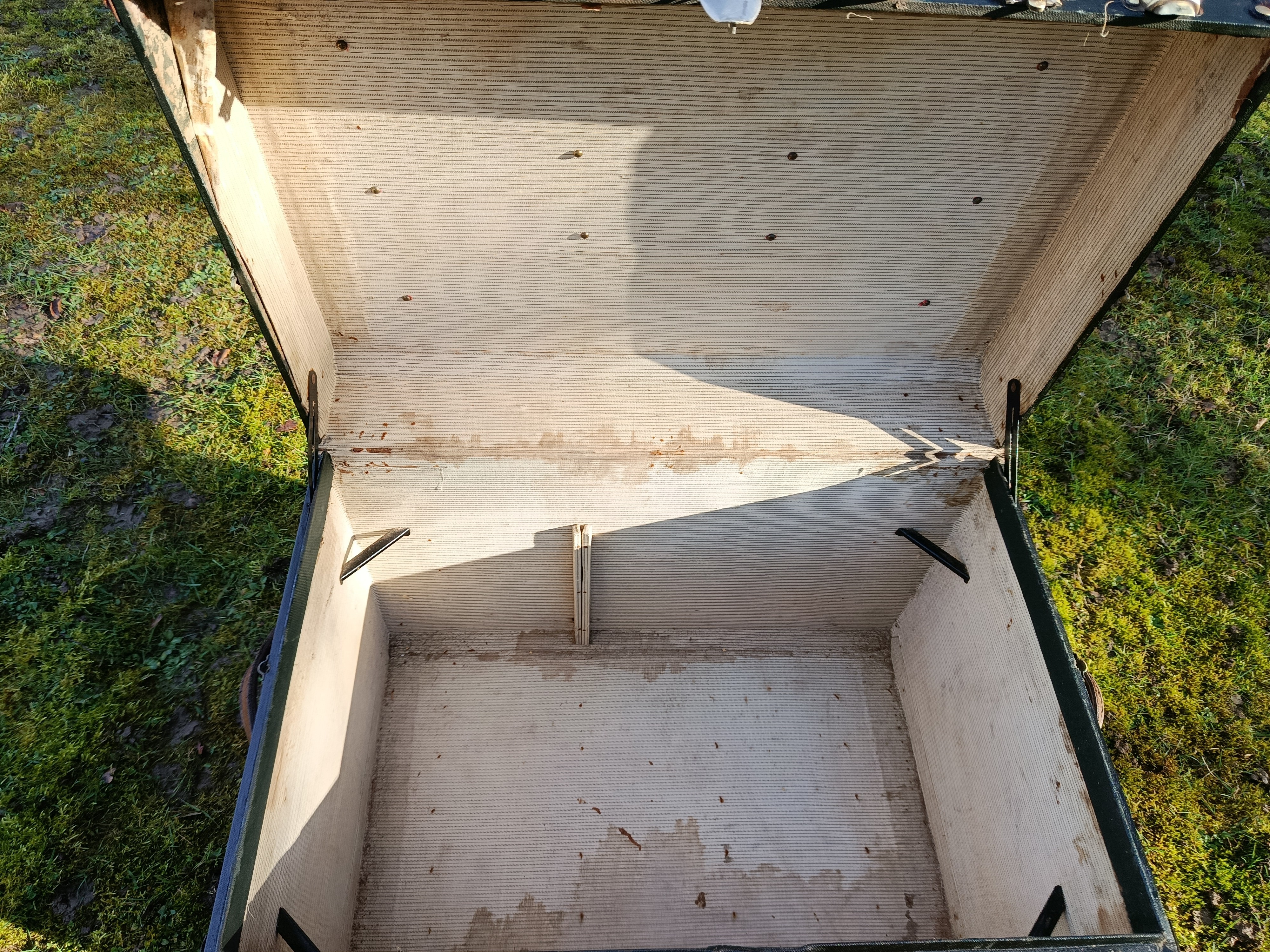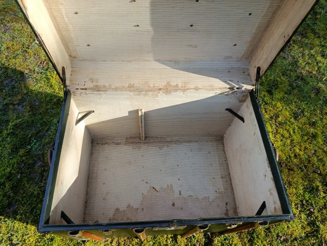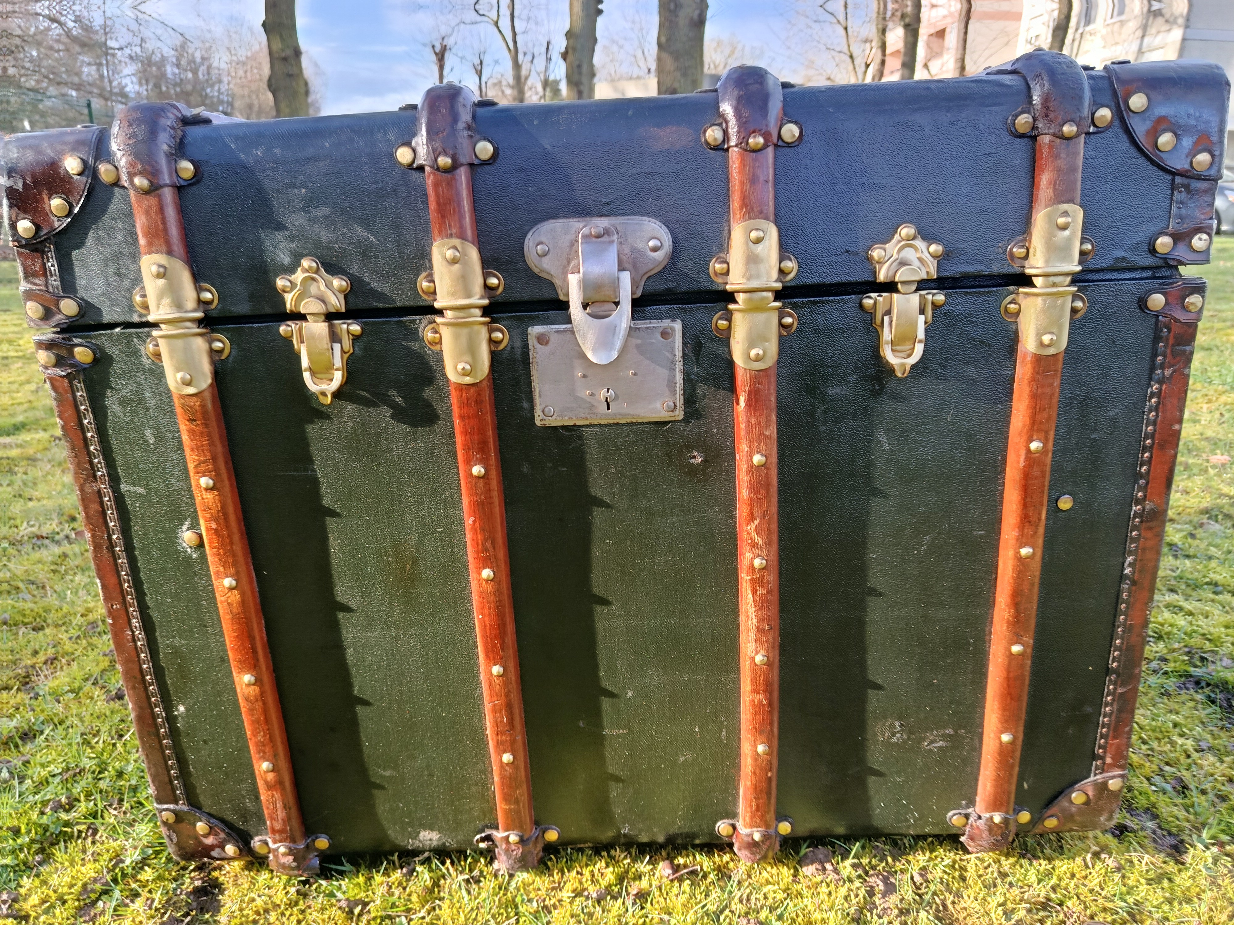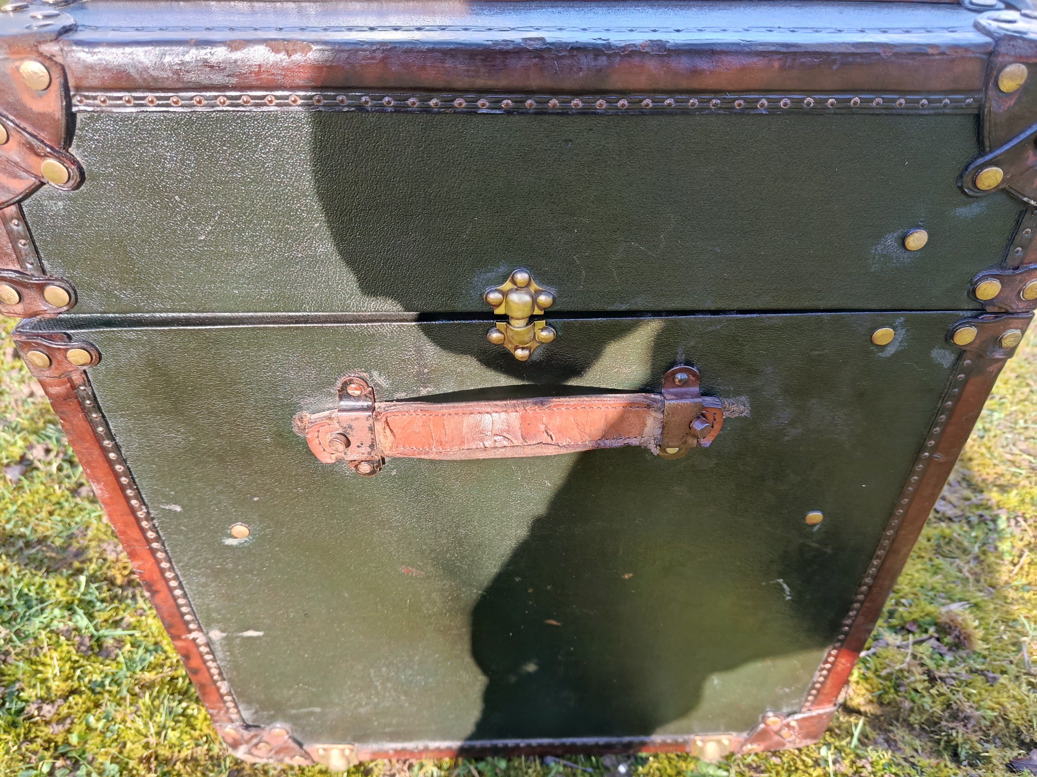 Malle de courrier des années 30 - elle a connu les voyages en chemin de fer et l'exode de 39/40 - rutilante avec un produit redonnant du lustre à son revêtement en toile enduite - beaux cintrages en hêtre et fermoirs en laiton - très classe - idéale pour un détournement table basse ou bar - bout de lit - petite table cornières en cuir - poignées d'origine