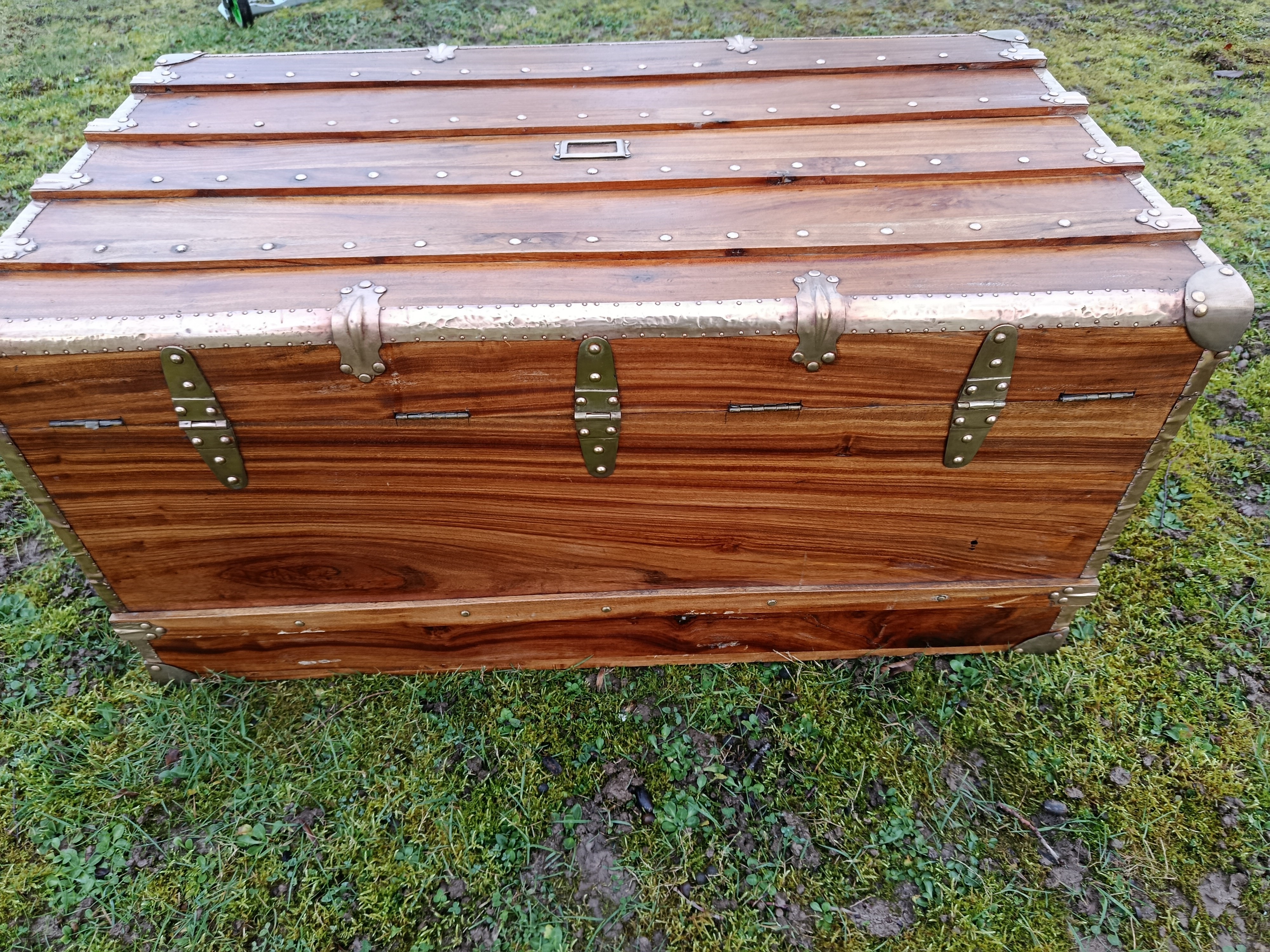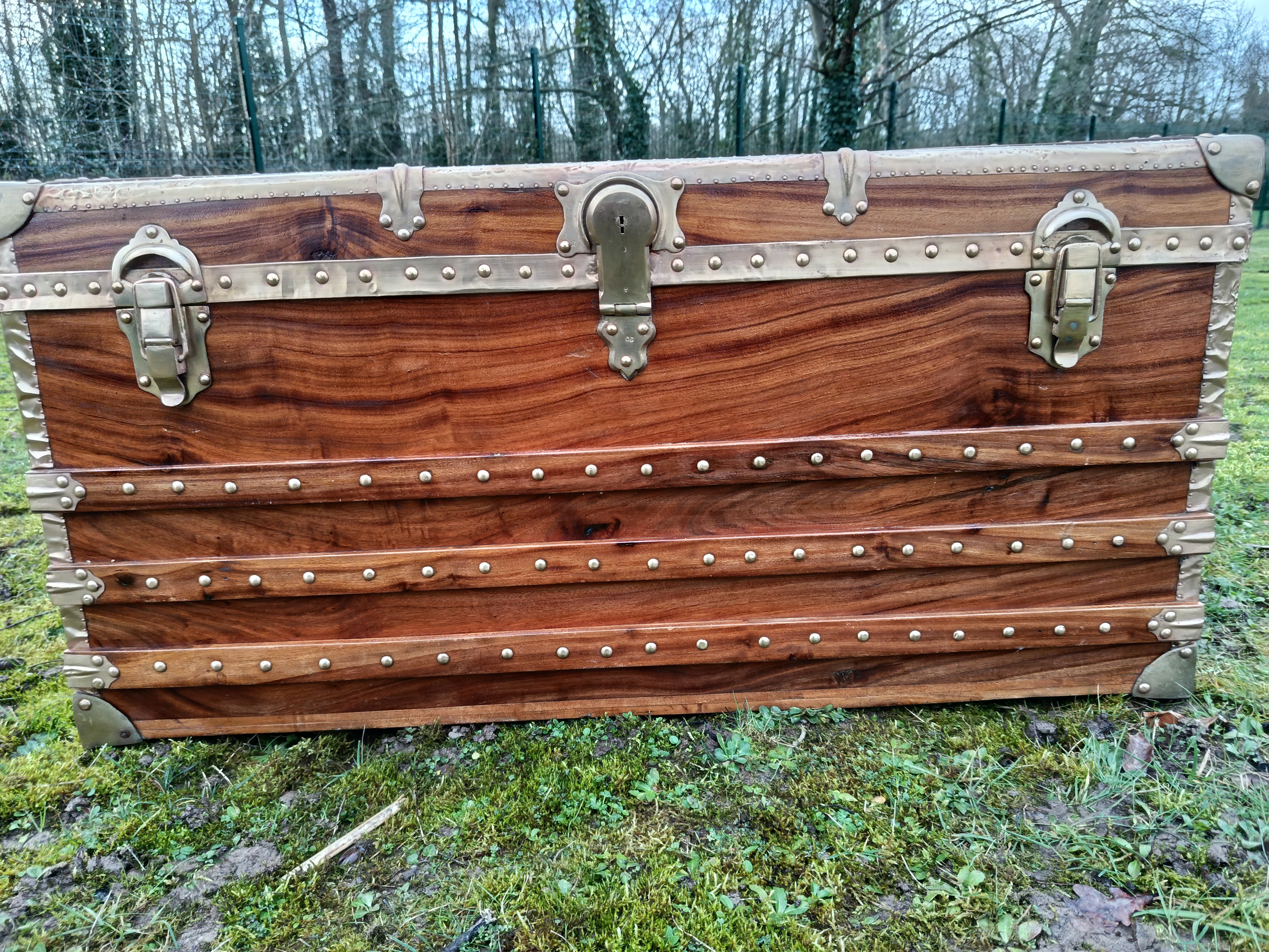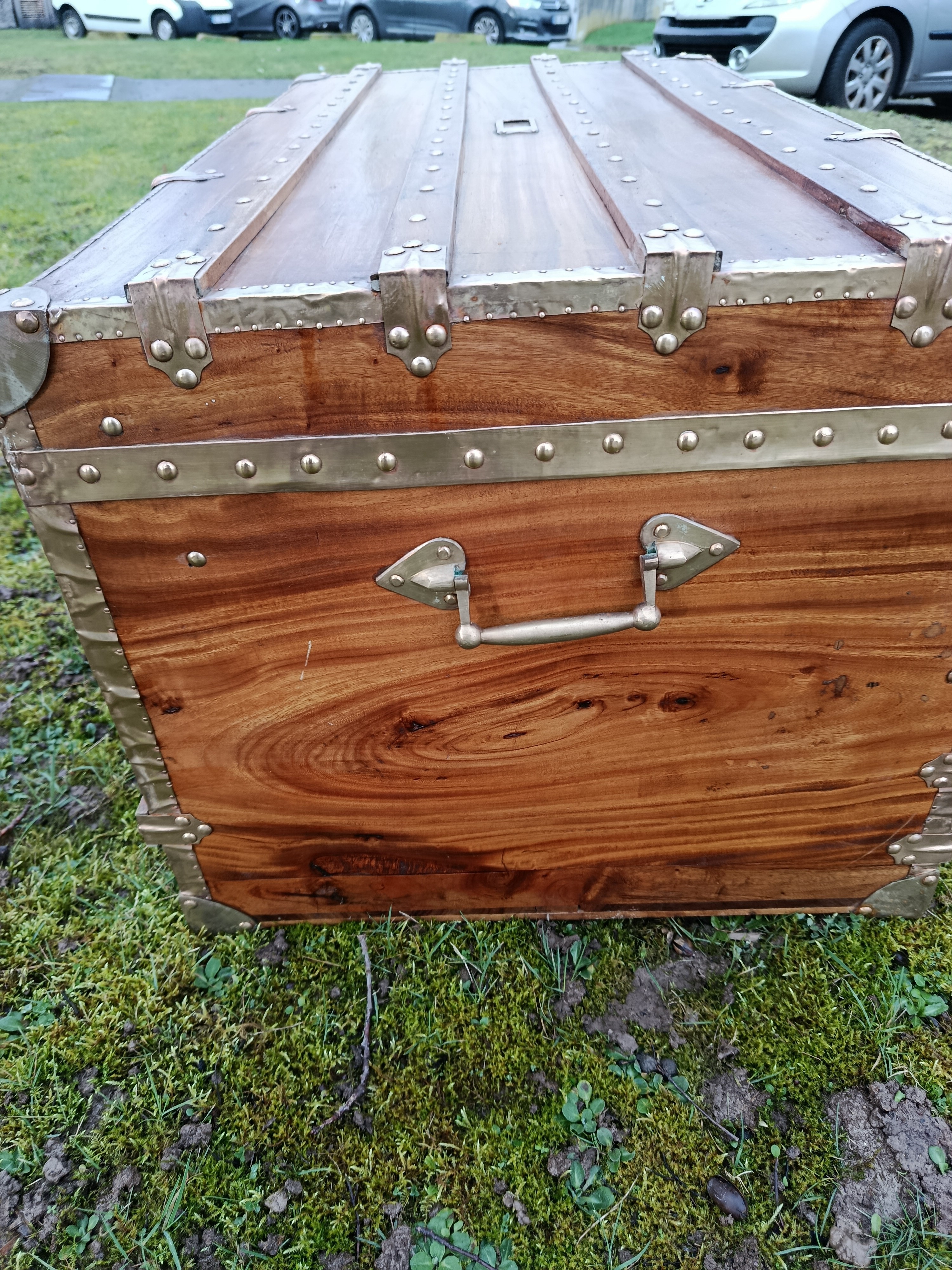 Gros camphrier de marine fin 19ème - appartenait à un officier de la coloniale - le camphrier a cette vertu de préserver le linge et les effets des agressions du climat et de l'attaque des nuisibles (insectes ect...) ce coffre est de qualité exceptionnelles avec un rafraichissement très réussi - toutes les pièces sont d'origine - son parfum diffuse dans votre intérieur une odeur très agréable quand il est ouvert - bois avec un superbe veinage - vernis - la bijouterie est en laiton - bandeaux et cornières - ainsi que les fermoirs - belles poignées en bronze ainsi que les coins - malle très solide et assez lourde - grande contenance - produit de très belle qualité - n'a rien à envier des grandes malles de luxe mais avec un prix plus abordable - je trouve que mes photos ne la mette pas dans la valeur qu'elle mérite (plus belle en réalité...)