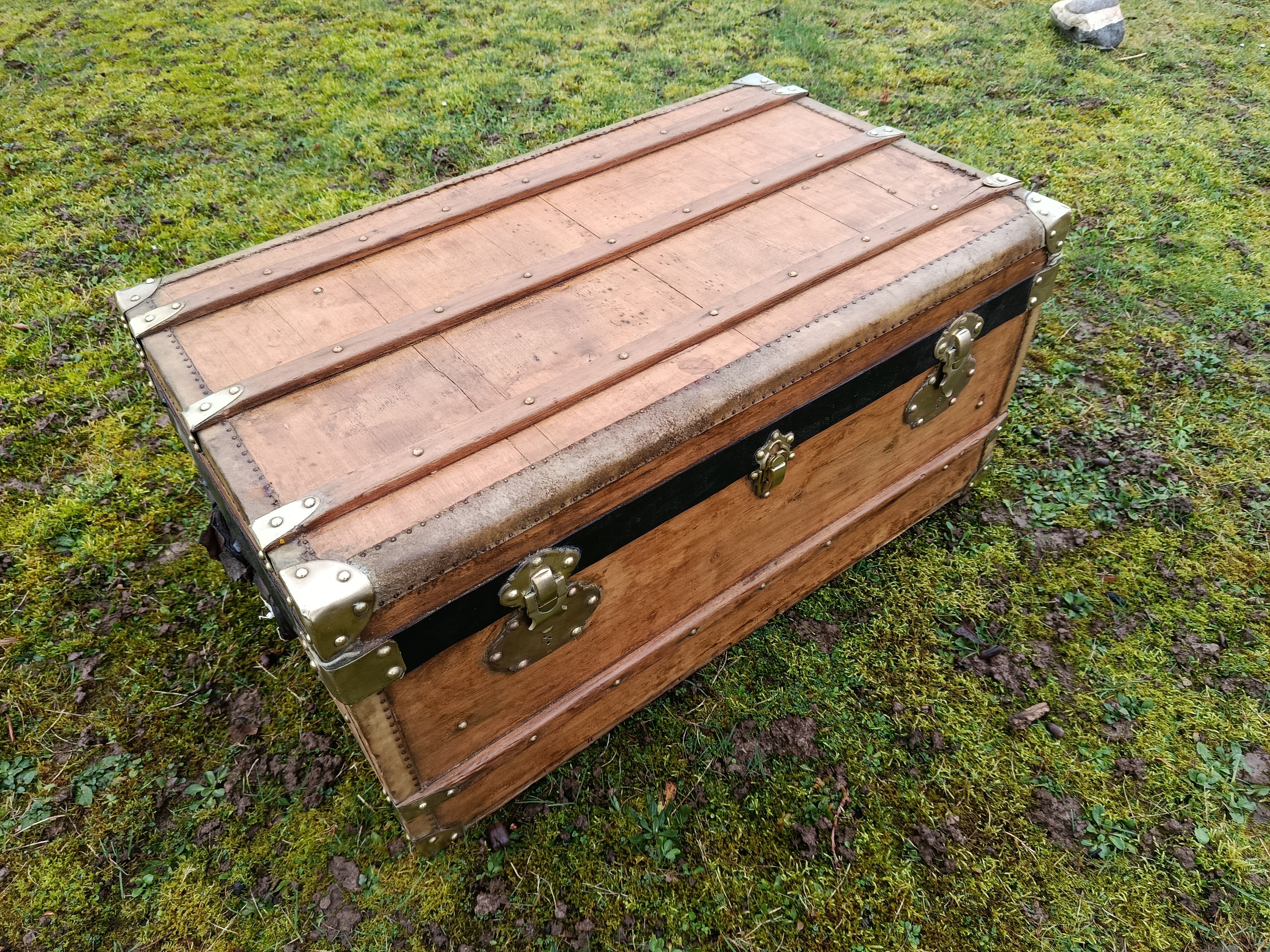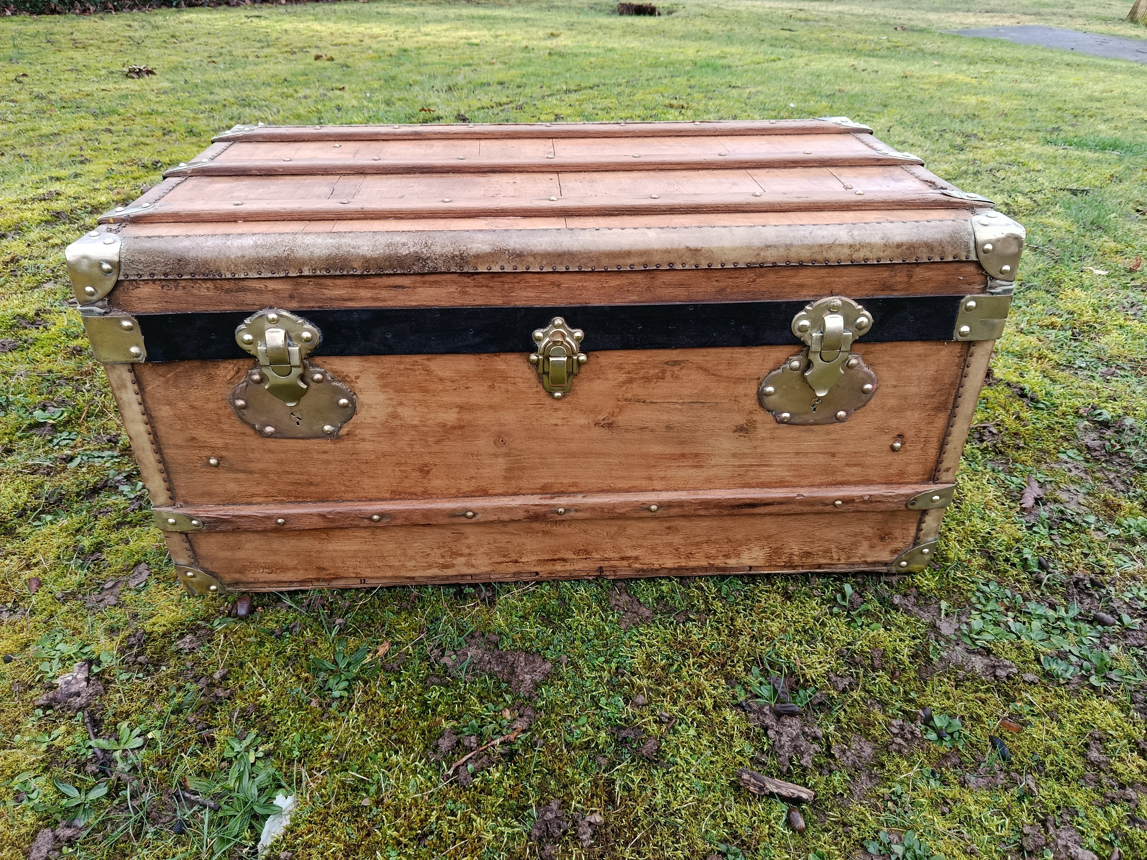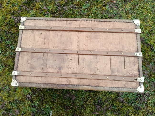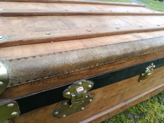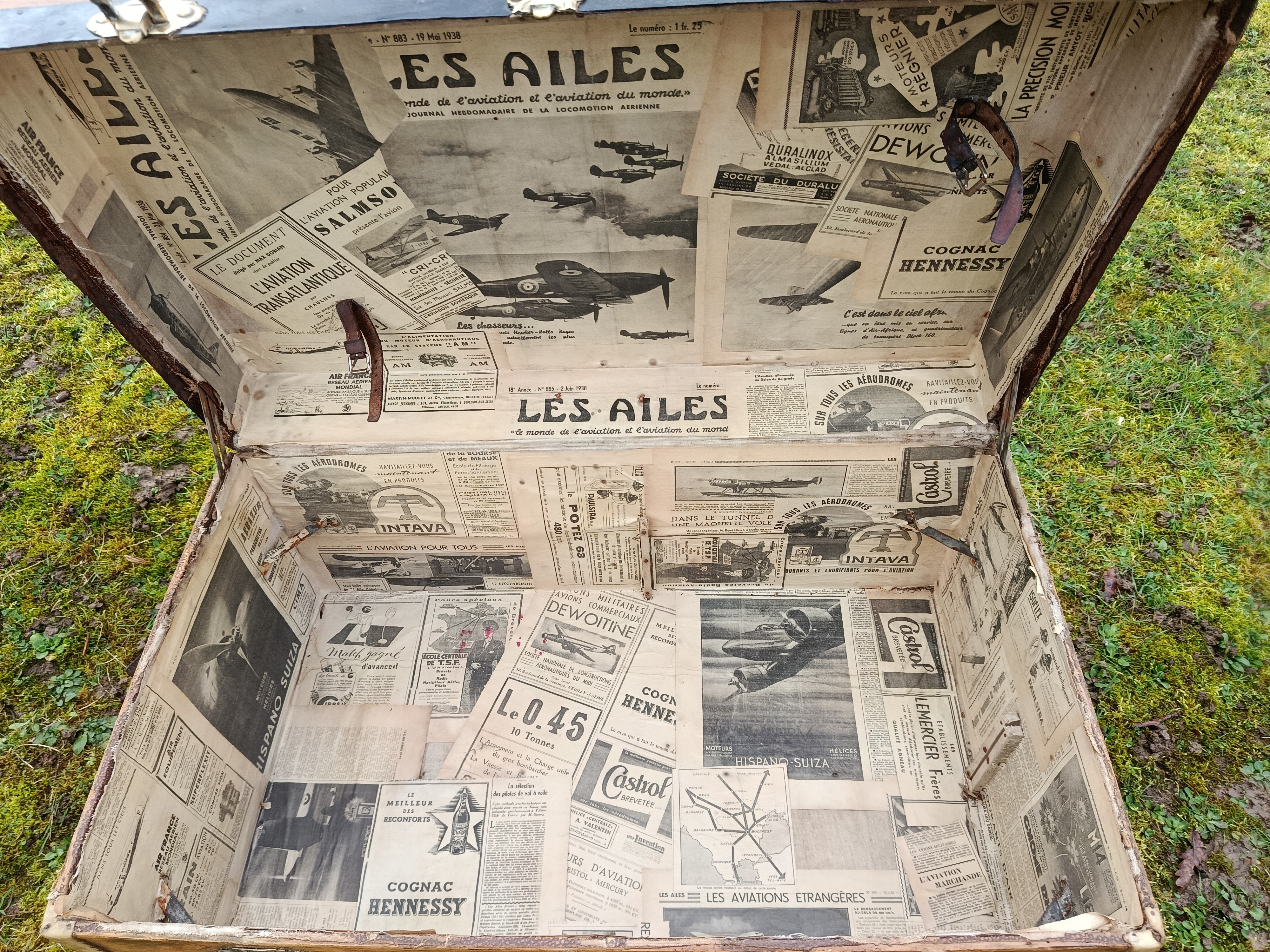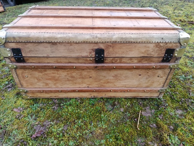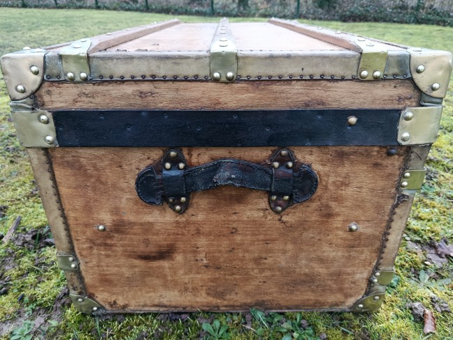 Malle transatlantique fin 19ème - belle restauration- bois clair vernis et traité - les cornières sont en peau et la structure en peuplier massif - bijouterie et fermoirs en laiton - cette malle a connu les grands voyages transatlantiques sur les paquebots de prestige tels que le Normandie - l'intérieur a été customisé avec des vrais vieux journaux de 1940 "Les ailes" - superbe - toutes les pièces sont d'origine - cornières en peau - Idéale pour faire un bout de lit - malle à chaussures - bar ou table basse