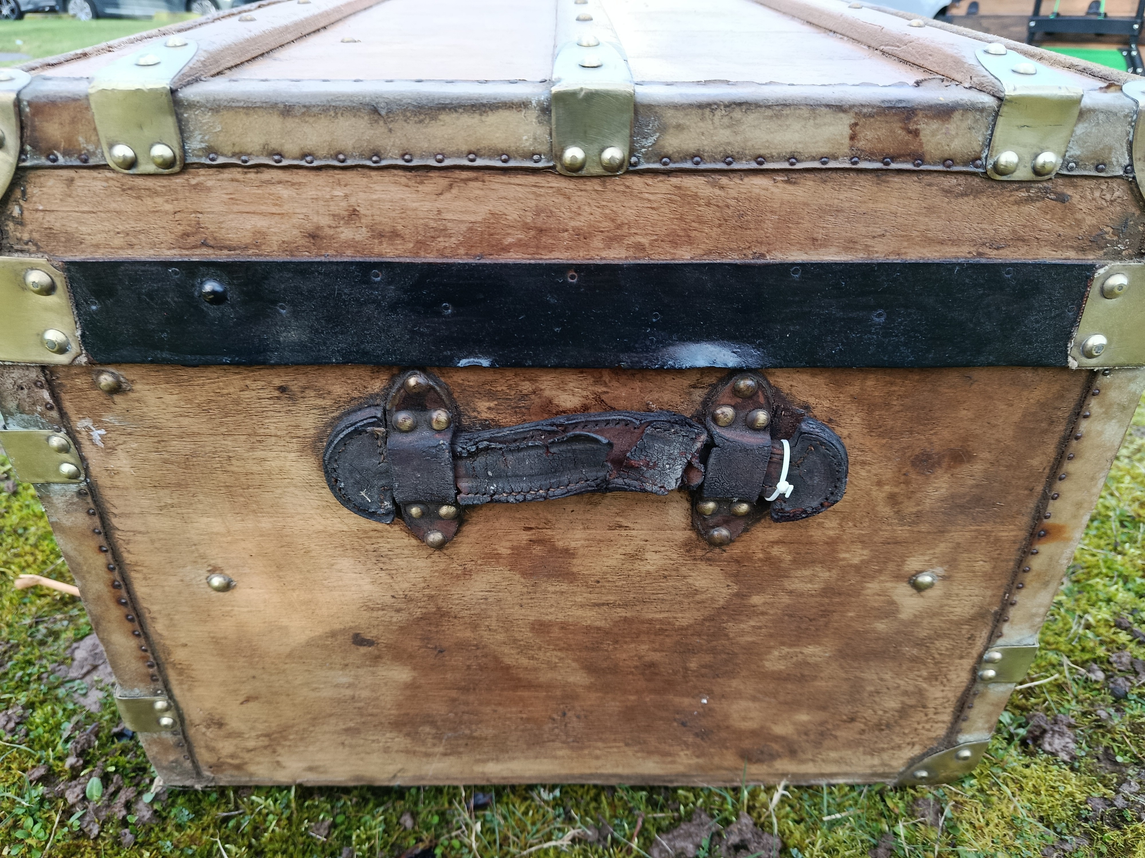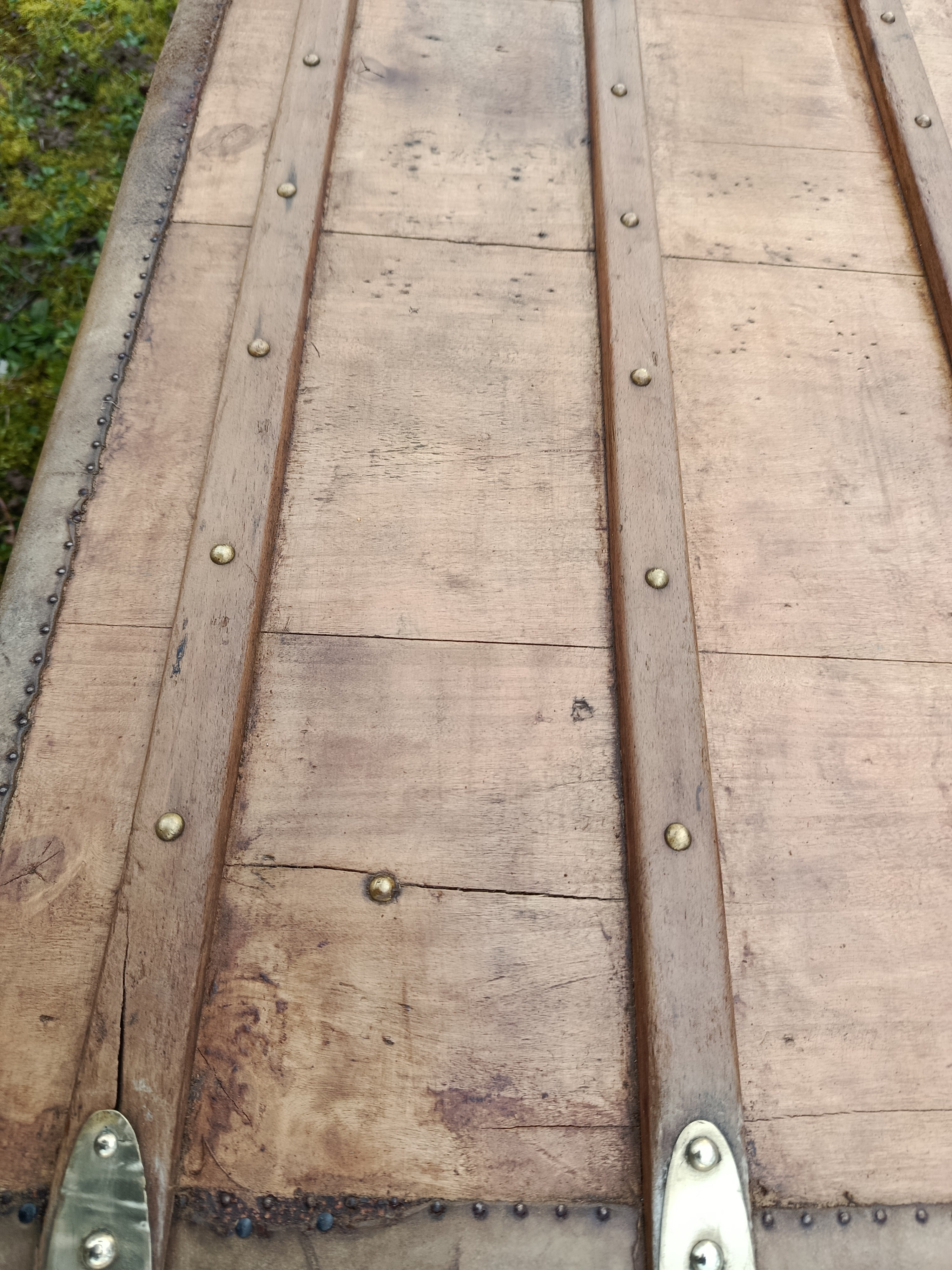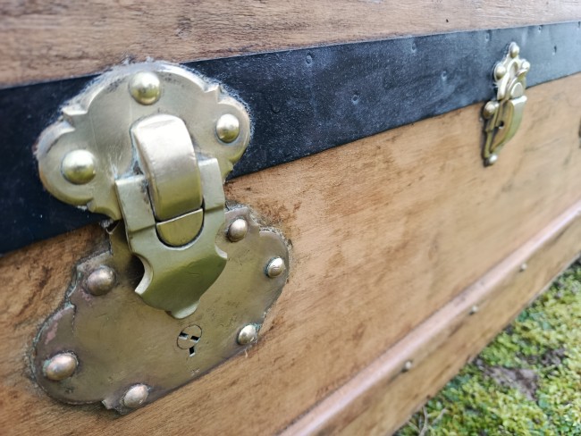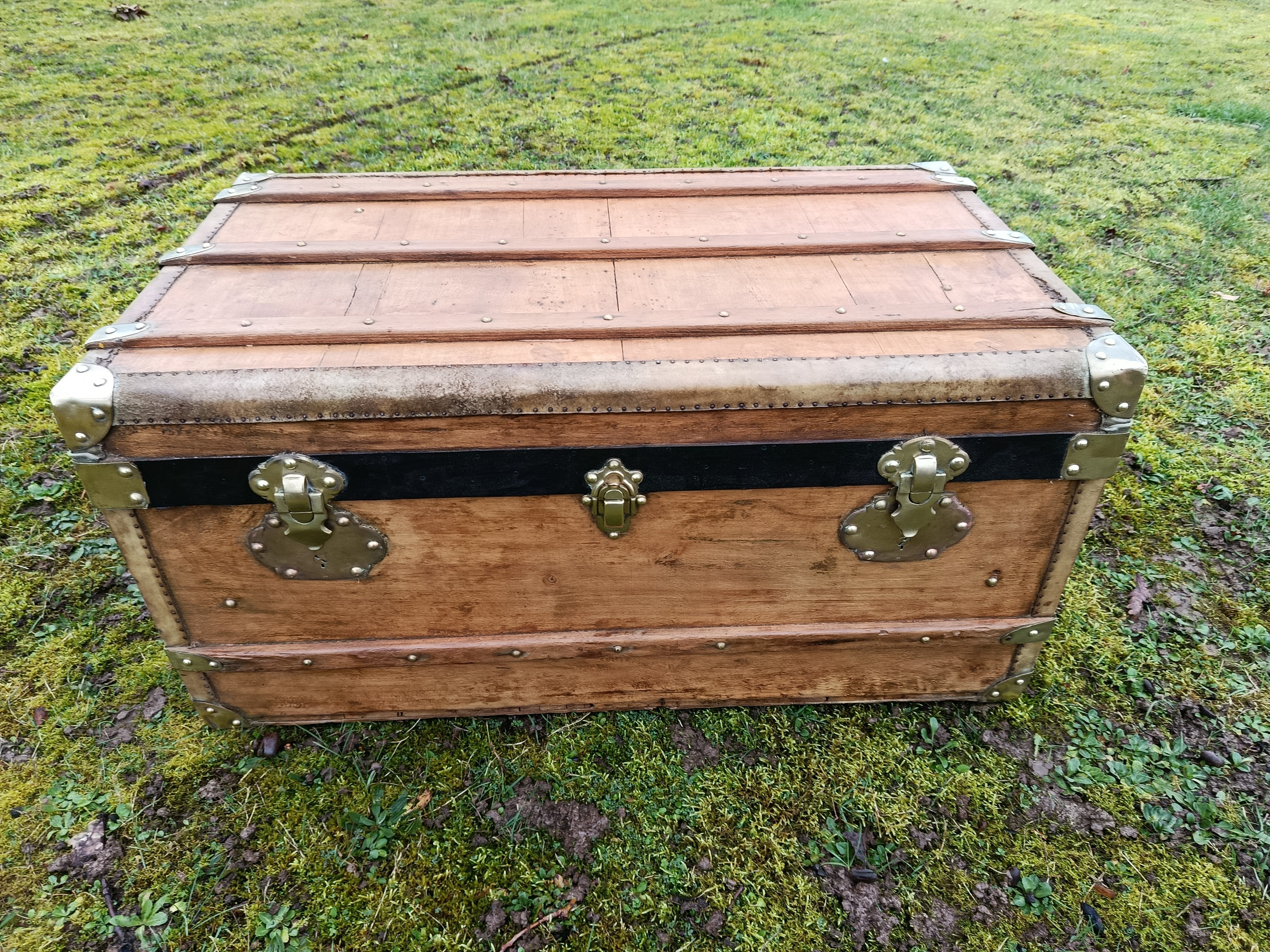 Malle transatlantique fin 19ème - belle restauration- bois clair vernis et traité - les cornières sont en peau et la structure en peuplier massif - bijouterie et fermoirs en laiton - cette malle a connu les grands voyages transatlantiques sur les paquebots de prestige tels que le Normandie - l'intérieur a été customisé avec des vrais vieux journaux de 1940 "Les ailes" - superbe - toutes les pièces sont d'origine - cornières en peau - Idéale pour faire un bout de lit - malle à chaussures - bar ou table basse