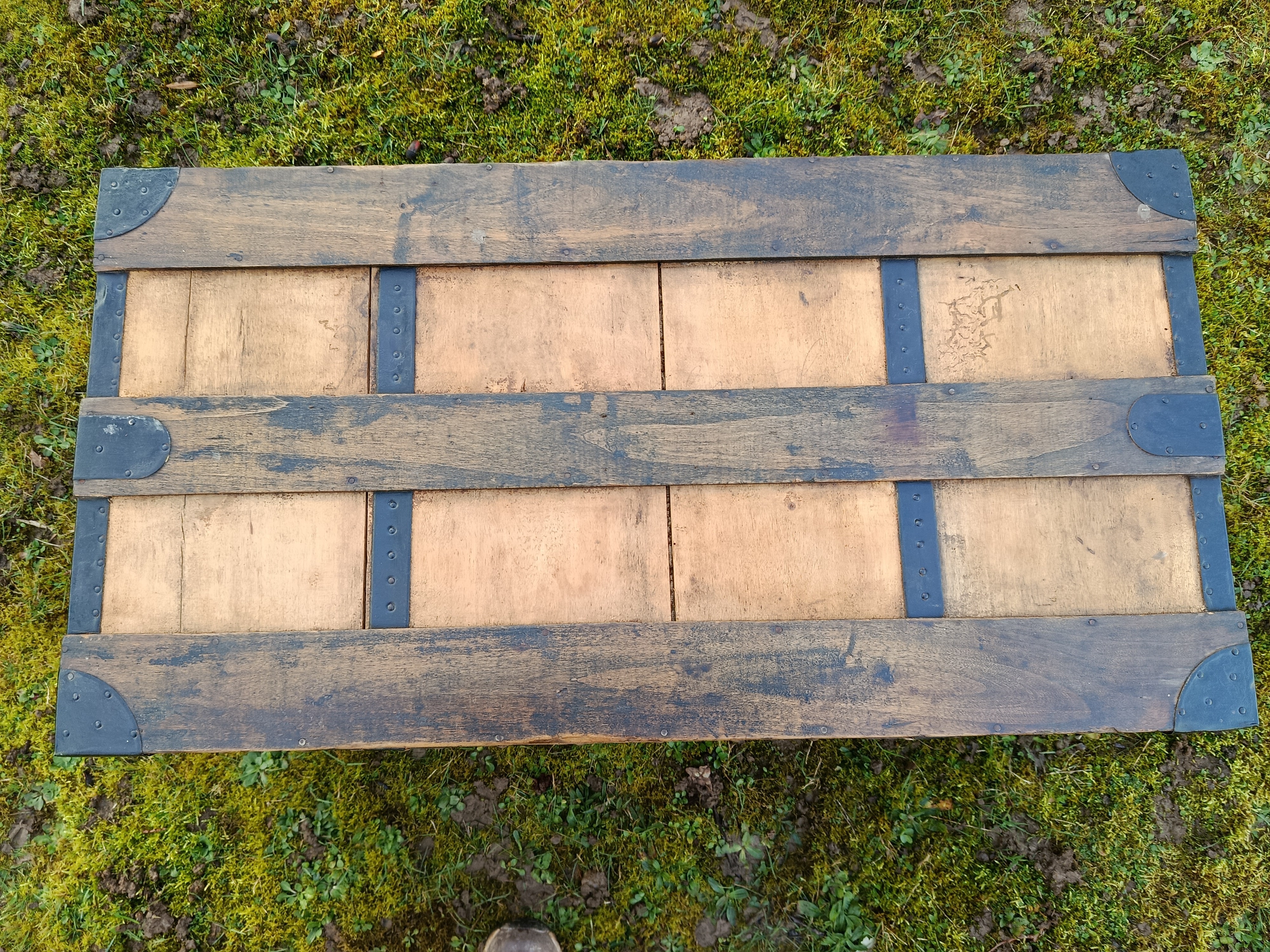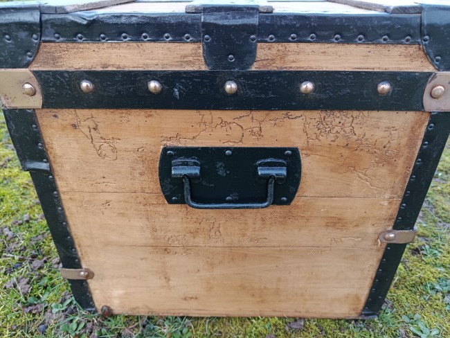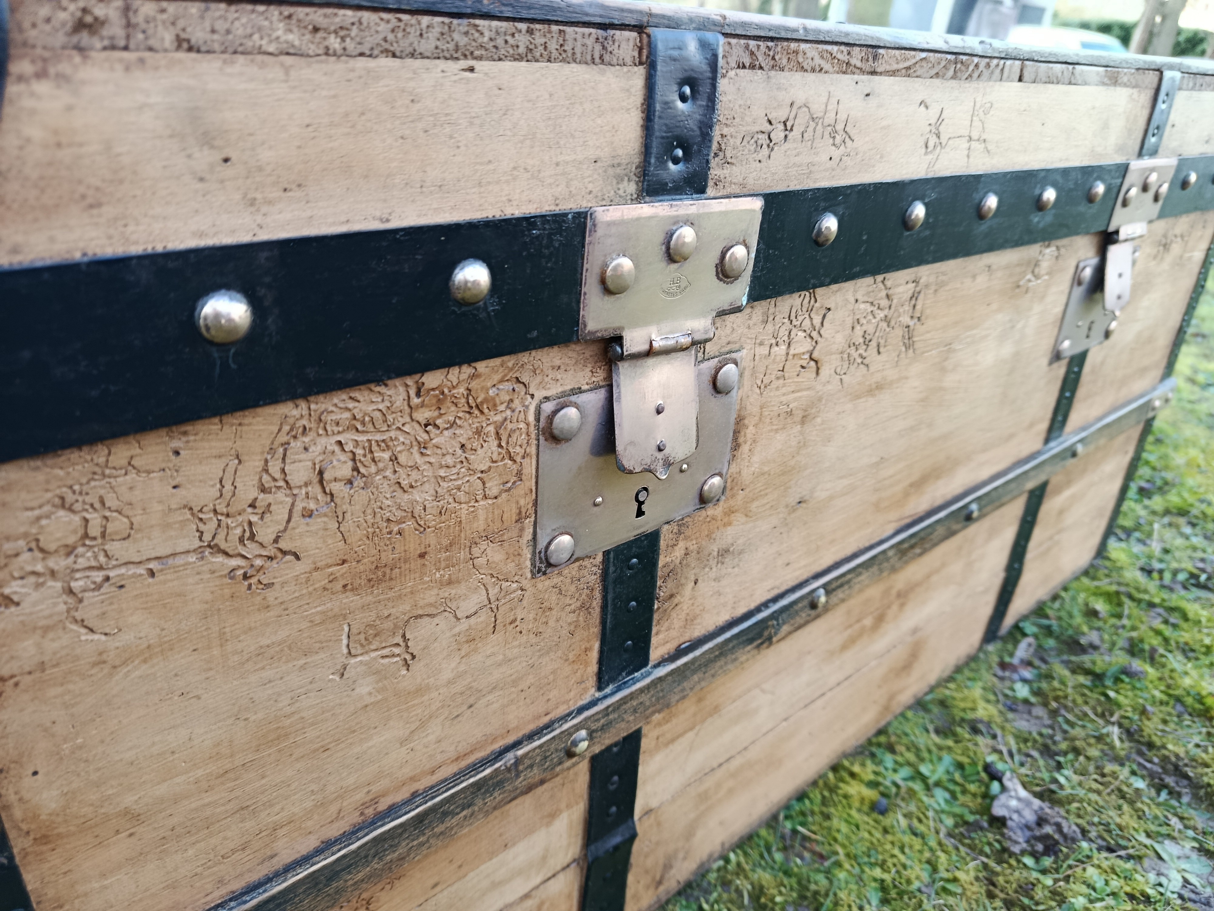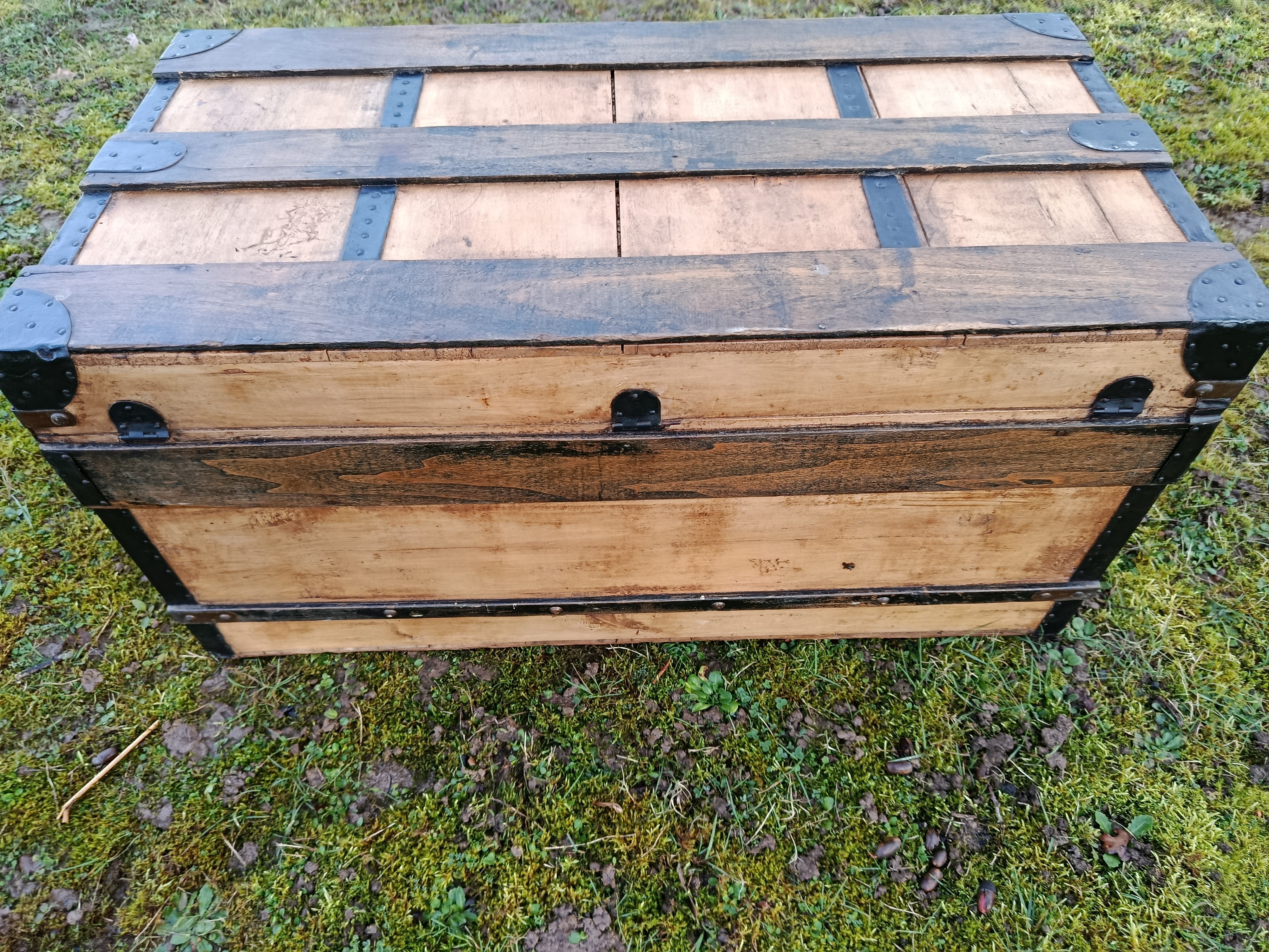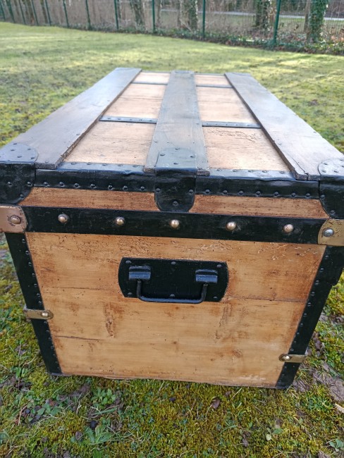 Malle transatlantique - bois clair - faisait parti d'un ensemble de malles de voyage destinées aux traversées transatlantiques fin 19ème - début 20ème - elle est solide et très déco - simple et classe à la fois - traitée et vernis aucun entretien à prévoir - la ferronerie a été enduite d'une patine ferronerie spéciale lui redonnant son lustre d'origine - les métaux ont été brossés - cintrage plat en hêtre - idéale pour une table basse opu un bar - bout de lit ou banc à chaussures - intérieur papier non d'origine