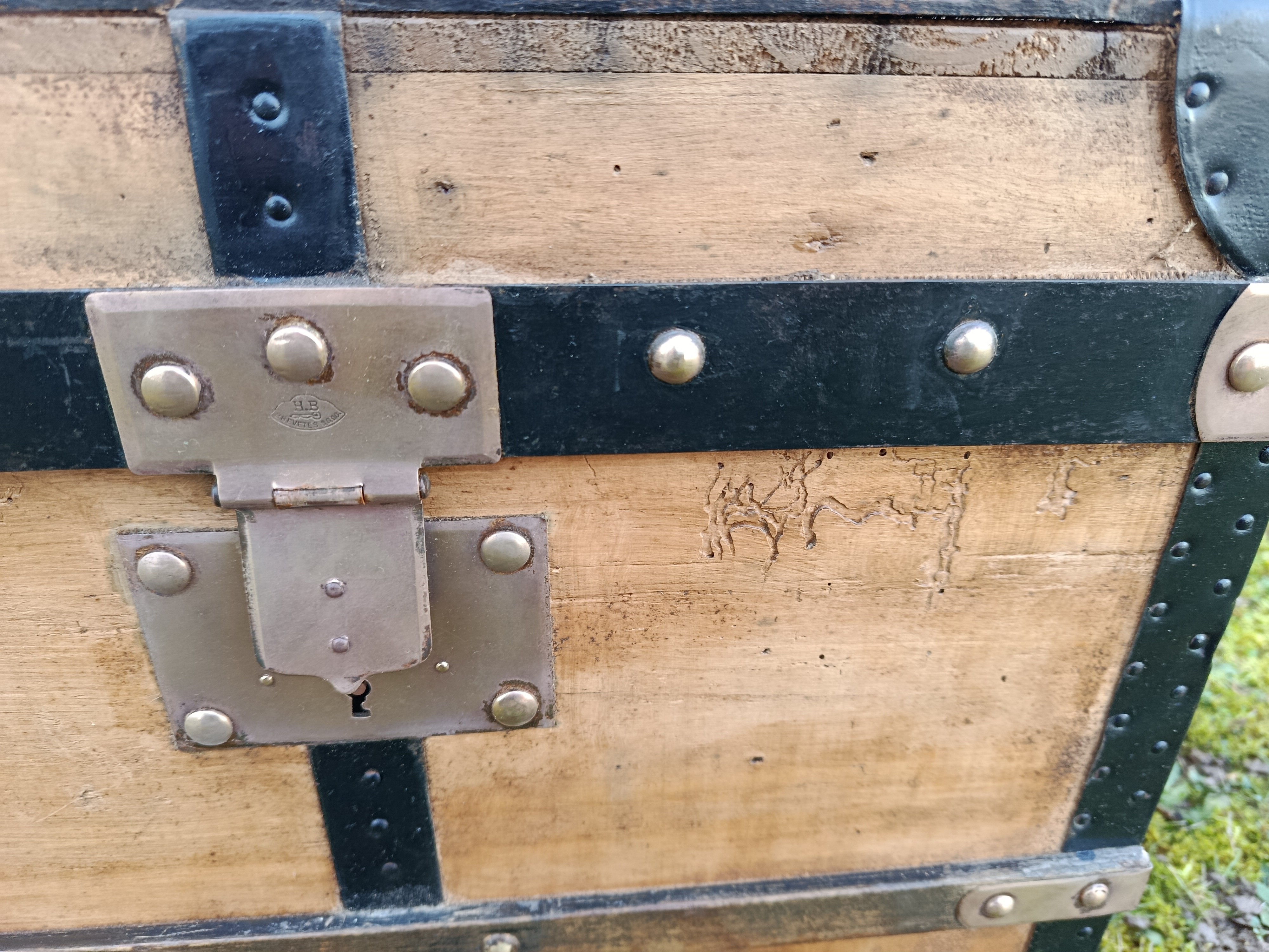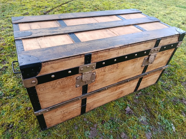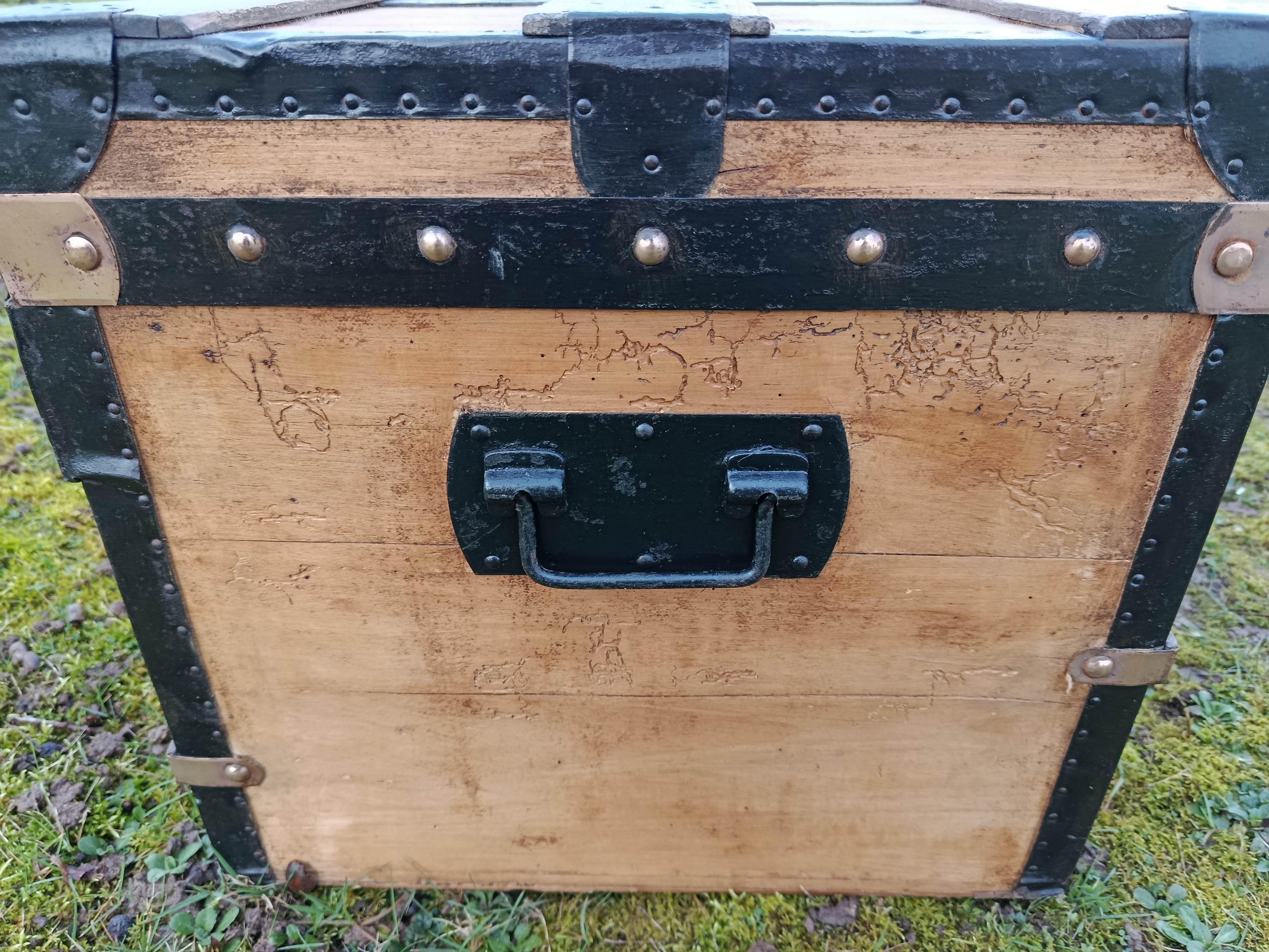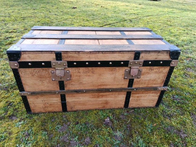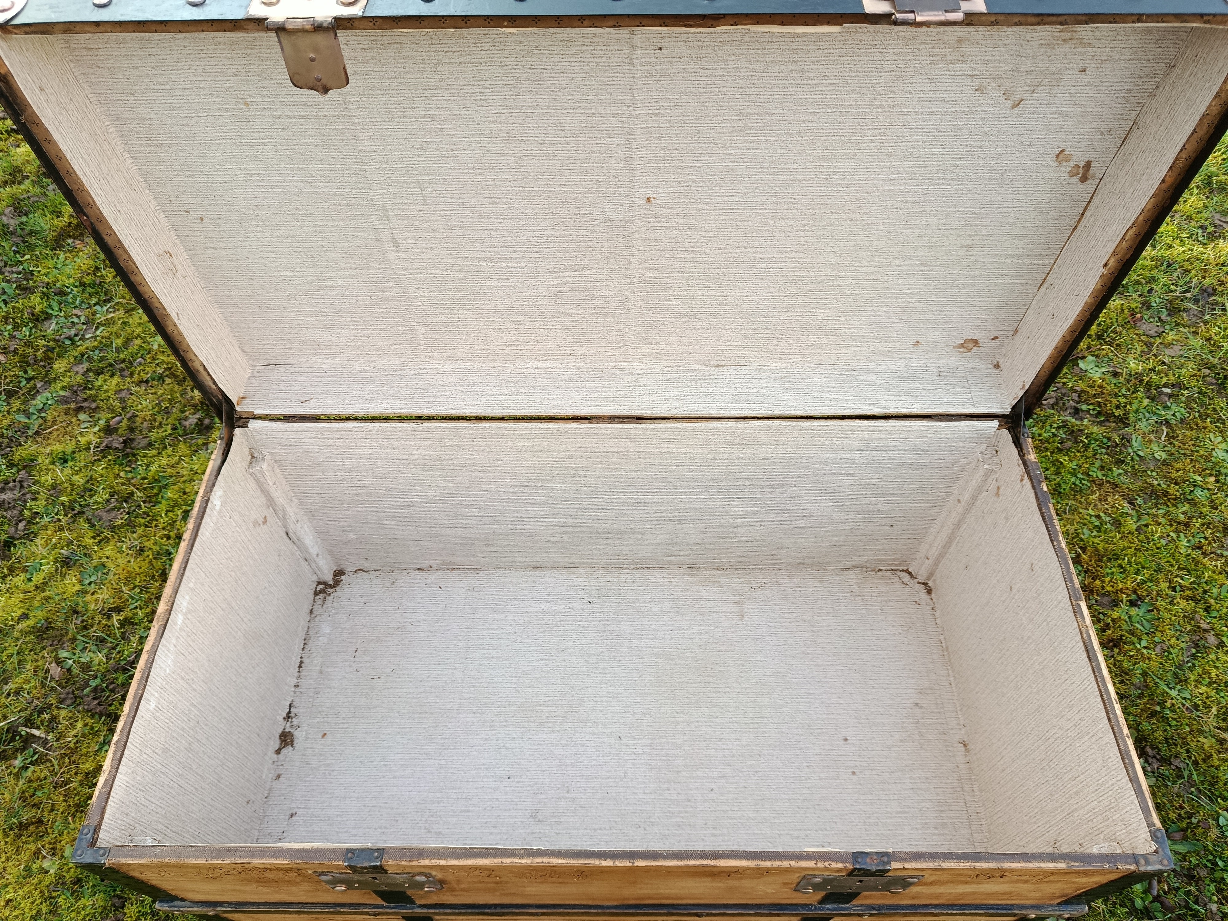Malle transatlantique - bois clair - faisait parti d'un ensemble de malles de voyage destinées aux traversées transatlantiques fin 19ème - début 20ème - elle est solide et très déco - simple et classe à la fois - traitée et vernis aucun entretien à prévoir - la ferronerie a été enduite d'une patine ferronerie spéciale lui redonnant son lustre d'origine - les métaux ont été brossés - cintrage plat en hêtre - idéale pour une table basse opu un bar - bout de lit ou banc à chaussures - intérieur papier non d'origine