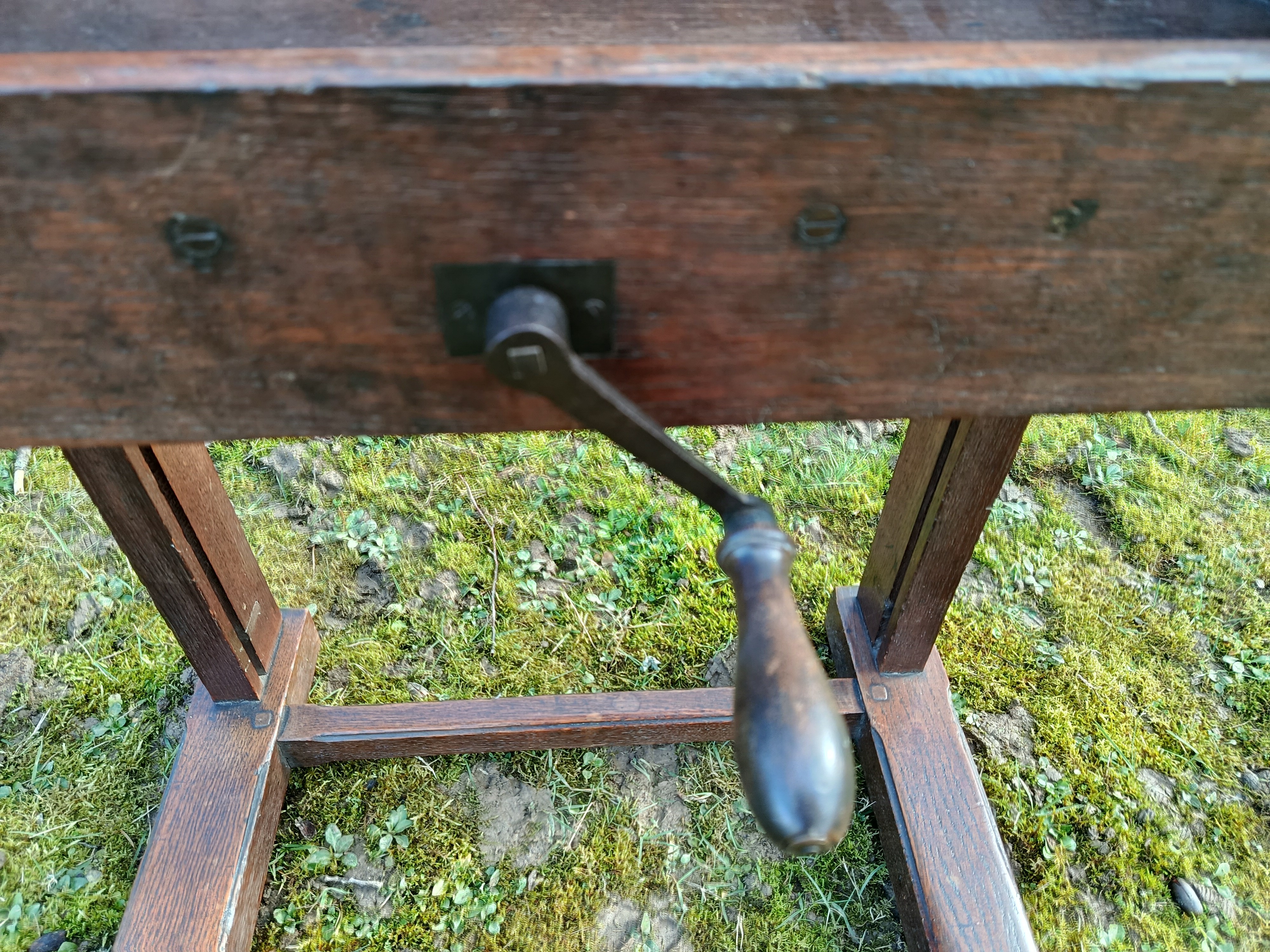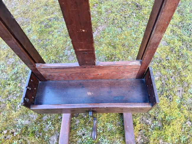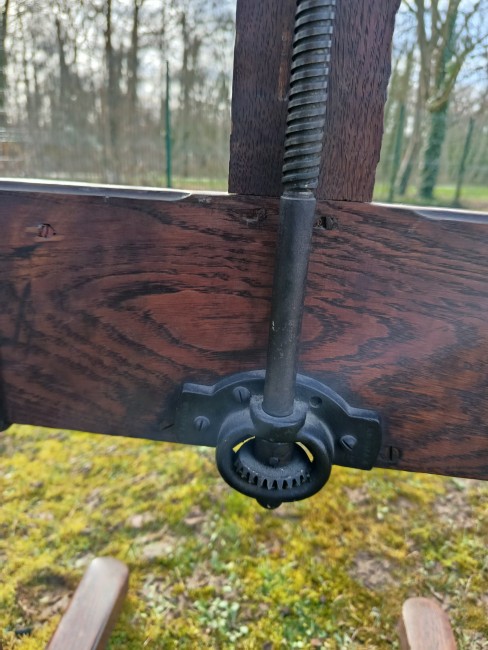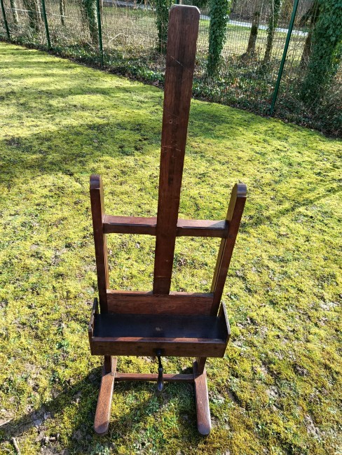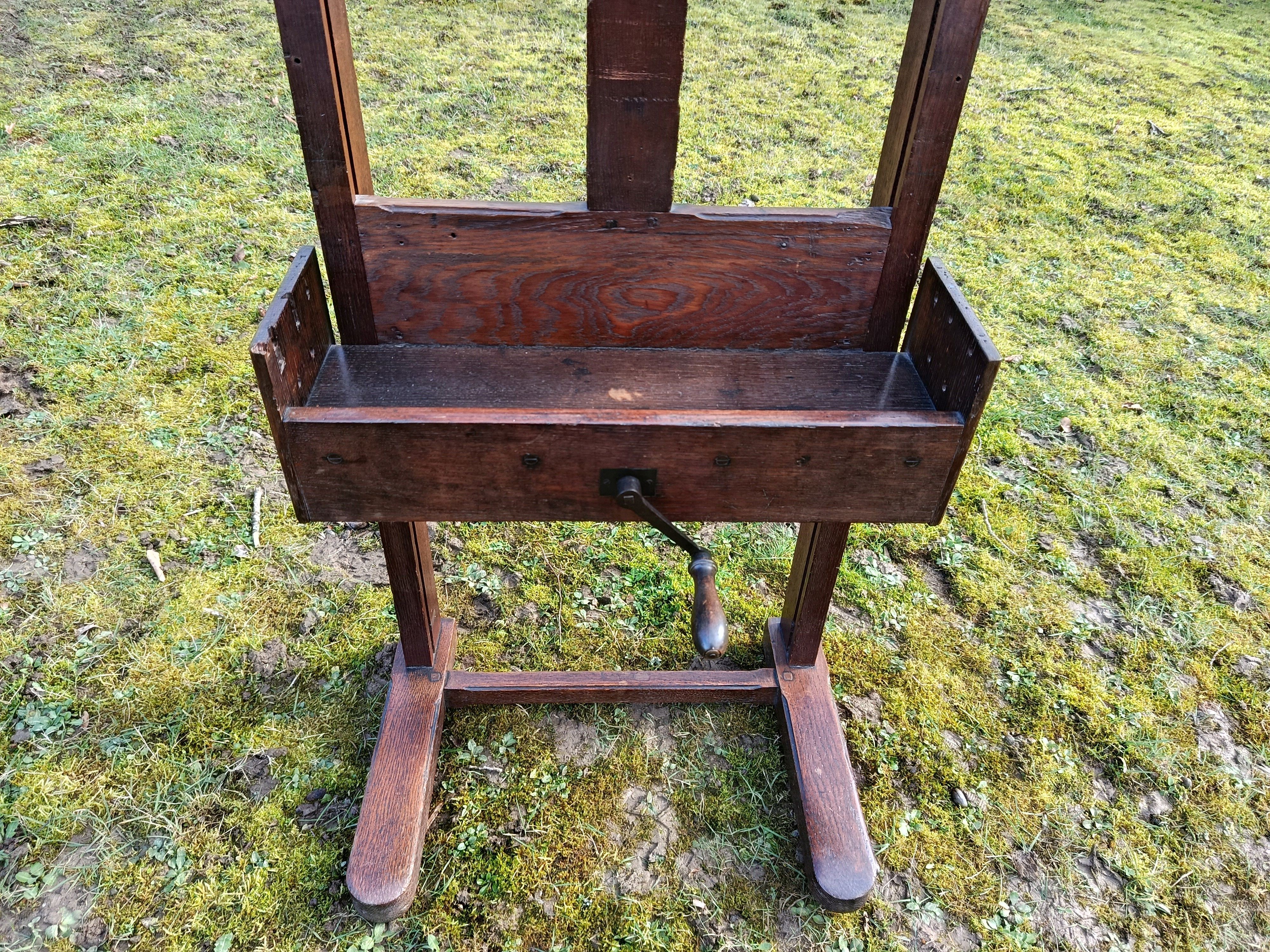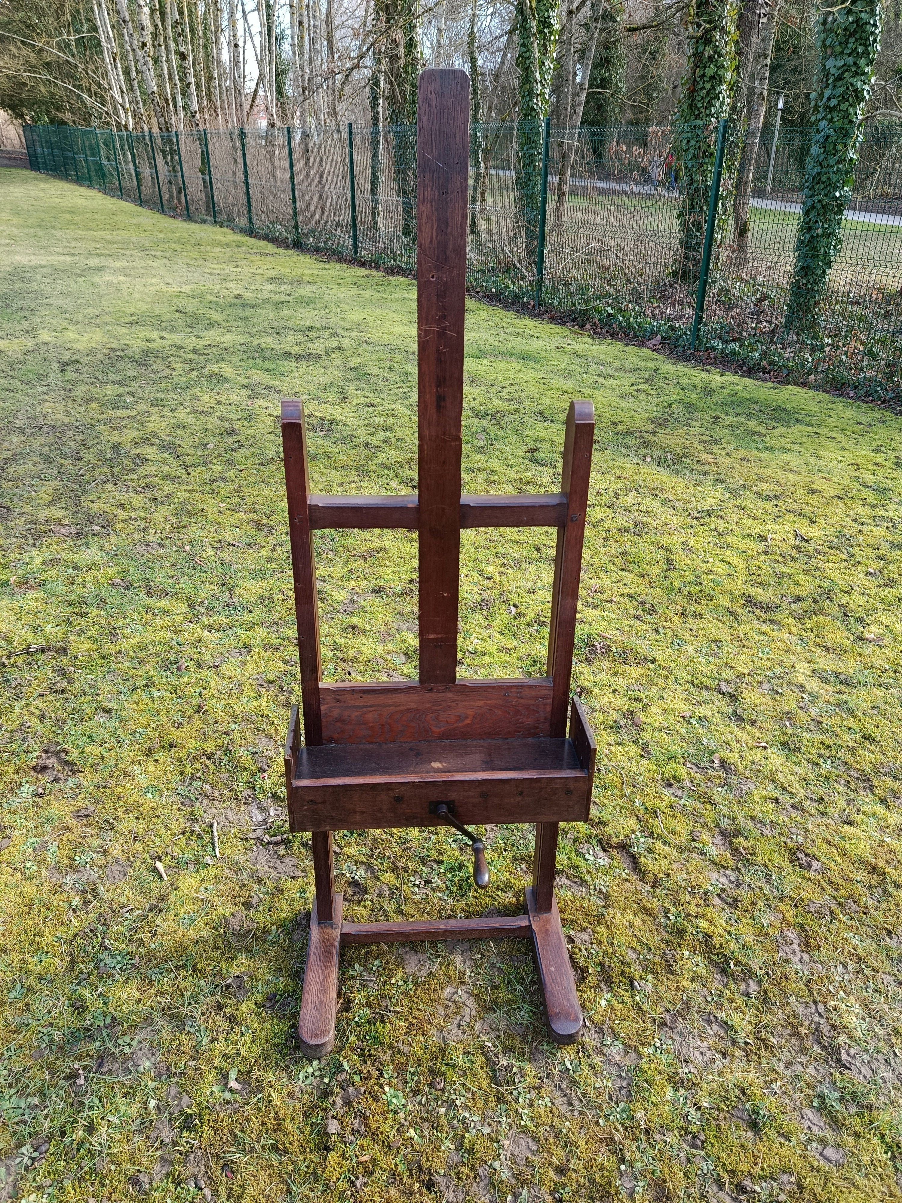 Très vieux chevalet en chêne avec système à crémaillère et réglable en hauteur par une manivelle , ce chevalet doit avoir un siècle d'existence - solide et en bon état - avec une gorge pour les peintures et pinceaux - le système de manivelle est très fluide et fonctionne à la perfection - roulettes d'origine sous les pieds