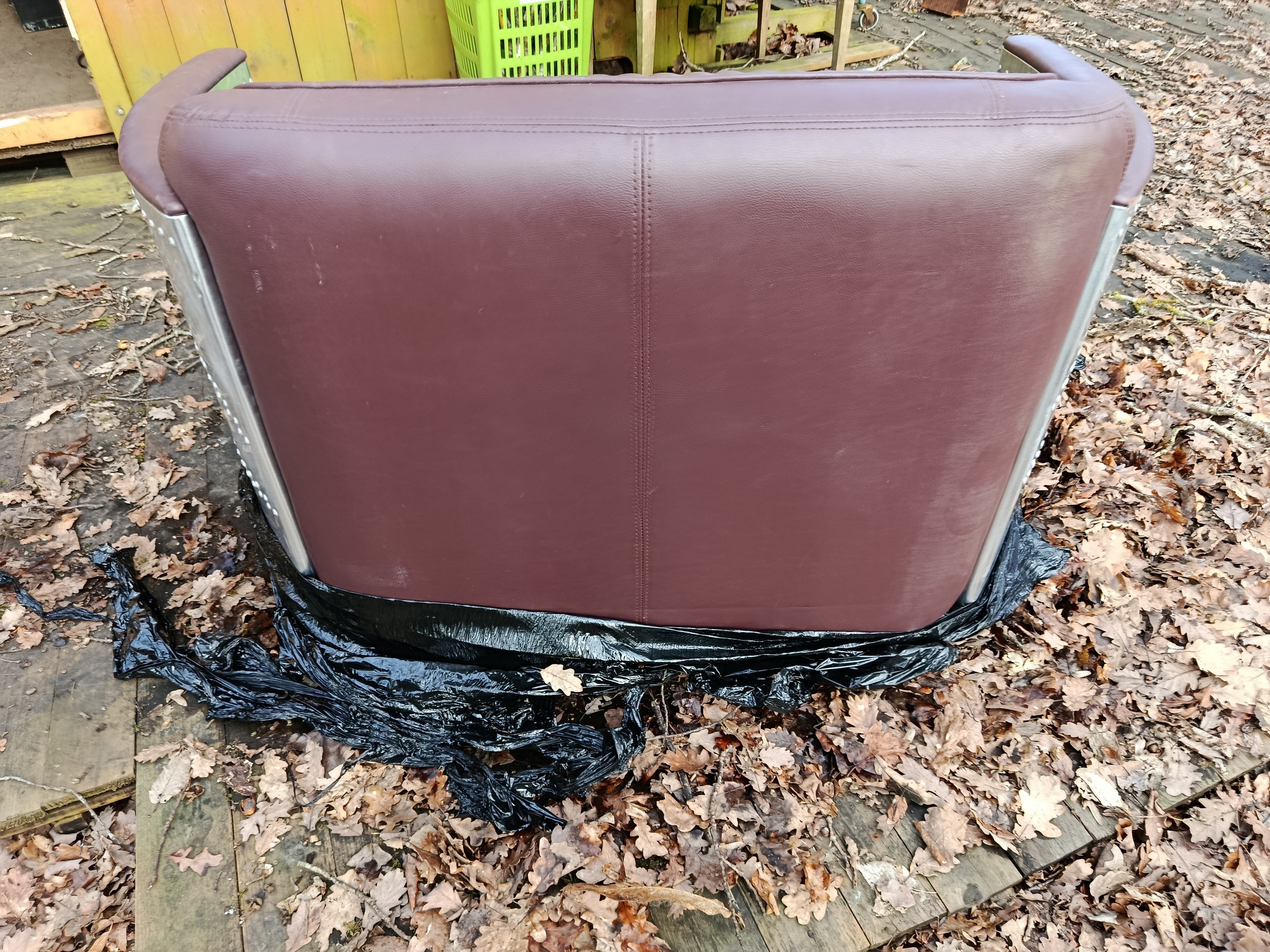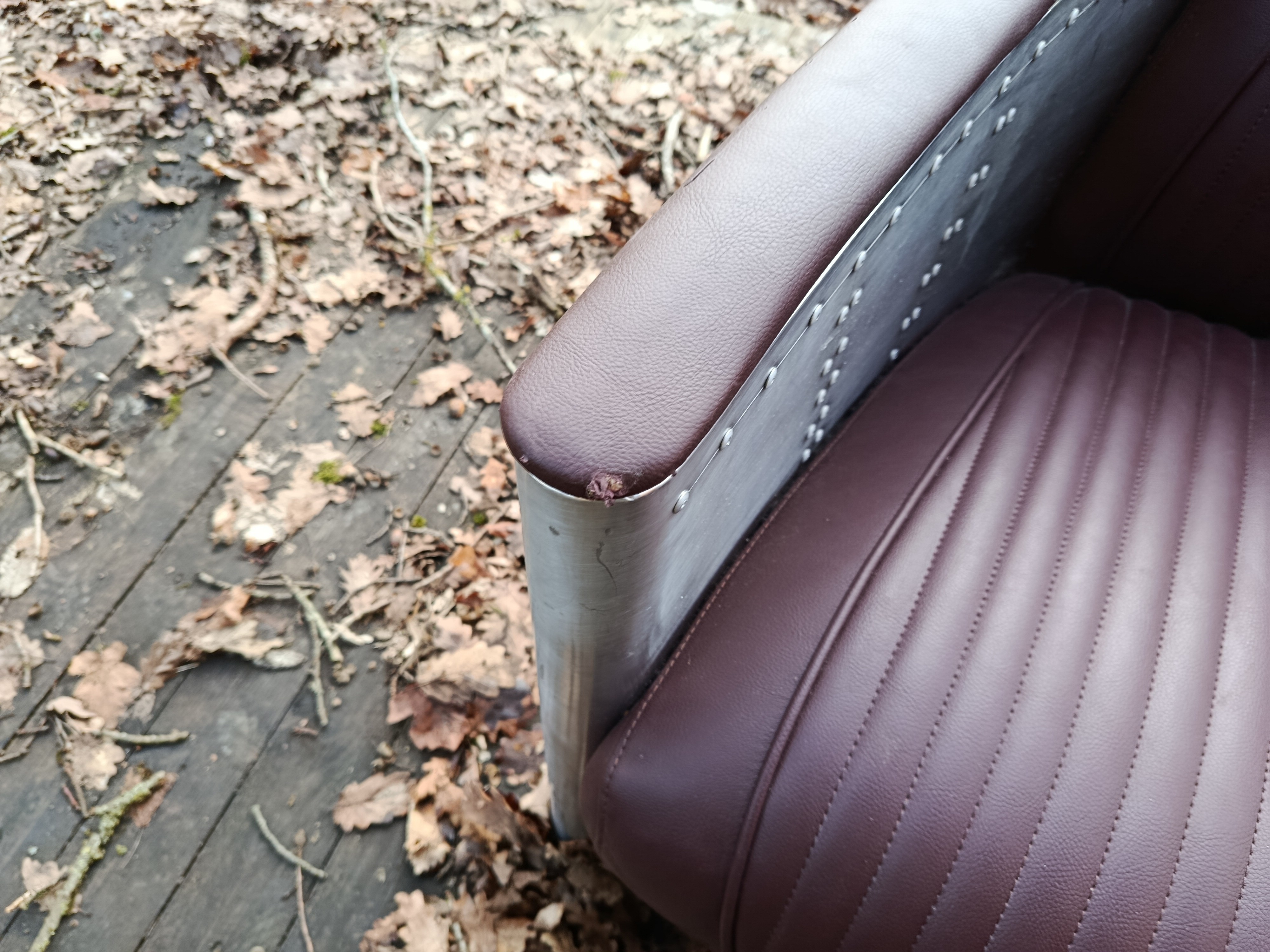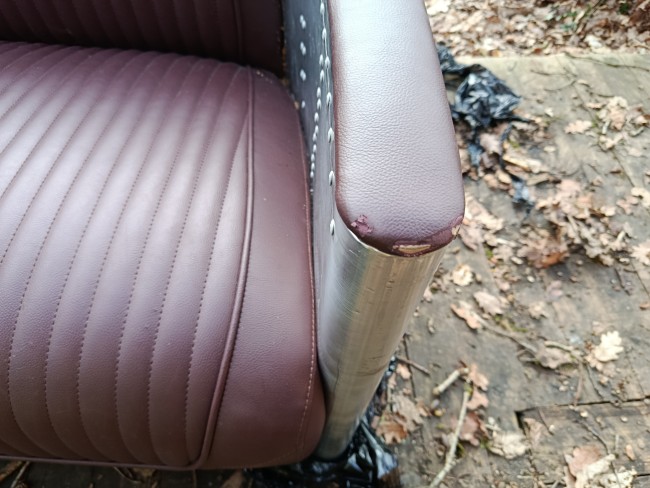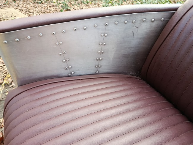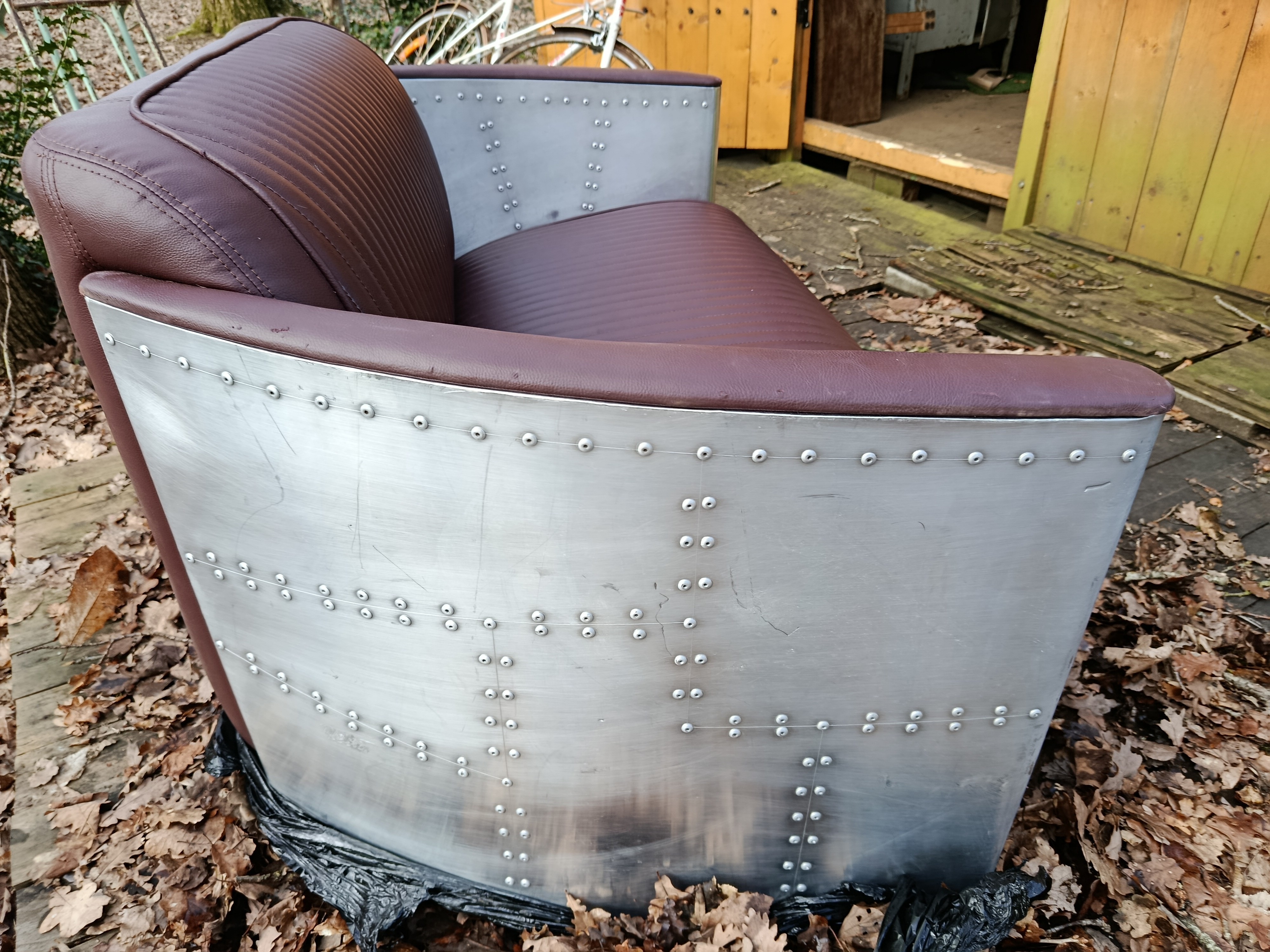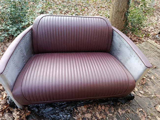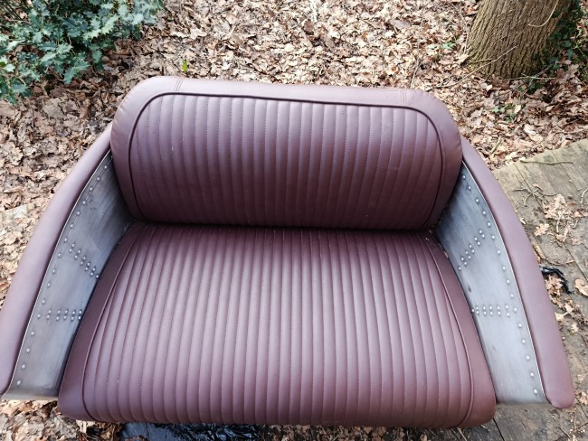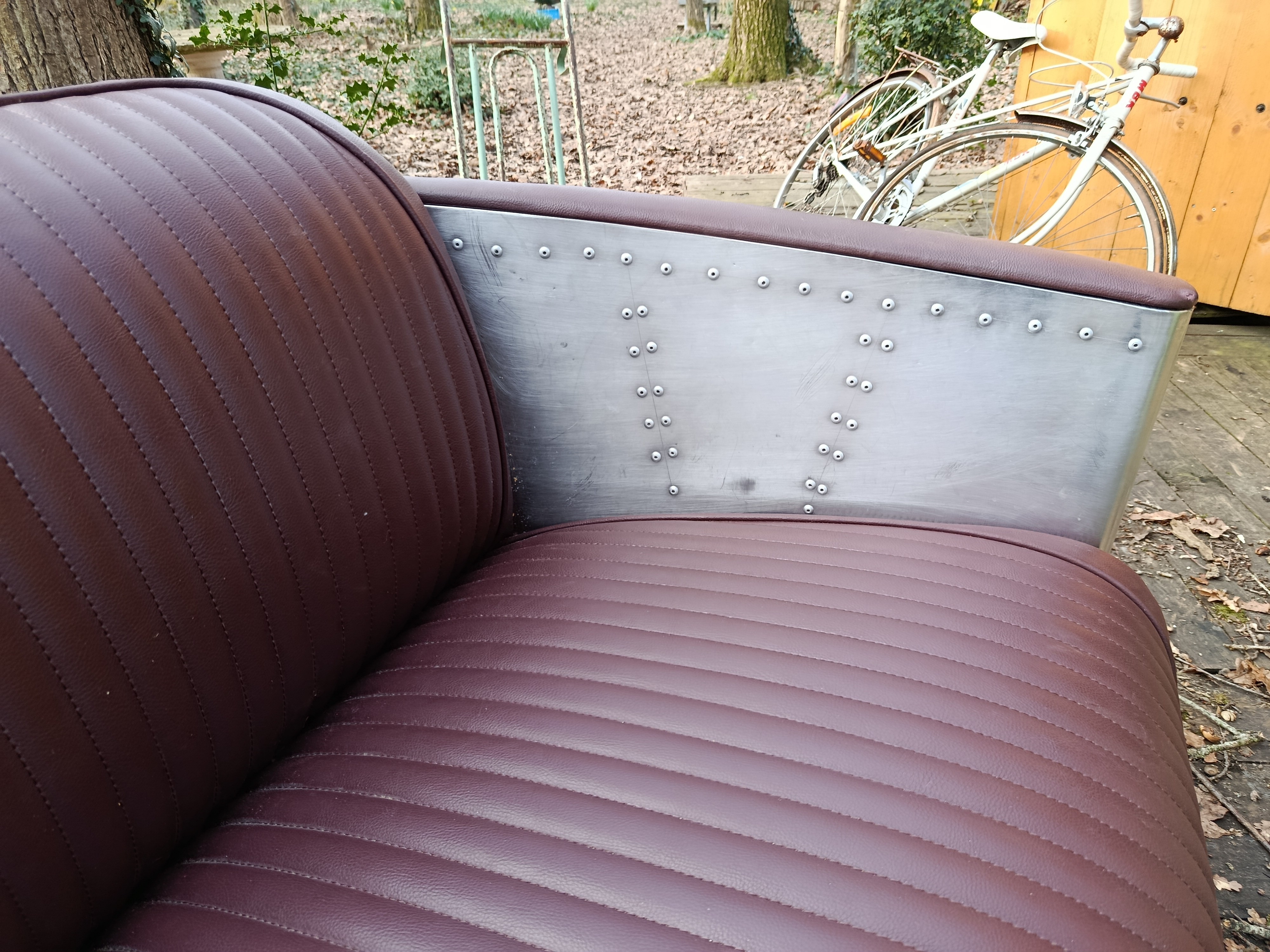 Canapé de belle facture des années 80/90 style aviateur en alu et cuir - il est dans un bel état si on accepte sur chaque bout de coudoirs quelques accrocs (d'où le prix) qui peuvent être rattrapé par une peinture ou une teinture de la m^me couleur que l'assise car c'est très petit et dessous c'est du bois... sinon tout est impeccable