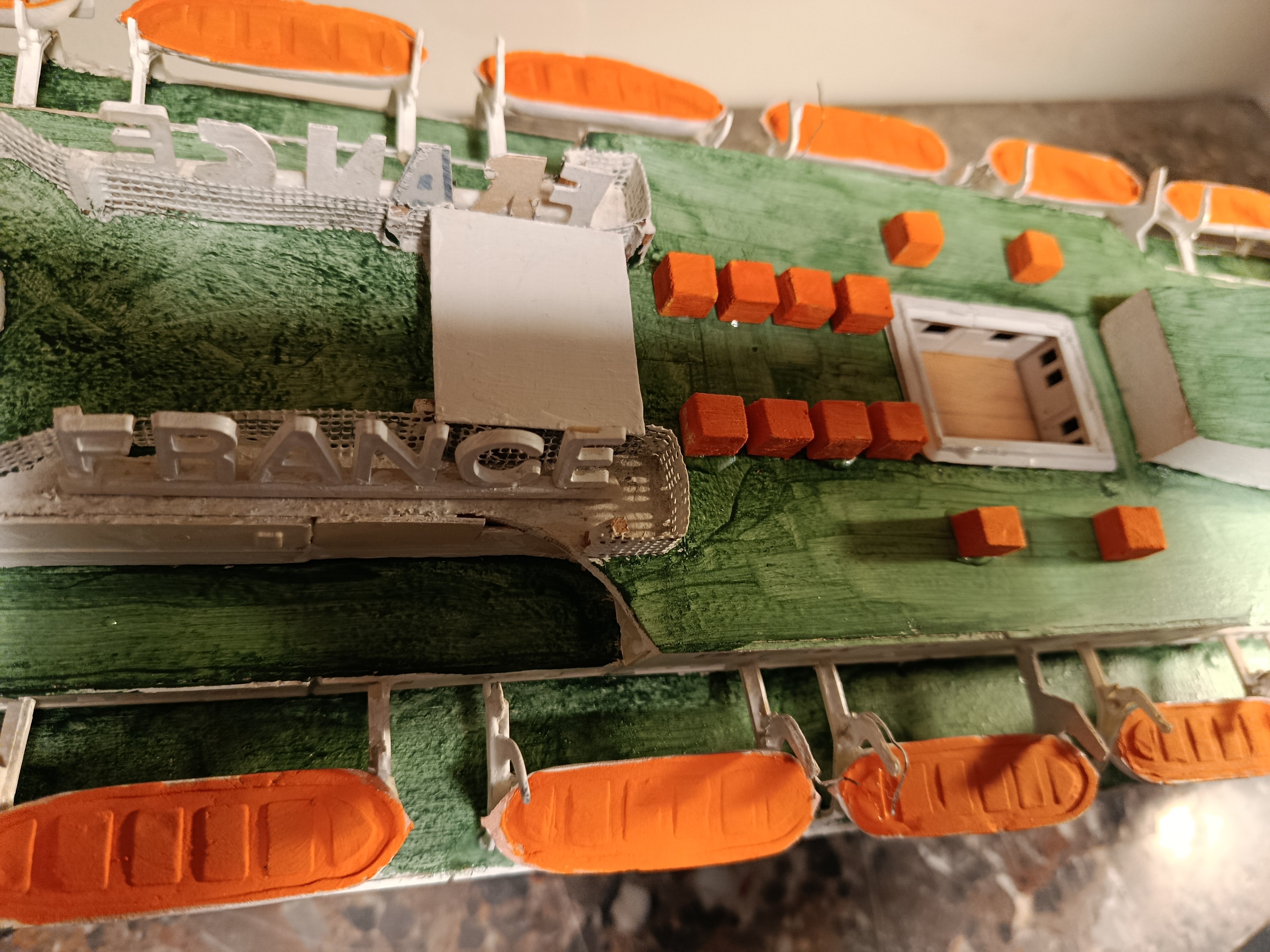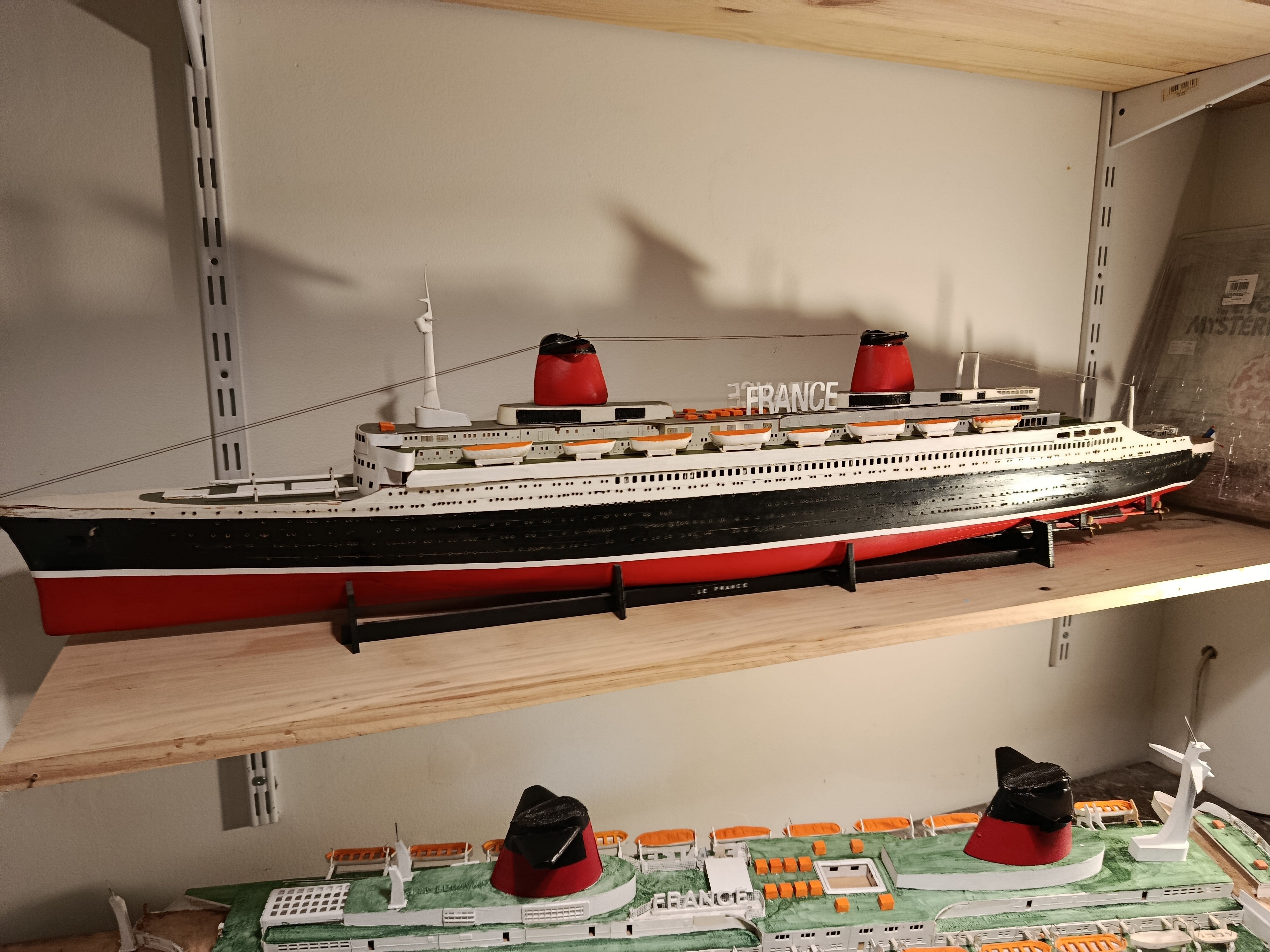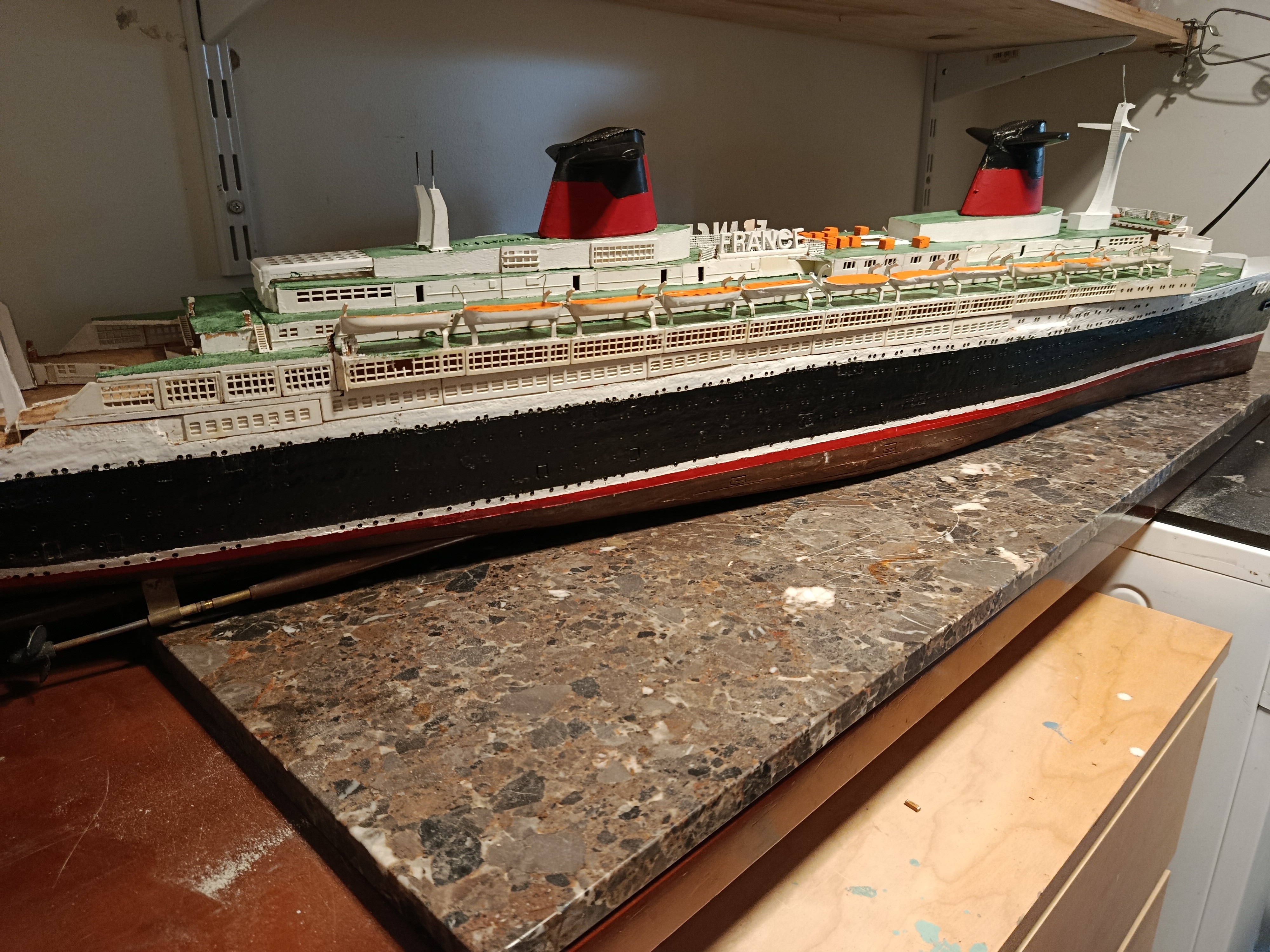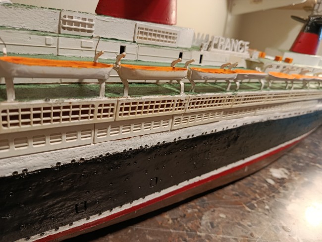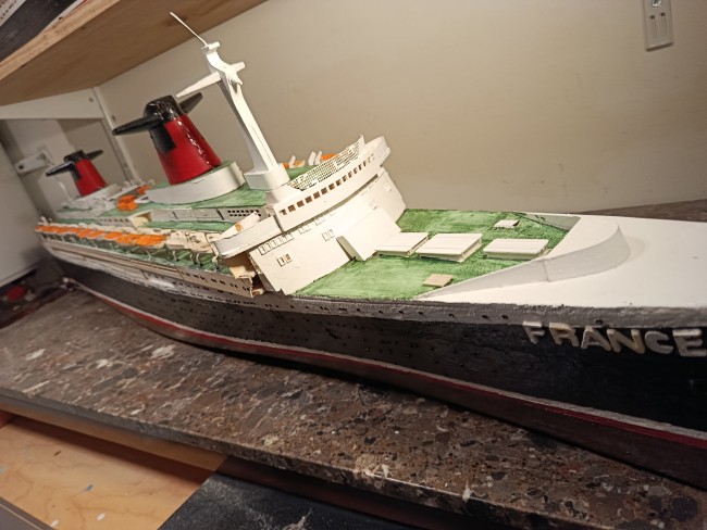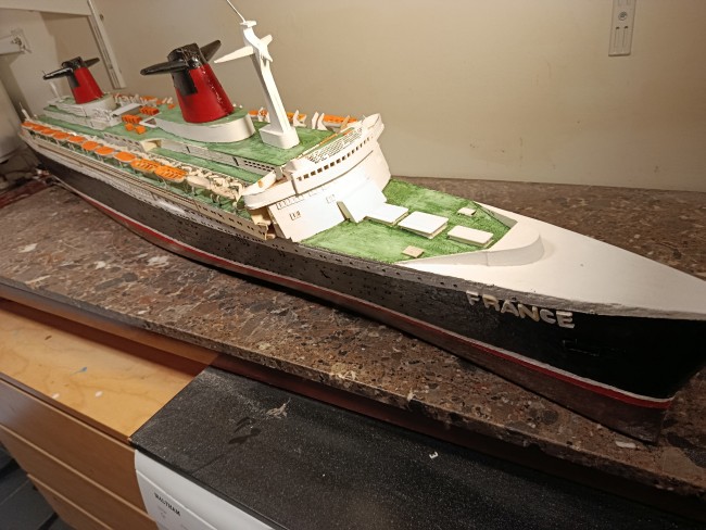 Grande maquette en bois, montée sur plan, du paquebot France - Dans cette dimension le produit est assez rare - il mesure 1M60 de long - pour le reste je laisse juger d'après les photos mais je peux répondre avec plaisir à toutes questions
