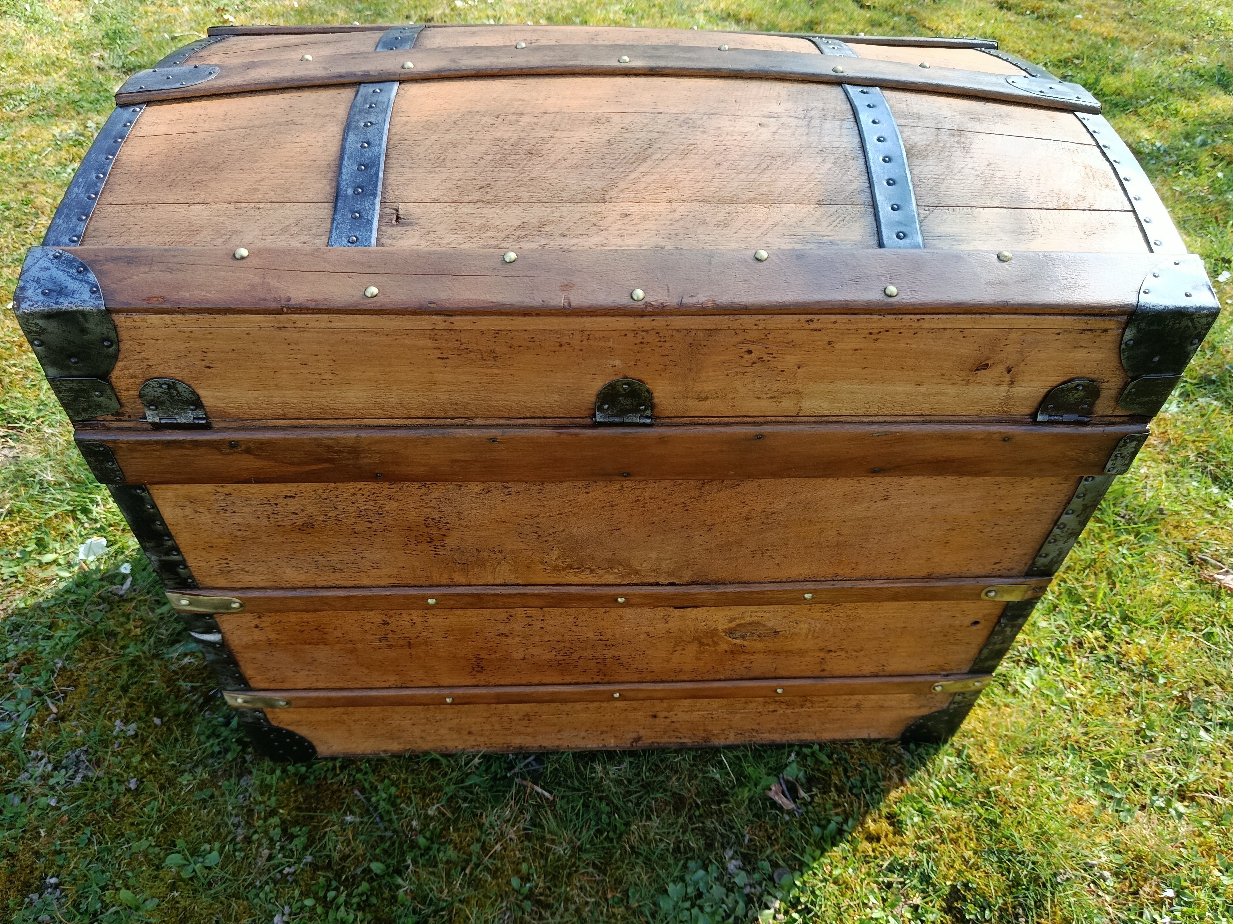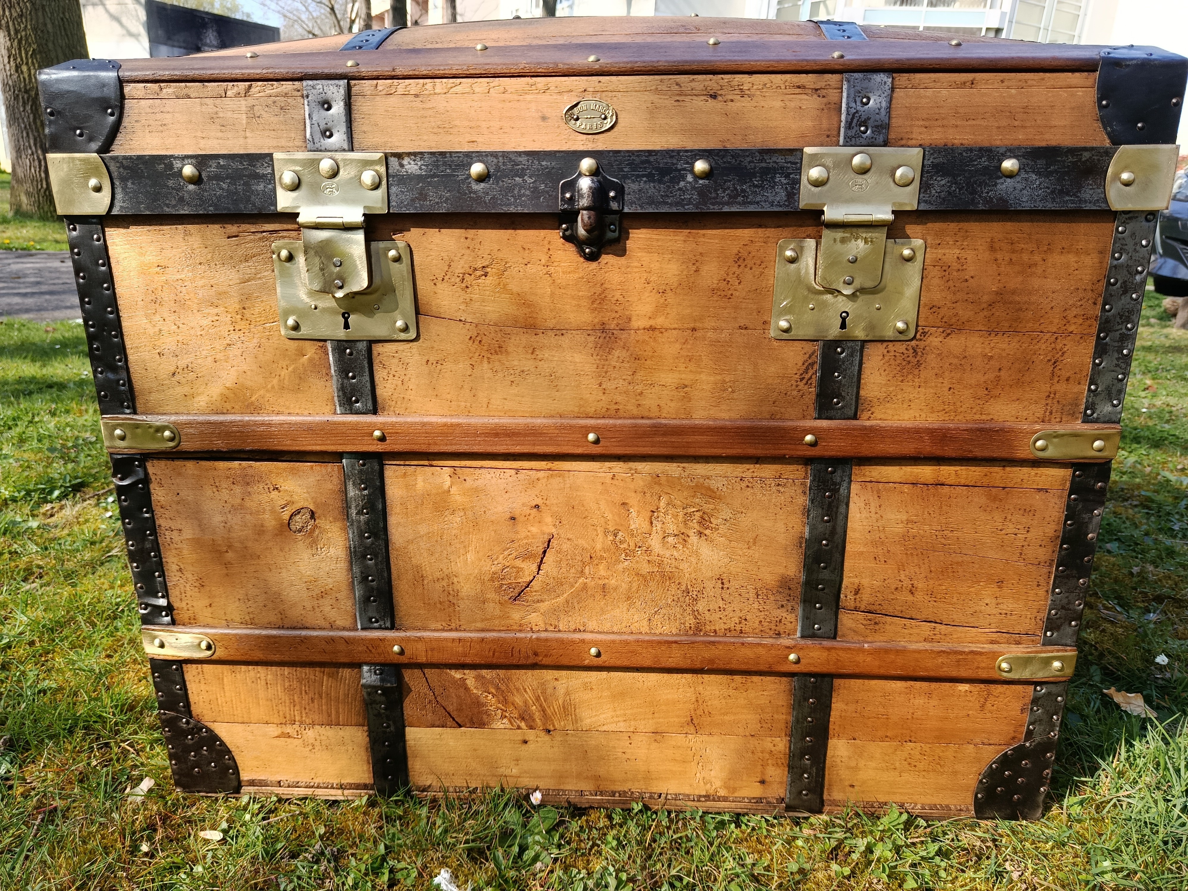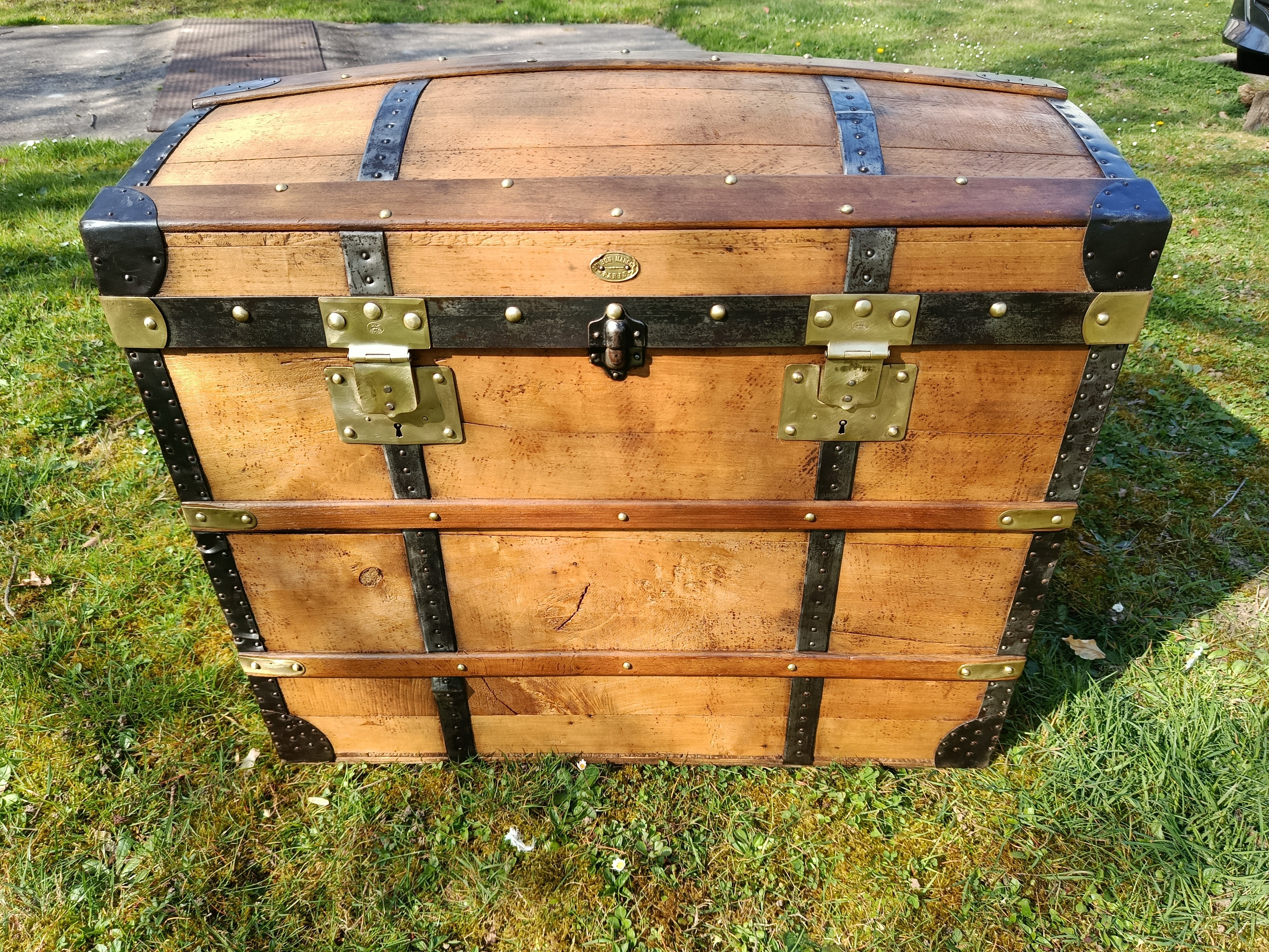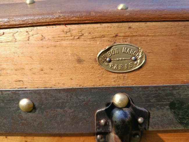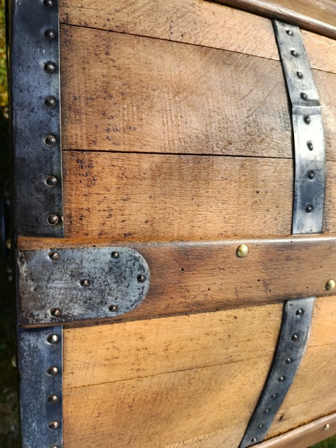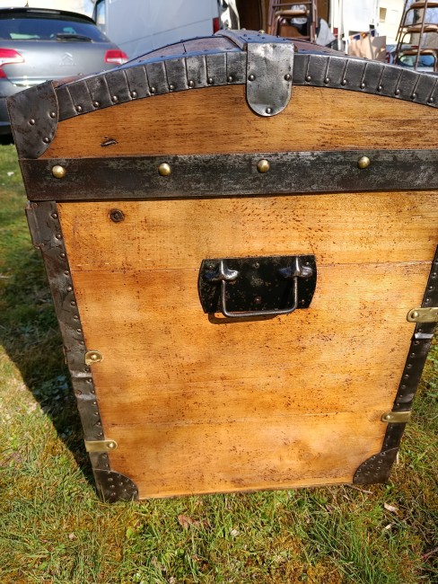 Patine exceptionnelle pour cette malle de 1880 - elle était destinée aux voyages par transport malle poste - beau galbe du capot - hêtre et peuplier massif - les ferrures sont brossées et cirées - belle contenance - grande solidité - se marie avec tous les styles d'intérieur