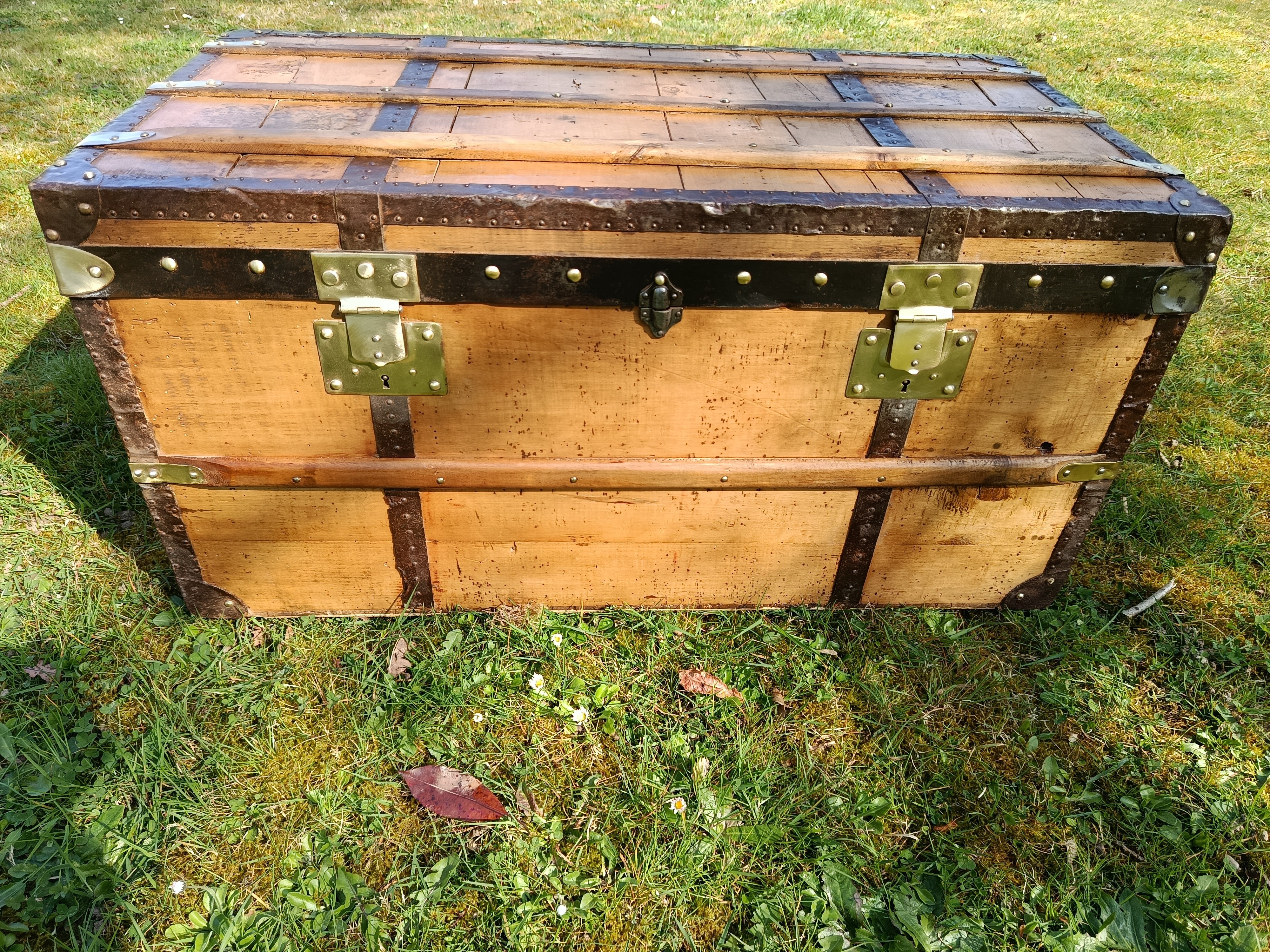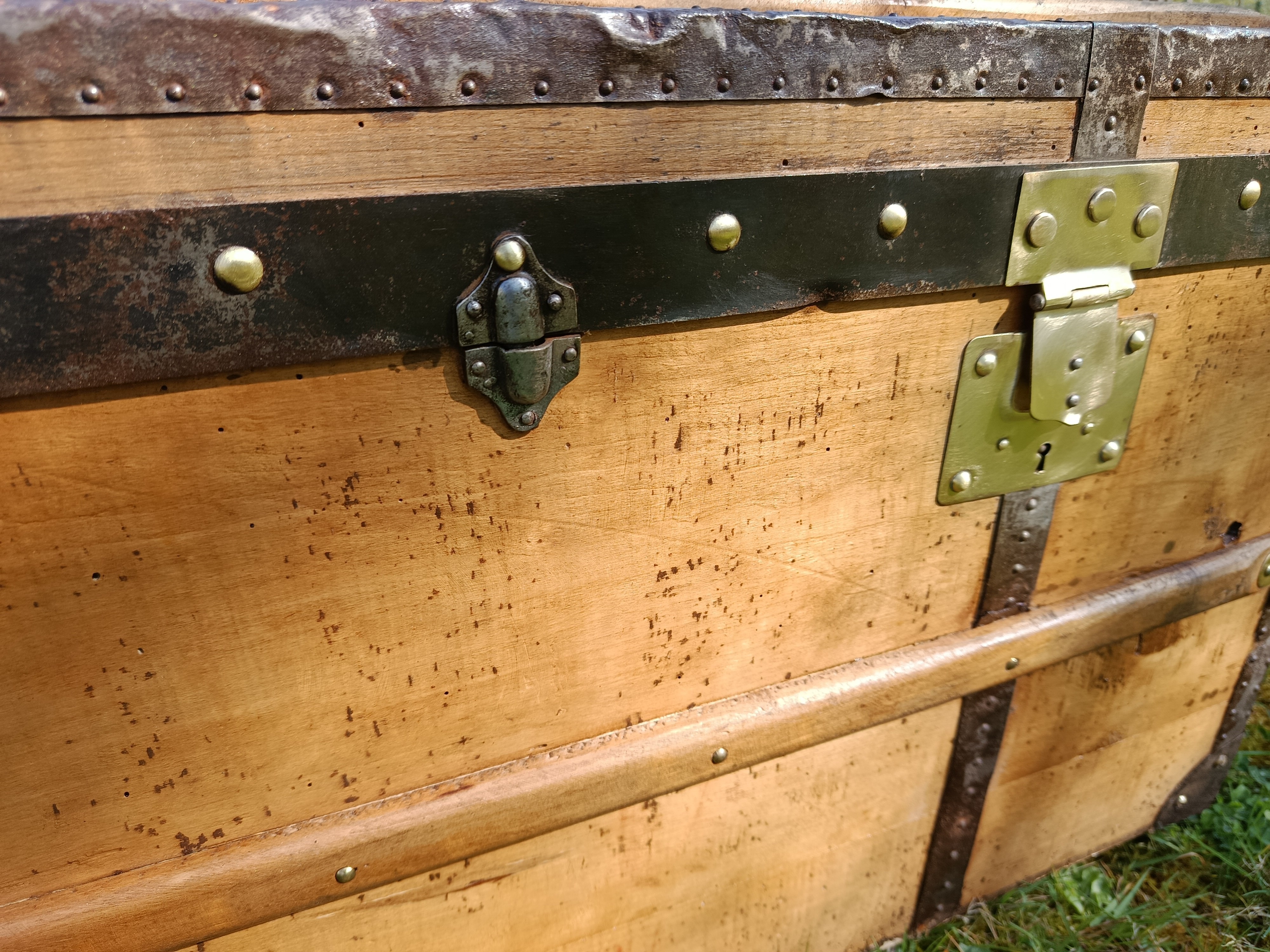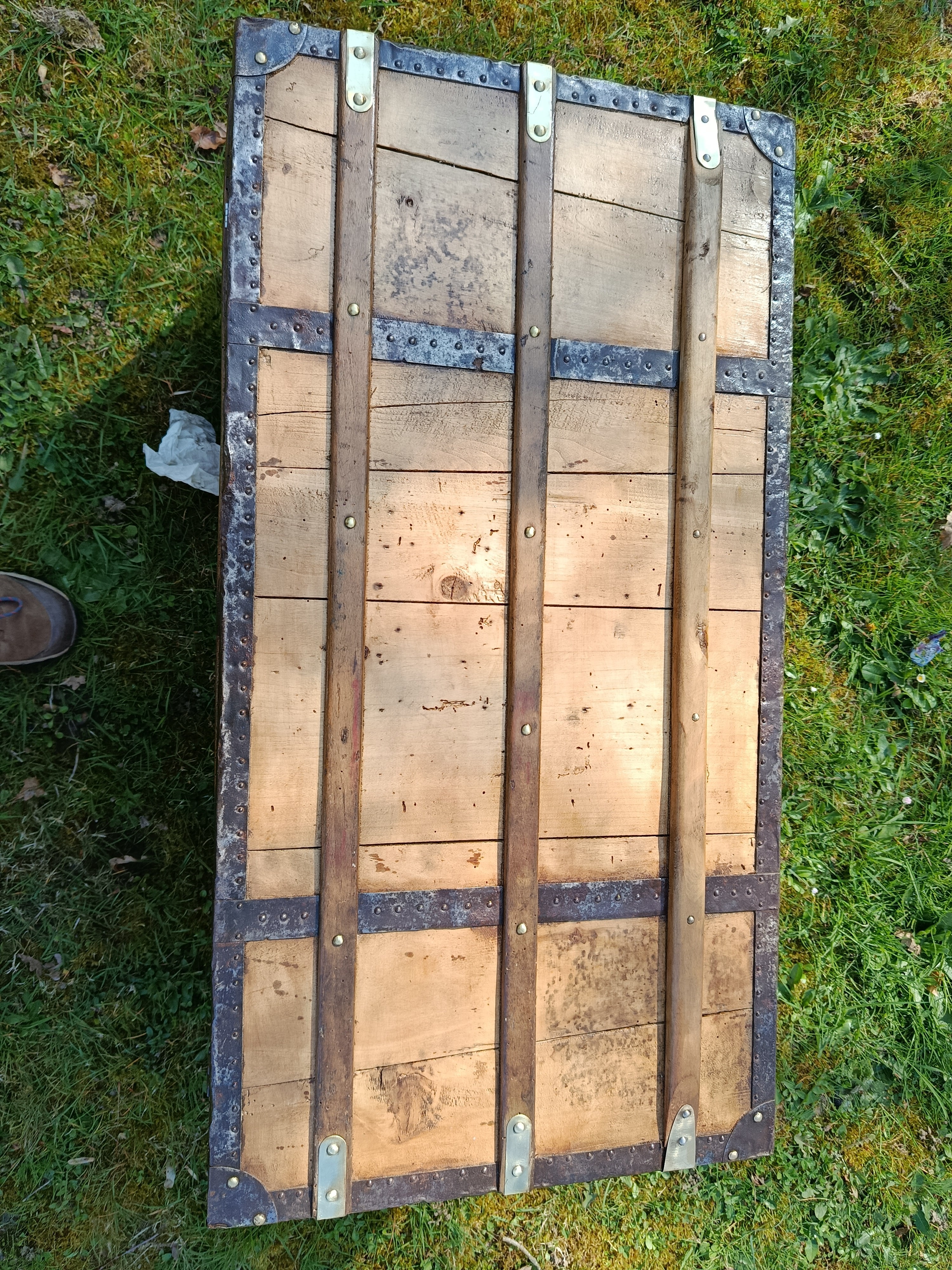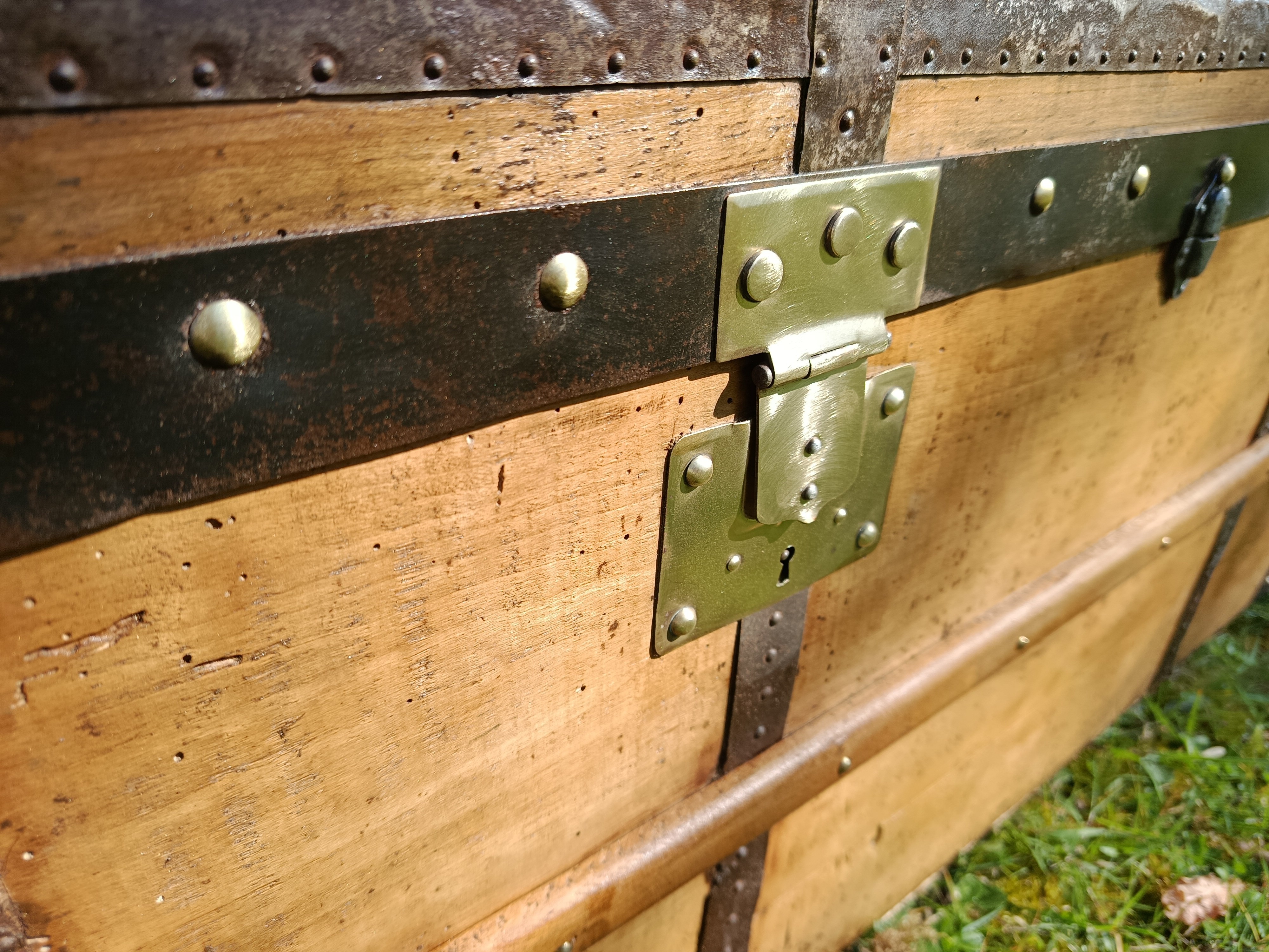 Malle transatlantique en bois de peuplier et hêtre - pratique et très déco - idéale pour rangement du linge - collections - bouteilles - peut être adaptée en bar - table basse ou bout de lit - cette malle est faite de matériaux nobles - bois massif - ferrures brosses et cirées - laiton - cuir