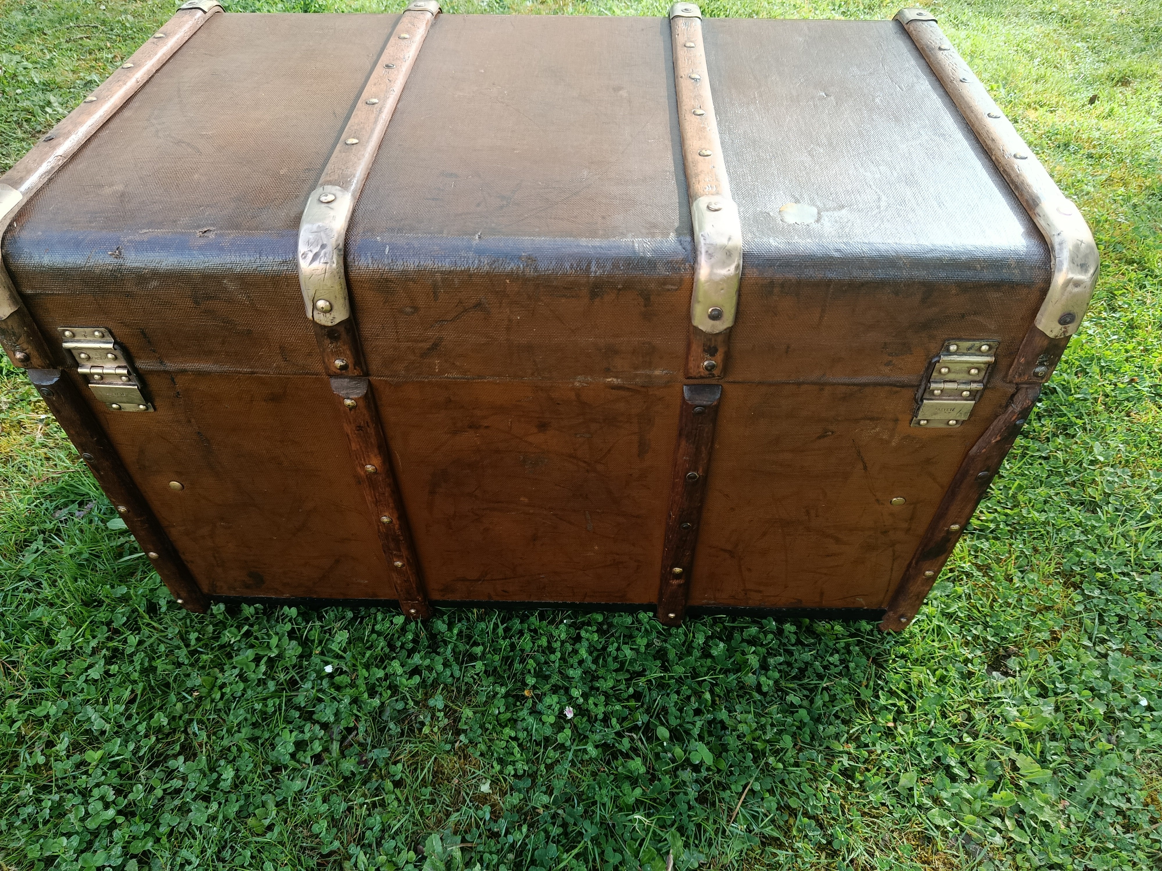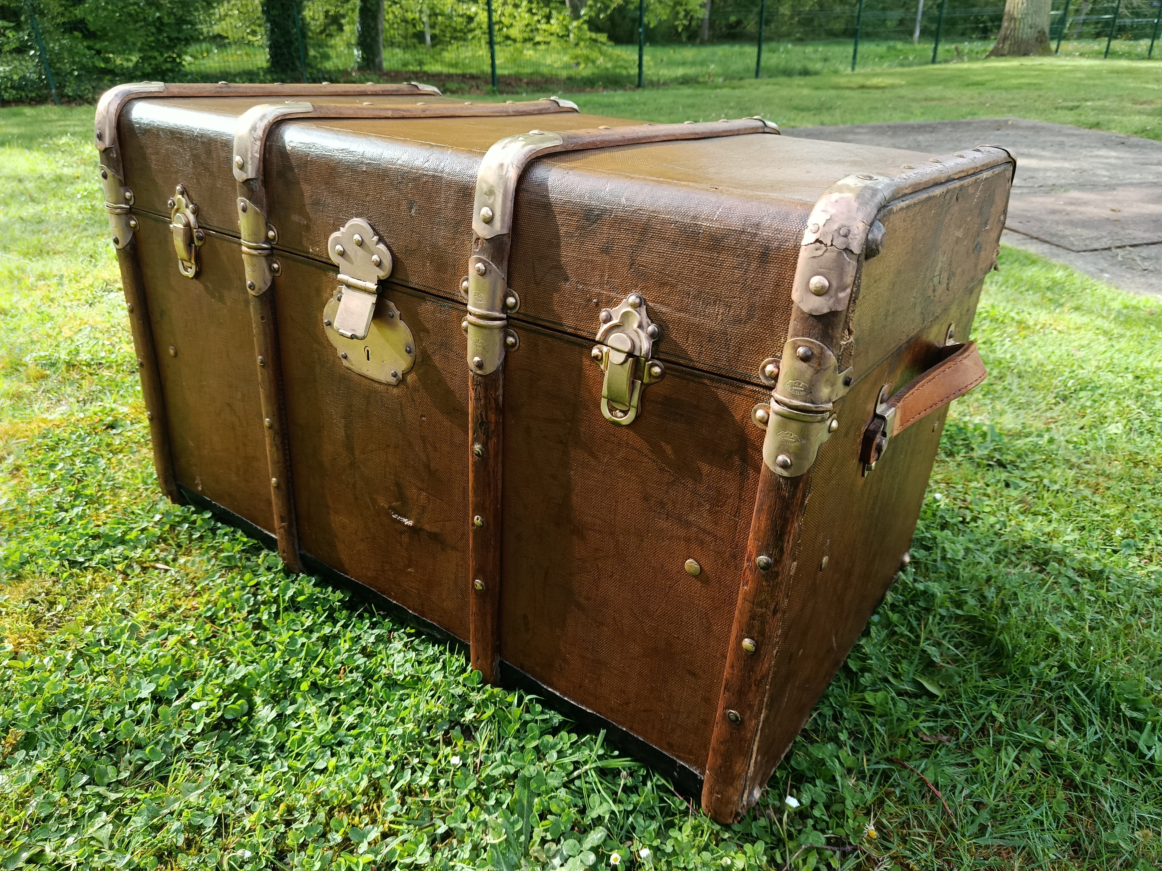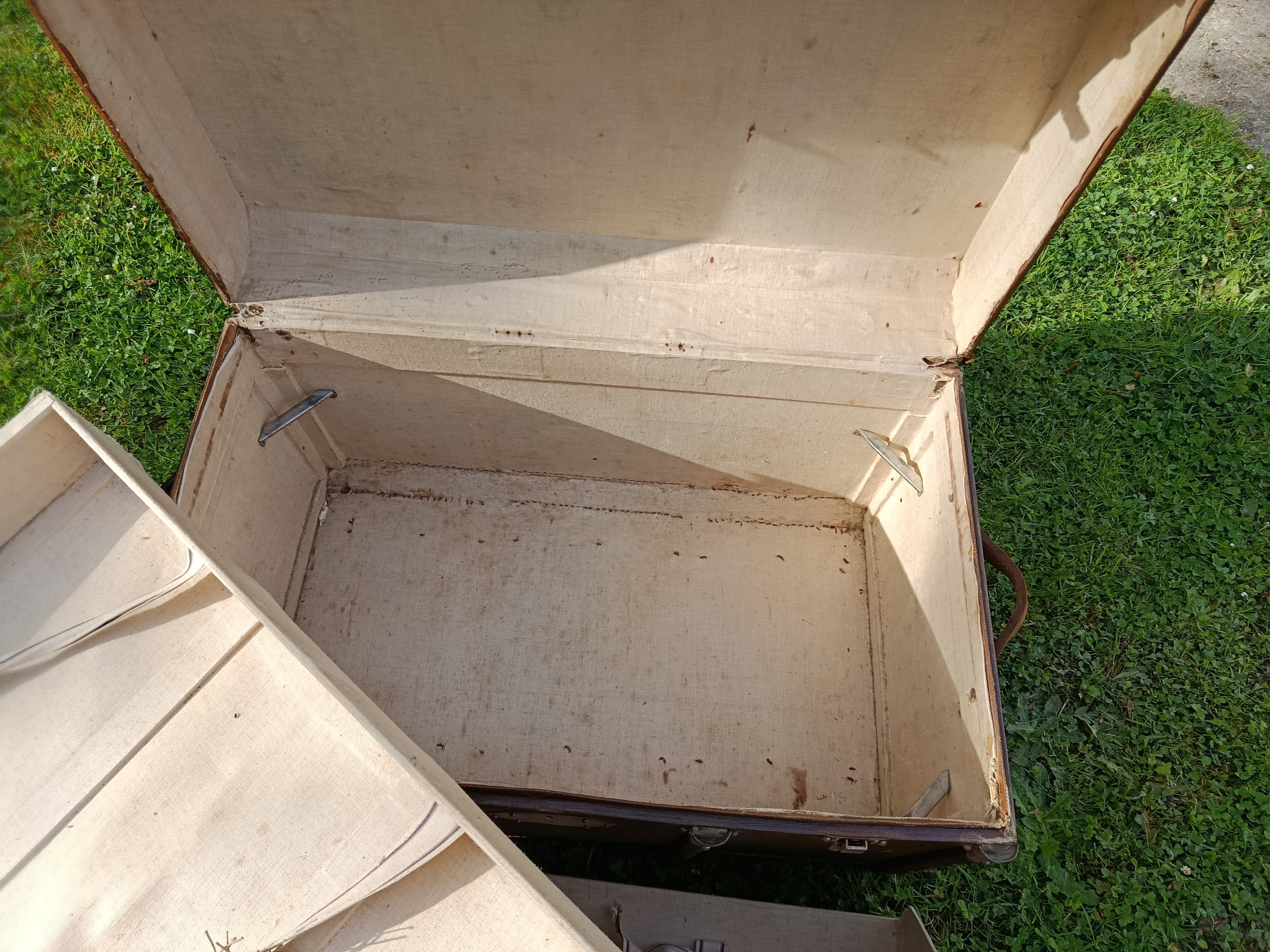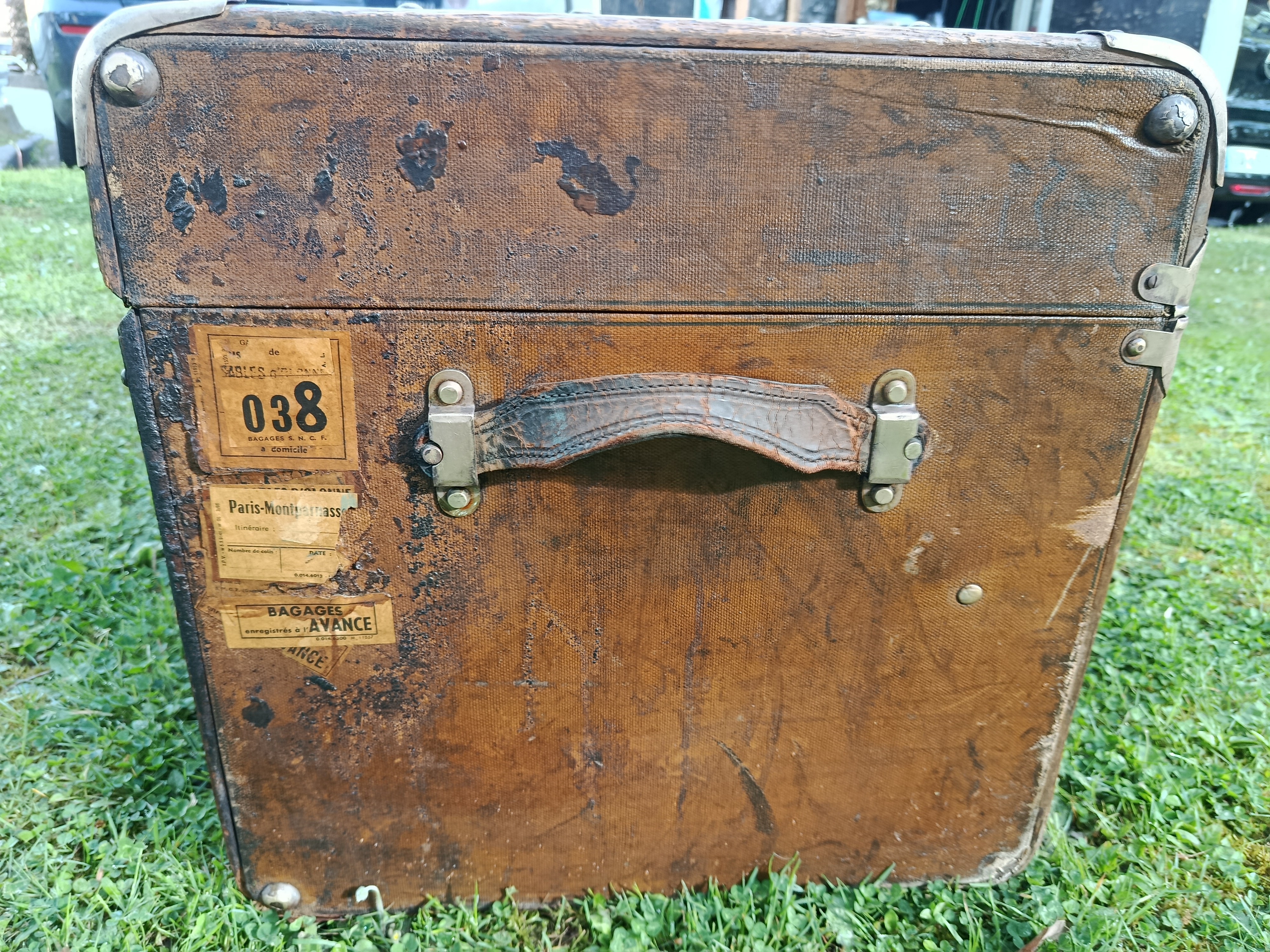 Malle courrier des années 30 - cintrage en hêtre - fût en peuplier - revêtement vulcanisé marron - d'origine mais rafraichi - intérieur avec double chassis en tissu - bel état - la malle à sa clef -