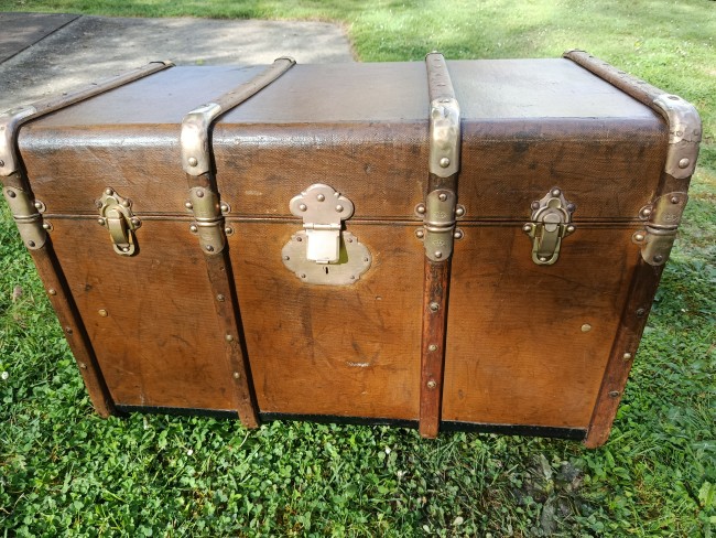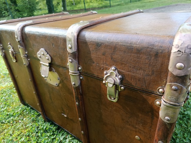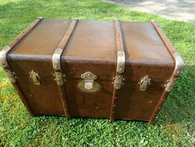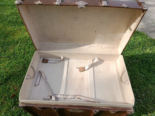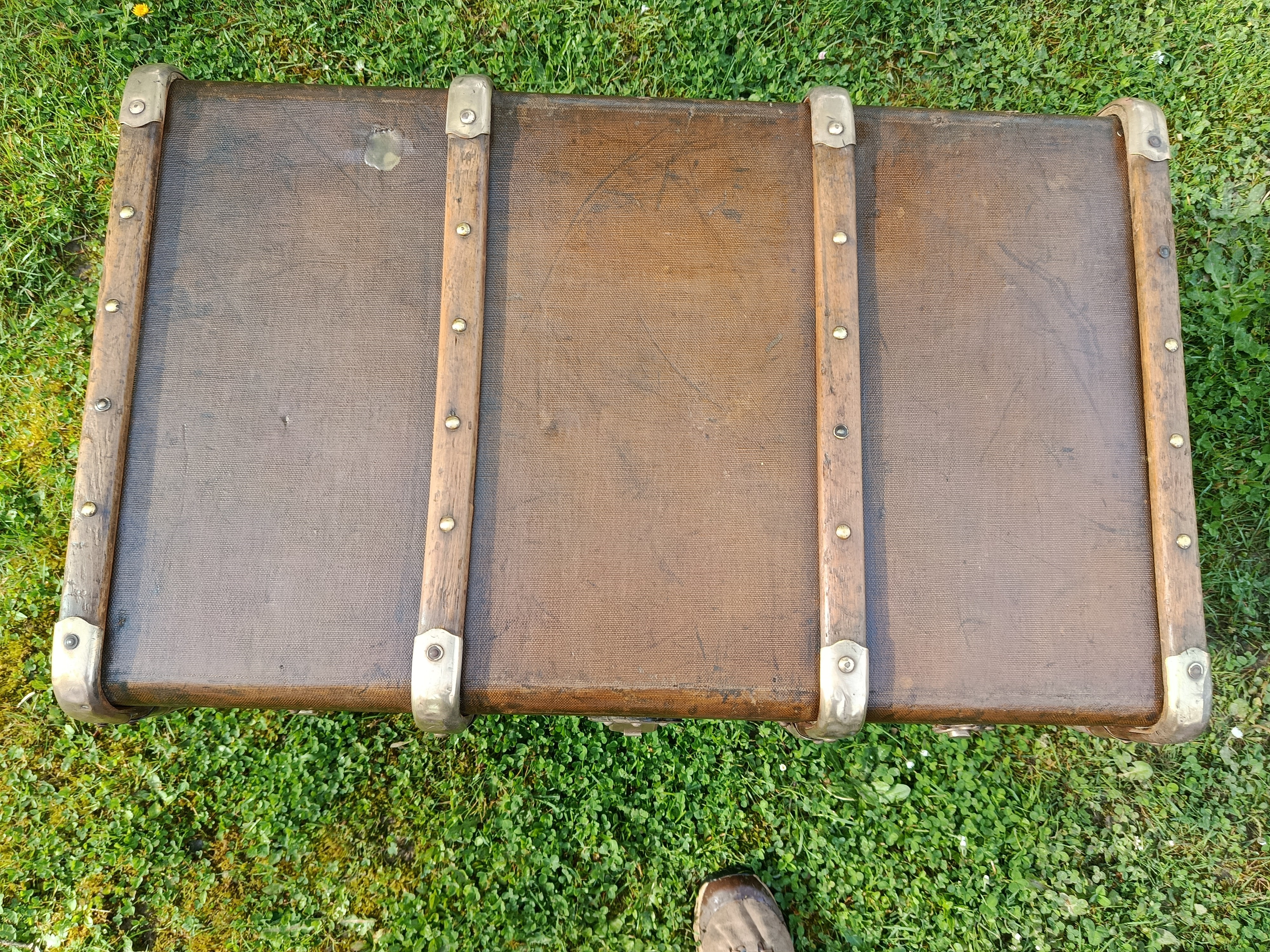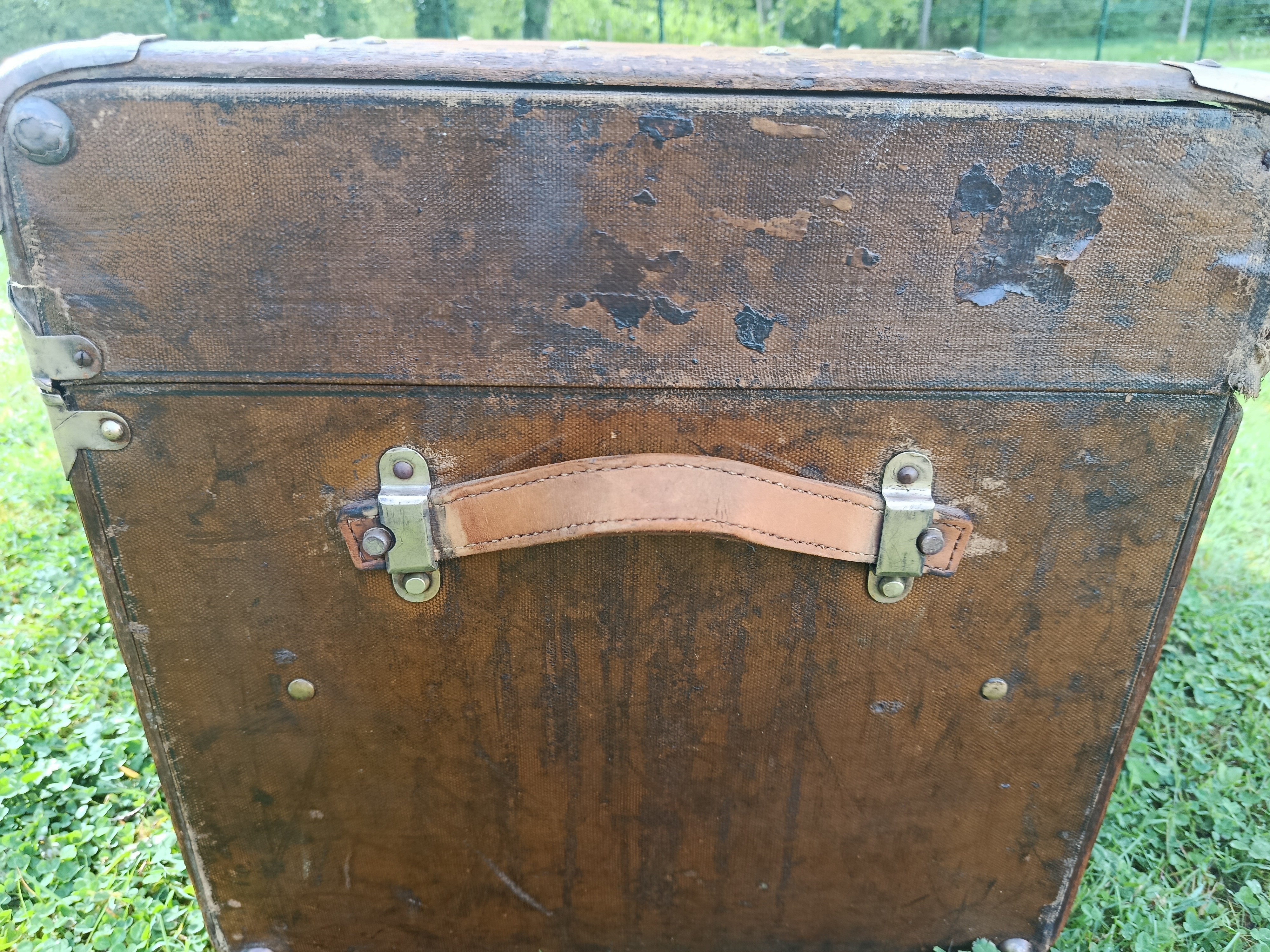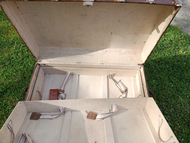 Malle courrier des années 30 - cintrage en hêtre - fût en peuplier - revêtement vulcanisé marron - d'origine mais rafraichi - intérieur avec double chassis en tissu - bel état - la malle à sa clef -