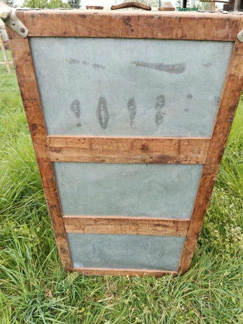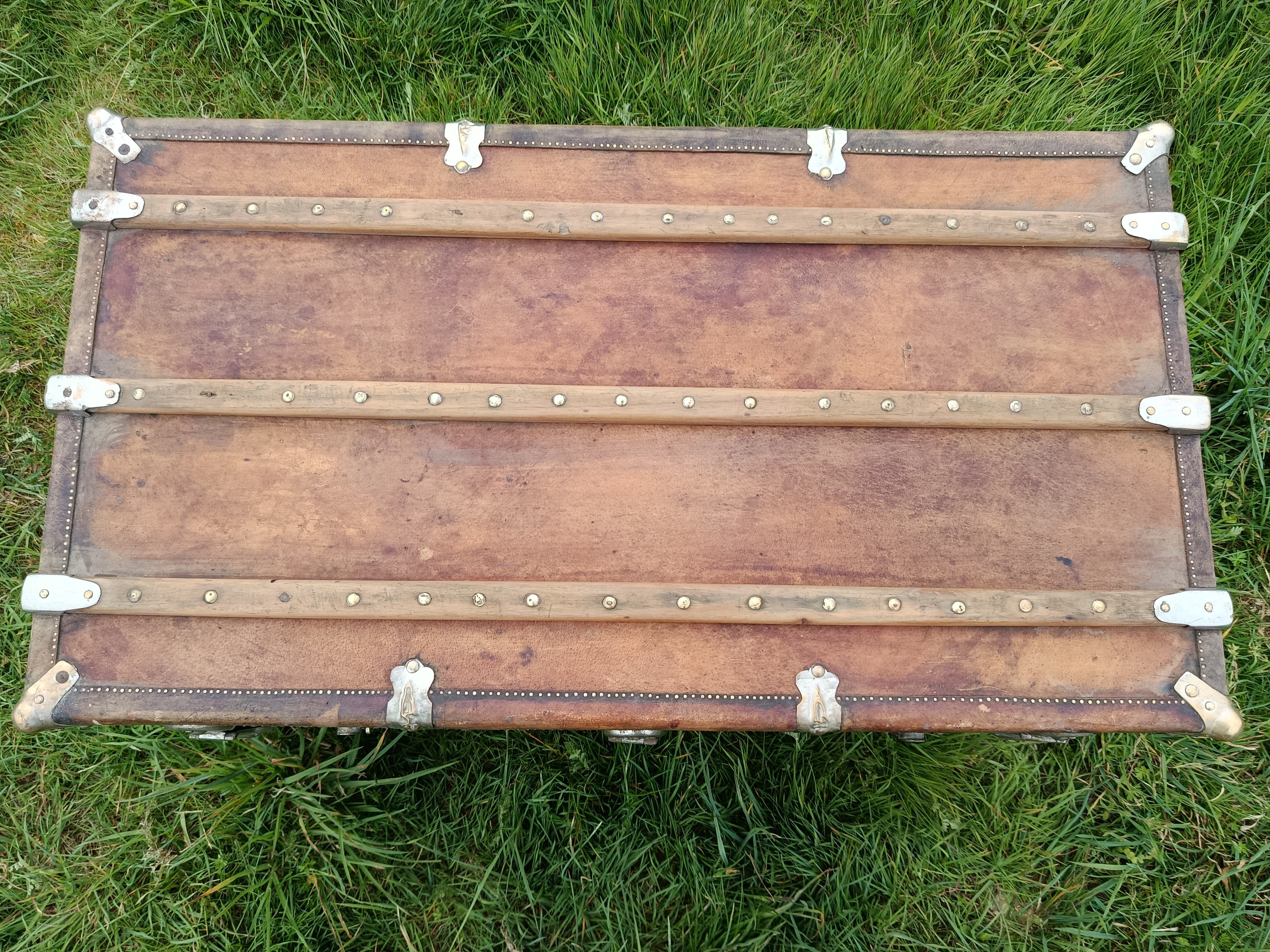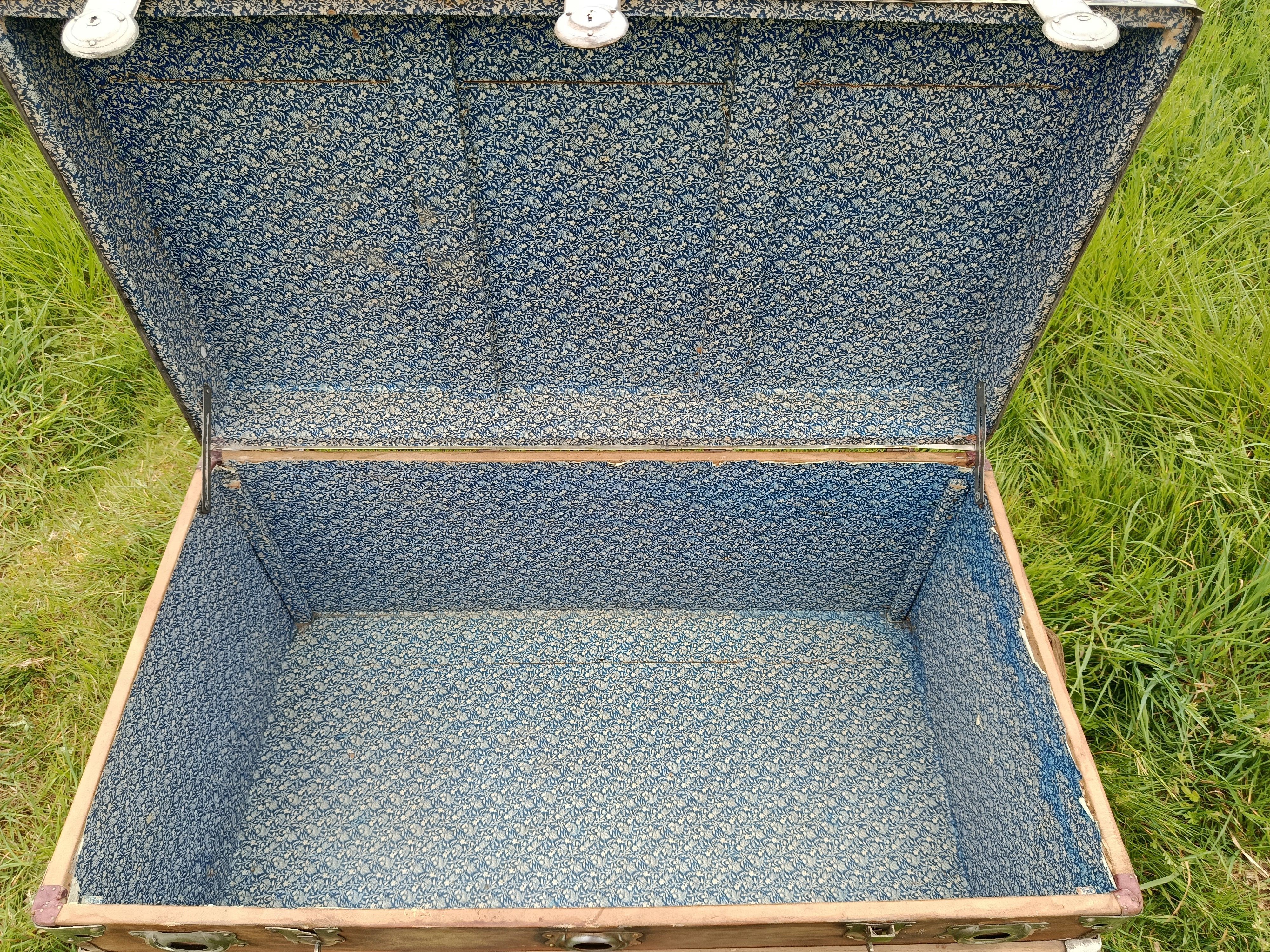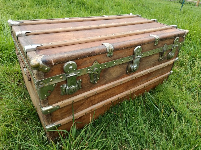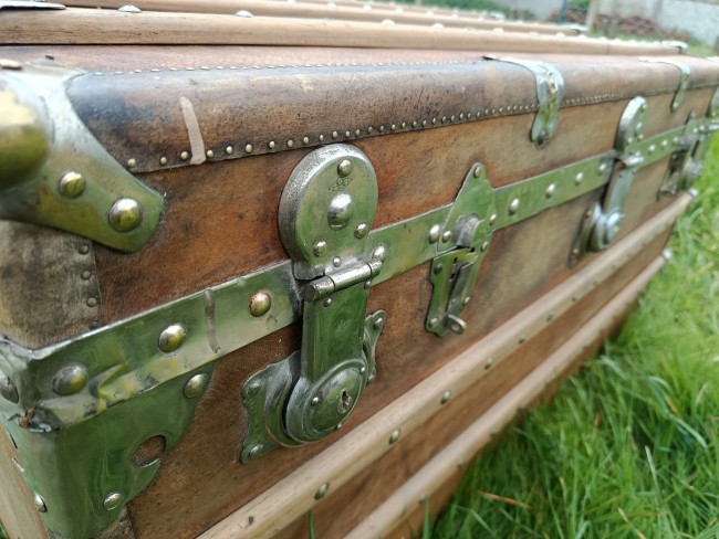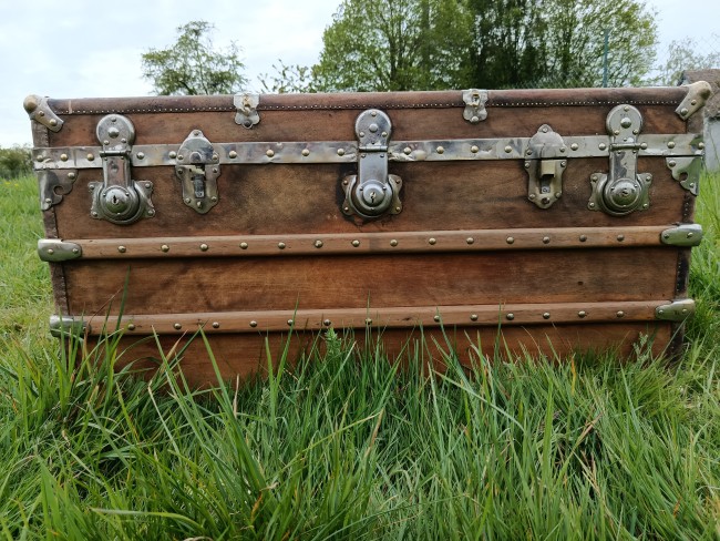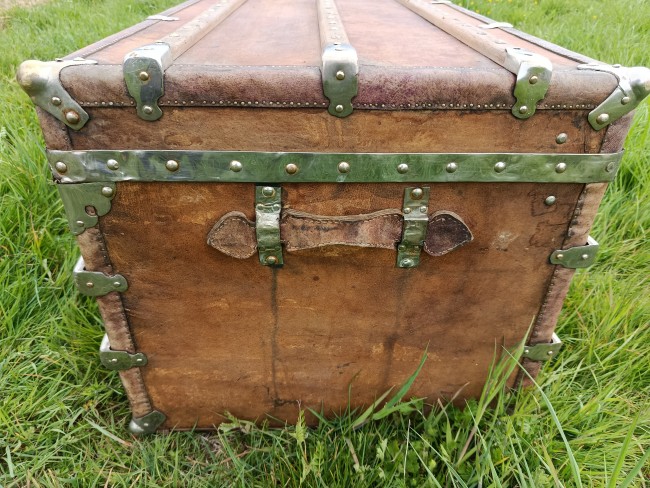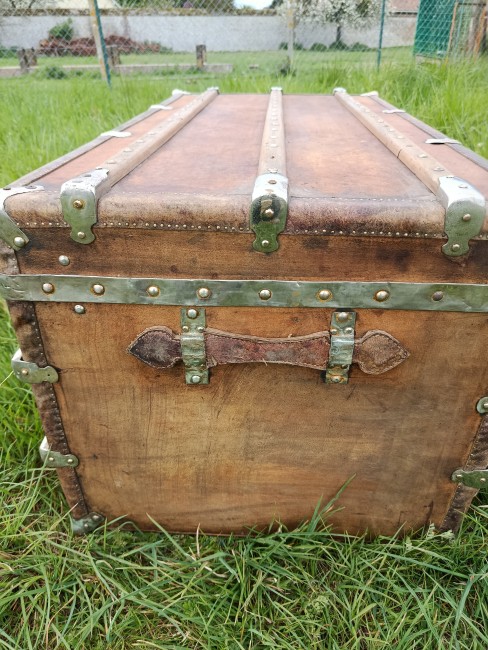 Malle de belle capacité de grande qualité - faite de matériaux nobles - bois de camphrier - revêtement en peau cuivrée - cintrage camphrier - bijouterie et fermoirs aliage bronze et laiton nickelé - poignées en cuir - chassis amovible et tissu intérieur - idéale pour une belle table basse - de salon - bar - bout de lit - rangement de linge de maison - cette malle a appartenu à un Commandant de la coloniale - il avait toute une batterie de belles malles pour le rangement de ses effets lors de ses voyages au long cours (voir mes autres annonces) - malle de très belle qualité - très solide et de belle contenance