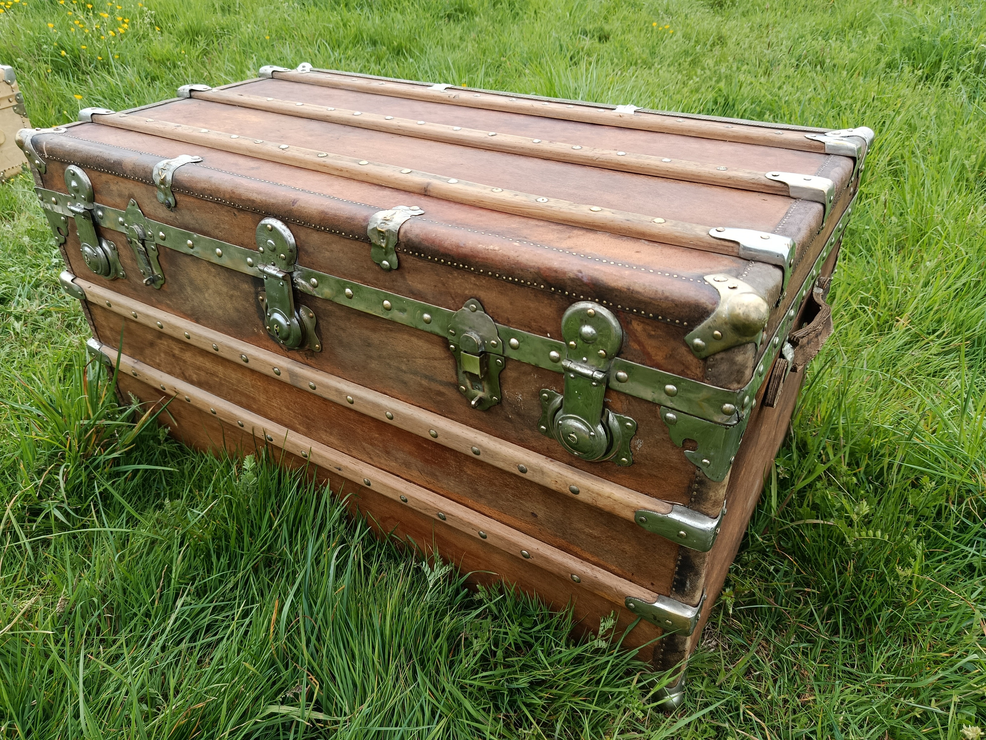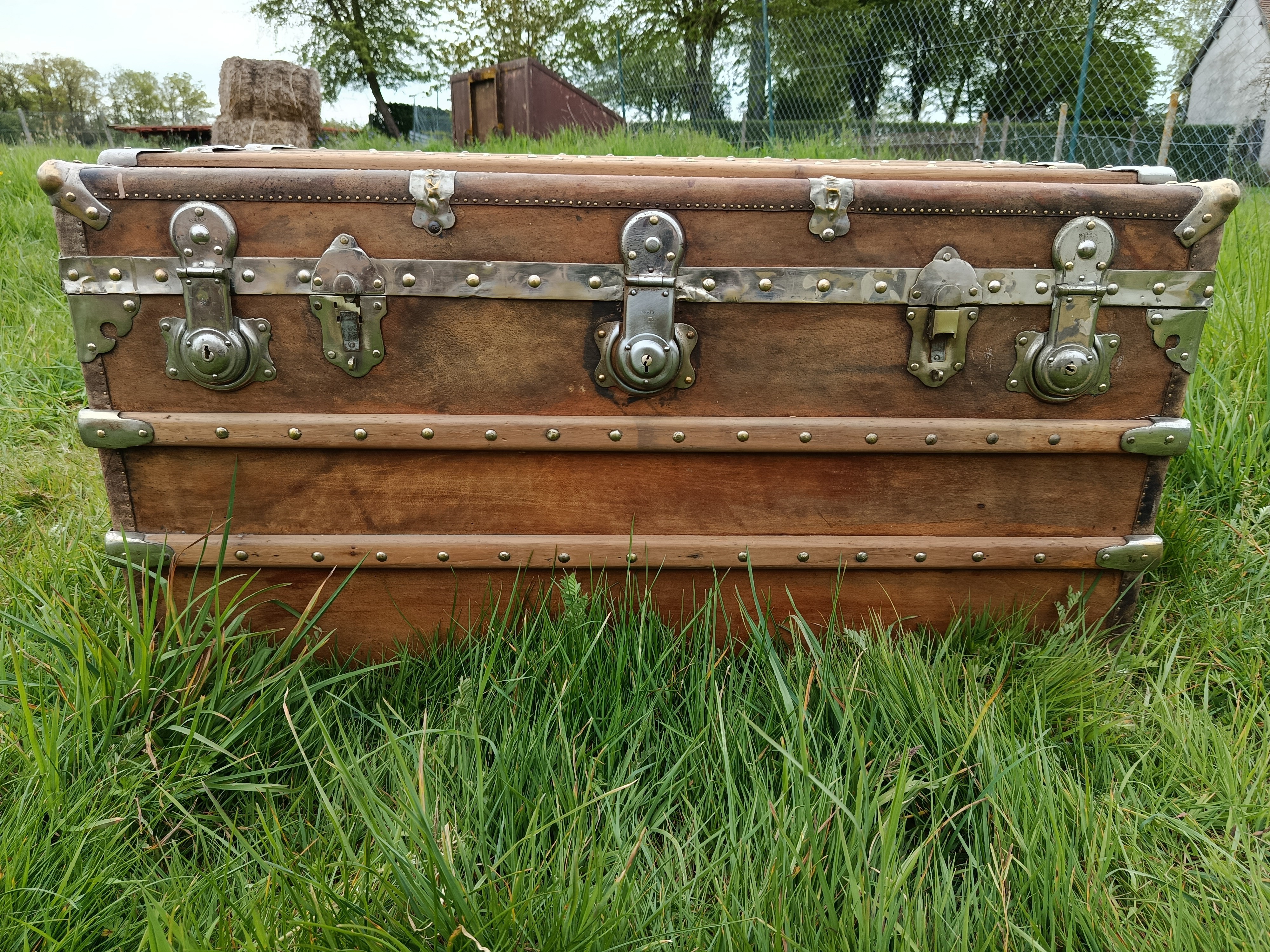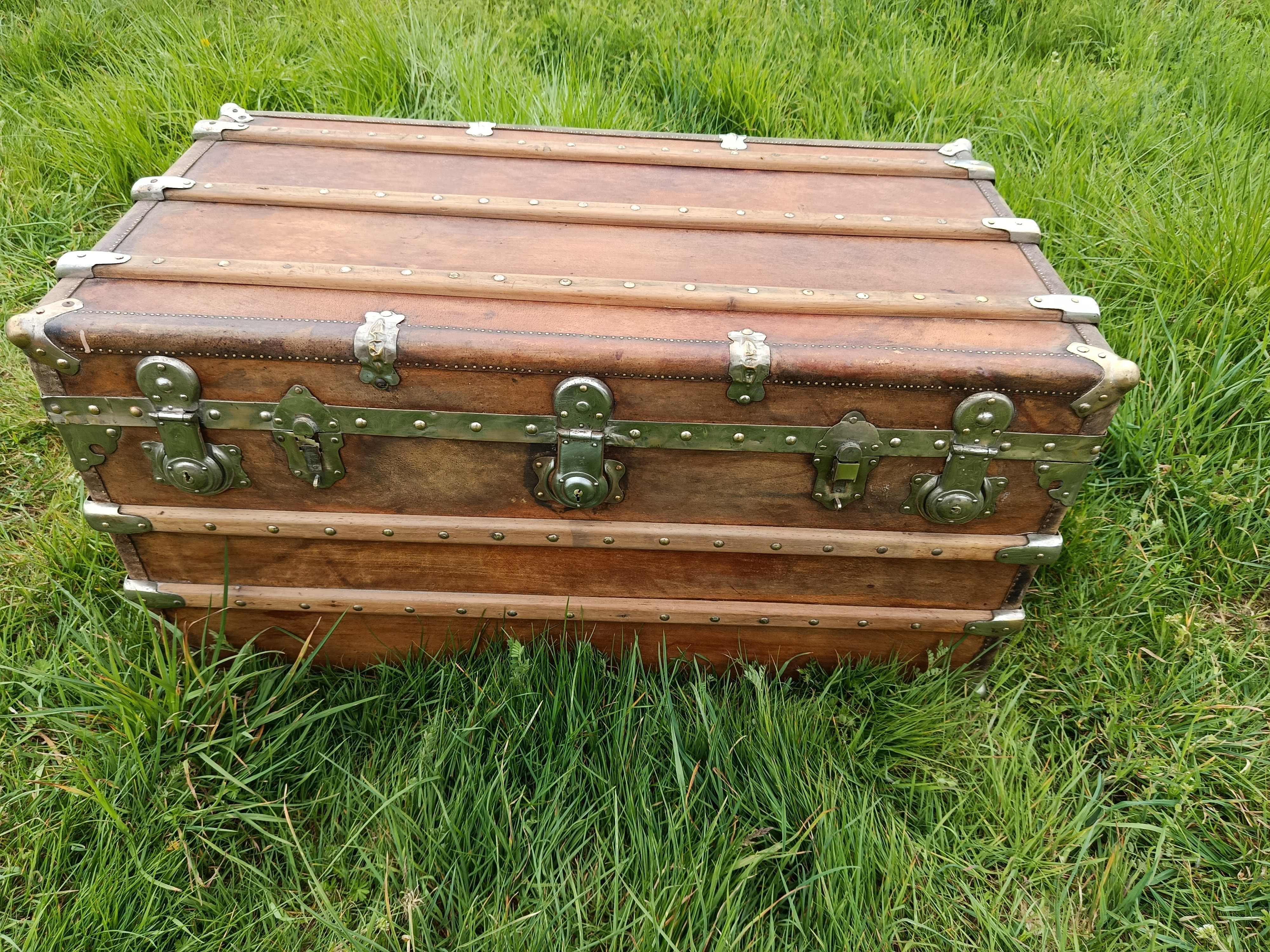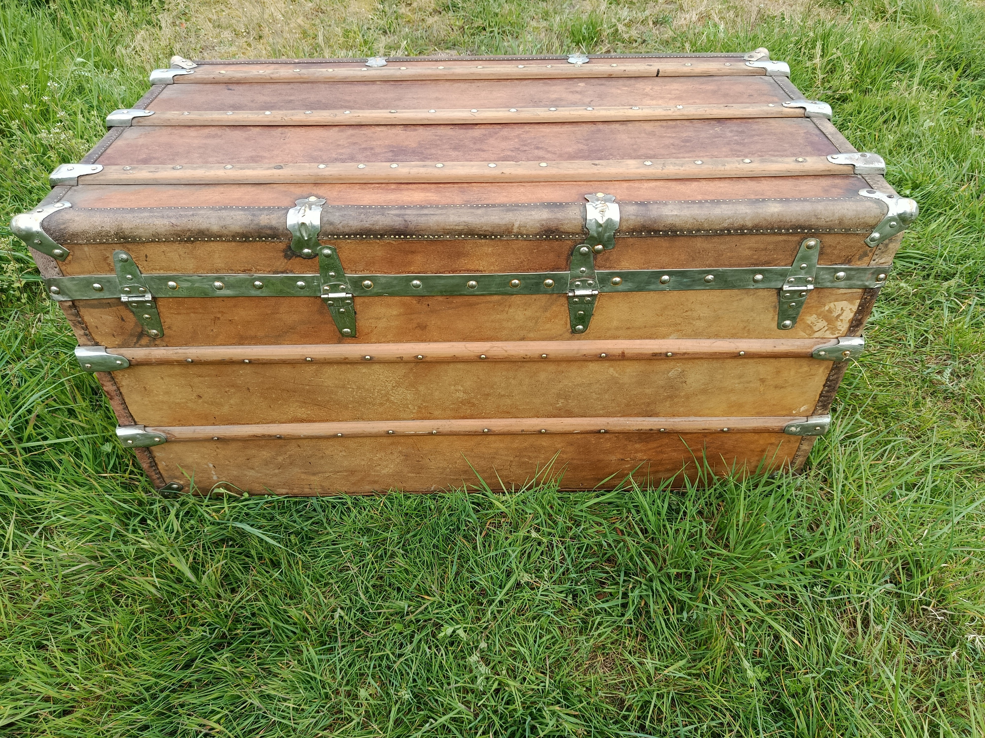 Malle de belle capacité de grande qualité - faite de matériaux nobles - bois de camphrier - revêtement en peau cuivrée - cintrage camphrier - bijouterie et fermoirs aliage bronze et laiton nickelé - poignées en cuir - chassis amovible et tissu intérieur - idéale pour une belle table basse - de salon - bar - bout de lit - rangement de linge de maison - cette malle a appartenu à un Commandant de la coloniale - il avait toute une batterie de belles malles pour le rangement de ses effets lors de ses voyages au long cours (voir mes autres annonces) - malle de très belle qualité - très solide et de belle contenance