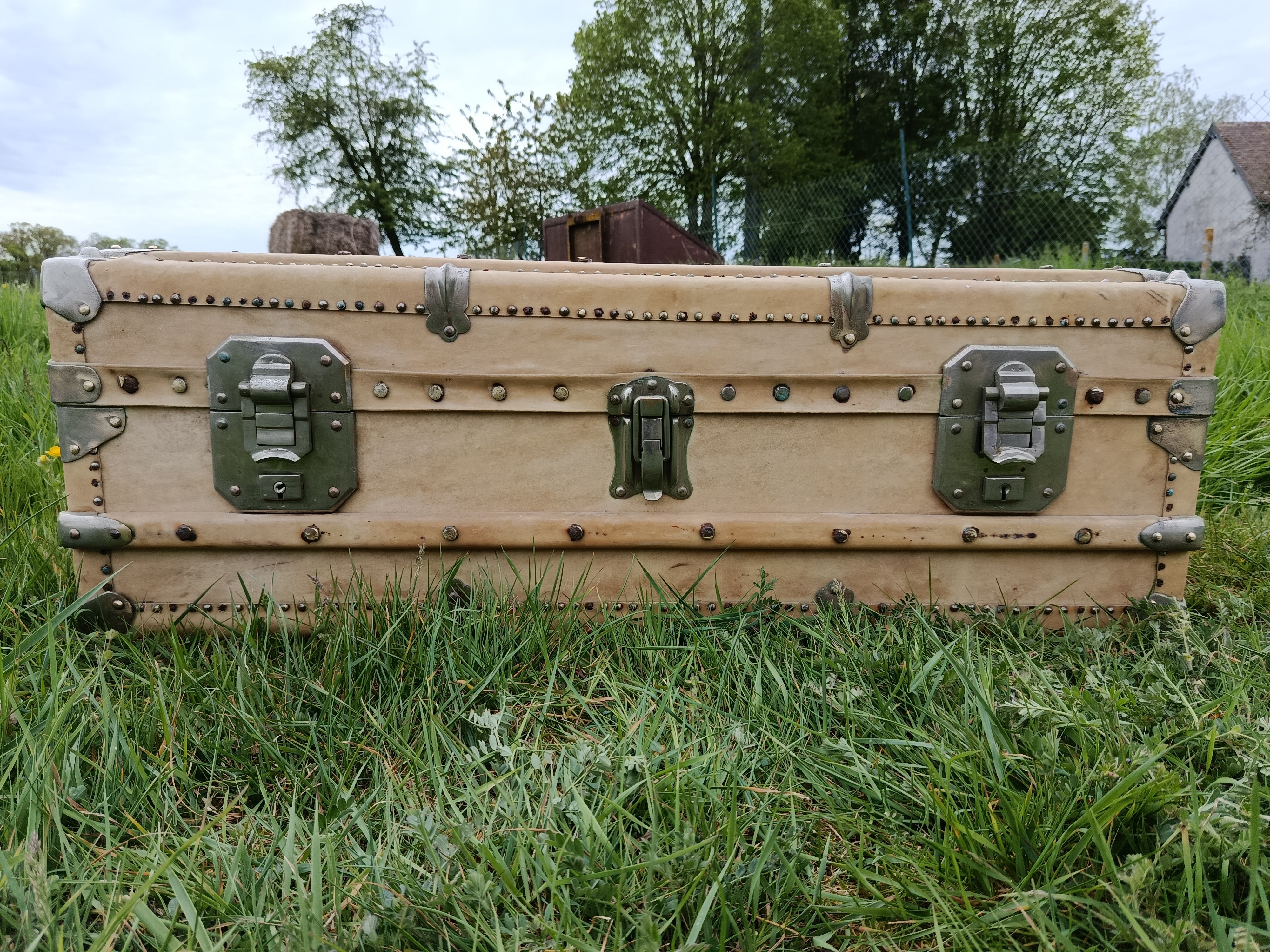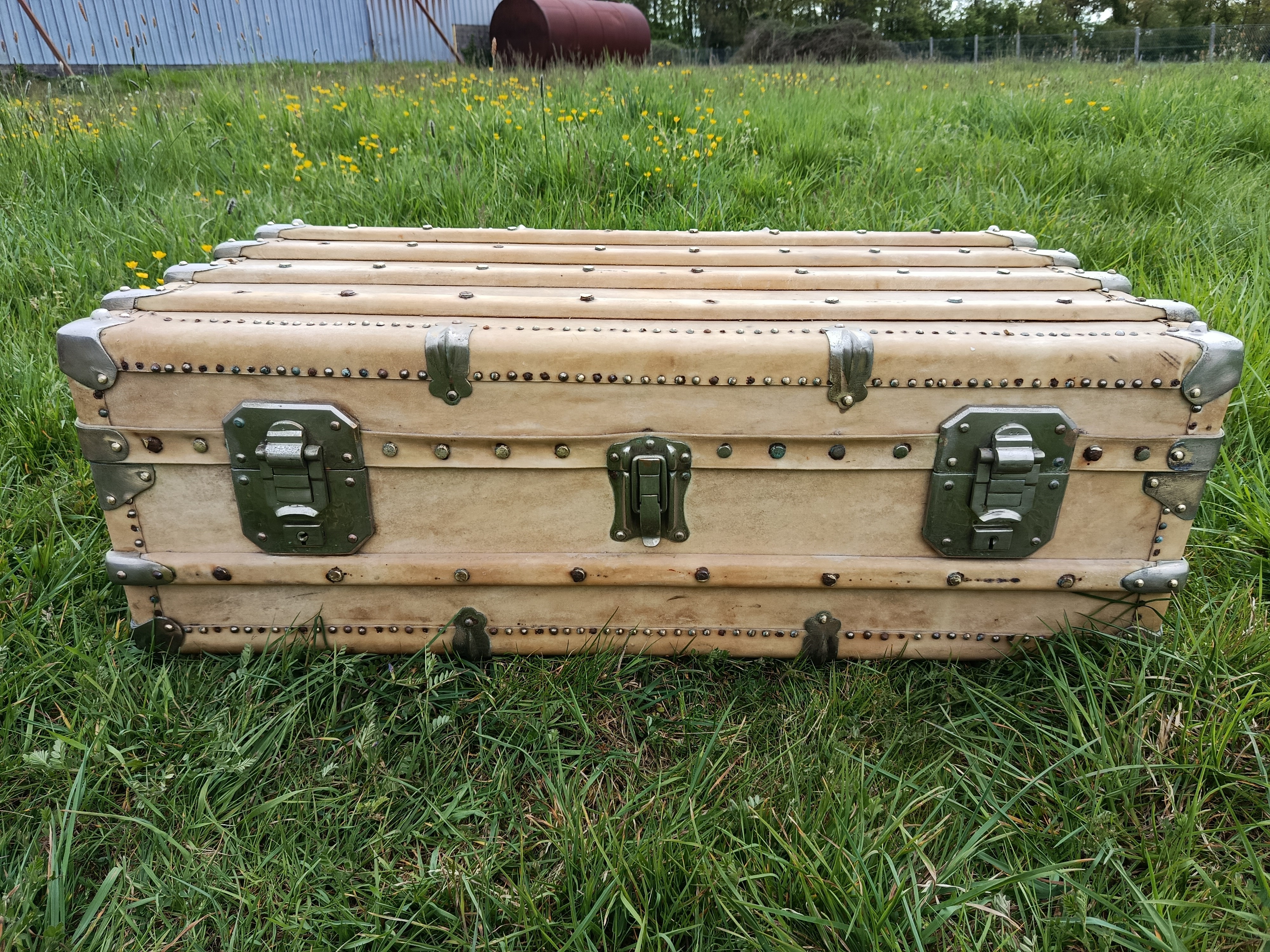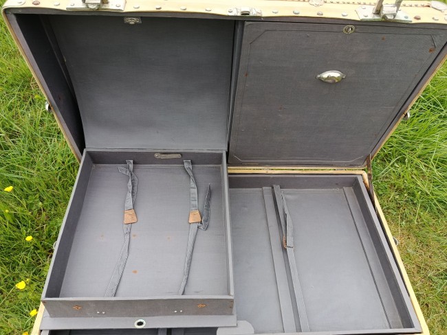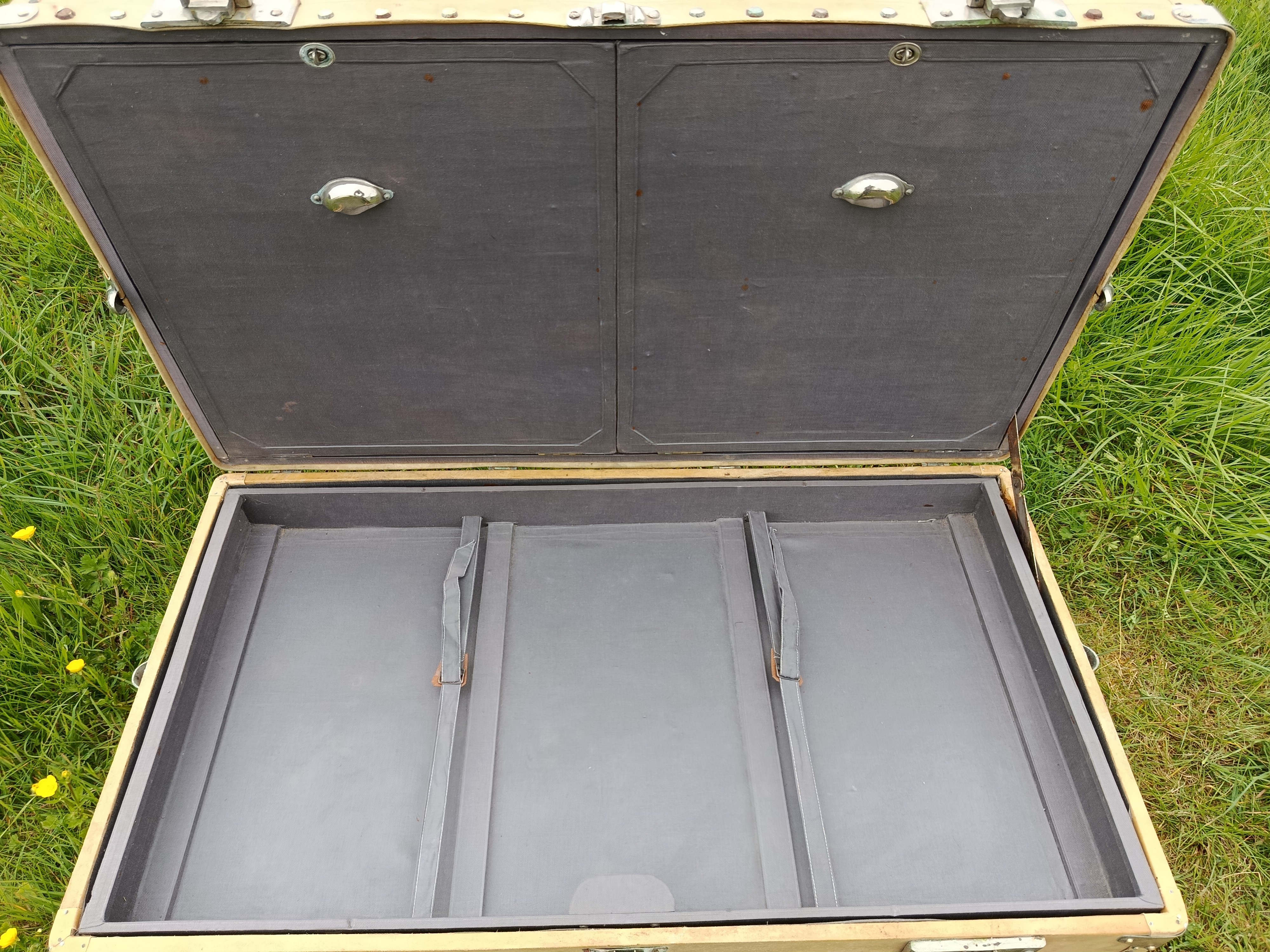 Malle complète - destinée à la Cabine d'un Officier de Marine - Que des matériaux nobles : Camphrier - Peau (dit parchemin) - bijouterie en laiton nickelé - poignées en cuir - équipement intérieur d'origine en très bel état avec 2 compartiments bois léger et tissus sou le capot pour rangement du linge ou petits effets de campagne - le fût équipé d'un chassis amovible pour le reste du linge ou autres effets - le tout conservé en très bel état - produit très rare - excellent rapport qualité/prix