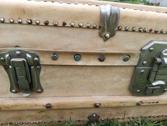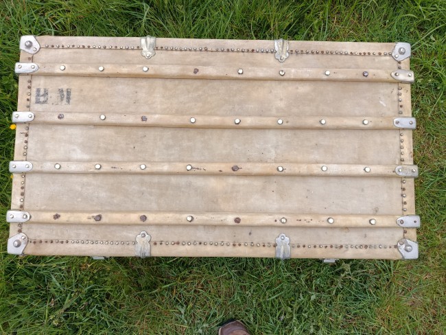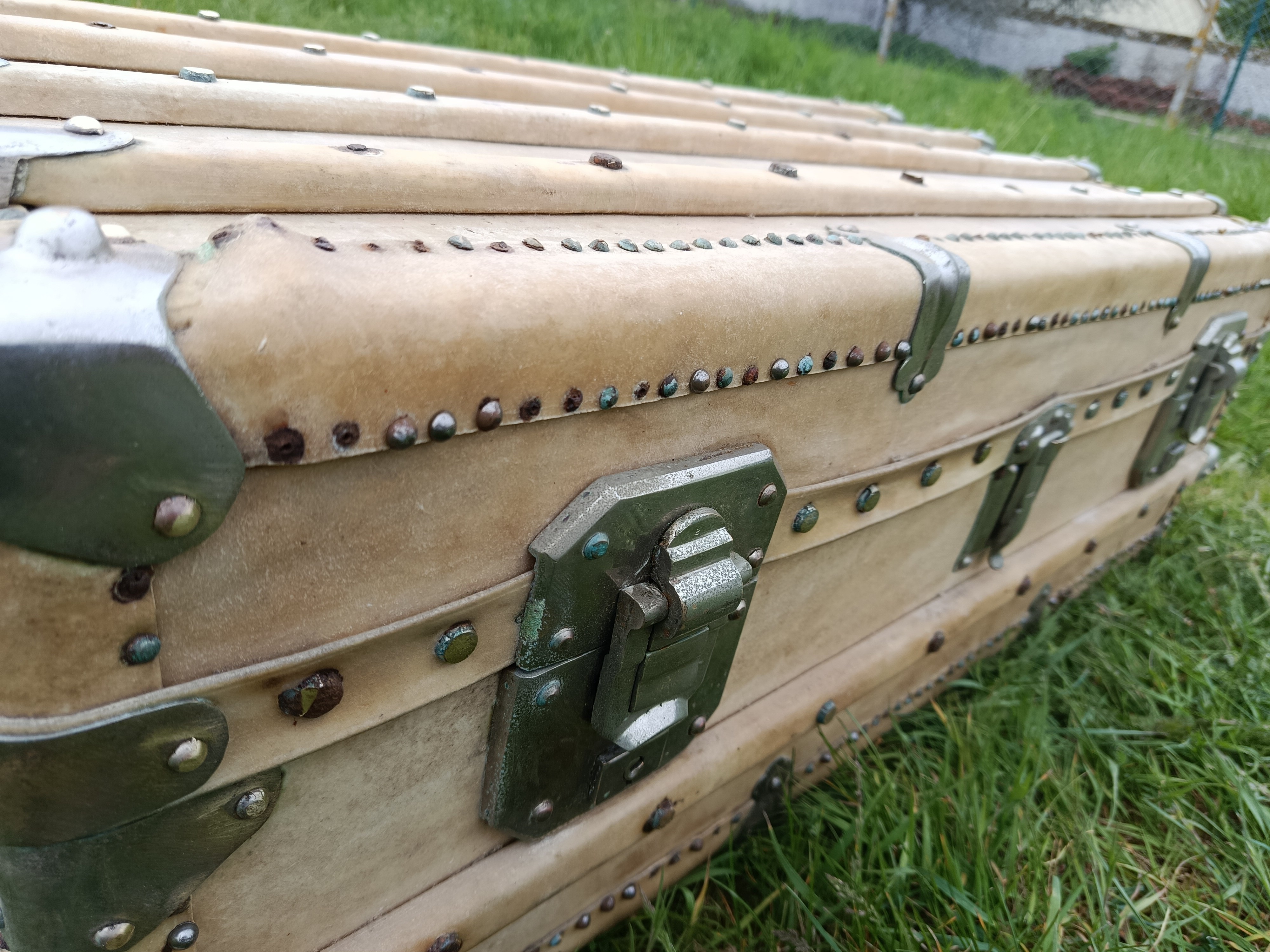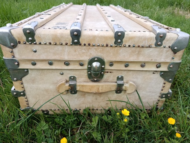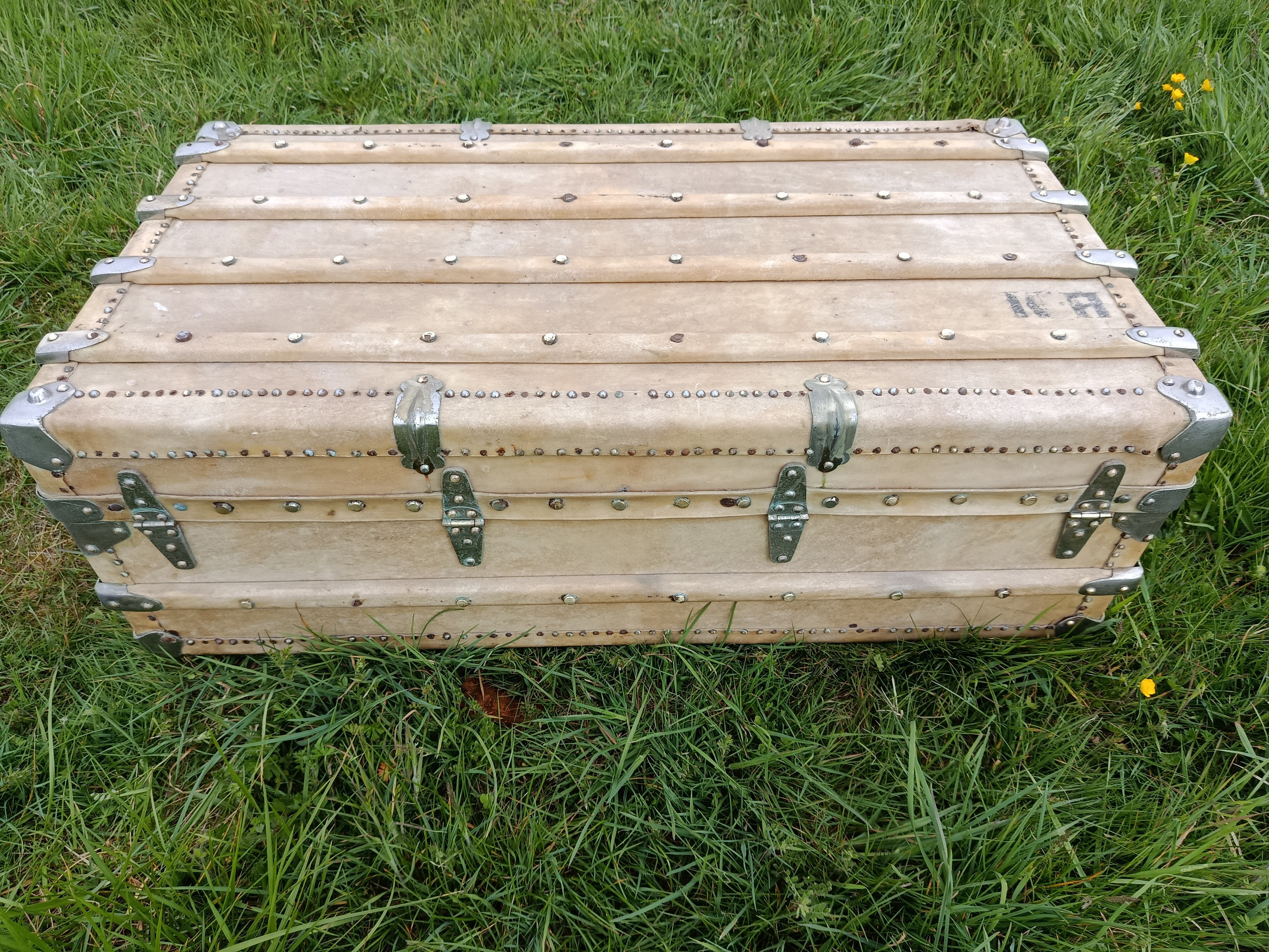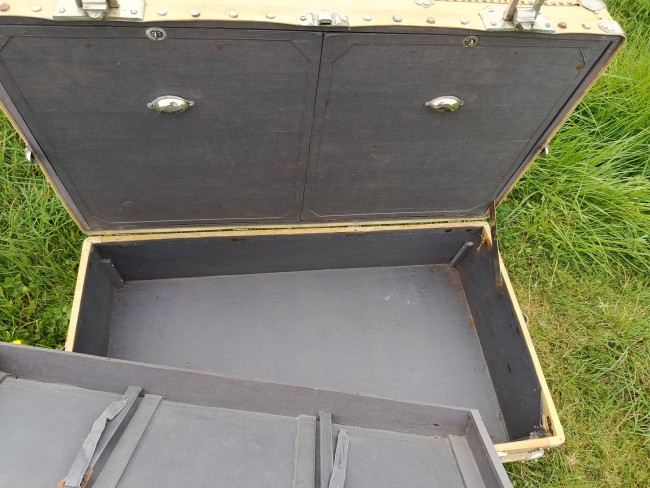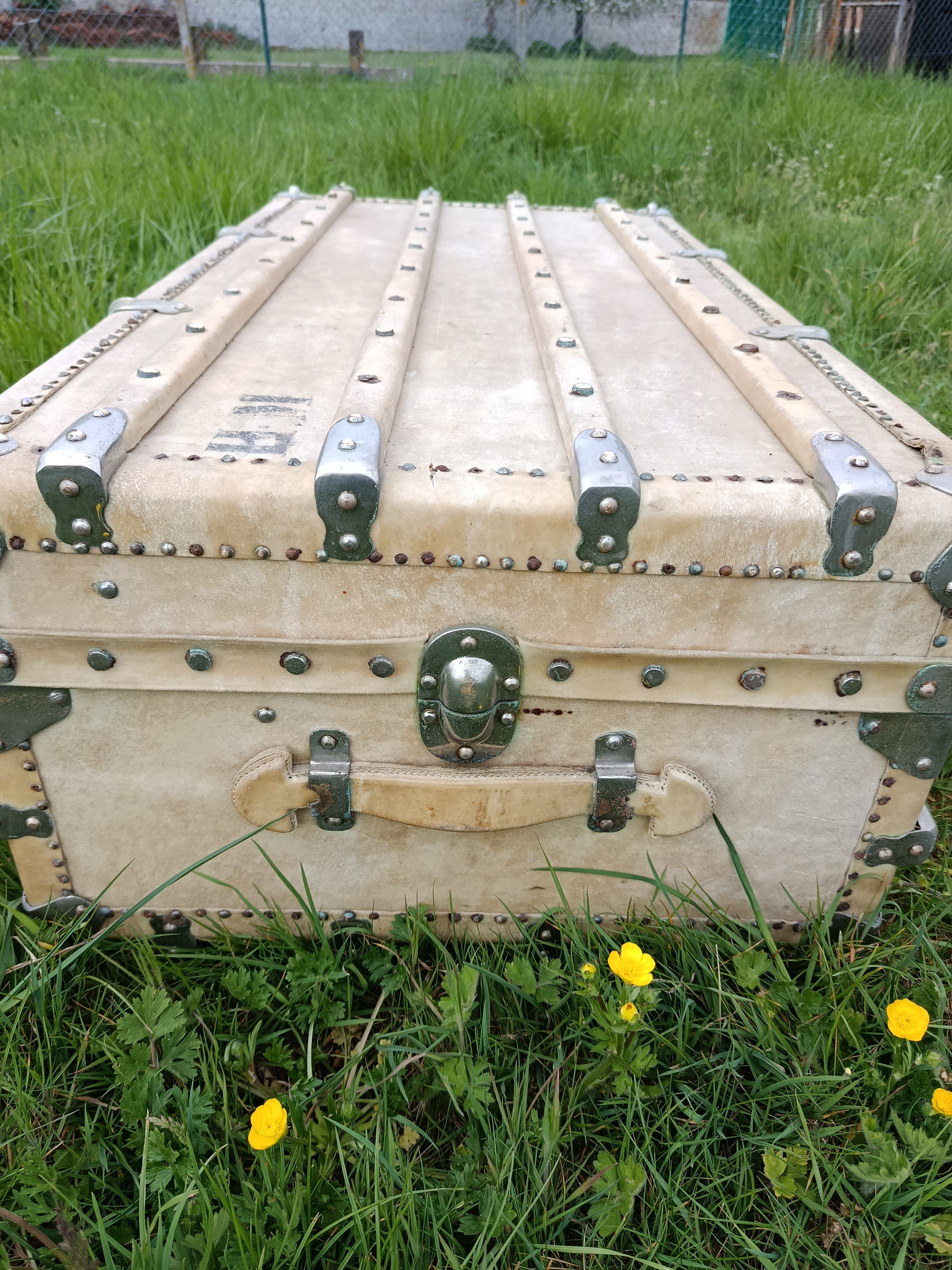 Malle complète - destinée à la Cabine d'un Officier de Marine - Que des matériaux nobles : Camphrier - Peau (dit parchemin) - bijouterie en laiton nickelé - poignées en cuir - équipement intérieur d'origine en très bel état avec 2 compartiments bois léger et tissus sou le capot pour rangement du linge ou petits effets de campagne - le fût équipé d'un chassis amovible pour le reste du linge ou autres effets - le tout conservé en très bel état - produit très rare - excellent rapport qualité/prix