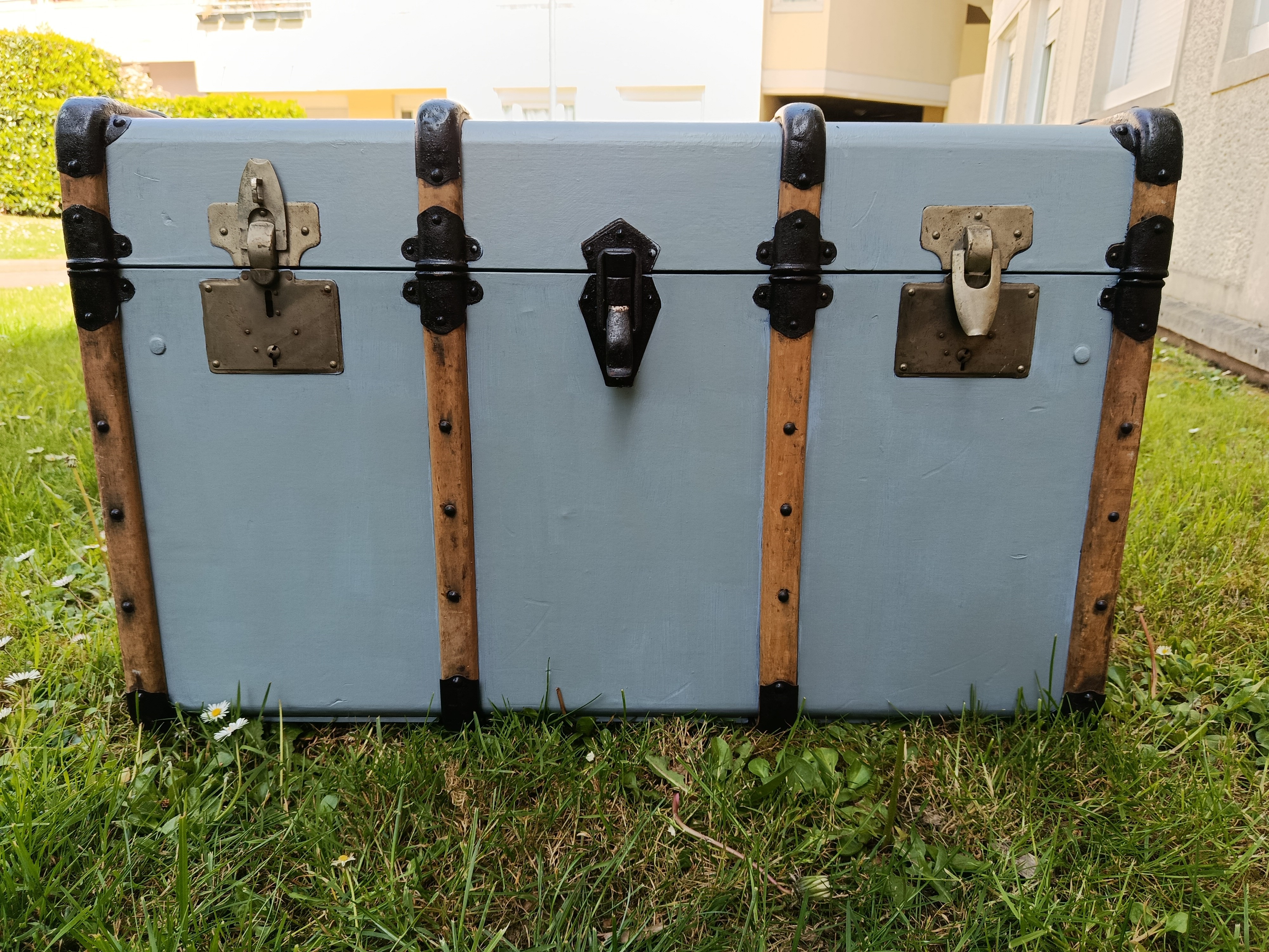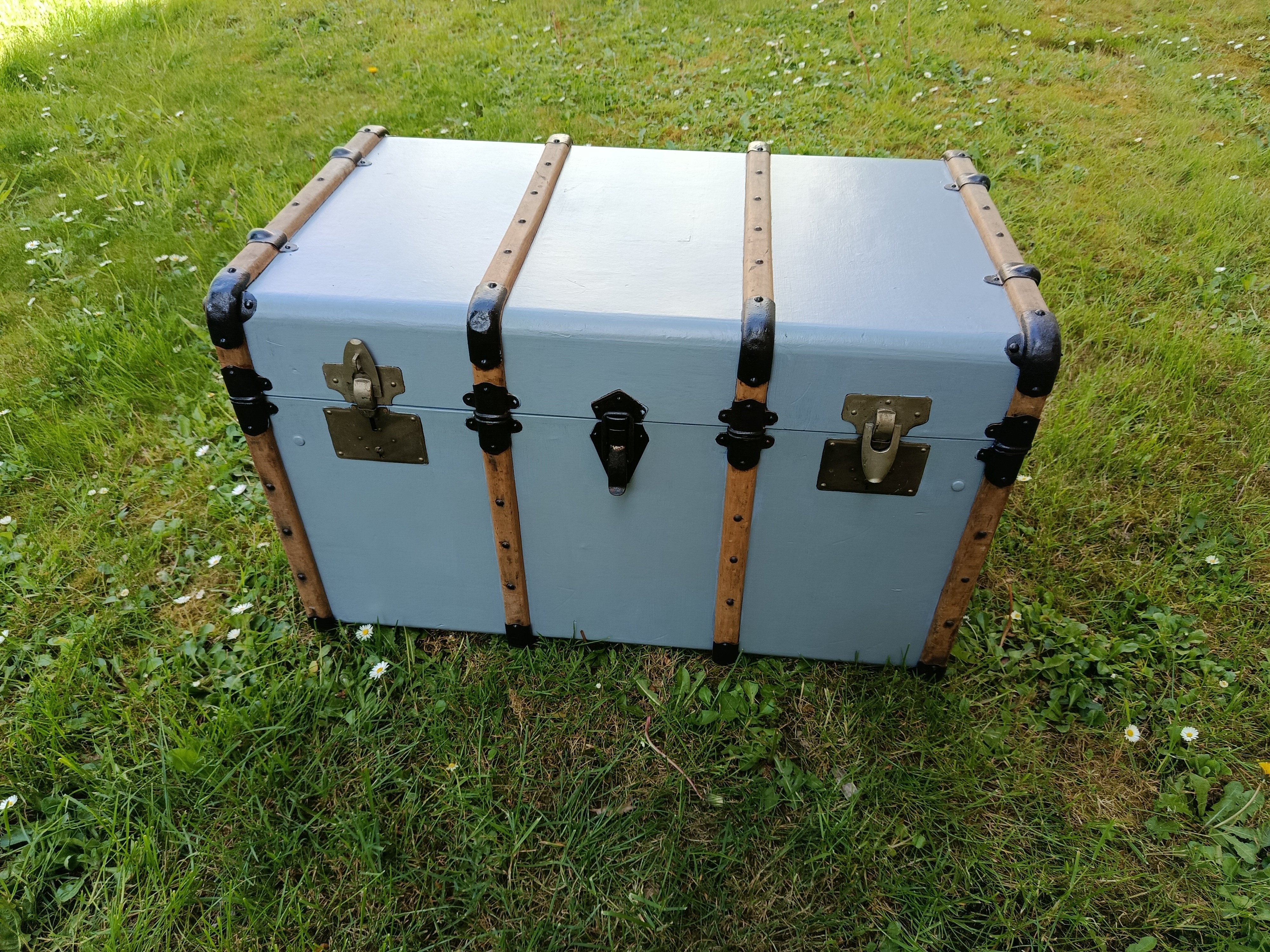 Malle cintrée années 40 - structure en bois - revêtement vulcanisé revisité en bleu gris lui donnant cet aspect unique en son genre - toutes les pièces sont d'origine - consolidation du fond - papier d'origine - châssis amovible - dimensions : 80L x 50l x. 50h
